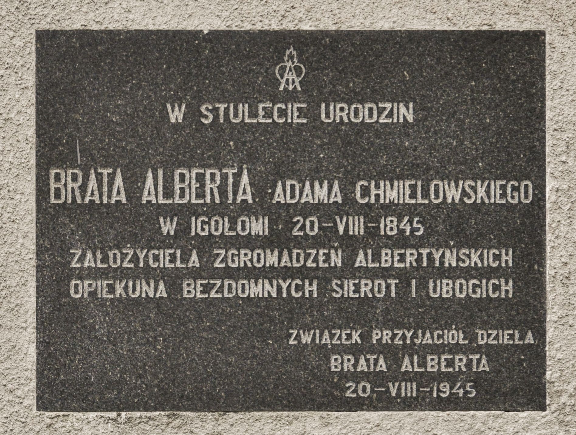 Tablica w kształcie leżącego prostokąta z inskrypcją „W STULECIE URODZIN / BRATA ALBERTA ADAMA CHMIELOWSKIEGO / W IGOŁOMI 20 - VIII - 1845 / ZAŁOŻYCIELA ZGROMADZEŃ ALBERTYŃSKICH / OPIEKUNA BEZDOMNYCH SIEROT I UBOGICH / ZWIĄZEK PRZYJACIÓŁ DZIEŁA / BRATA ALBERTA 20 - VIII - 1945”. Nad inskrypcją znak przedstawiający gorejące serce oraz łaciński krzyż wpisany w literę „A”.