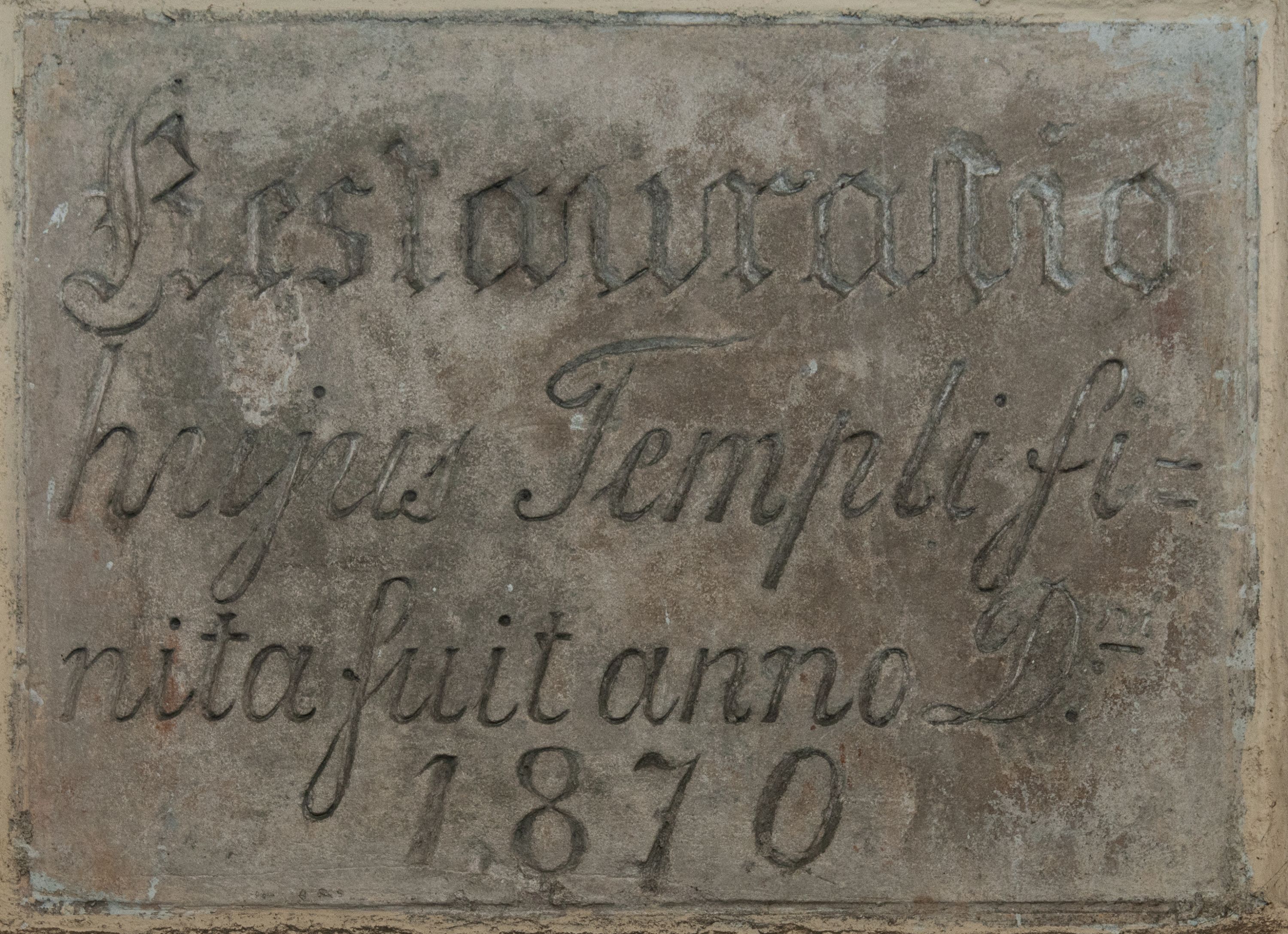 Tablica w kształcie leżącego prostokąta wmurowana w ścianę południową kruchty z kutym napisem „Restauratio / hujus Templi fi/nita fuit anno D(omini) / 1870”.