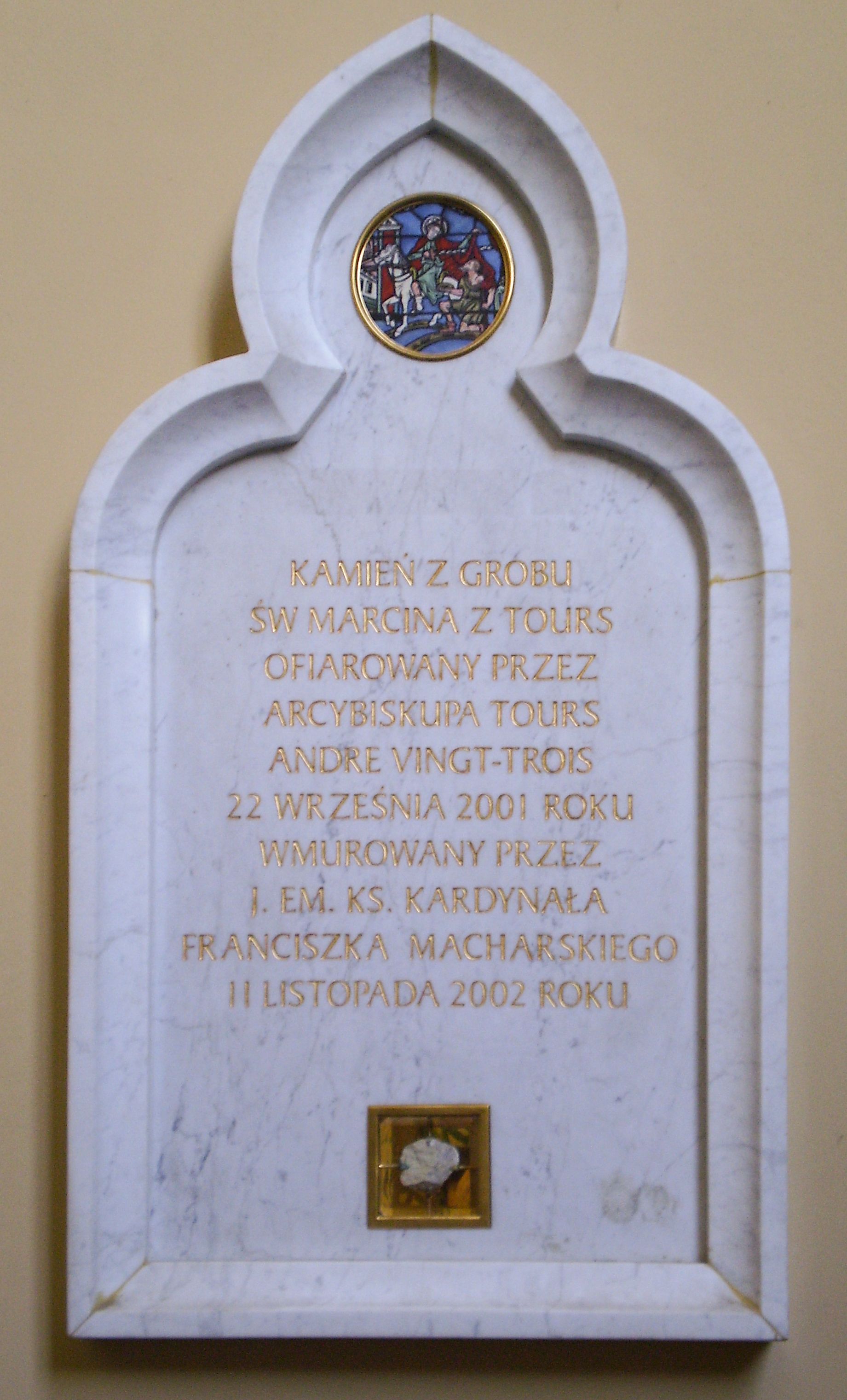 Kamienna tablica pamiątkowa w kształcie stojącego prostokąta zamkniętego ostrym łukiem trójlistnym w profilowanej ramie. W górnej części medalion z emaliowanym przedstawieniem św. Marcina na koniu dzielącego się płaszczem z żebrakiem. W części centralnej złocona inskrypcja „KAMIEŃ Z GROBU / ŚW[IĘTEGO] MARCINA Z TOURS / OFIAROWANY PRZEZ / ARCYBISKUPA TOURS / ANDRE VINGT-TROIS / 22 WRZEŚNIA 2001 ROKU / WMUROWANY PRZEZ / J(EGO) EM(INENCJĘ) KS(IĘDZA) KARDYNAŁA / FRANCISZKA MACHARSKIEGO / 11 LISTOPADA 2002 ROKU”. Poniżej inskrypcji mała kwadratowa, złocona, przeszklona nisza zawierająca kamień z grobu św. Marcina z Tours.