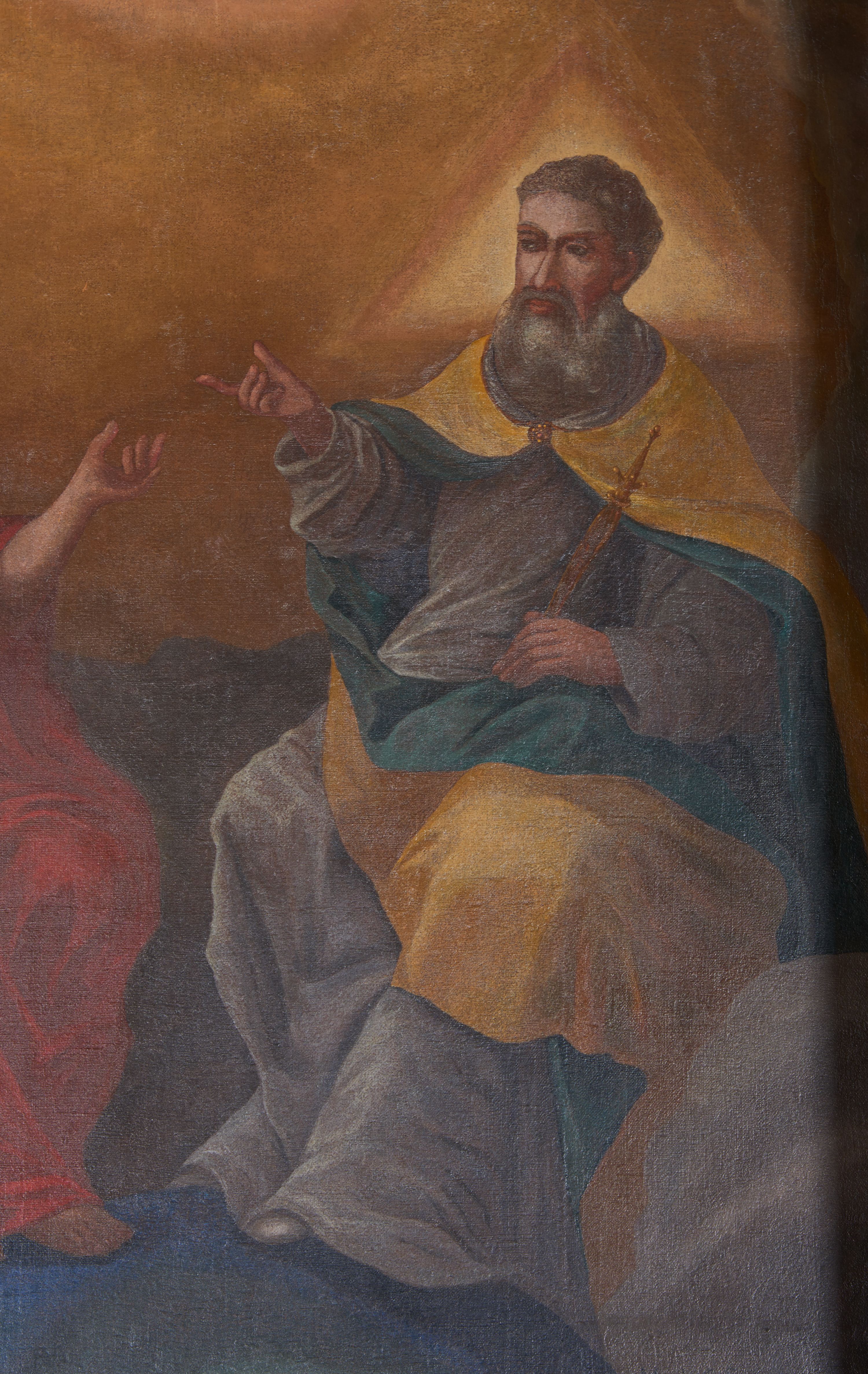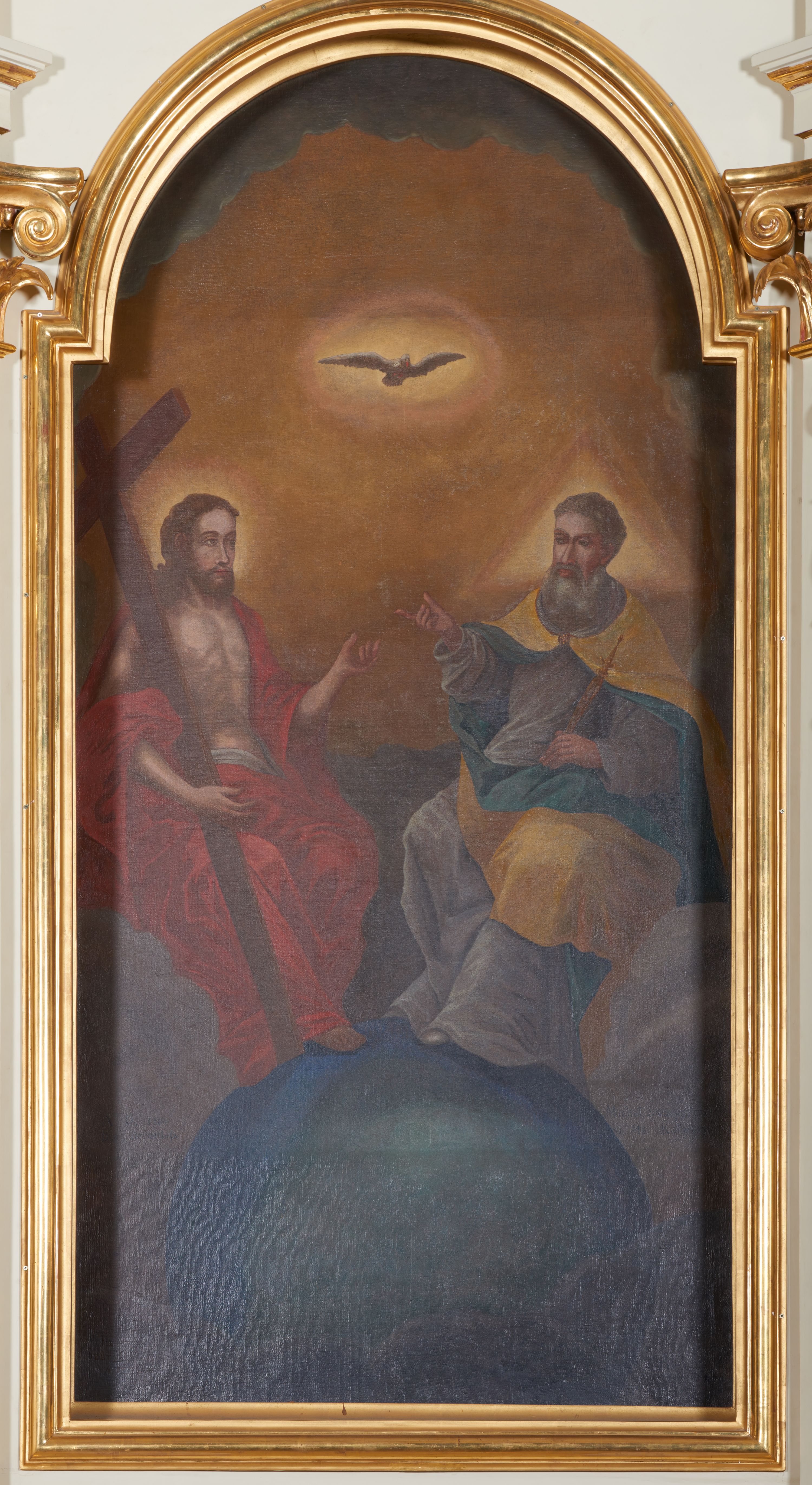 Obraz w formie stojącego prostokąta zamkniętego nadwieszonym łukiem półkolistym. Po lewej stronie kompozycji został ukazany Chrystus w pozycji siedzącej, ubrany w czerwoną szatę, prawą ręką podtrzymujący krzyż, lewą wystawiający w geście mowy. Wokół jego głowy widoczny okrągły nimb. Po prawej stronie znajduje się Bóg Ojciec ukazany w pozycji siedzącej, jako starszy mężczyzna, ubrany w długą i szarą szatę oraz żółty płaszcz z zieloną podszewką. W lewej ręce trzyma berło, prawą unosi w geście mowy. Nad jego głową jest trójkątny nimb. Obaj mężczyźni nogi opierają na globie ziemskim. Pomiędzy nimi, u góry, w świetlistym otoku znajduje się gołębica Ducha Świętego z szeroko rozpostartymi skrzydłami. Tło dwustrefowe: w dolnej części obłoki szarych chmur; w górnej tło jednolite, w kolorze ciemnego ugru; w przyłuczu obwiedzione pasem gęstych chmur. Na lewo od globu sygnatura „Michał Swaryszows/ki. Ma(lował): Kalwarya". Po prawej sygnatura renowacji obrazu: „Renovatum / Fr(ater) Didaeus / Batarrina A(nno) D(omini) 1870”.