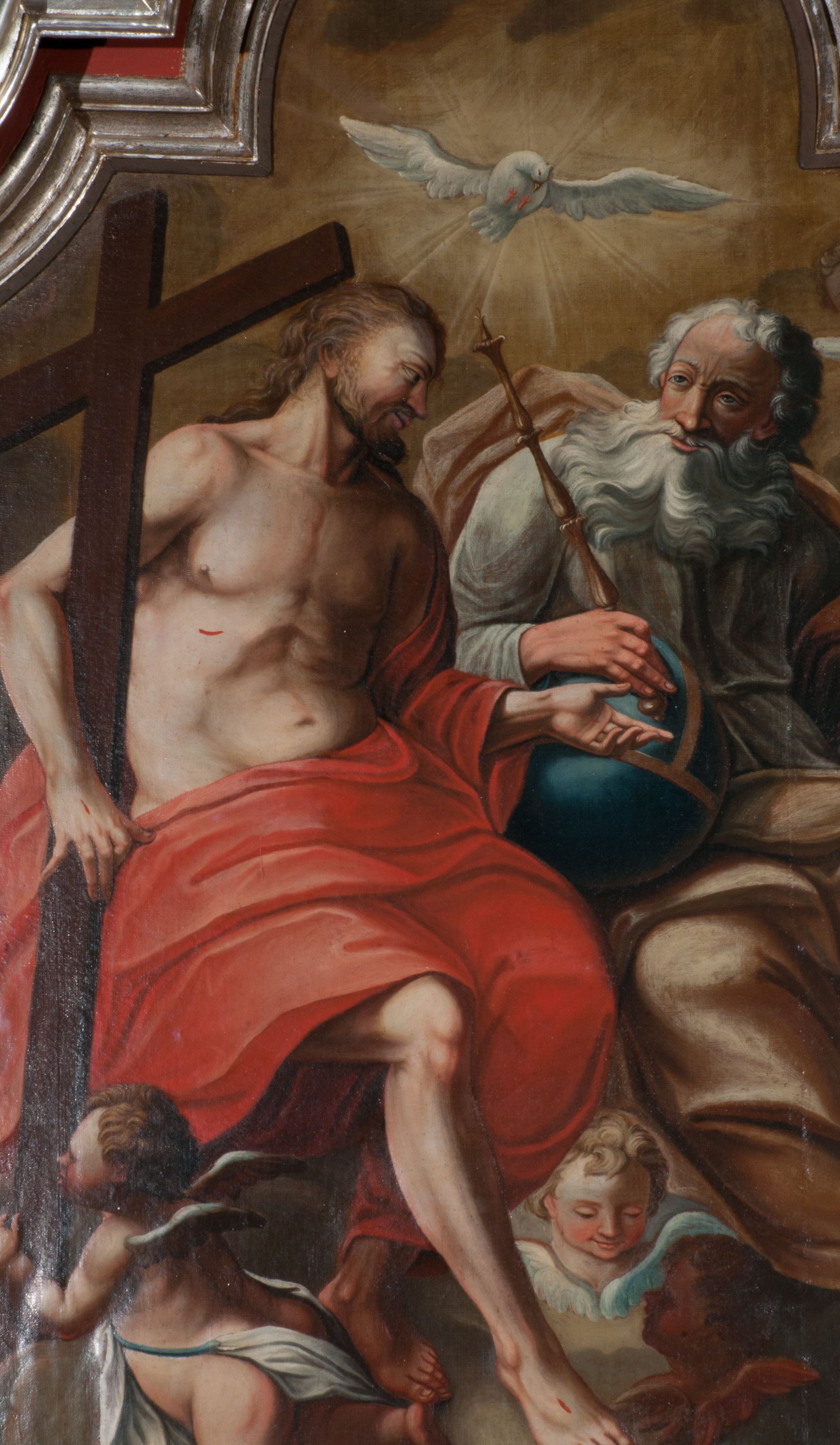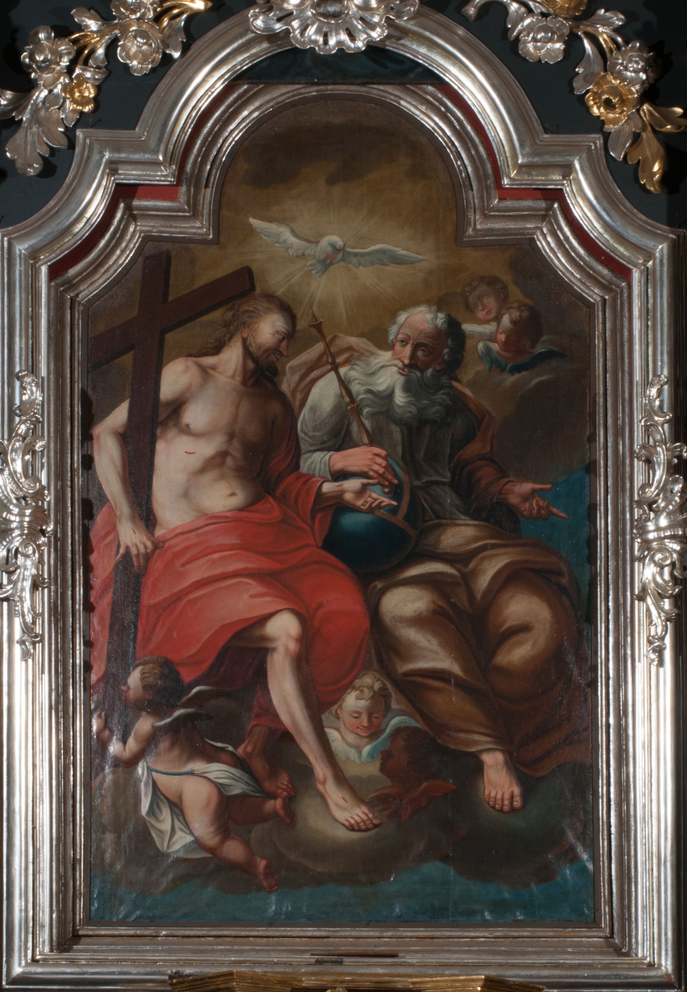 Obraz w formie stojącego prostokąta zamkniętego łukiem półkolistym nadwieszonym z uskokiem. W centrum kompozycji znajduje się grupa Trójcy Świętej. Na obłoku po lewej stronie obrazu siedzi Chrystus, po prawej Bóg Ojciec, ponad nimi unosi się gołębica Ducha Świętego. Chrystus zwrócony jest w trzech czwartych w lewo, prawą ręką przytrzymuje na ramieniu krzyż, który u dołu podtrzymuje putto, lewą rękę wyciąga w bok w geście rozmowy, prawą nogę wystawia naprzód. Twarz ma szczupłą, o dużych, migdałowatych oczach, dużym nosie i pełnych ustach, okoloną krótką, falowaną brodą oraz kręconymi włosami opadającymi na plecy. Ubrany jest w czerwony płaszcz odsłaniający tors, zarzucony na lewe ramię i opadający na nogi, na jego ciele zaznaczone są ślady męki. Bóg Ojciec zwrócony jest w trzech czwartych w lewo, z głową skierowaną w przeciwną stronę. Prawą ręką trzyma przy boku glob, w dłoni zaś berło, lewą rękę wyciąga w bok w geście rozmowy, nogi ma skrzyżowane. Jego twarz jest kwadratowa o starczych rysach, migdałowatych oczach, dużym nosie i wąskich ustach, okolona długą, białą, rozdwajającą się brodą oraz krótkimi, siwymi włosami. Ubrany jest w białą tunikę przewiązaną w pasie oraz w żółto-brązowy płaszcz zarzucony na lewe ramię, rozwiany z tyłu, opadający na nogi. Ponad głowami obu postaci unosi się gołębica Ducha Świętego w glorii promienistej. W górnym prawym rogu obrazu i u dołu dwie pary uskrzydlonych główek anielskich. Górną połowę obrazu tworzy tło wypełnione żółto-brązowymi obłokami, dolną połowę zaś błękitne niebo.