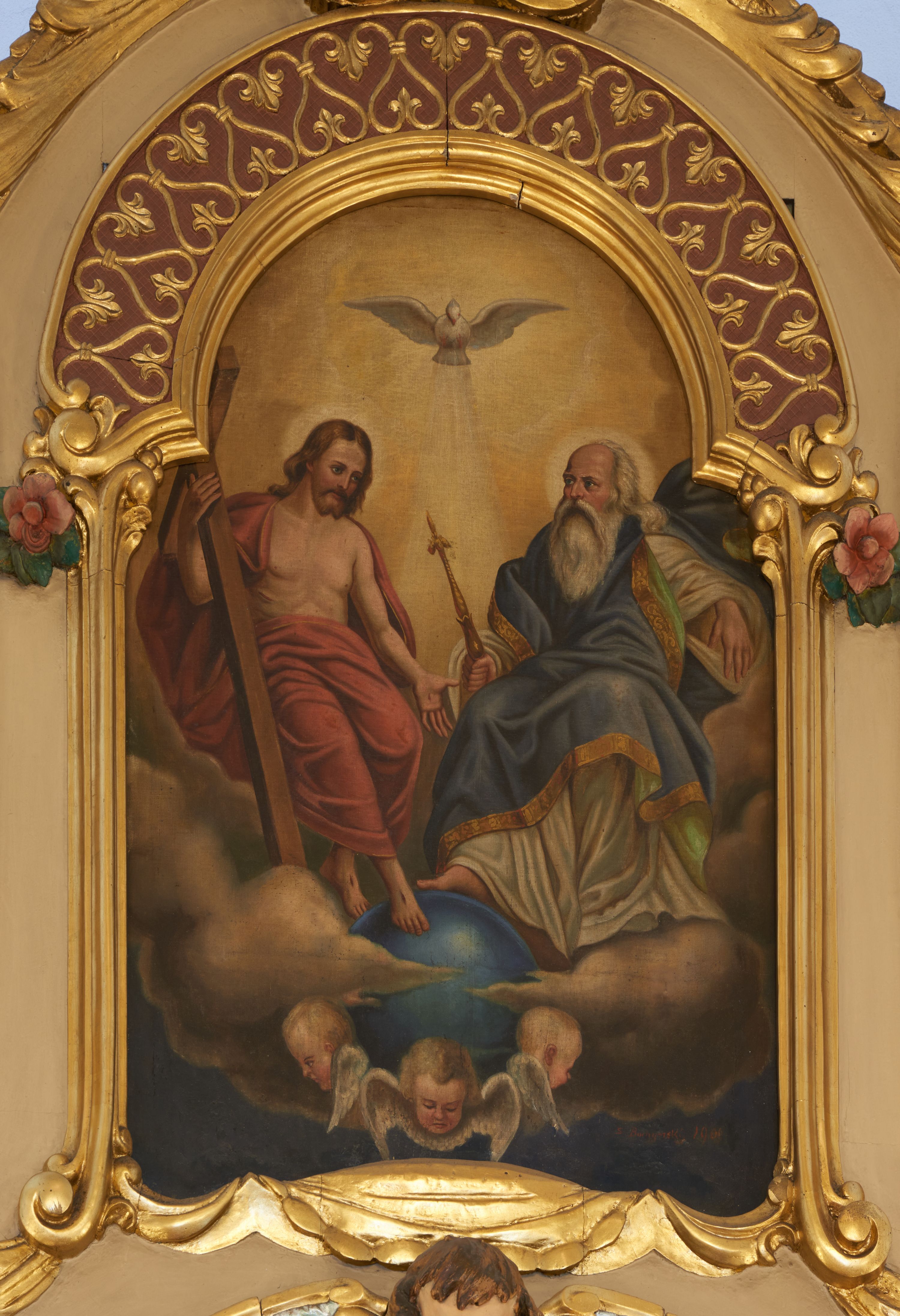 Obraz w kształcie stojącego prostokąta zamkniętego łukiem trójlistnym z przedstawieniem Trójcy Świętej. Po lewej stronie kompozycji siedzi Chrystus zwrócony w trzech czwartych w lewo. Zbawiciel prawą ręką przytrzymuje wysoki krzyż, a lewą wyciąga przed siebie. Ma skrzyżowane nogi, prawą stopę opiera na globie. Twarz ma podłużną o delikatnych rysach, szeroko otwartych oczach i prostym nosie, okoloną jasną i gęstą brodą rozdzieloną na końcu na dwa pukle oraz jasnobrązowymi włosami opadającymi na plecy. Chrystus jest ubrany w czerwony płaszcz okrywający ramiona, biodra i nogi, lecz odsłaniający tors. Na jego ciele widoczne są ślady męki – przebity bok oraz rany po gwoździach. Po prawej stronie kompozycji siedzi Bóg Ojciec zwrócony w trzech czwartych w prawo, z prawą stopą opartą na globie. W prawej ręce trzyma berło, lewą ma ugiętą w łokciu i uniesioną. Ma twarz o rysach starszego mężczyzny z orlim nosem, dużymi i niebieskimi oczami, okoloną długą i siwą brodą oraz siwymi włosami sięgającymi do ramion. Jest ubrany w długą, białą suknię z szerokimi rękawami oraz niebieski płaszcz z zieloną podszewką i szeroką, złotą lamówką na brzegach. Pomiędzy postaciami, u góry, widoczna jest gołębica Ducha Świętego unosząca się na tle rozświetlonego nieba. Scena rozgrywa się na tle szaro-różowych skłębionych obłoków, umieszczonych w dolnej części obrazu. Bóg Ojciec i Chrystus wspierają stopy na ciemnoniebieskim globie, od dołu podtrzymywanym przez trzy uskrzydlone główki aniołków. W prawym dolnym narożu obrazu sygnatura: „S(tanisław) Bochynski 1909”.