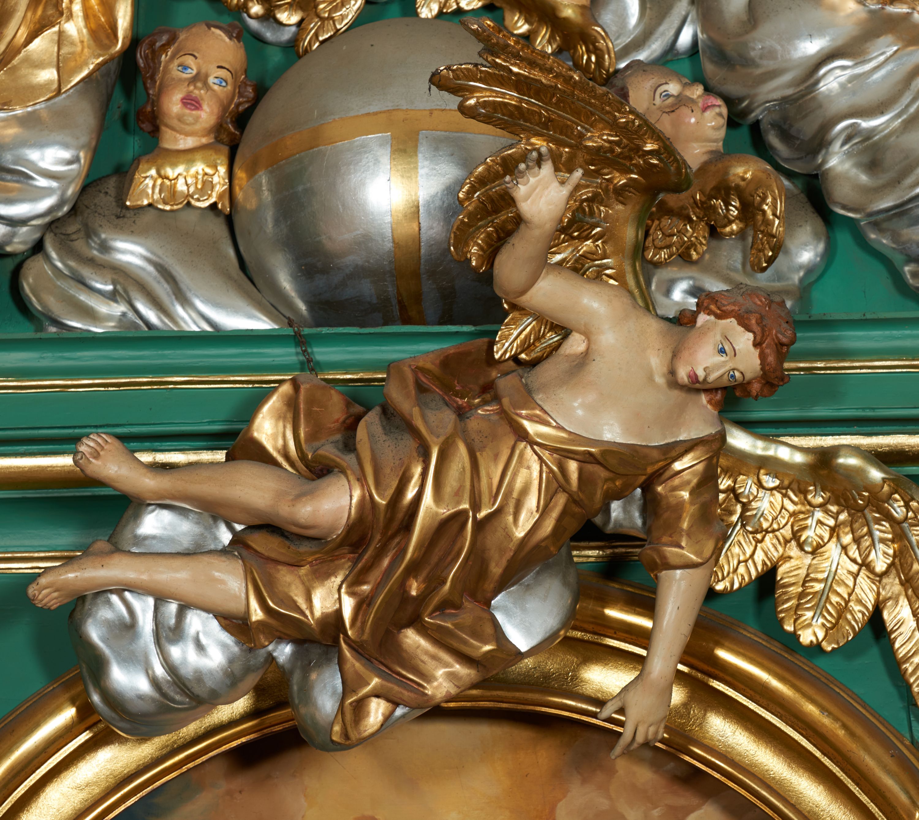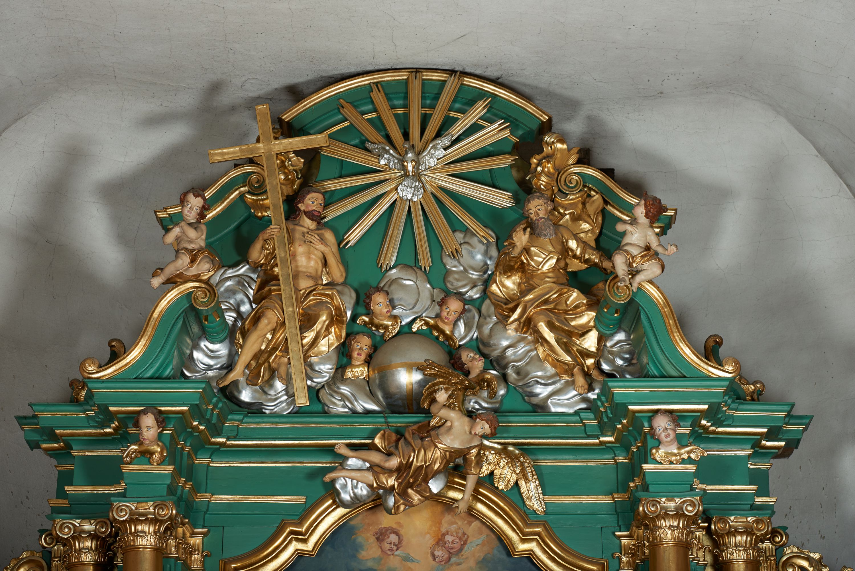 Grupa płaskorzeźbiona złożona z figury Chrystusa i Boga Ojca w otoczeniu obłoków oraz gołębicy Ducha Świętego. Po lewej stronie postać siedzącego Chrystusa, zwrócona w trzech czwartych do wewnątrz. Jego lewa ręka spoczywa na piersi, prawą przytrzymuje krzyż. Ma twarz o wyraźnych rysach, małym nosie oraz szeroko otwartych oczach; okoloną zarostem; włosy długie, opadają na plecy w postaci fal. Ciało o wyraźnie zarysowanej anatomii. Figura w partii bioder przepasana jest płaszczem spływającym na nogi i zawieszonym na prawym ramieniu; tkanina obficie drapowana w duże fałdy i delikatne załamania. Po prawej stronie siedząca postać Boga Ojca, zwrócona w trzech czwartych na zewnątrz. Lewą rękę wysuwa w bok, prawą w geście błogosławieństwa wyciąga przed siebie. Głowę ma skierowaną w prawą stronę, delikatnie pochyloną, spogląda w dół. Ma podłużną twarz o starczych rysach i niewielkim nosie, która jest okolona długą siwą brodą, spływającą na pierś; włosy krótkie, delikatnie falowane. Postać ubrana w tunikę, przepasaną w talii, o obficie marszczonej tkaninie, ściśle przylegającej do ciała; płaszcz zawinięty na prawym ramieniu, spoczywa na kolanach w formie obficie fałdowanej, ciężkiej draperii. Między postaciami kula w otoczeniu obłoków i uskrzydlonych główek anielskich. Całość wieńczy gołębica Ducha Świętego w glorii promienistej. Polichromia naturalistyczna w partiach ciała; obłoki, kula i gołębica srebrzone; szaty, atrybuty i gloria złocone.