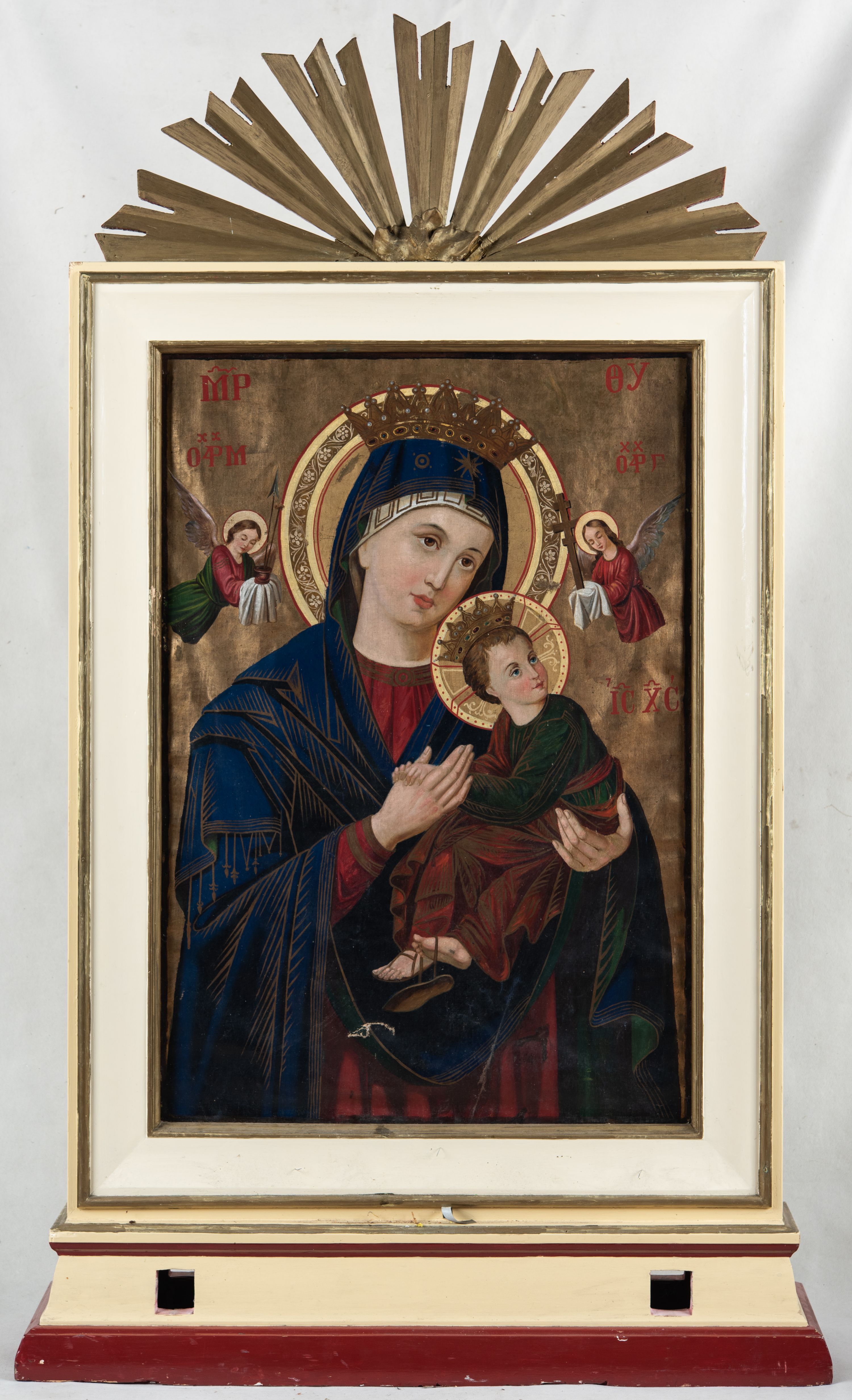 Struktura obramienia feretronu jest malowana w odcieniu bieli i złocona.