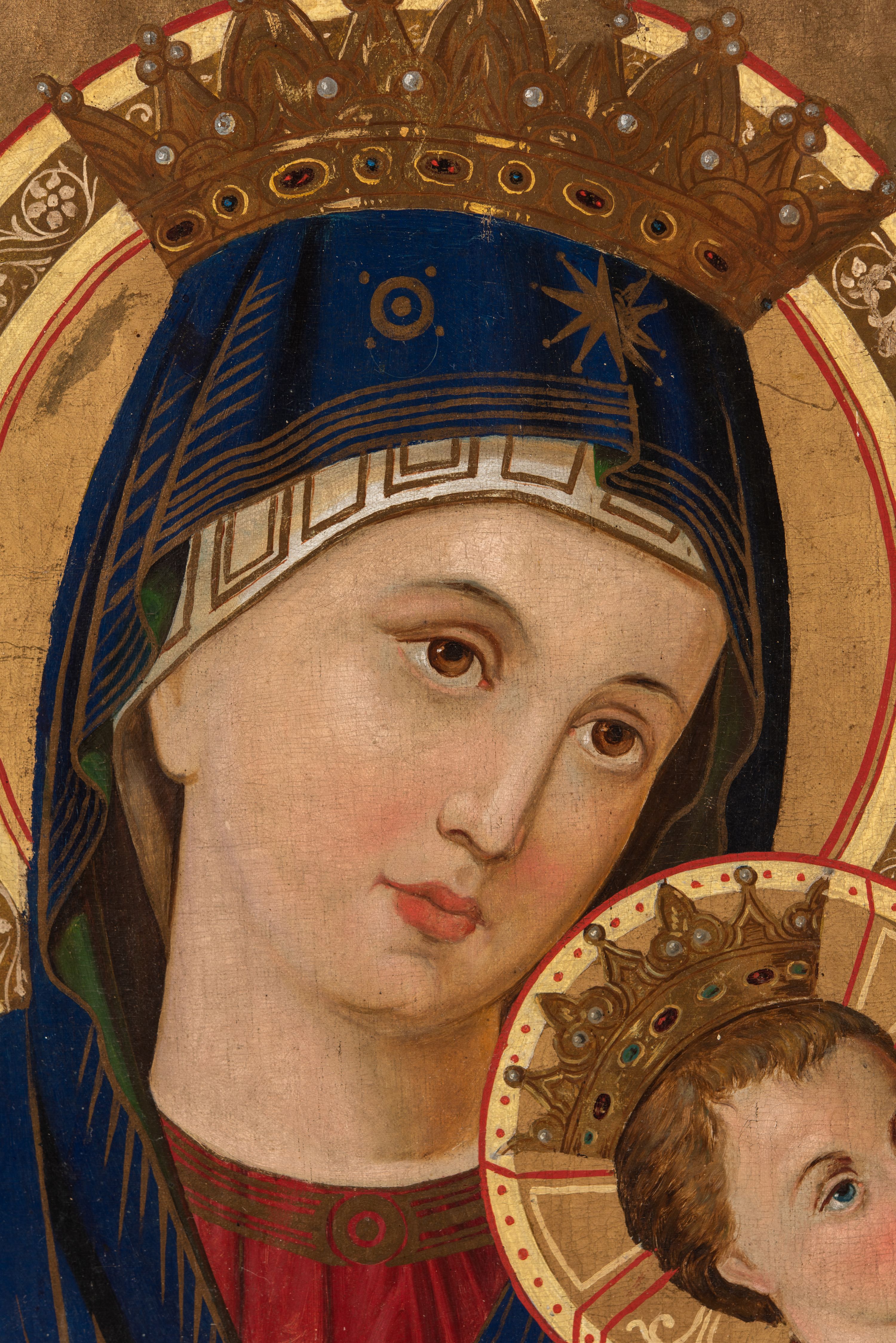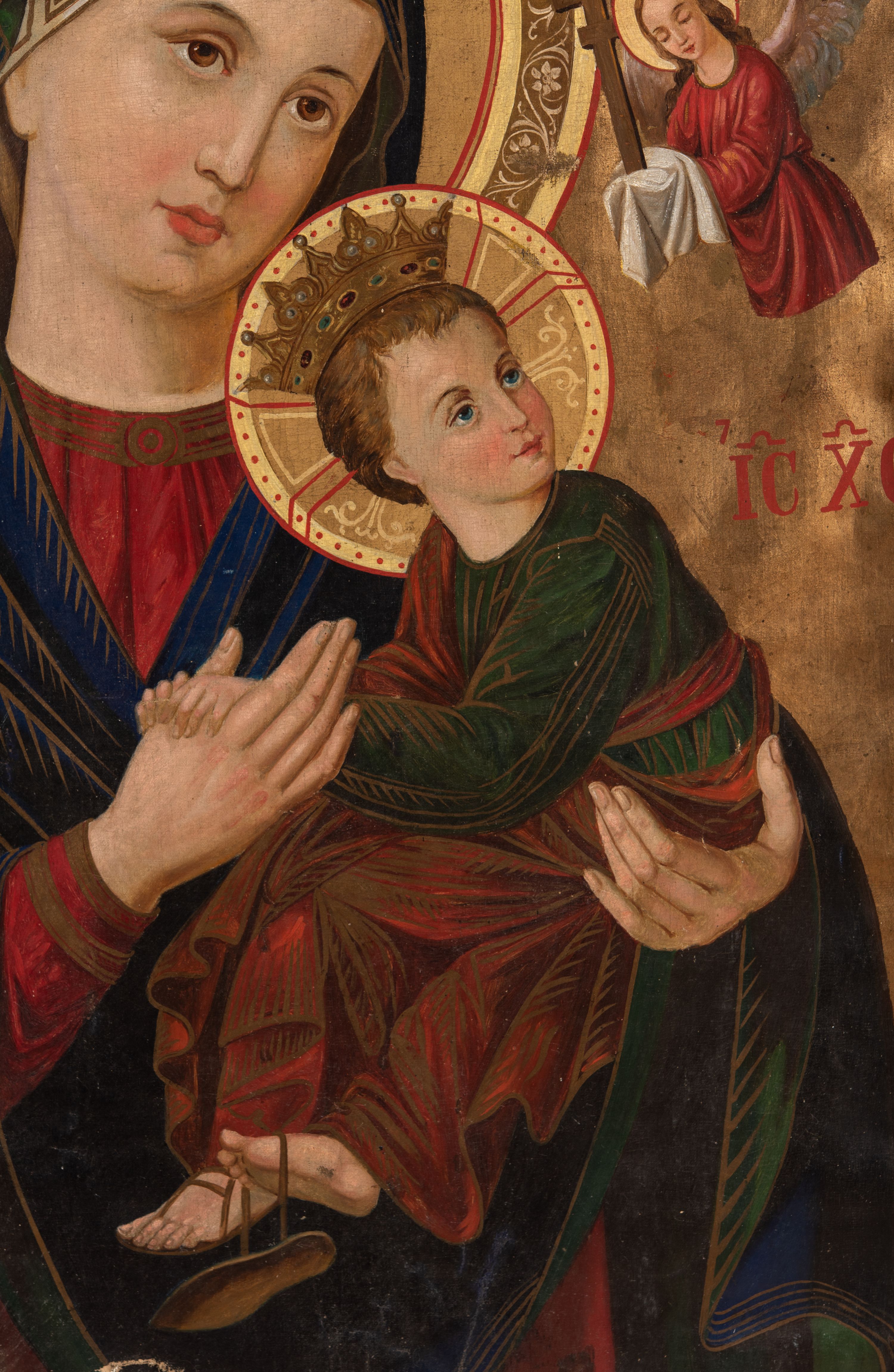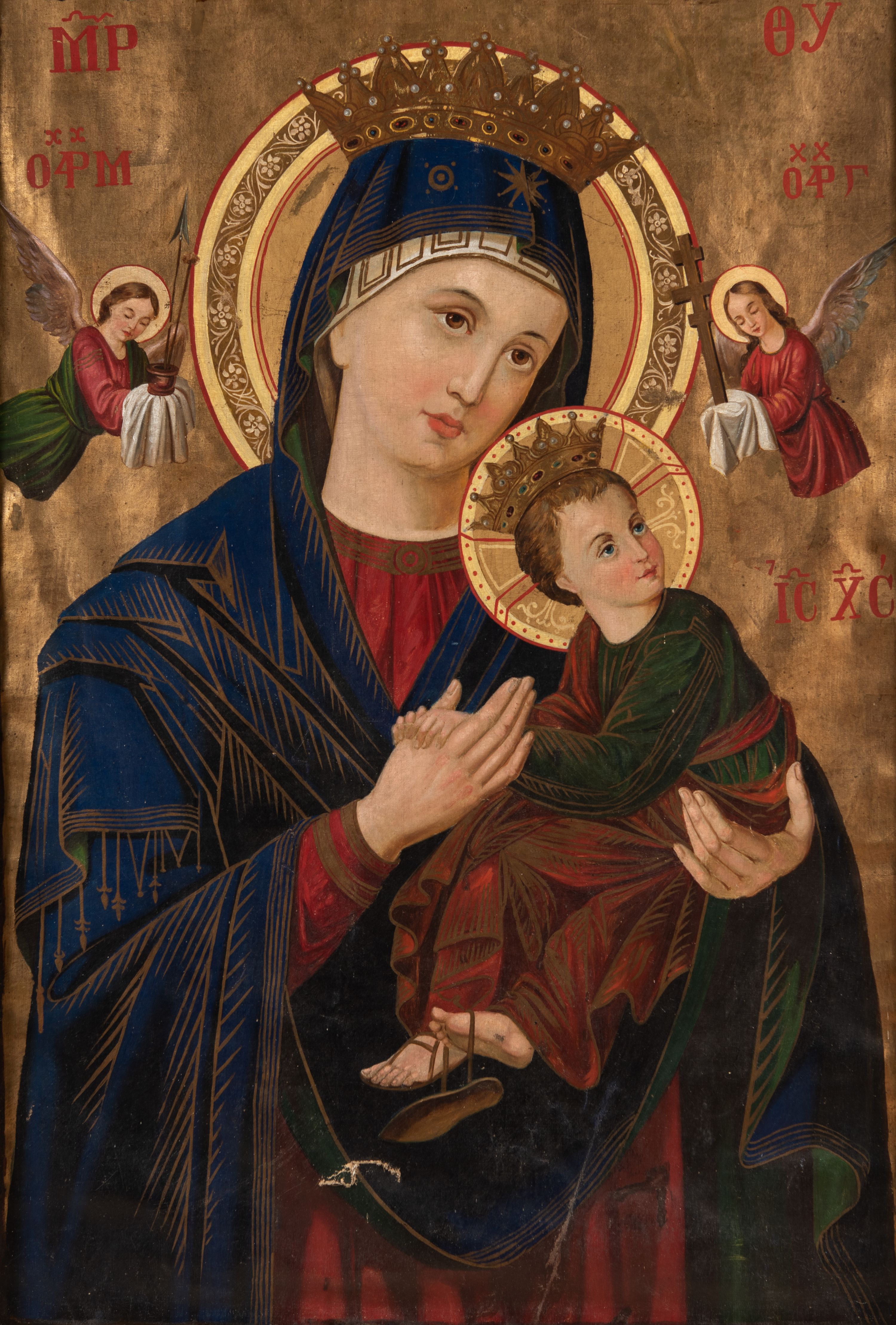 Na rewersie znajduje się wizerunek Matki Boskiej Nieustającej Pomocy. Maria ukazana jest w półpostaci, frontalnie, z Dzieciątkiem Jezus na lewym ręku. Ubrana jest w czerwoną suknię z długimi rękawami ze złotymi obszyciami oraz niebieski płaszcz nałożony na głowę, spod którego widać białą chustę. Dzieciątko Jezus zwrócone jest profilem w prawo, z głową odwróconą w lewo. Owalne twarze postaci charakteryzują linearnie opracowane rysy, z długimi, prostymi nosami oraz drobnymi, plastycznie opracowanymi ustami. Oczy Marii mają migdałowy, lekko zaokrąglony kształt, wzrok skierowany jest w prawo, nieco ku górze. Ubrane w długą, zieloną sukienkę i czerwony płaszcz Dzieciątko ujmuje oburącz dłoń Marii. Z jego widocznej spod szat stopy zsuwa się sandał. Jezus spogląda w kierunku niewielkiej sylwetki jednego z dwóch aniołów znajdujących się po bokach głowy Marii. Anioł po lewej stronie, ubrany w czerwoną suknię i zielony płaszcz, trzyma włócznię, trzcinę z gąbką i naczynie na ocet. Anioł po prawej, w czerwonej szacie, trzyma krzyż. Głowy Marii i Jezusa wieńczą korony w typie otwartym, a okalają dekoracyjne nimby. W górnej partii obrazu napisy czerwoną farbą - po lewej stronie „MP”, po prawej „ΘΥ”, po prawej stronie, obok głowy Dzieciątka „IC-XC”, nad aniołem po lewej stronie „ΟΡМ”, nad aniołem po prawej stronie „ΡГ”. Jednolite tło jest utrzymane w kolorze złotym. Fałdowania szat podkreślają złote linie.