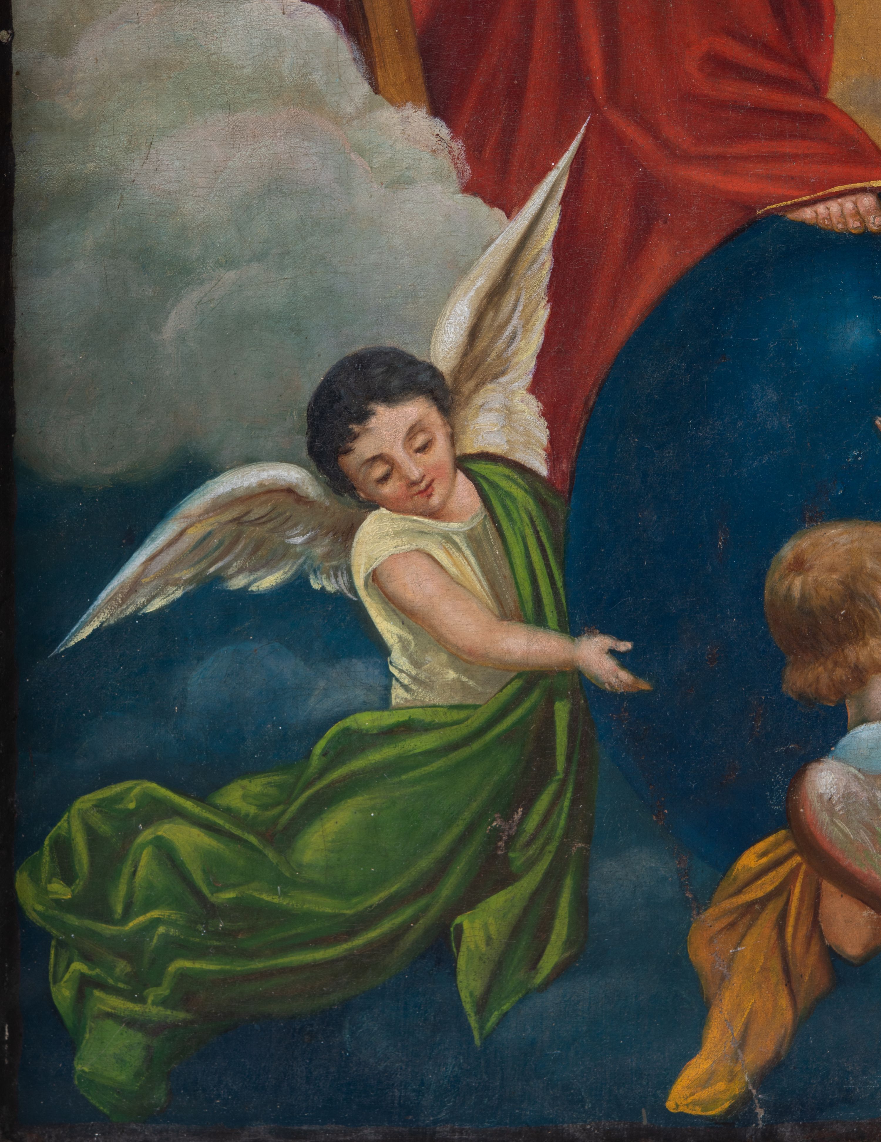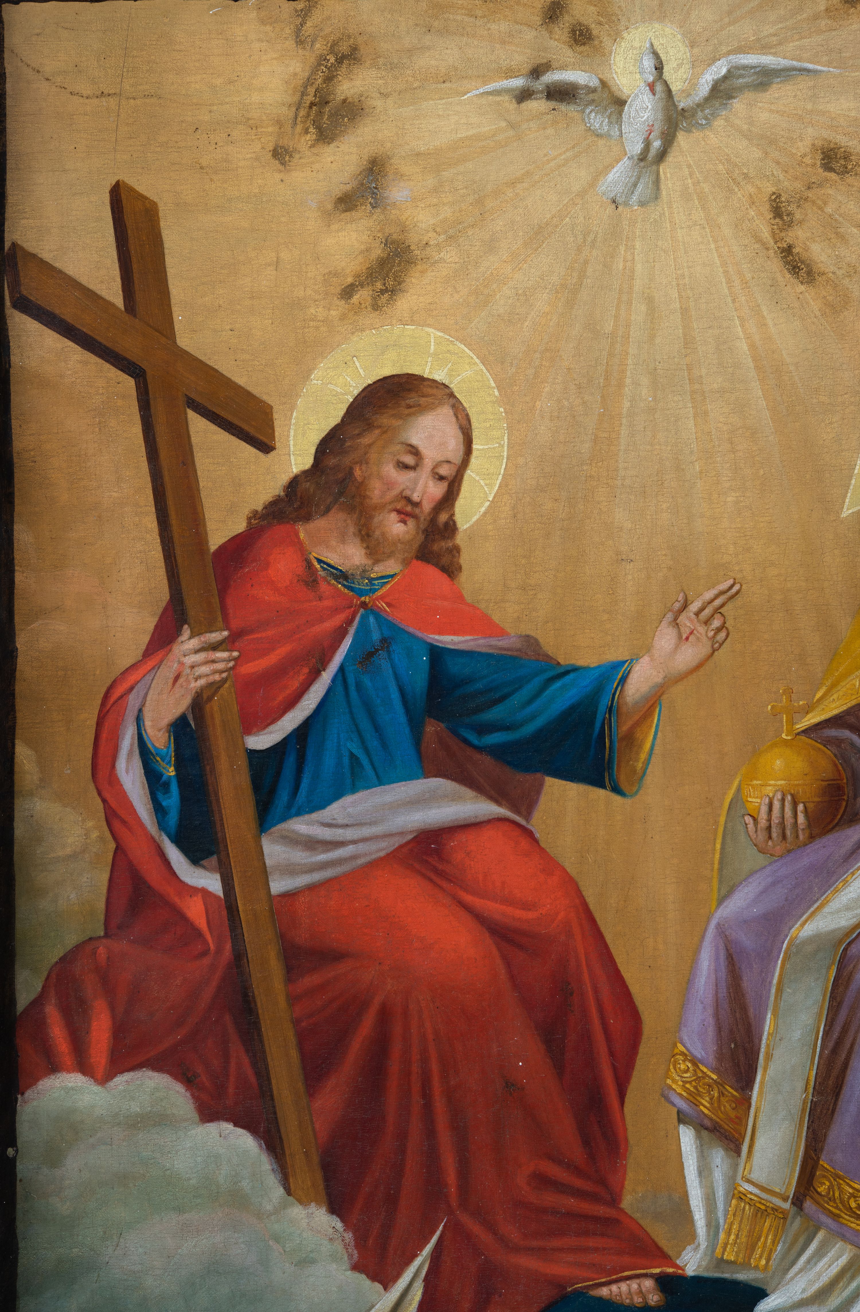 Stan zachowania dobry, ubytki w warstwie malarskiej, drobne pofałdowania płótna.