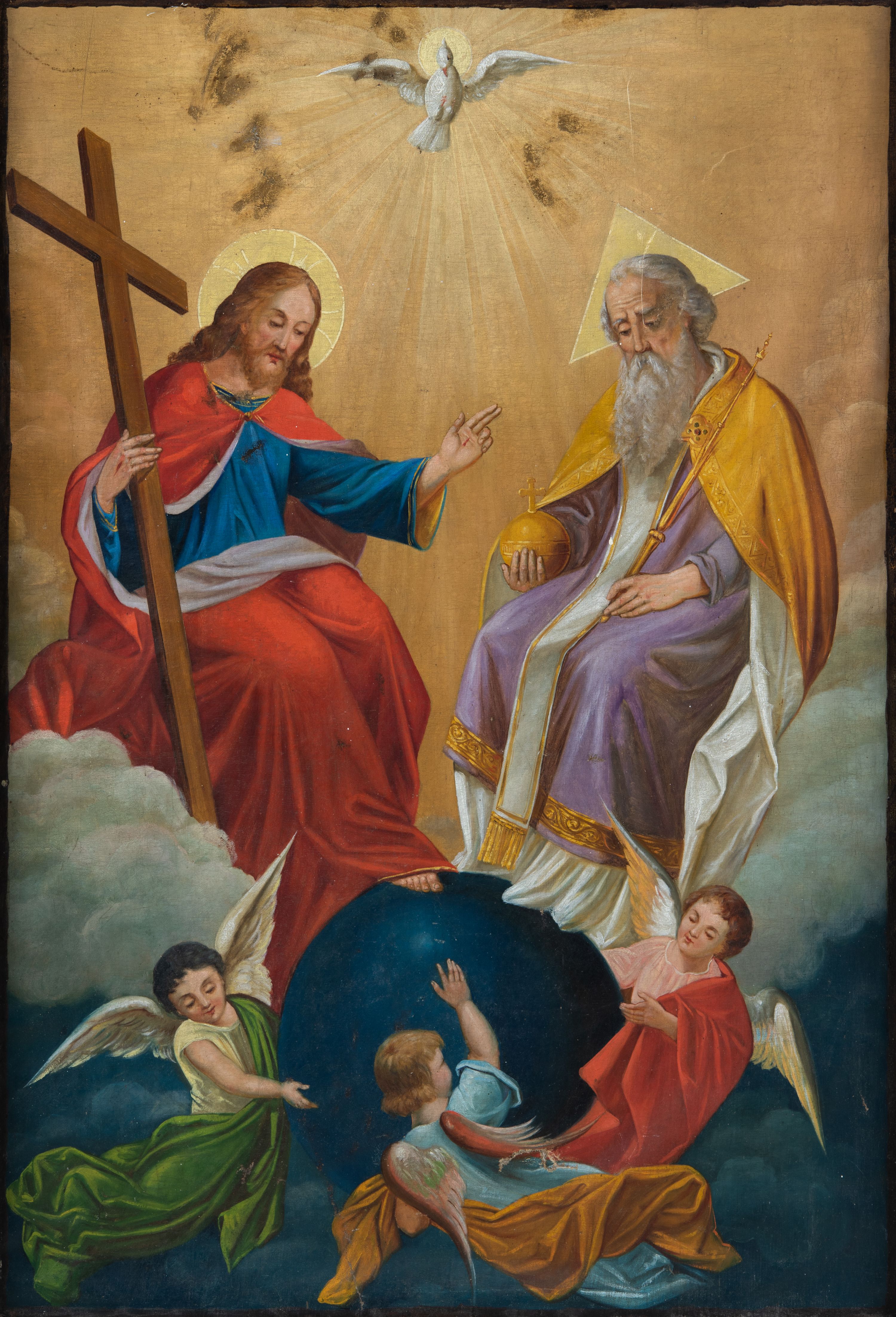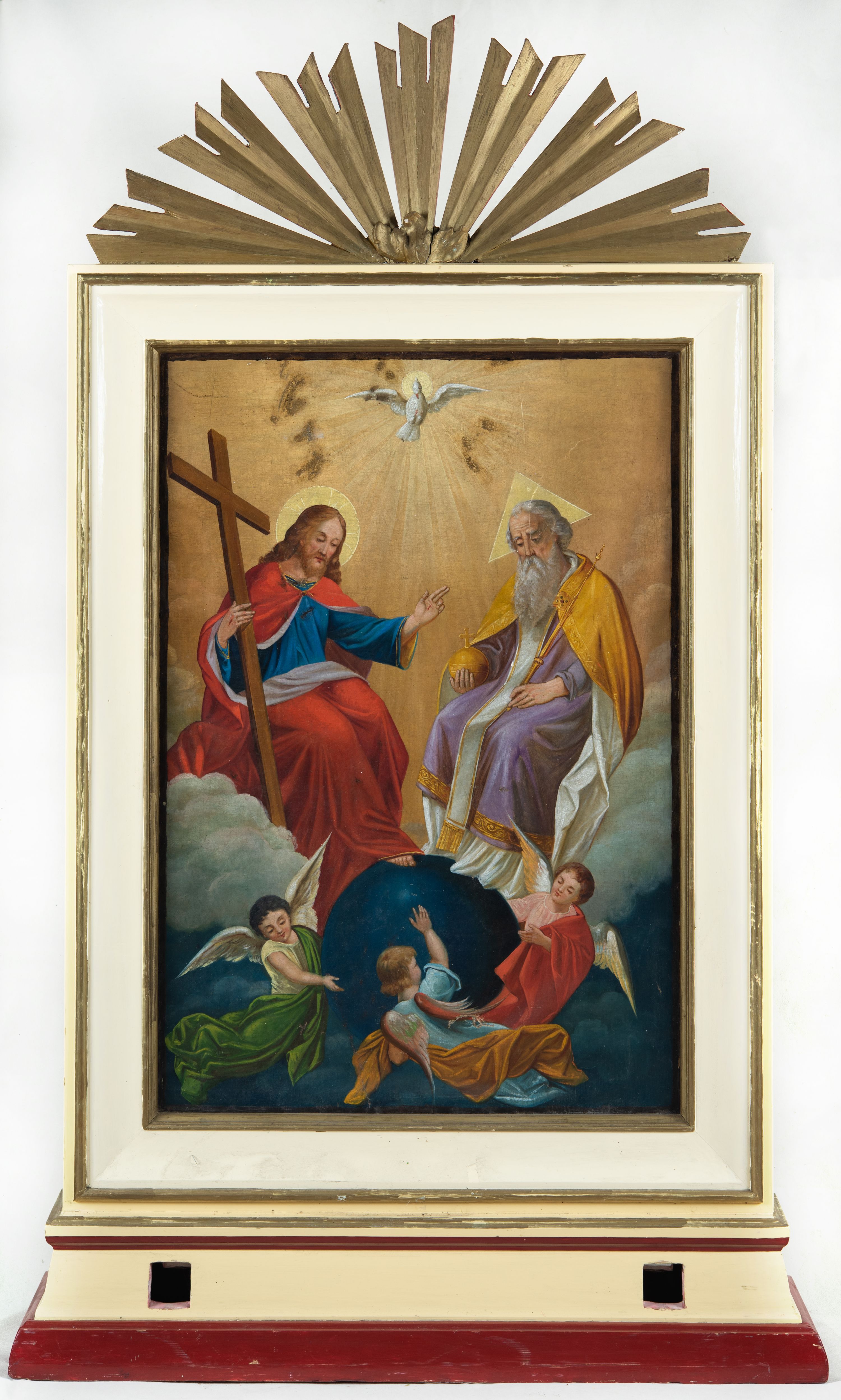 Feretron obrazowy osadzony na prostopadłościennej, profilowanej, zwężającej się ku górze podstawie z parą otworów na drążki, ujęty jest profilowaną ramą zwieńczoną motywem półkolistej, promienistej glorii. Pola obrazowe mają kształt stojących prostokątów. Na awersie znajduje się wielofiguralna kompozycja przedstawiająca Trójcę Świętą pośród obłoków. Po prawej stronie Bóg Ojciec ukazany w pozycji siedzącej, w trzech czwartych zwrócony w lewo. Postać charakteryzuje fizjonomia mężczyzny w podeszłym wieku, z krótkimi siwymi włosami i długim zarostem. Ubrany jest w podwójną suknię białą spodnią i jasnofioletową wierzchnią ze złoconym galonem, biały paliusz oraz spiętą pod szyją złoconą kapę z białym podszyciem. W prawej ręce trzyma złotą kulę zwieńczoną krzyżem, w lewej berło. Głowę ujmuje trójkątny nimb. Naprzeciw Boga Ojca siedzi zwrócony Syn Boży. Pochyloną lekko głowę charakteryzuje pociągła twarz o delikatnych rysach i krótkim, brązowym zaroście. Długie, falowane włosy opadają na plecy. Ubrany jest w niebieską suknię i spięty pod szyją czerwony płaszcz z białym podszyciem, osłaniający nogi. Lewą, wysuniętą przed siebie rękę unosi w geście błogosławieństwa, prawą podtrzymuje krzyż. Na dłoniach widoczne są ślady po gwoździach. Głowę okala nimb krzyżowy. Bóg Ojciec i Jezus wzrok kierują ku znajdującemu się pod ich stopami ciemnoniebieskiemu globowi ziemskiemu otoczonemu sylwetkami trzech unoszących się aniołów ubranych w biało-zielone, błękitno-pomarańczowe i różowo-czerwone szaty. U góry, pośrodku kompozycji znajduje się gołębica Ducha Świętego na tle promienistej glorii. Postaci ukazane są tle biało-żółtych obłoków oraz widocznego w dolnej partii ciemnoniebieskiego nieba.
