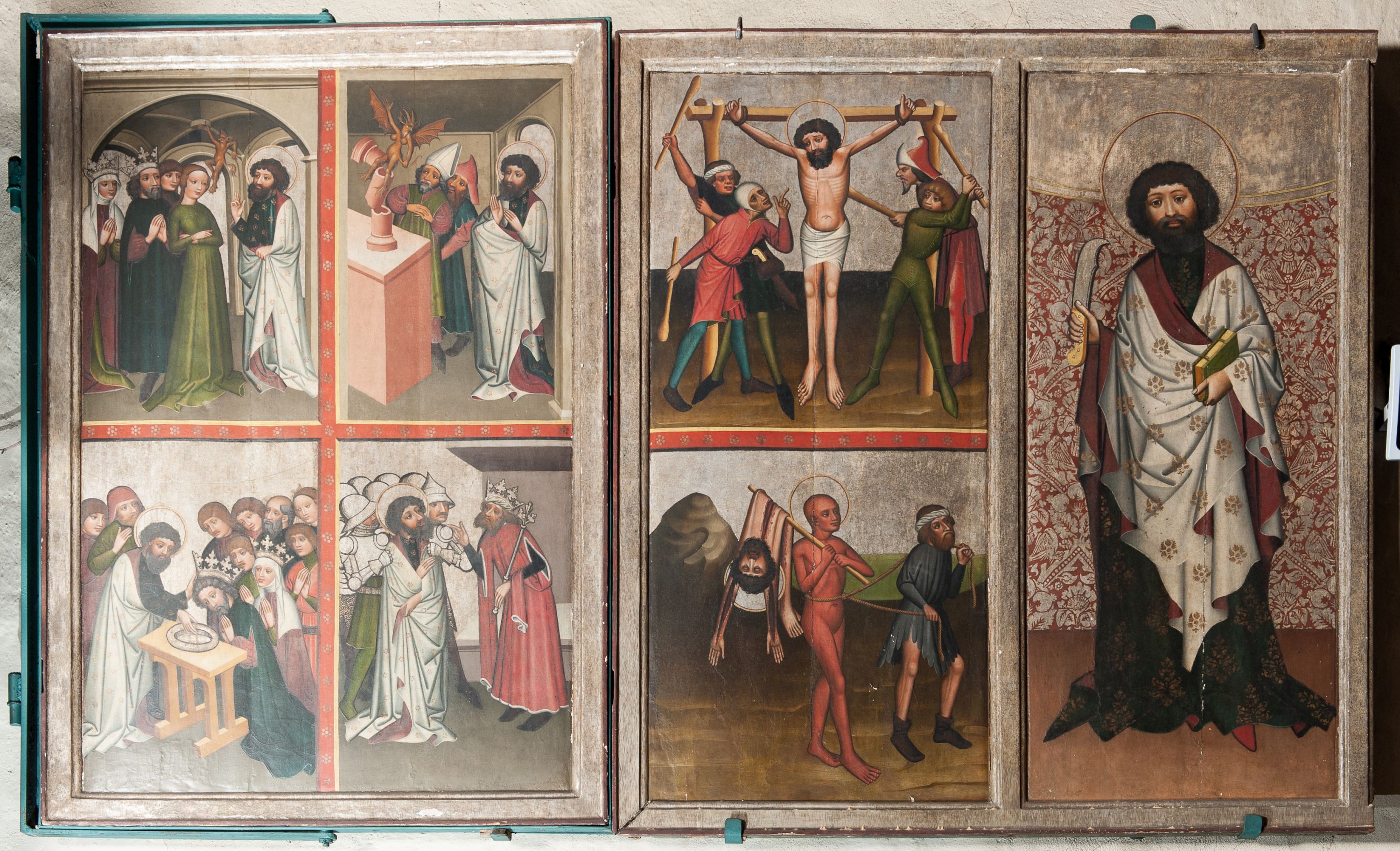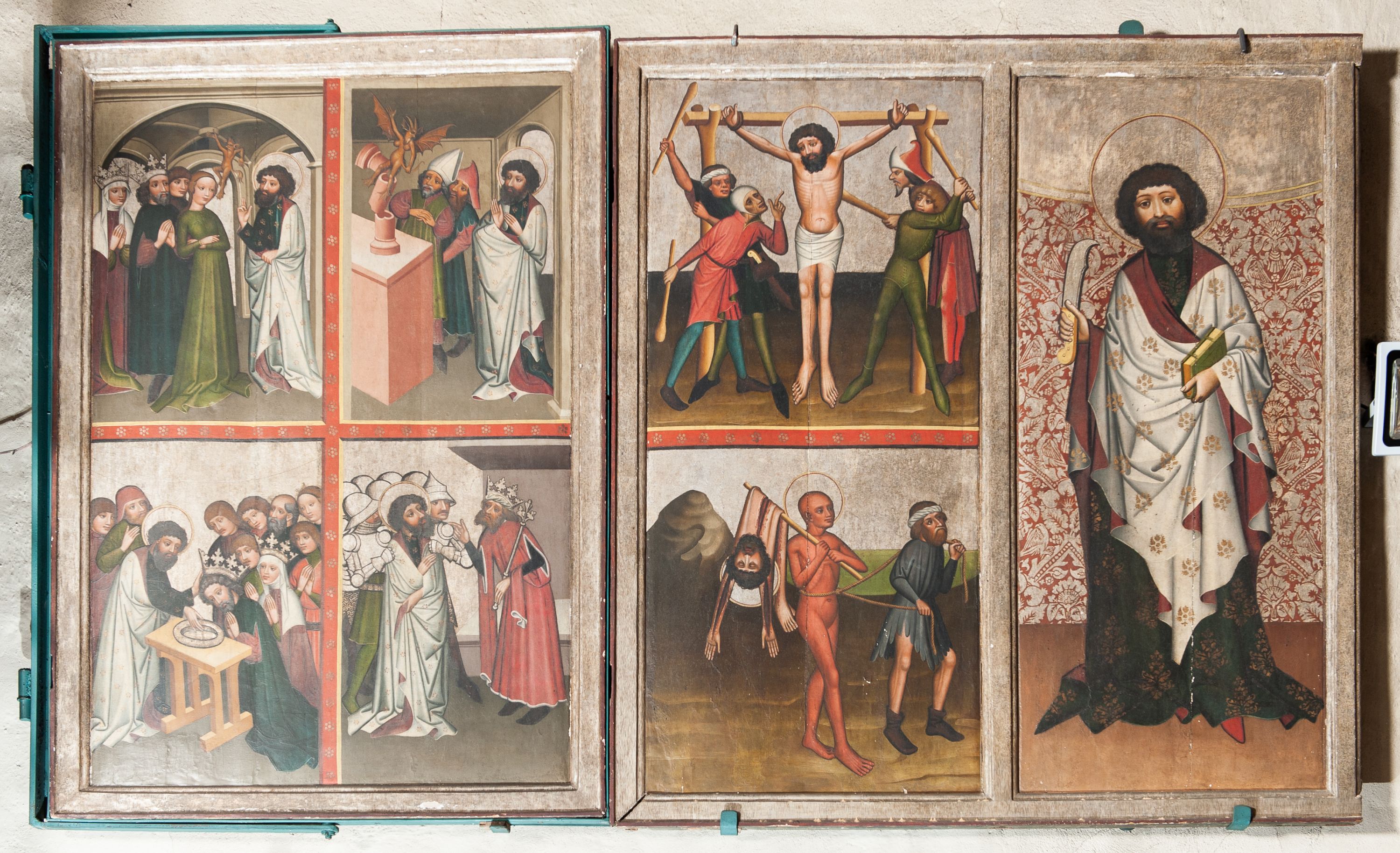 Tryptyk sprawiony do gotyckiego kościoła jako ołtarz główny. Obecnie zdekompletowany, ocalałe jedno skrzydło c kwatery zawieszone na północnej ścianie prezbiterium.