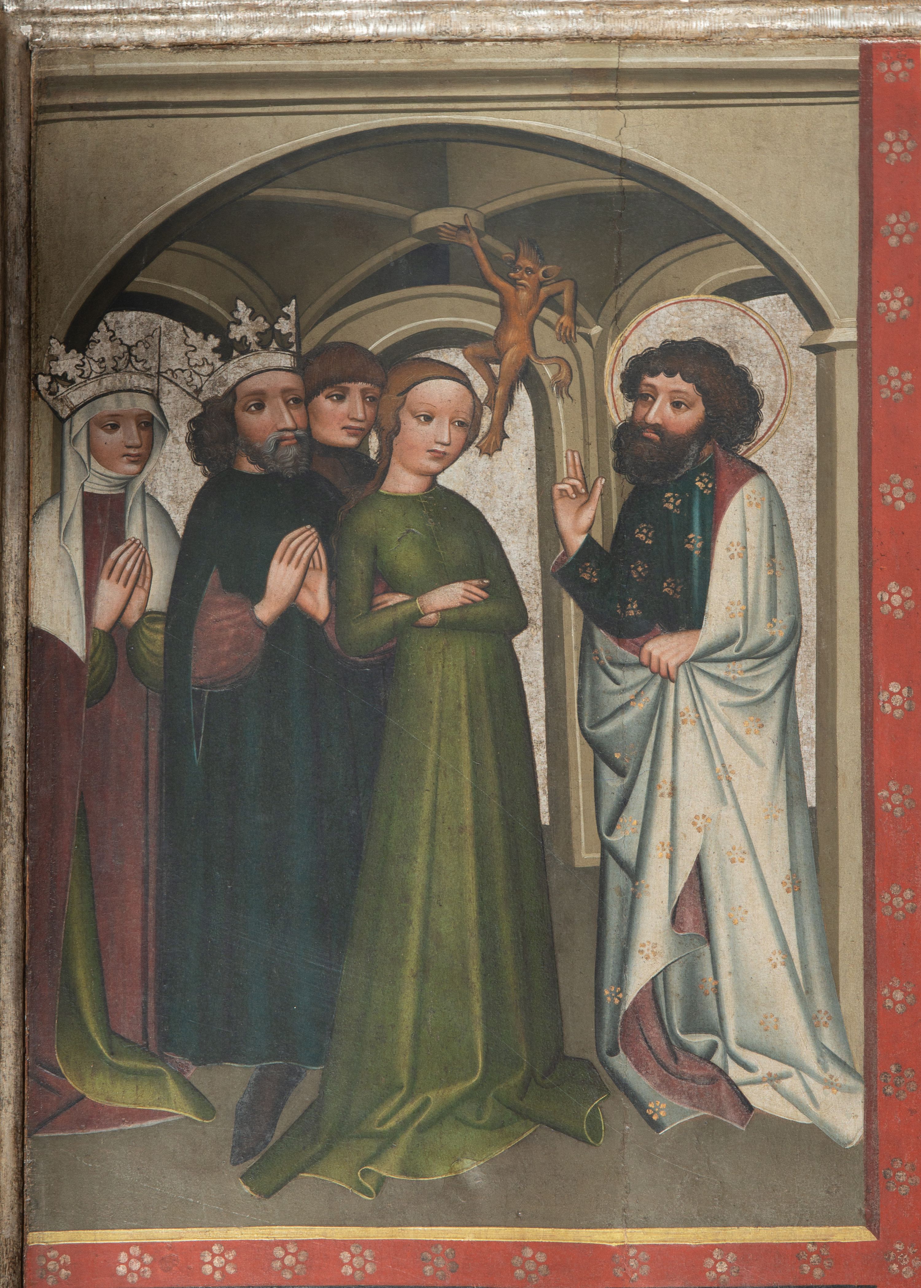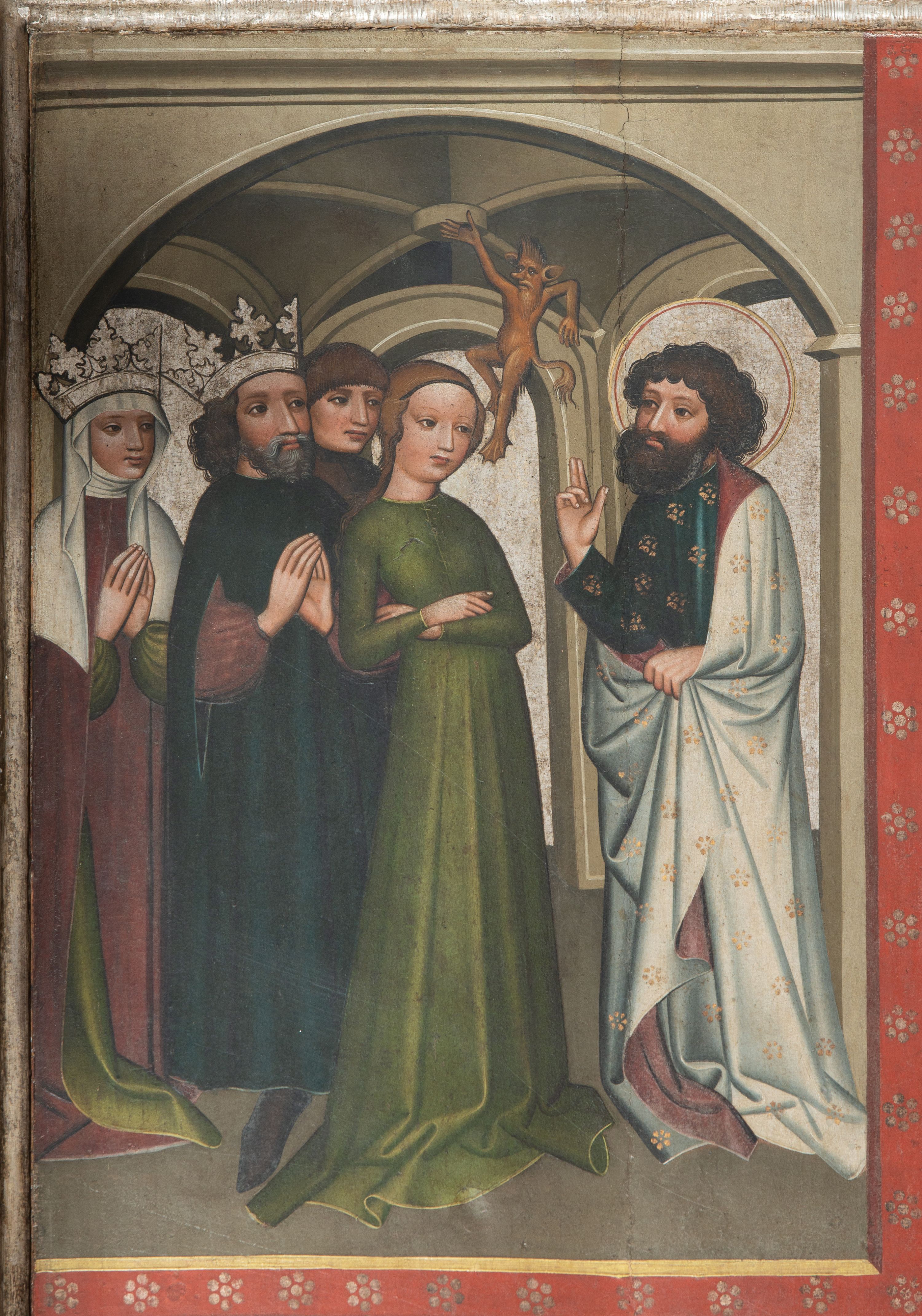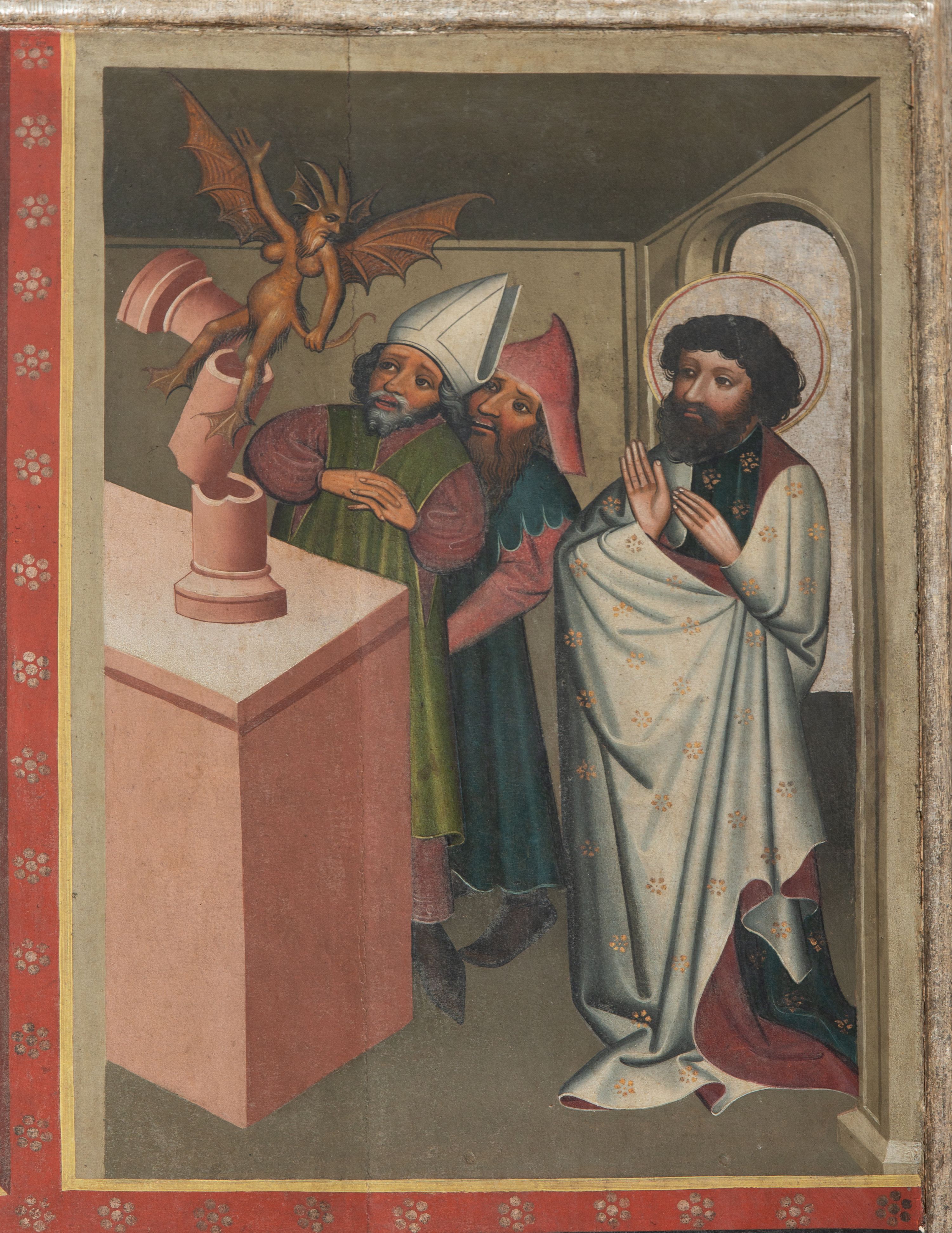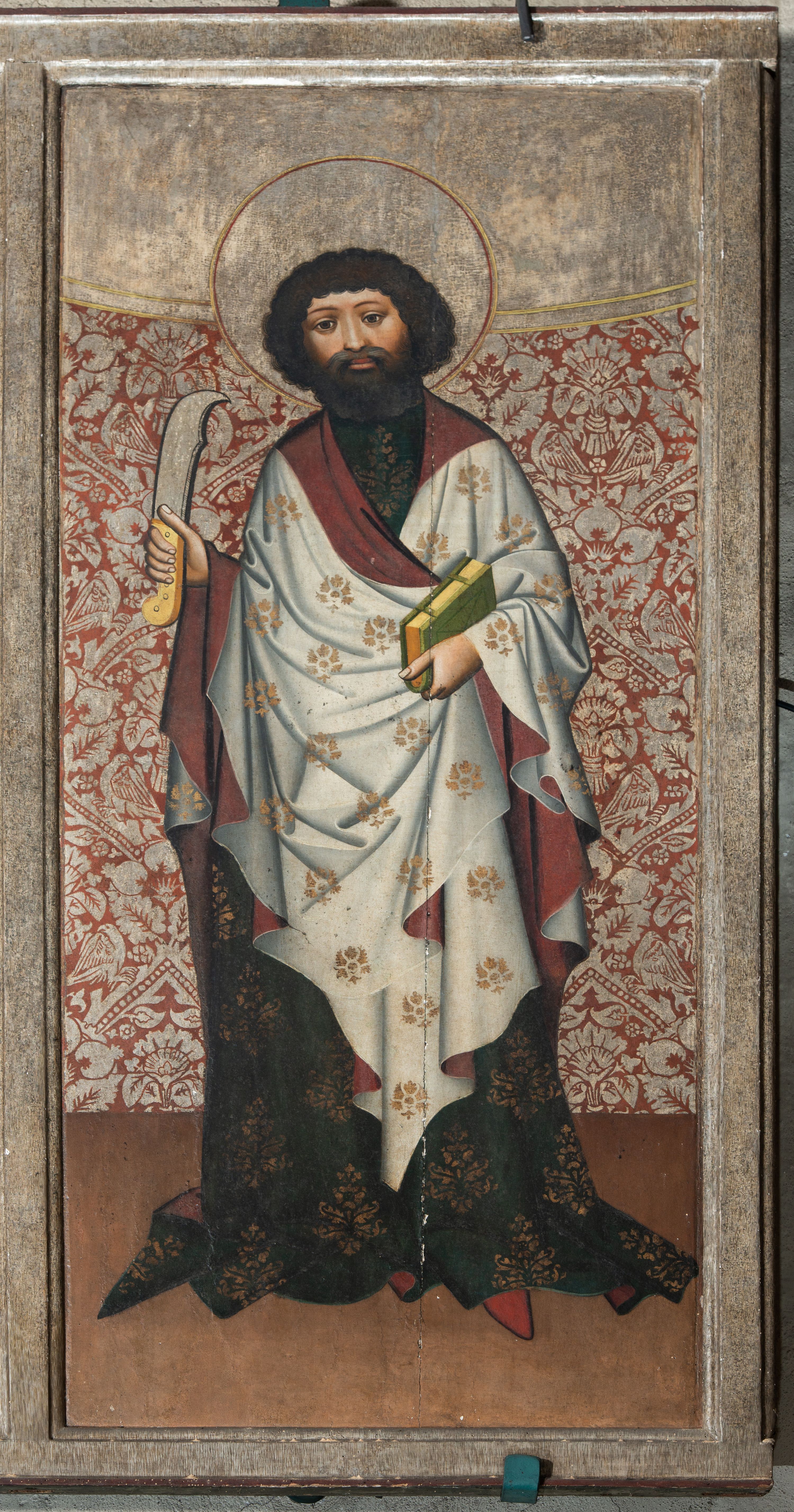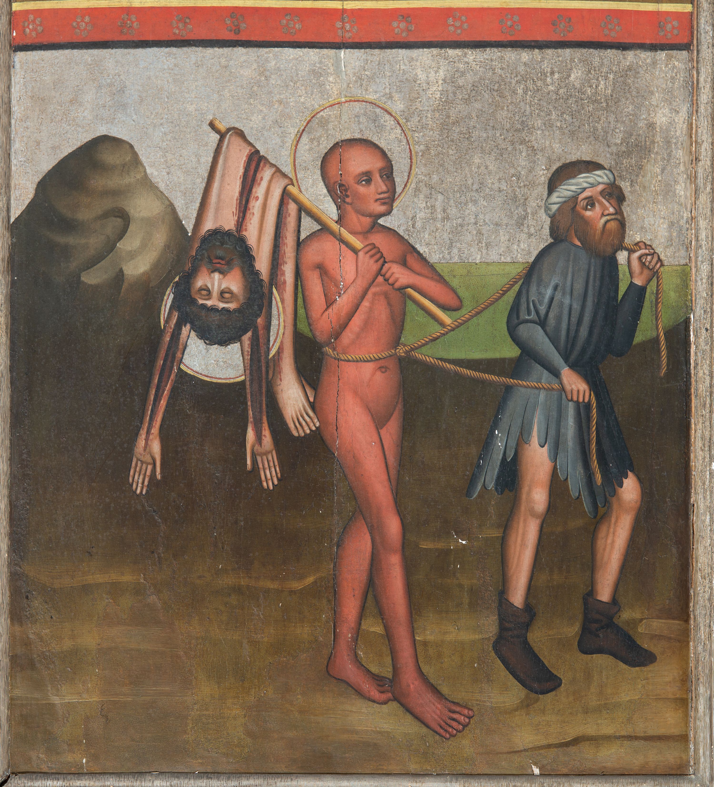 Prawe, dwustronnie malowane skrzydło oraz fragment części środkowej (2/3 całości) gotyckiego tryptyku malowanego temperą na drewnie. Na awersie skrzydła cztery sceny z życia i działalności św. Bartłomieja w Indiach: Uzdrowienie córki króla Polemiusza, Wypędzenie diabła ze świątyni, Chrzest króla Polemiusza i jego dworu oraz Pojmanie św. Bartłomieja. Na rewersie Modlitwa w Ogrojcu. Na fragmencie części środkowej (2/3 całości) umieszczono dwie sceny męczeństwa oraz duże całopostaciowe przedstawienie św. Bartłomieja stojącego frontalnie na tle wzorzystej tkaniny.