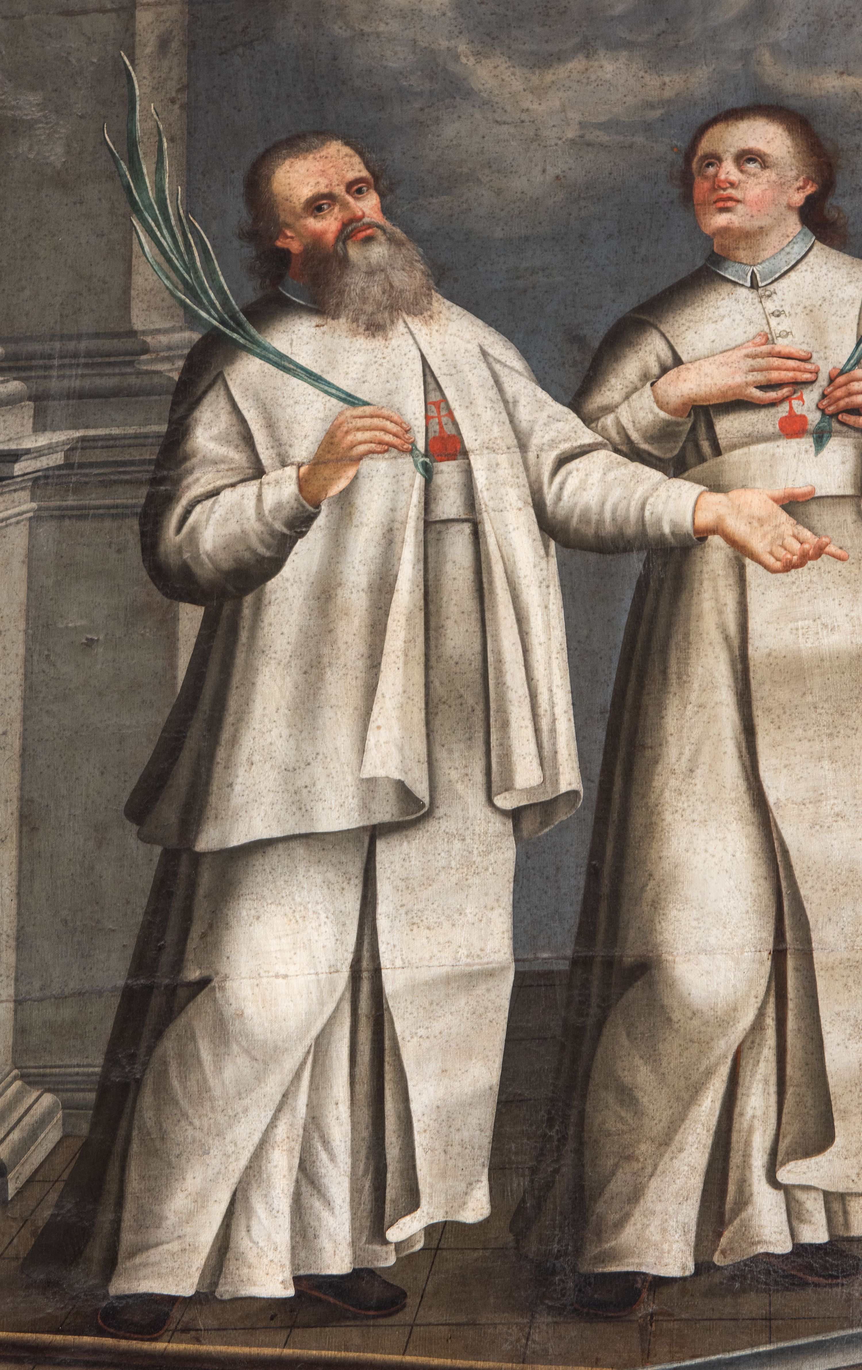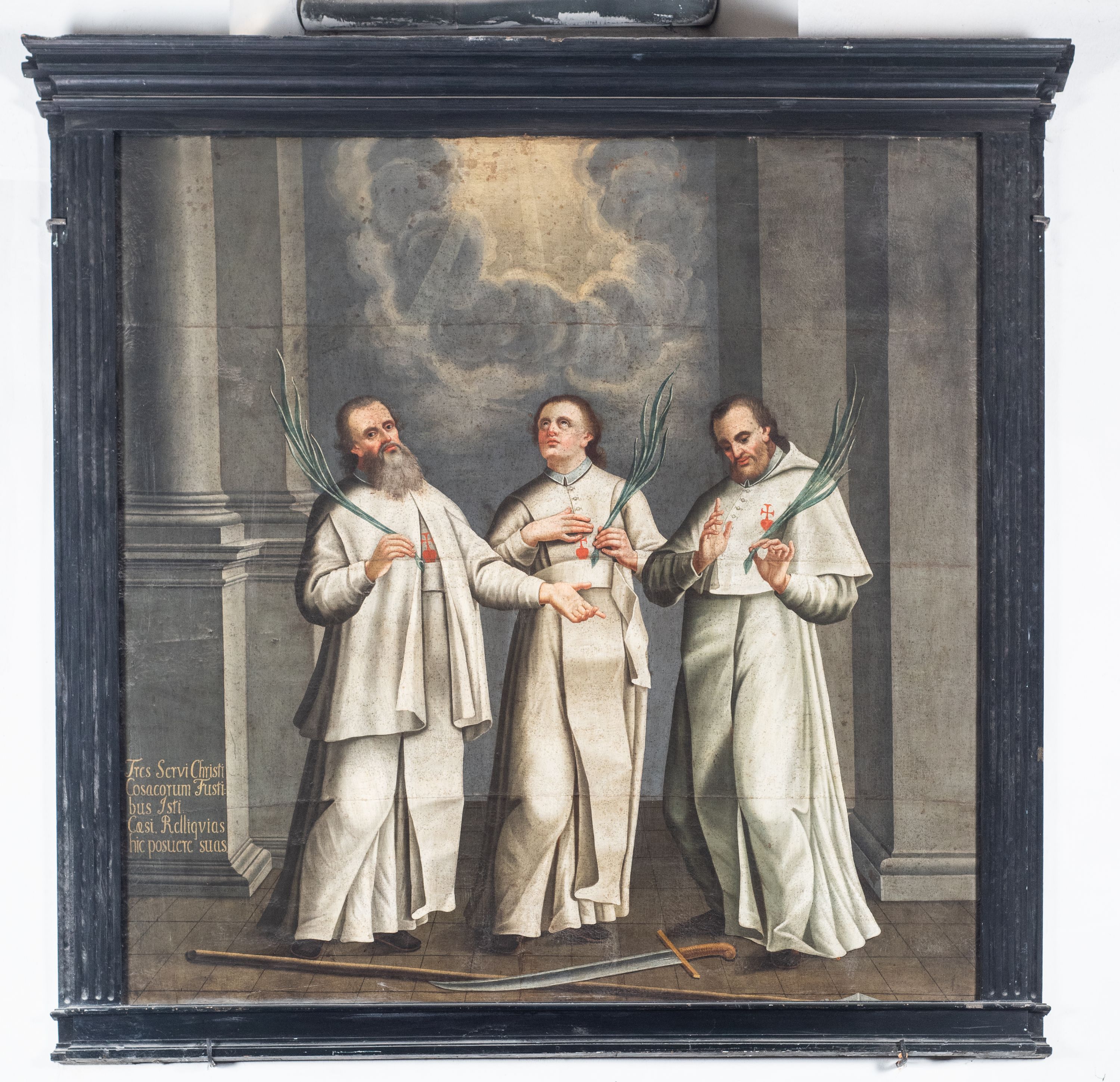 Obraz w kształcie leżącego prostokąta z przedstawieniem trzech świętych męczenników z zakonu kanoników regularnych. W centrum kompozycji ukazani trzej zakonnicy w postawie stojącej. Pośrodku święty ustawiony frontalnie w kontrapoście z prawą nogą ugiętą w kolanie, z rękami na wysokości piersi, w lewej trzyma palmę męczeństwa, głowę ma skierowaną delikatnie w prawą stronę i uniesioną do góry. Twarz młodzieńcza, szeroka z długim nosem, okolona krótkimi i ciemnobrązowymi włosami. Zakonnik po prawej stronie obrazu zwrócony delikatnie w prawo z lewą nogą ugiętą w kolanie, z głową pochyloną w dół, ręce ugięte w łokciach, w lewej trzyma palmę męczeństwa. Twarz podłużna z długim nosem, okolona delikatnym zarostem i ciemnobrązowymi włosami. Zakonnik po lewej stronie obrazu, zwrócony trzy czwarte w lewo z prawą nogą ugiętą w kolanie, z lewą ręką wyciągniętą w bok w prawej trzyma palmę męczeństwa. Twarz szeroka, okolona bujną i siwą brodą, włosy długie, opadające na plecy. Zakonnicy ubrani w białe habity i płaszcze zakonu kanoników regularnych ozdobione godłem zakonu: czerwonym sercem z krzyżem. Przed świętymi na podłodze leżą skrzyżowane: pałka i miecz. Całość ukazana we wnętrzu architektonicznym, flankowanym po bokach podporami: po prawej dwoma filarami na niskich cokołach, a po lewej kolumną i filarem ustawionymi na wysokich cokołach. Po lewej stronie obrazu, na cokole kolumny inskrypcja: „Tres Servi Christi / Cosacorum Fusti/bus Isti / Cesi. Relliqvias / hic posuere suas”. W tle za świętymi prześwit z pochmurnym niebem, rozświetlony w górnej części. Rama drewniana na cokole flankowana kanelowanymi pilastrami, zwieńczona profilowanym gzymsem, polichromowana na czarno.