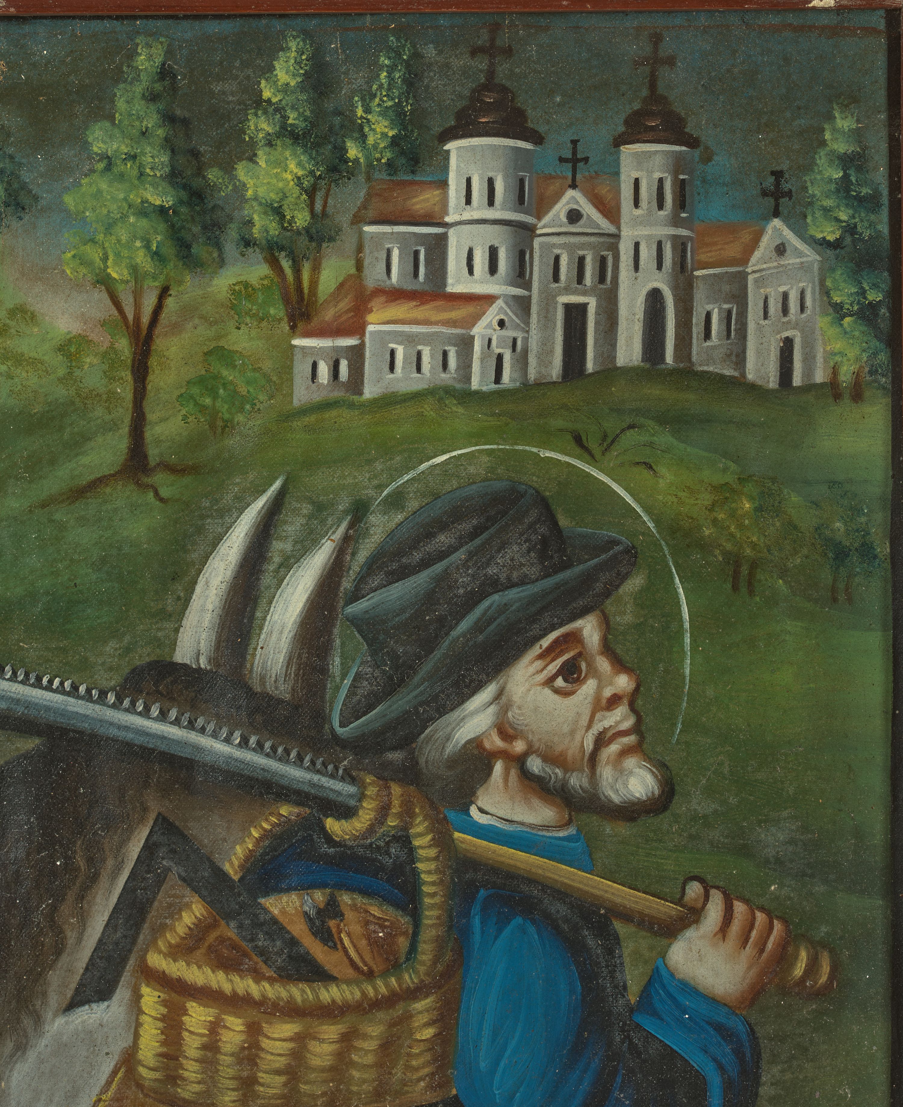 Tadeusz Seweryn analizują dzieła malarstwa ludowego wyróżnił dwa charakterystyczne typy malarstwa na płótnie: pierwszy charakteryzujący się zastosowaniem silnego konturu i jego wypełnienia płaską plamą barwą oraz drugi skierowany w stronę płynnego modelunku wyróżniającego się iluzjonistycznością. To właśnie ten drugi typ malarstwa ludowego reprezentuje omawiany obraz. W przeciwieństwie do pierwszej grupy dzieło nie posiada typowego okonturowania postaci. Tutaj przestrzenność formy została zaznaczona światłocieniowym podkreśleniem draperii szat. Nie ma tutaj również załamań tonów barwy, przez co pejzaż w tle został namalowany monotonnie, bez wyraźnego cofnięcia krajobrazu w głąb.