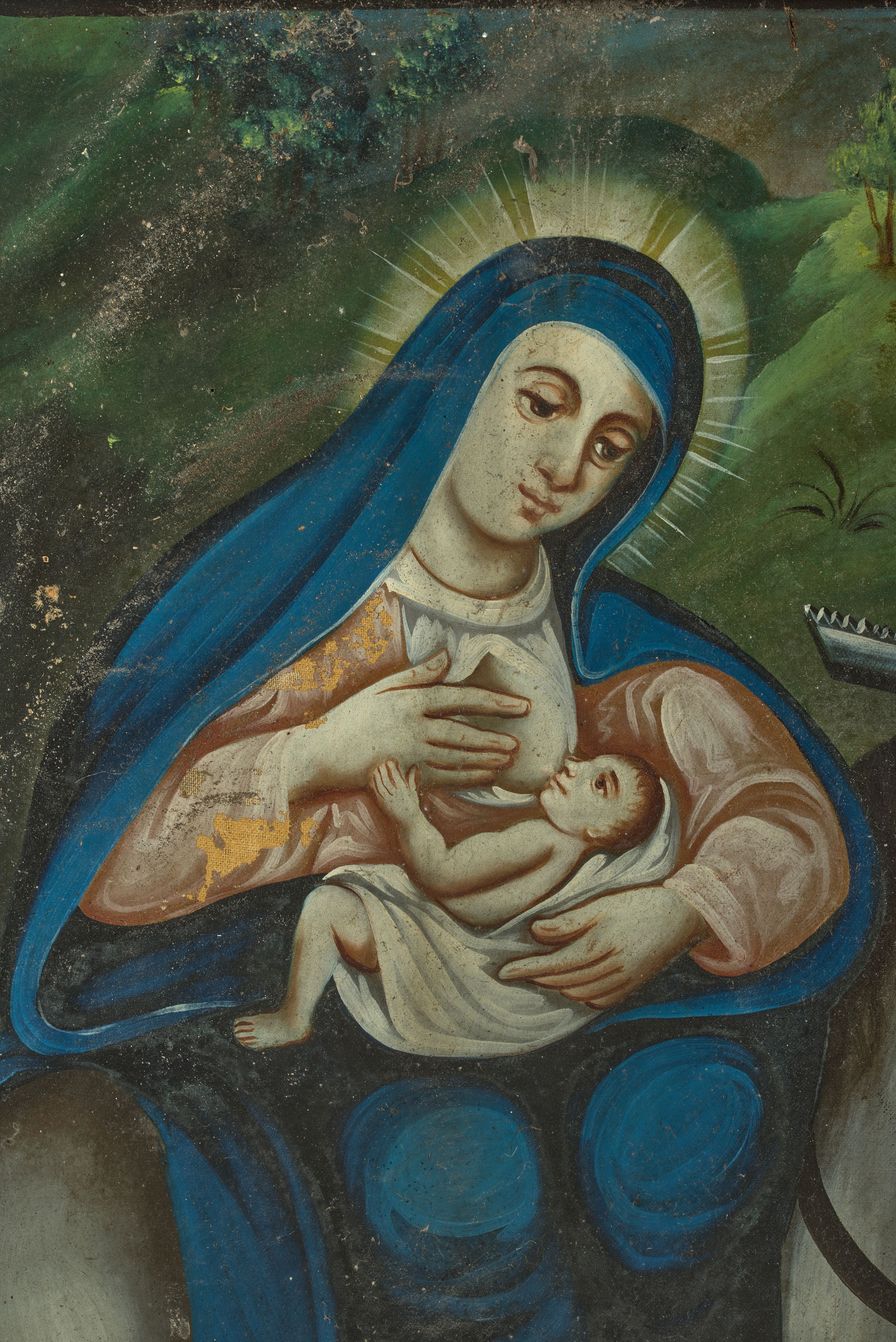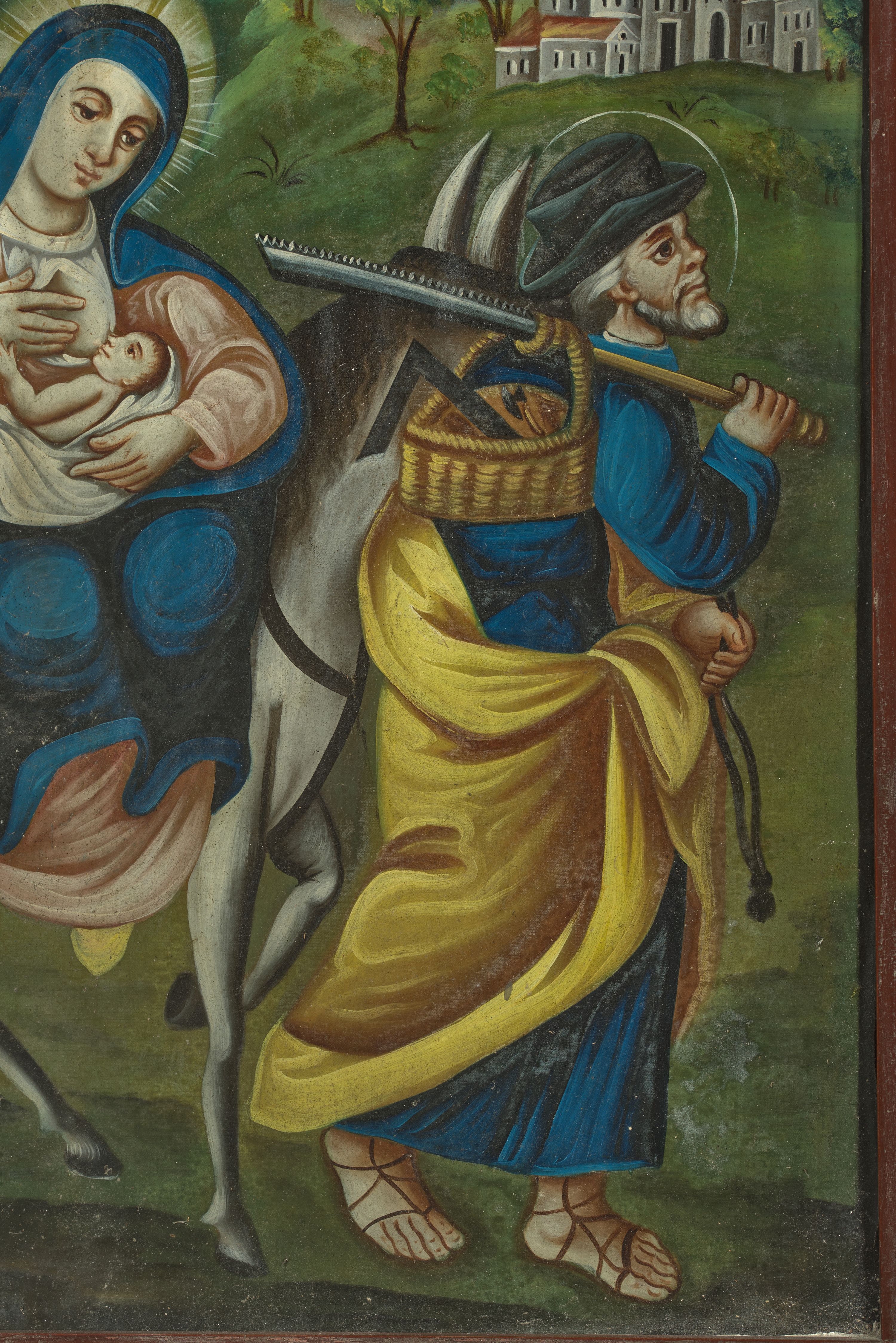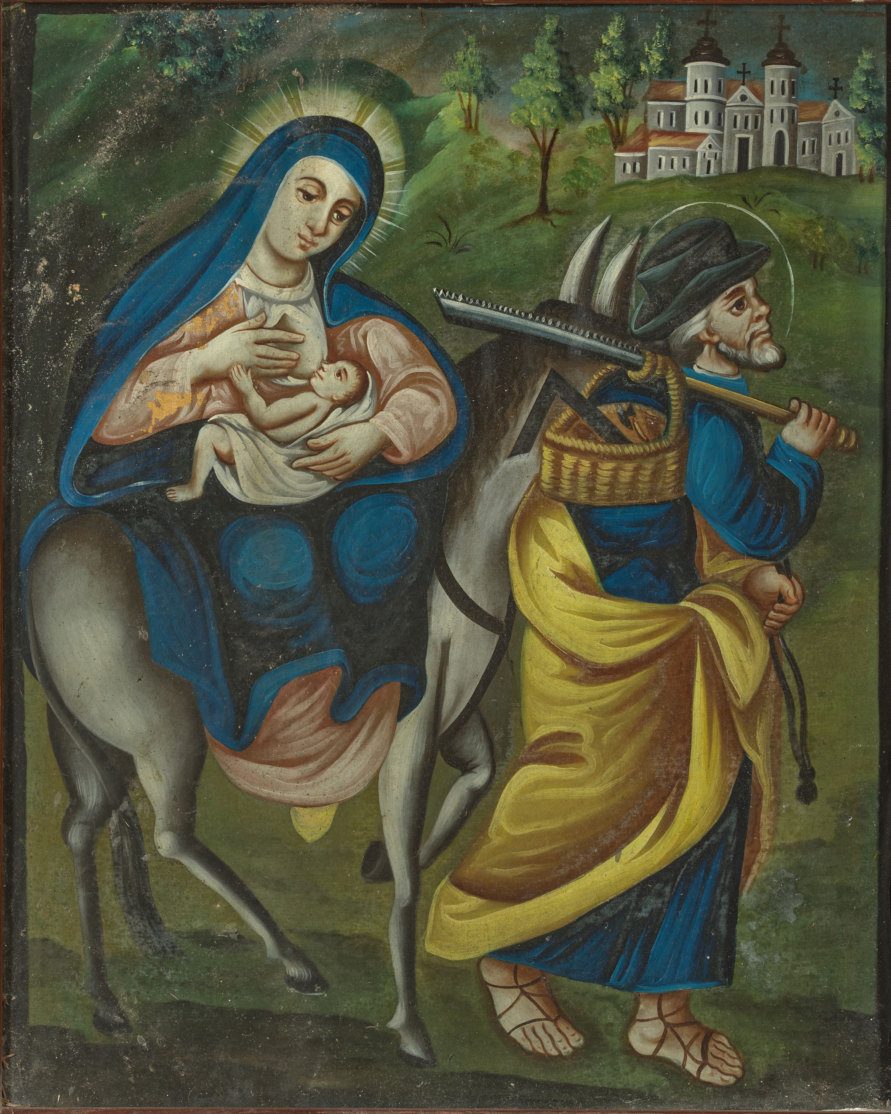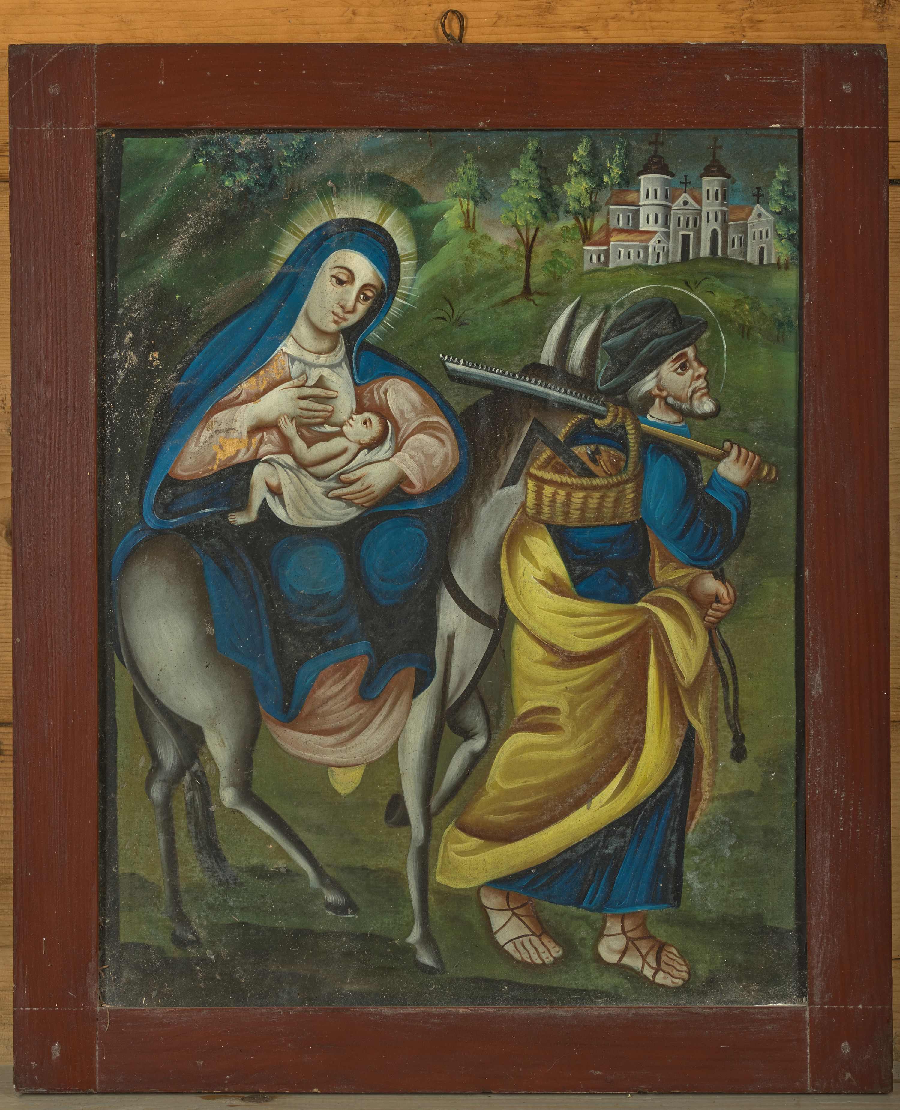 Obraz został namalowany przez nieznanego artystę około 1857 roku. Scena przedstawia Ucieczkę do Egiptu. Temat ten był szczególnie popularny w polskim malarstwie ludowym. Ukazuje jedną ze scen życiorysu Świętej Rodziny opisaną na kartach Ewangelii św. Mateusza: „Gdy oni odjechali oto anioł Pański ukazał się Józefowi we śnie i rzekł: «Wstań, weź Dziecię i Jego Matkę i uchodź do Egiptu; pozostań tam, aż ci powiem; bo Herod będzie szukał Dziecięcia, aby je zgładzić». On wstał, wziął w nocy Dziecię i Jego Matkę i udał się do Egiptu; tam pozostał aż do śmierci Heroda. Tak miało się spełnić słowo, które Pan powiedział przez Proroka: Z Egiptu wezwałem Syna mego” (Mt 2, 13-15).