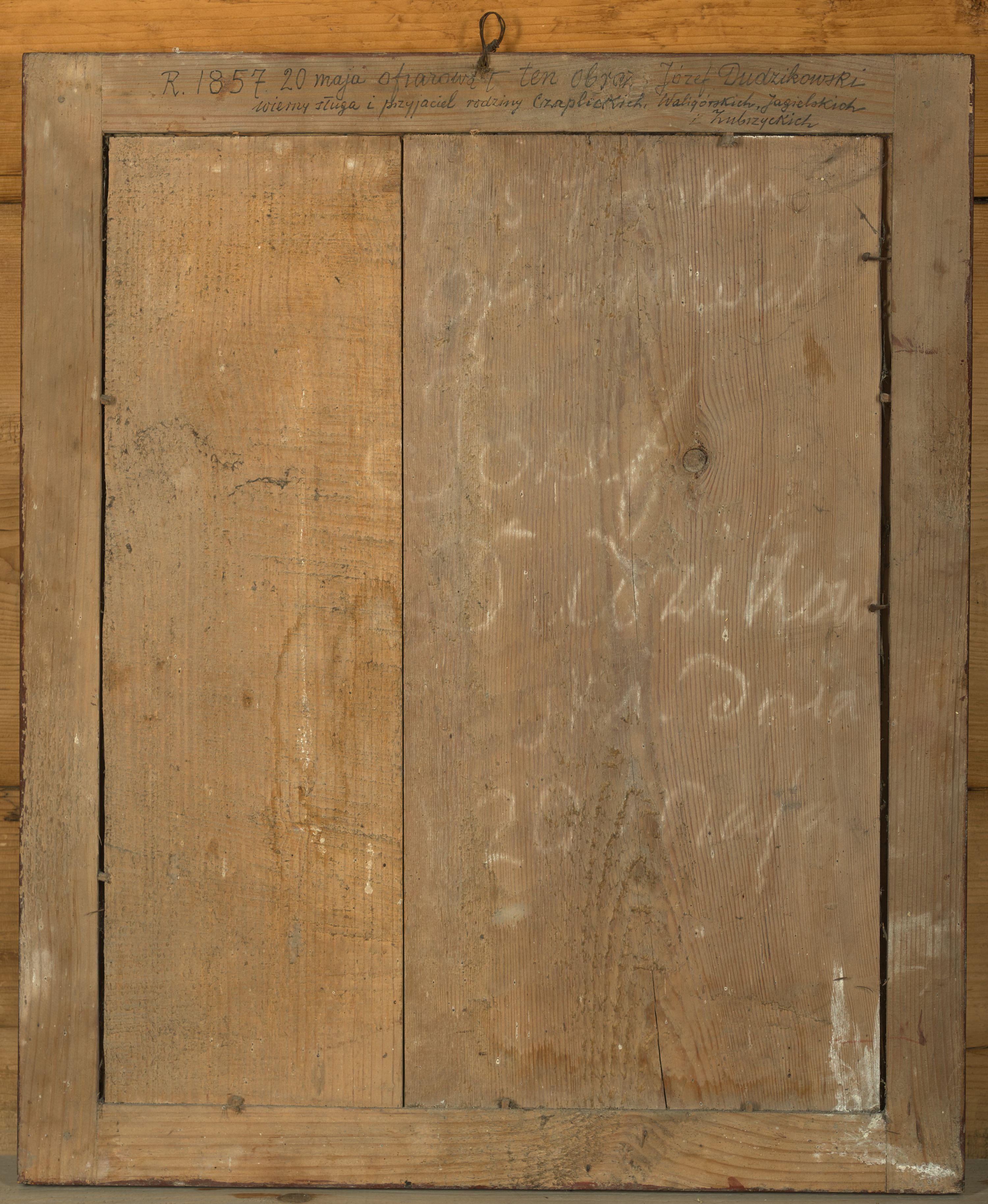 Na odwrociu, u góry, na ramie znajduje się napis: „R(oku) 1857 20 maja ofiarował ten obraz Józef Dudzikowski / wierny sługa i przyjaciel rodziny Czaplickich, Waligórskich, Jagielskich i Zubrzyckich”, a poniżej drugi napis, pisany białą kredą: „1857 roku ofiarował / Józef / Dudzikow/ski dnia / 20 maja”.