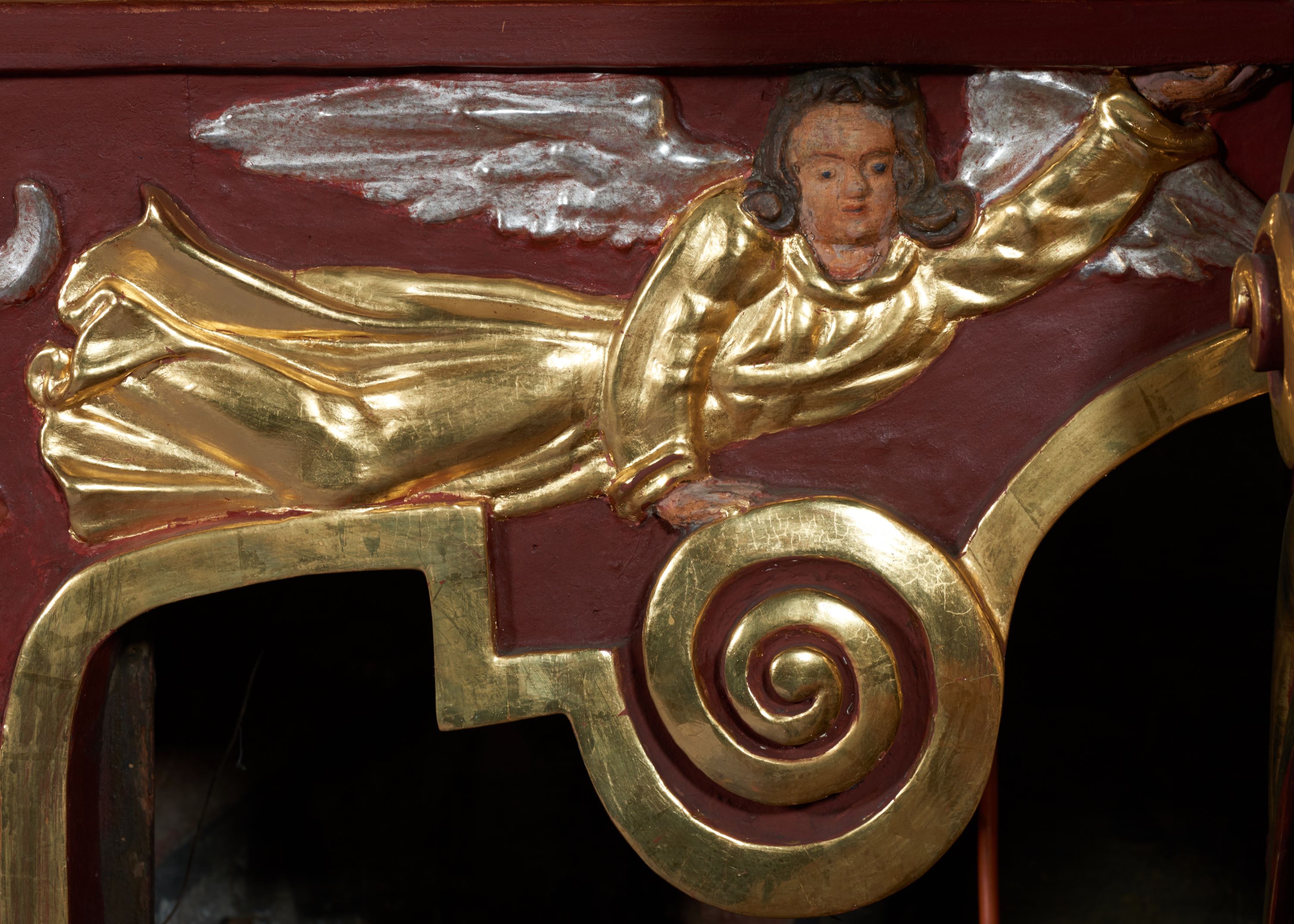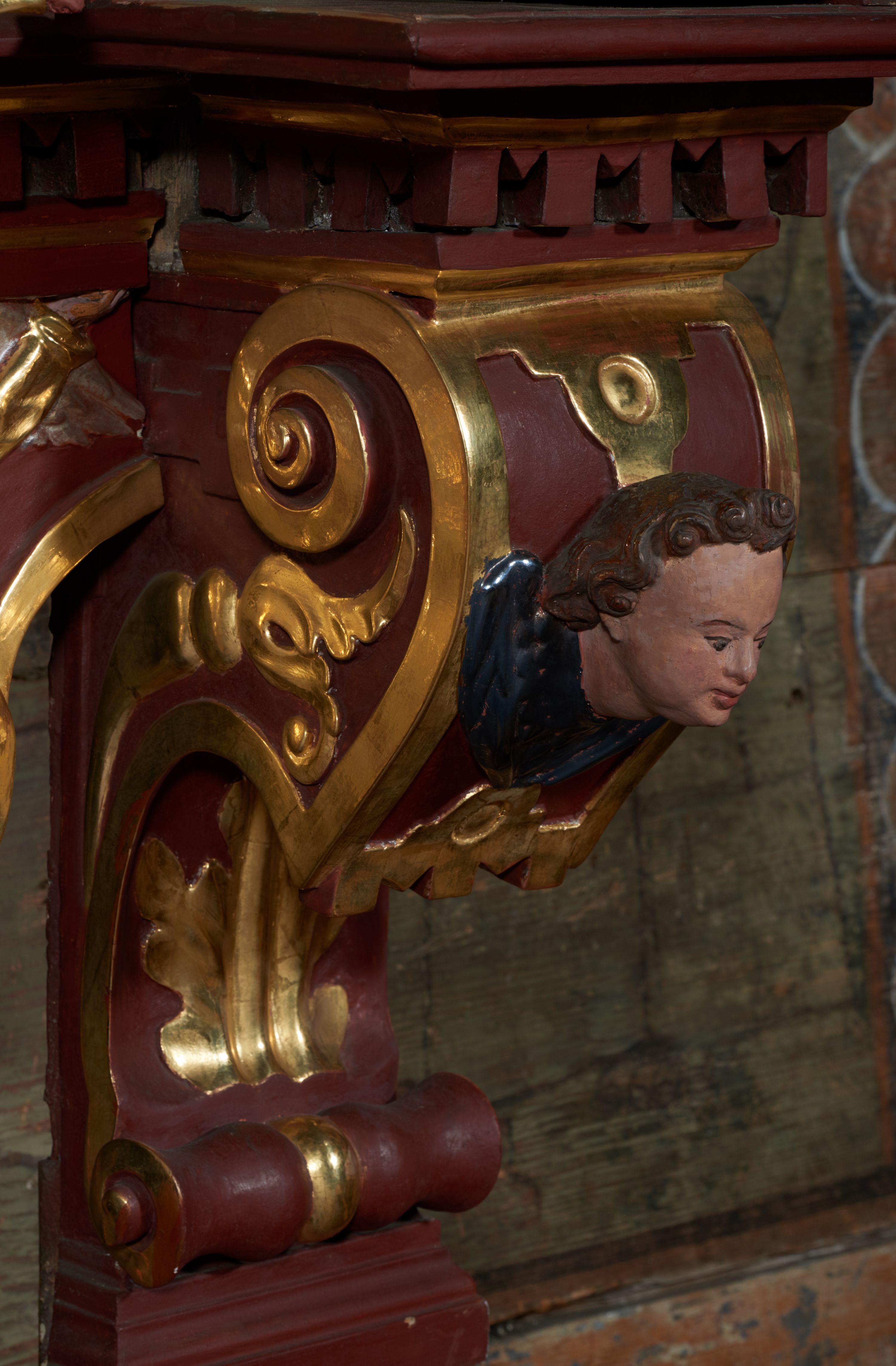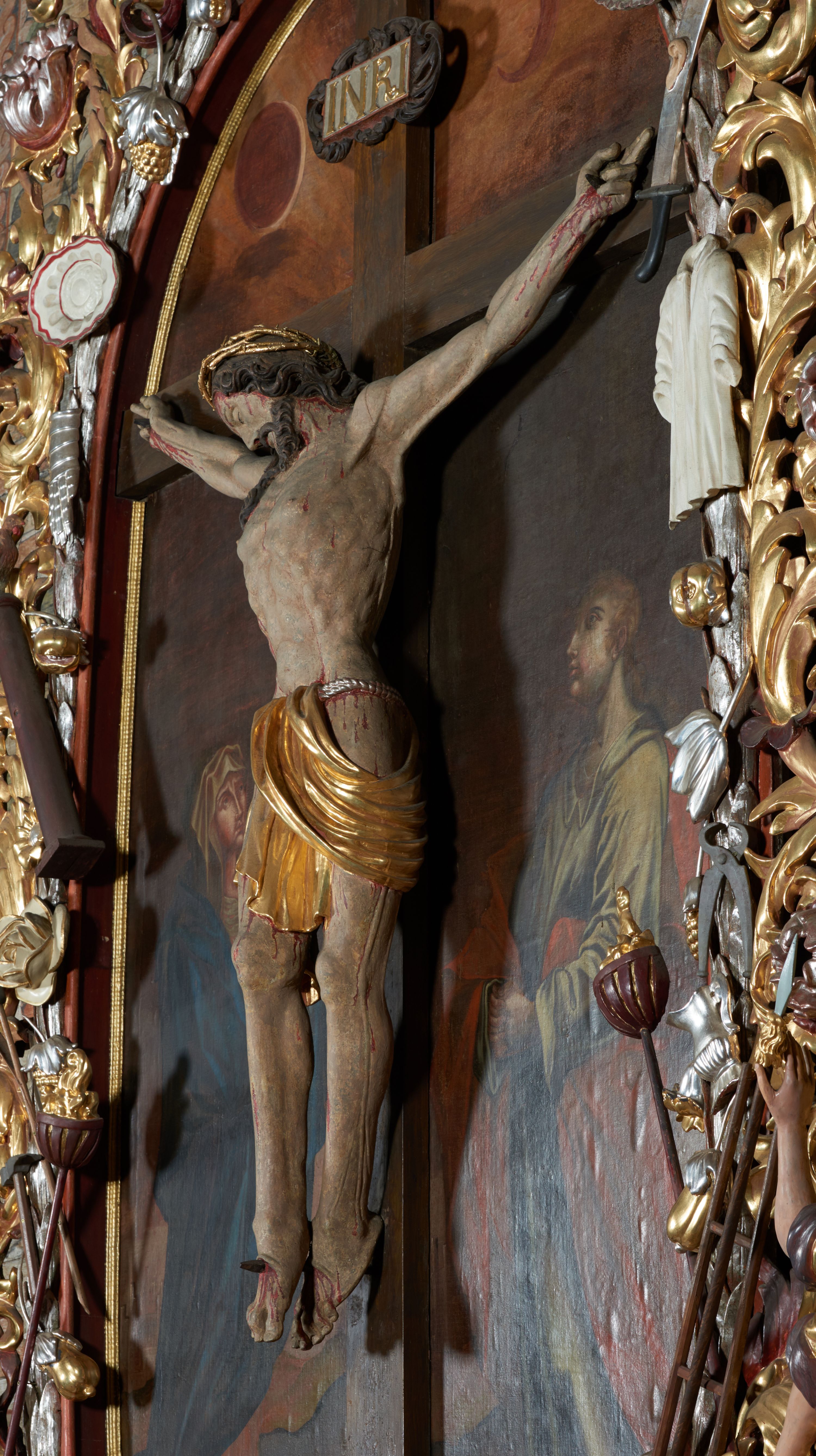 Ołtarz Ukrzyżowania nie stanowi jednolitego dzieła sztuki składa się bowiem z elementów pochodzących z różnych okresów stylowych. Predella to pozostałość po starszym, manierystycznym ołtarzu, o czym między innymi świadczy bogata dekoracja snycerska z dominacją ornamentu okuciowego z kaboszonami. Ponadto predellę flankują dwie konsole z płaskorzeźbionymi główkami aniołków o charakterystycznych dla tego okresu fryzurach z „czubami” oraz dwa płaskorzeźbione aniołki na wolutowych spływach przy konsolach. W centralnej części predelli umieszczono tempietto z późniejszą, ludową rzeźbą Chrystusa Frasobliwego, prawdopodobnie z XVII wieku. Z pierwotną dekoracją predelli związane są z pewnością dwa niewielkie obrazki z klęczącymi aniołami o prowincjonalnym charakterze. Tak zakomponowana predellla, podzielona na trzy istotne części pozwala sądzić, iż manierystyczny ołtarz, którego stanowiła podstawę, mógł również cechować się trójpodziałem na szersze pole środkowe i dwa węższe, boczne. Charakter stylistyczny predelli świadczy również, że ołtarz mógł powstać wkrótce po dacie założenia Bractwa Ubogich Chrystusa Pana (1609 rok), ale nie później niż w latach trzydziestych XVII wieku, a więc mógł być pierwszym ołtarzem bractwa.