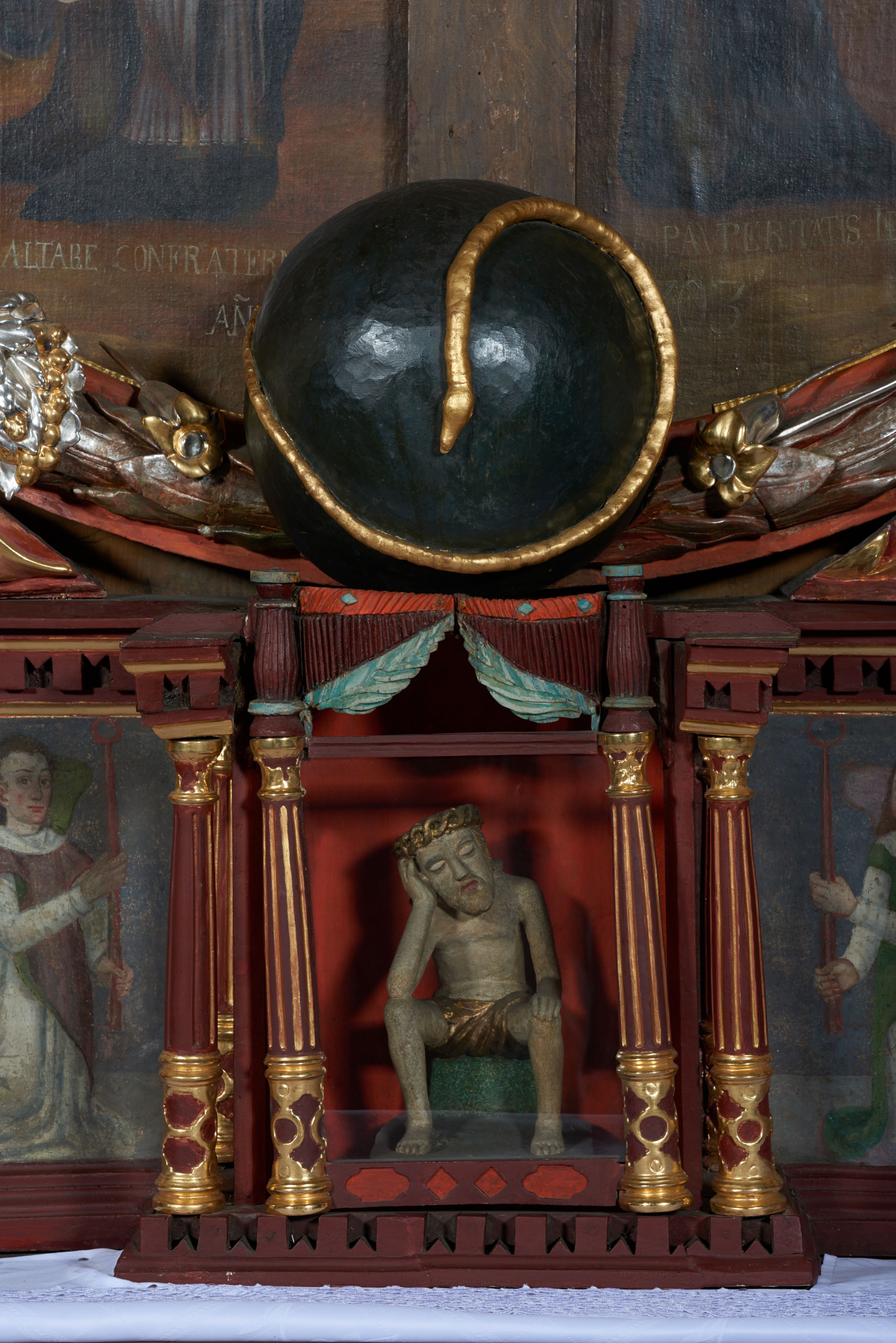 Nastawa ołtarzowa jednoosiowa, jednokondygnacyjna. Ołtarz prostopadłościenny, drewniany. Mensa z przodu dekorowana płyciną w kształcie prostokąta leżącego, malowaną na czerwono, w polu dwie gałązki palmowe i monogram IHS. Nastawa ustawiona jest na niskiej, trójosiowej predelli. Na osi głównej niewielkie tempietto, wsparte sześcioma kolumienkami z figurą Chrystusa Frasobliwego wewnątrz. Po bokach dwa obrazki z klęczącymi postaciami aniołów. Na osiach bocznych spływy wolutowe z półleżącymi postaciami aniołów oraz konsolki zdobione uskrzydlonymi główkami aniołków, skierowanymi na wprost. Predella podtrzymuje krucyfiks ustawiony na tle owalnego obrazu z Grupą Ukrzyżowania, obwiedzionego dokoła ramą z narzędziami Męki Pańskiej oraz bujną dekoracją ornamentu akantowego. Insygnia Arma Christii, kolejno od dołu, po lewej: obcęgi i młotek, pochodnia, włócznia z łańcuchem, kolumna, miecz z uchem Malchusa, rękawica, misa Piłata, Veraicon, misa z kośćmi do gry, suknia i drabina w jej tle, dzban Piłata, łańcuch i trzcina. U stóp krzyża napis: „Altare Confraternitatis Paupertatis Jesu Anno Dni 1703”. Po bokach dwie rzeźby aniołów. U dołu krzyża glob ziemski, opleciony przez węża; u góry na szczycie Veraikon i tarcza herbowa z herbem Szreniawa i literami „A. S. P. R.”. Dekoracja ornamentalna predelli okuciowa z kaboszonami, w kondygnacji akantowa. Polichromia struktury w kolorze bordowym, ornamentyka i profilowania złocone i srebrzone, detale czerwone.