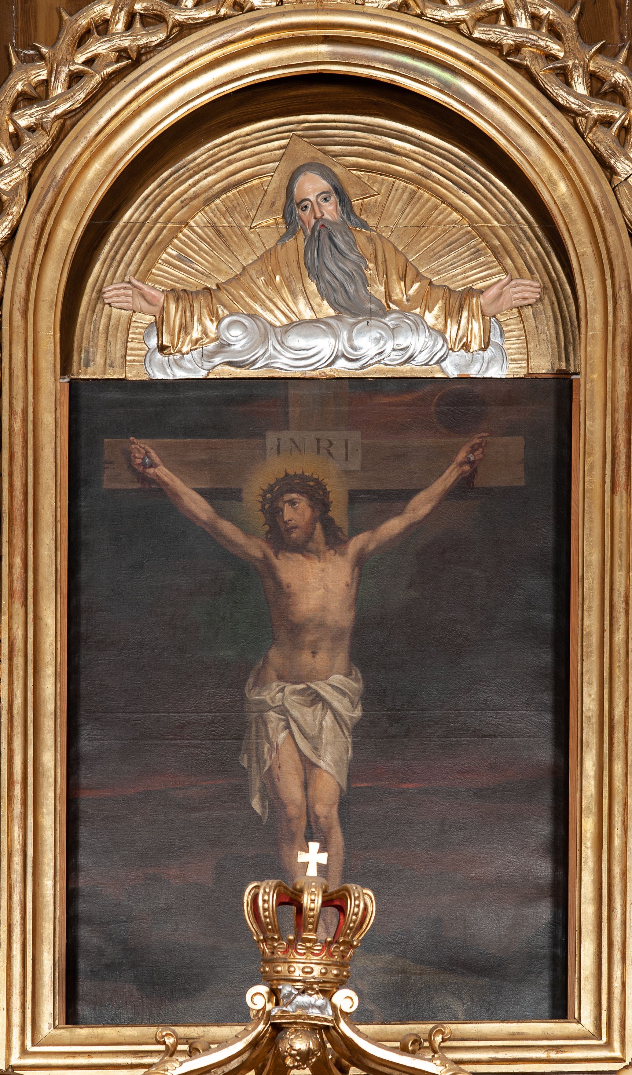 Obraz w kształcie stojącego prostokąta przedstawiający scenę Ukrzyżowania, powyżej płaskorzeźba Boga Ojca. W centrum kompozycji ukazany ukrzyżowany Chrystus na tle odległego pejzażu z Jerozolimą. Ciało łagodnie wygięte tworzące kształt litery „S”, głowa skierowana w prawą stronę. Twarz podłużna z długim i prostym nosem, dużymi oczami, okolona krótką brodą. Włosy długie, ciemnobrązowe, opadające na ramiona i plecy. Na głowie korona cierniowa, a wokół niej złoty, świetlisty nimb. Chrystus ma założone wokół bioder białe perizonium, silnie drapowane. Krzyż prosty, jasnobrązowy, nad głową Chrystusa wisi tabliczka z napisem „INRI”. Kolorystyka obrazu ciemna. Powyżej płaskorzeźba w kształcie półkola. W centrum półpostać Boga Ojca, wyłaniającego się z obłoków, z szeroko rozłożonymi na boki rękami, z głową delikatnie pochyloną na prawo. Twarz podłużna o wyraźnie zaznaczonych kościach policzkowych, z dużymi oczami i długim oraz prostym nosem, okolona bujną, siwą brodą. Włosy długie z przedziałkiem na środku, siwe, opadające na plecy. Bóg Ojciec ubrany jest w złoconą suknię z długimi i szerokimi rękawami. Wokół głowy ma złoty, trójkątny nimb. Tło złocone, ułożone z promieni, obłoki srebrzone. Rama drewniana, profilowana, złocona. Wokół ramy wieniec z gałązek cierniowych.