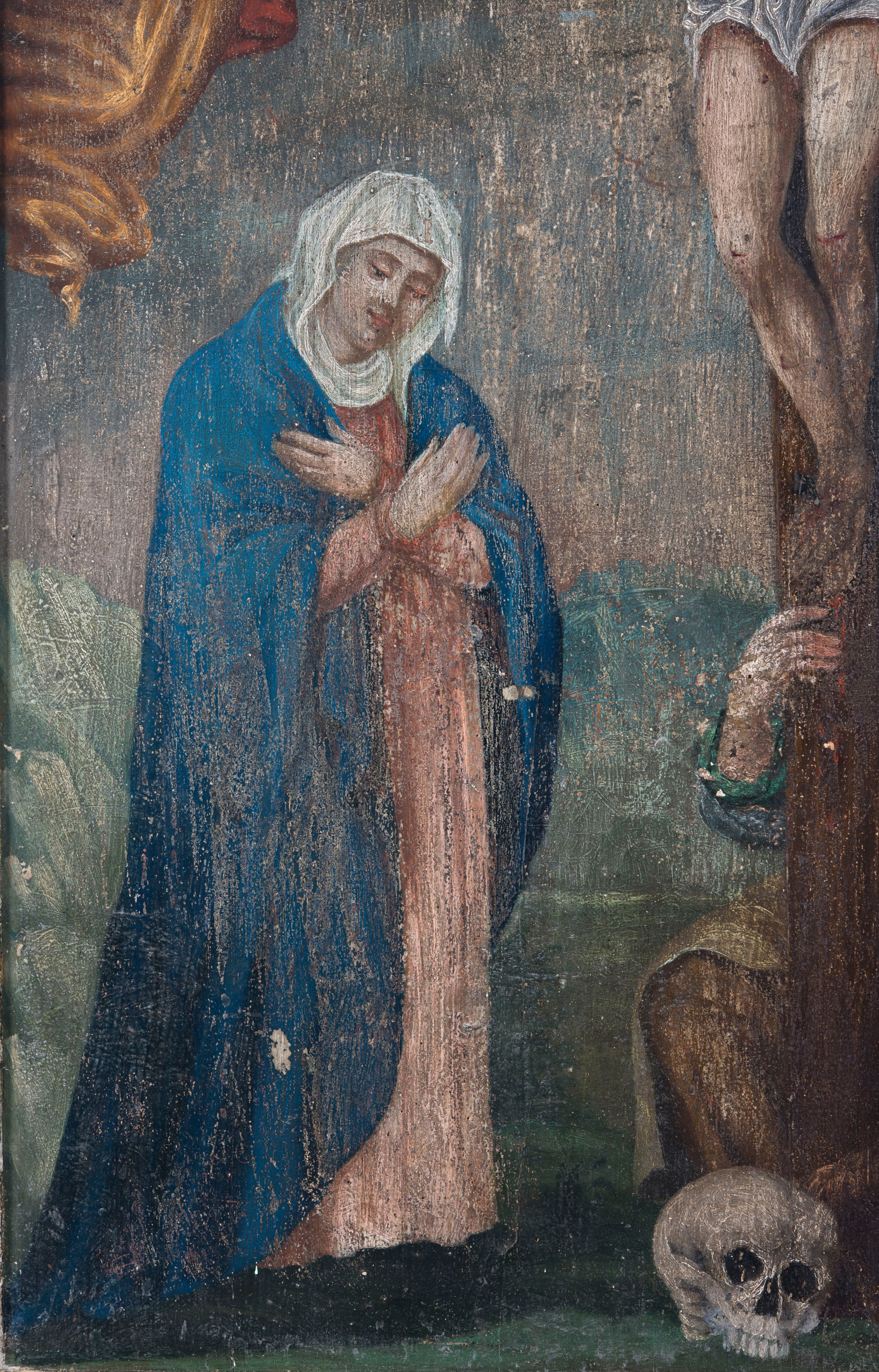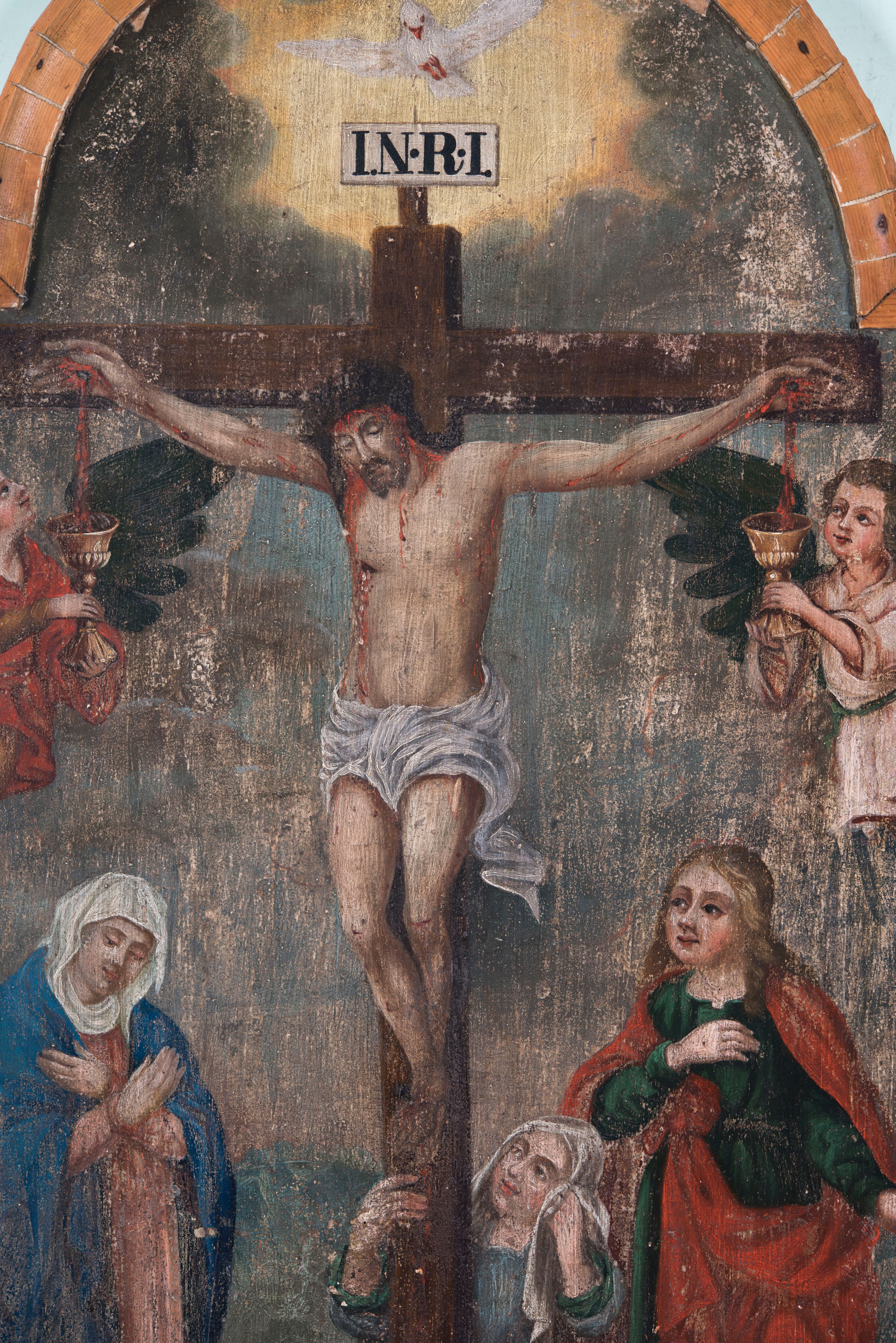 Obraz w kształcie stojącego prostokąta zamkniętego półkolistym łukiem nadwieszonym ujęty profilowaną, złoconą ramą, ze sceną Ukrzyżowania. Pośrodku kompozycji znajduje się krzyż z przybitym 3 gwoźdźmi Jezusem w typie Christo morte. Wspartą na prawym ramieniu głowę charakteryzuje pociągła twarz o delikatnych rysach, z długim, prostym nosem i krótkim, ciemnym zarostem. Długie włosy opadają na plecy i prawe ramię, głowę wieńczy korona cieniowa. Sylwetkę charakteryzuje łagodny modelunek i delikatnie zaznaczona muskulatura ciała. Ramiona są w łagodnym zwisie w kształcie litery „U”. Biodra przewiązane krótkim, białym perizonium z długim, rozwianym zwisem na lewym boku. Nogi lekko zgięte w kolanach, przybite 1 gwoździem, prawa na lewej. Czoło i szyja pokryte gęsto strugami krwi, rany w dłoniach i w prawym boku obficie broczące. Krzyż wieńczy titulus w formie białej tabliczki z napisem „I.N.R.I.”. Po prawej stronie krzyża stoi zwrócona w trzech czwartych w lewo Matka Boska ubrana w jasnoczerwoną suknię, niebieski płaszcz i białą, osłaniającą szyję chustę. Pochylona głowa lekko przechylona w bok, oczy zamknięte. Ręce skrzyżowane na piersiach. Po lewej stronie krzyża stoi św. Jan Ewangelista zwrócony w trzech czwartych w prawo, ze wzrokiem skierowanym na Marię. Ubrany jest w zieloną suknię i czerwony płaszcz. Prawa ręka wsparta na piersiach, lewa opuszczona wzdłuż ciała, lekko odsunięta w bok. U stóp krzyża, po lewej stronie przyklęka św. Maria Magdalena zwrócona w trzech czwartych w prawo. Ubrana jest w niebieską, przewiązaną w pasie suknię wierzchnią, spod której widać rękawy zielonej sukni spodniej, z bioder zsuwa się jasnobrązowy płaszcz, głowę osłania biała chusta. Święta prawą ręką ujmuje krzyż, lewą wspiera przechyloną w lewo głowę. Obok leży czaszka. Wyżej, po obydwu stronach krzyża unosi się para aniołów o ciemnych skrzydłach, trzymających w dłoniach złote kielichy, do których spływa krew z dłoni Jezusa. Anioł po prawej ma na sobie żółtą suknię i czerwona tunikę, po lewej jasnożółtą suknię i jasnoróżową tunikę. W tle widoczny jest pejzaż i ciemne zachmurzone niebo, które tuż nad krzyżem się rozjaśnia, na jego tle jest gołębica Ducha świętego.