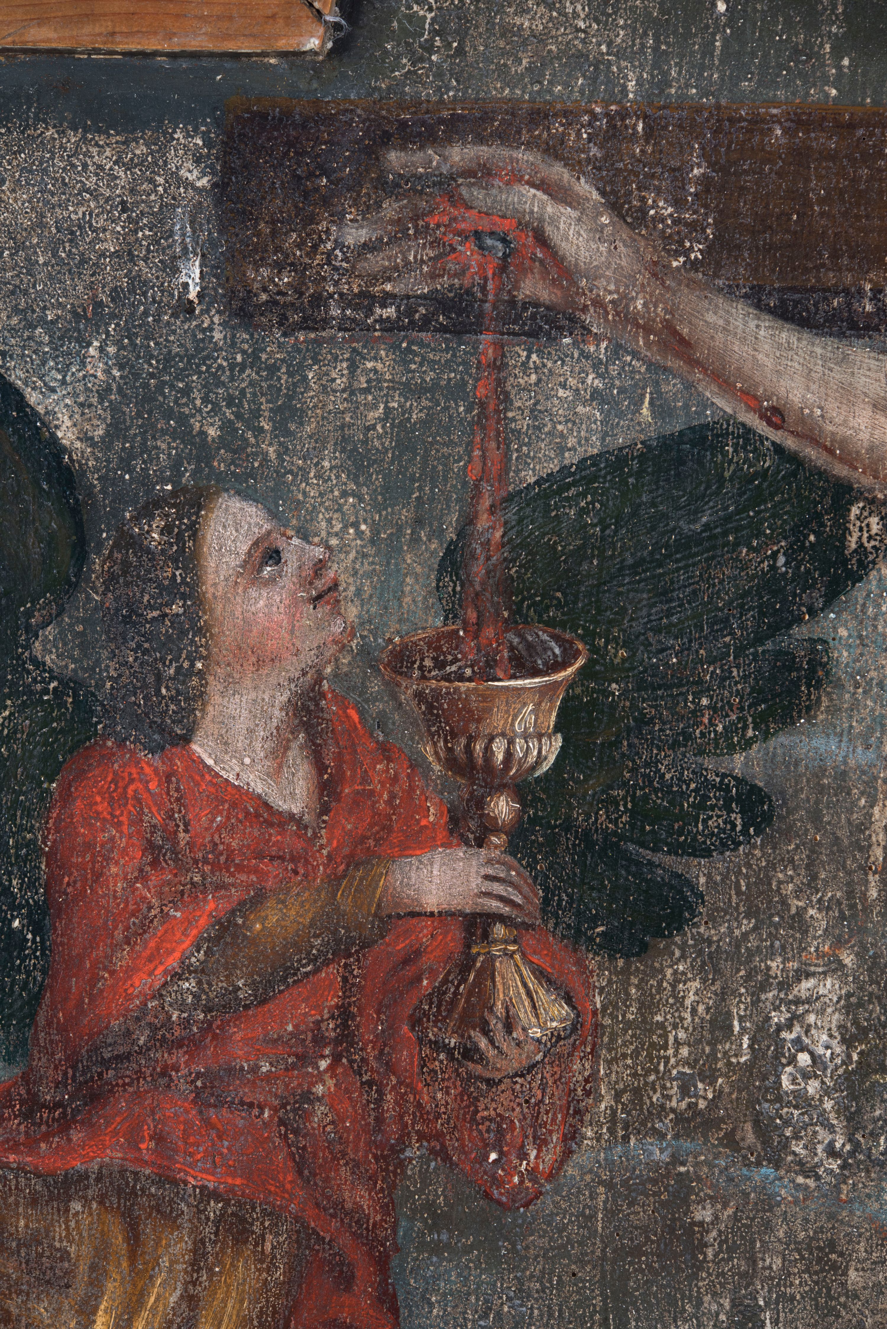Stan zachowania zły, ubytki w warstwie malarskiej, ślady po drewno jadach, przetarcia farb. Zmiany w desce w obrębie prawej ręki Marii Magdaleny. Pęknięcia deski.