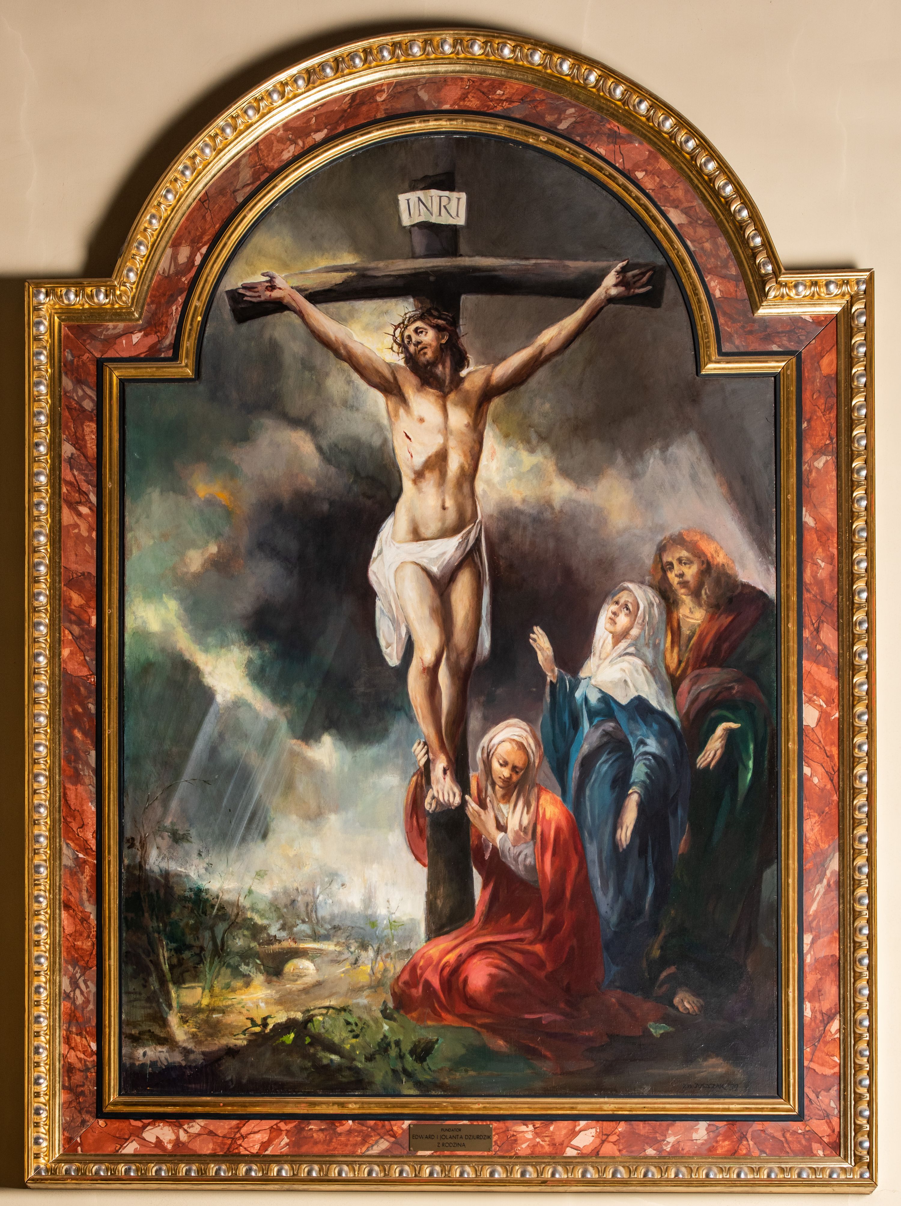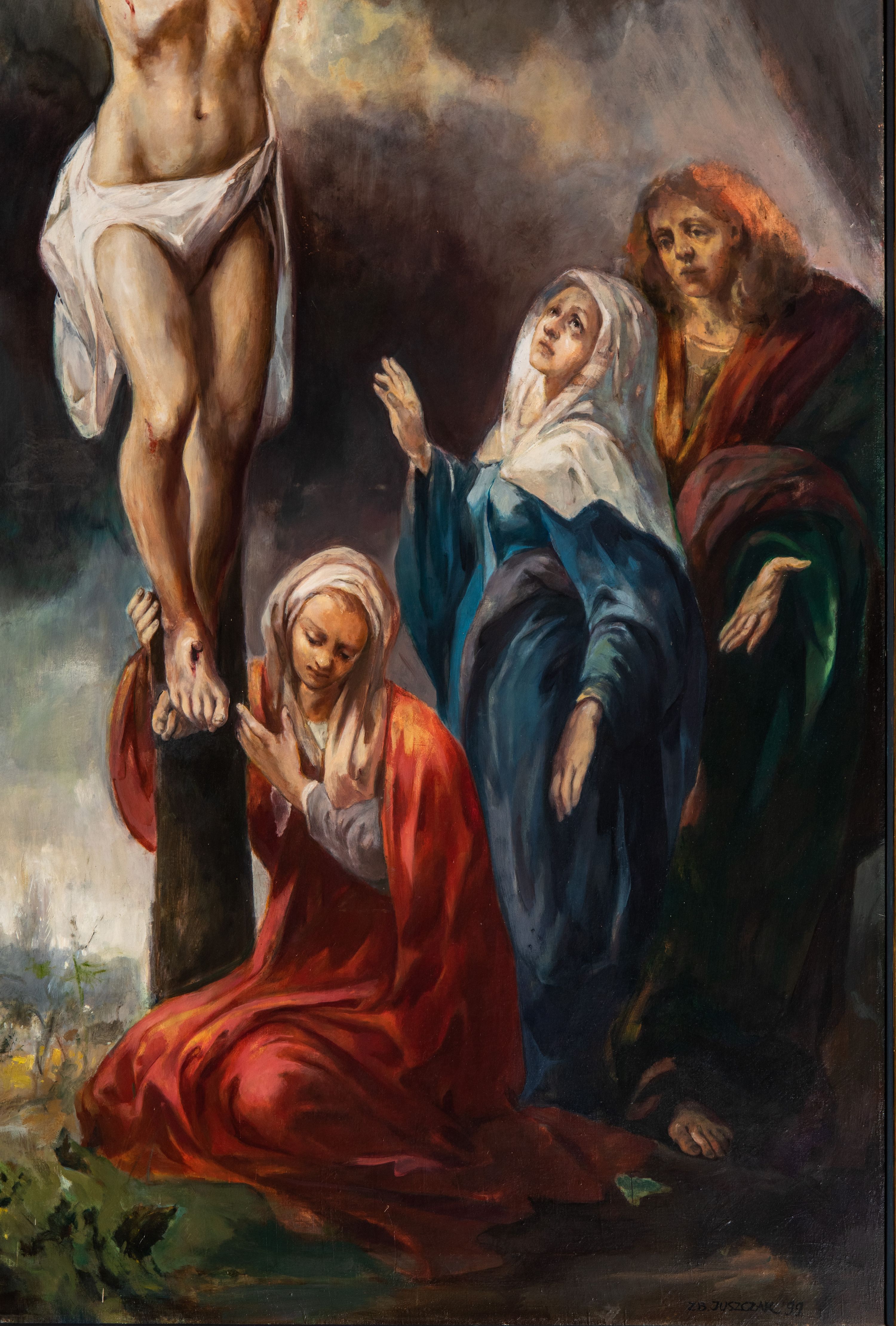 Obraz w kształcie zbliżonym do kwadratu, zamkniętego nadwieszonym łukiem półkolistym zawiera scenę Ukrzyżowania. Oś kompozycji stanowi ciemnobrązowy krzyż, o lekko wygiętej belce poziomej, do którego przybity jest Jezus. Smukłą sylwetkę charakteryzuje wyraźnie zarysowana muskulatura. Odchylona głowa zwrócona jest w trzech czwartych prawo. Pociągłą twarz charakteryzują duże, załzawione oczy o wzroku kierowanym ku górze, lekko rozchylone usta i krótki zarost. Długie włosy opadają na plecy i lewe ramię. Głowę wieńczy korona cierniowa. Ramiona ukazane są w głębokim, U-kształtnym zwisie. Tułów, o przebitym, prawym boku, cechuje wyraźnie zarysowana linia żeber. Biodra przesłania krótkie, białe perizonium o długich zwisach po bokach. Lekko zgięte w kolanach nogi przybite są jednym gwoździem. Pod krzyżem, po prawej stronie klęczy św. Maria Magdalena ubrana w szarobłękitną suknię i czerwony płaszcz. Pochyloną w dół głowę osłania opadająca na ramiona biała chusta. Święta prawą ręką obejmuje krzyż na wysokości stóp Jezusa, lewą wskazując na nie. Tuż obok stoi zwrócona profilem w lewo Matka Boska. Odchylając głowę do tyłu spogląda na Jezusa. Ubrana jest w niebieską suknię i niebieski płaszcz, głowę Marii osłania biała, opadająca na ramiona chusta. Prawa, zgięta w łokciu ręka uniesiona jest do góry, lewa opuszczona w dół. Obok Marii stoi zwrócony nieznacznie w trzech czwartych św. Jan Ewangelista. Pociągłą twarz, o młodzieńczych rysach ujmują sięgające ramion, bujne blond włosy. Święty ubrany jest jasnobrązową suknię i obszerny, ciemnozielony płaszcz o bordowym podszyciu. Tło sceny stanowi pejzaż o znacznie obniżonej linii horyzontu, z rzeką i kamiennym mostem. Niebo pokryte jest ciemnymi, skłębionymi chmurami, spomiędzy których przebijają delikatne promienie światła. W prawym dolnym rogu jest sygnatura „ZB(IGNIEW) JUSZCZAK '99”. Obraz ujęty jest drewnianą, profilowaną ramą zdobioną marmoryzacją, złoceniem i srebrzeniem.
