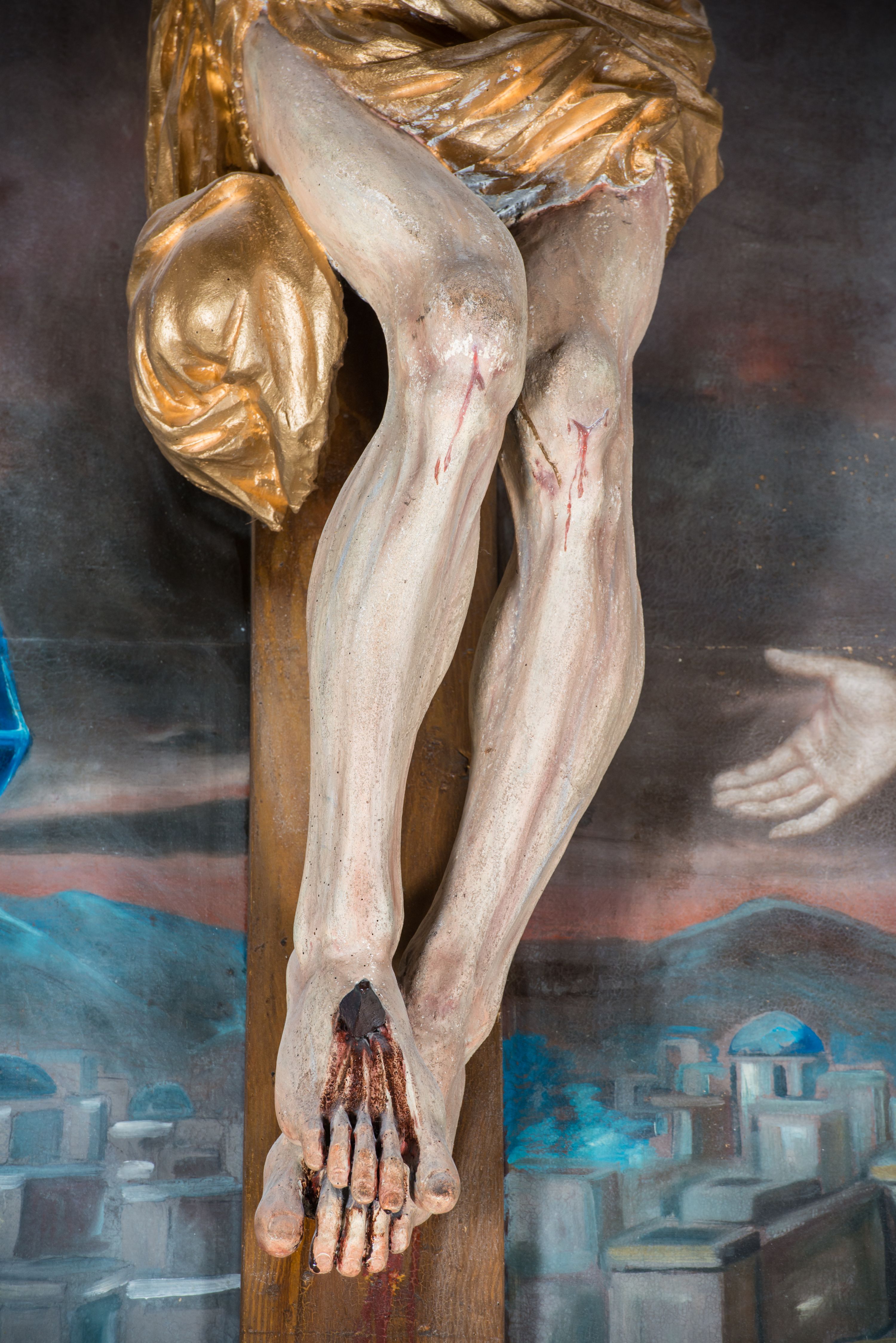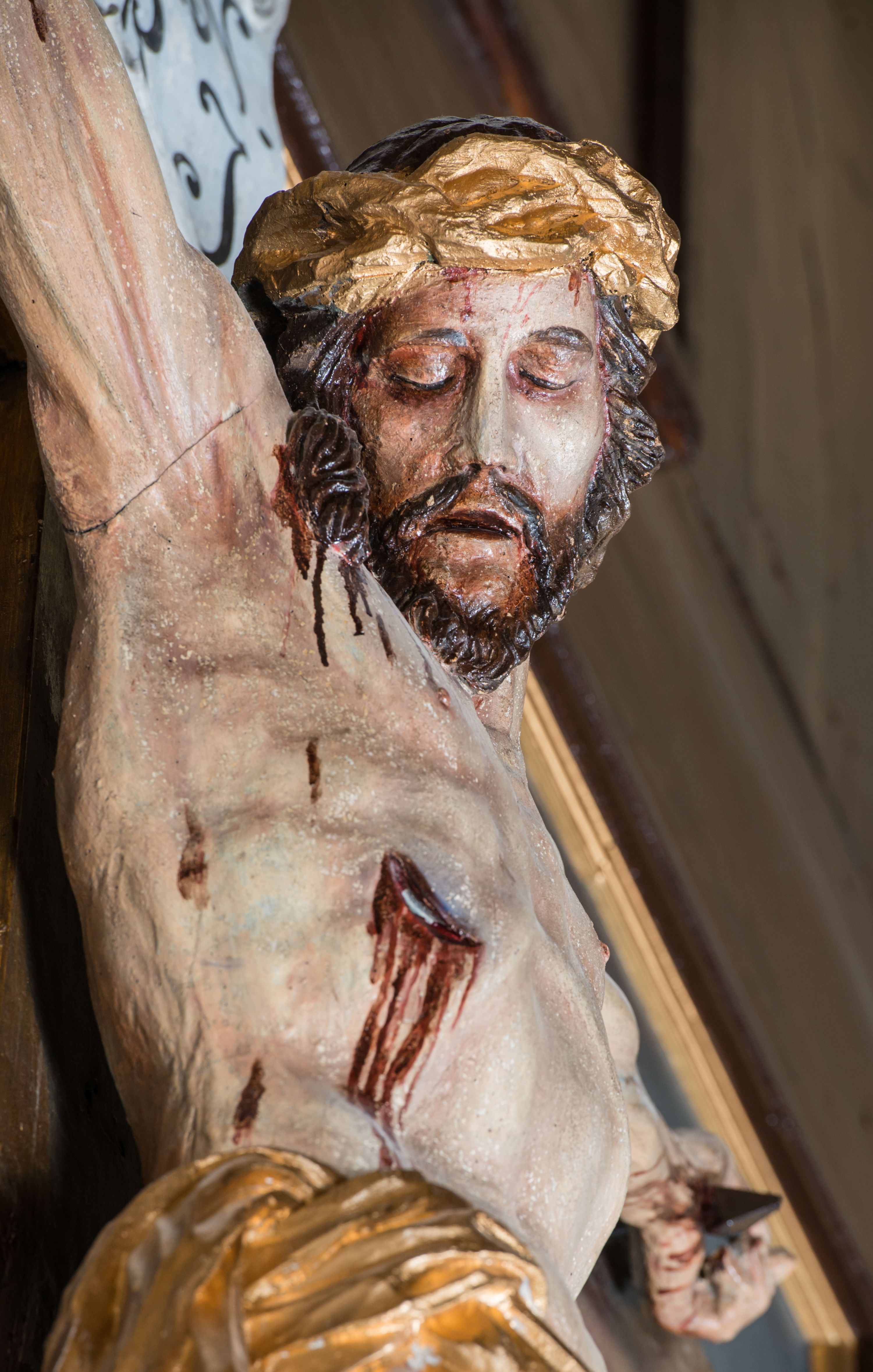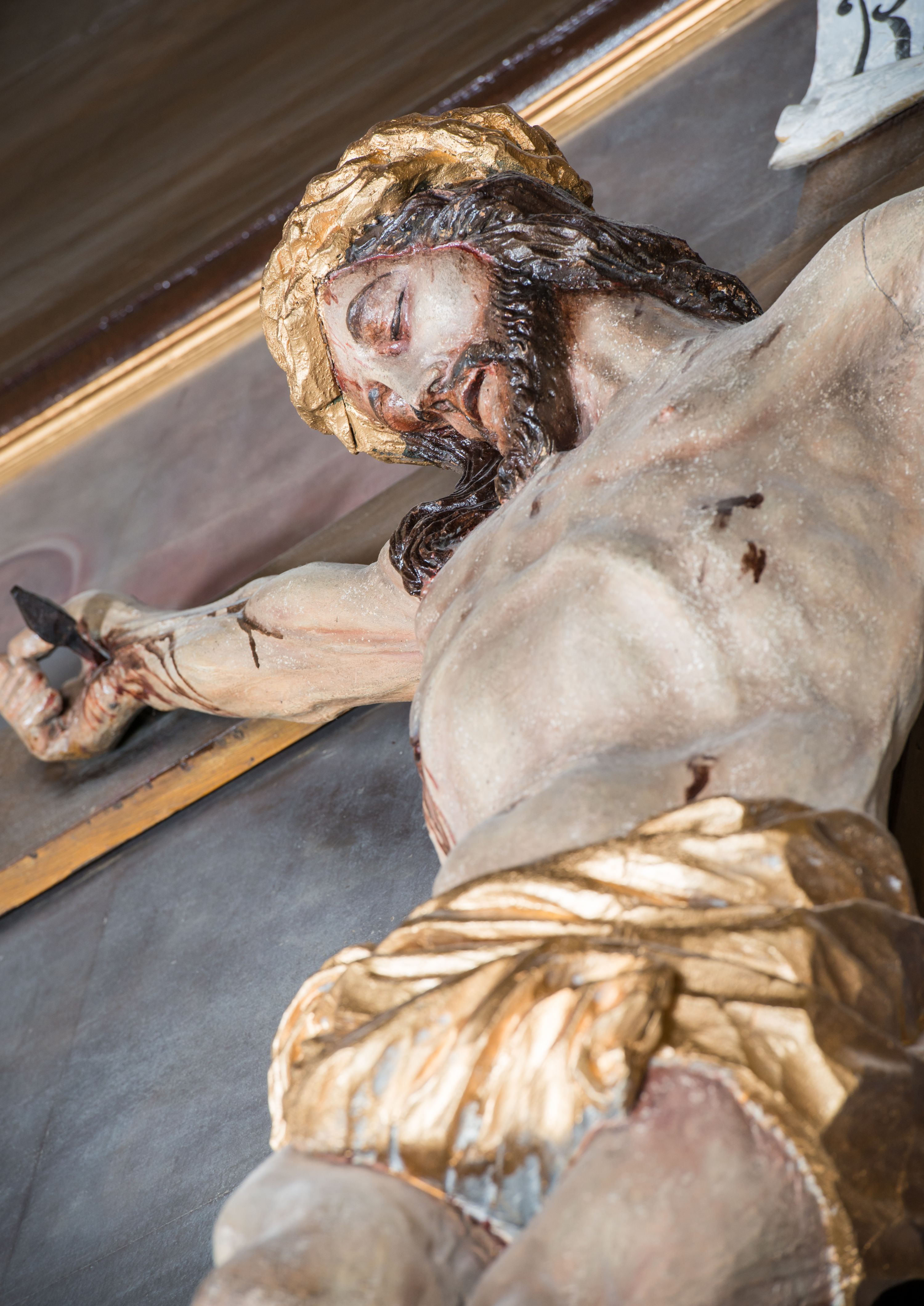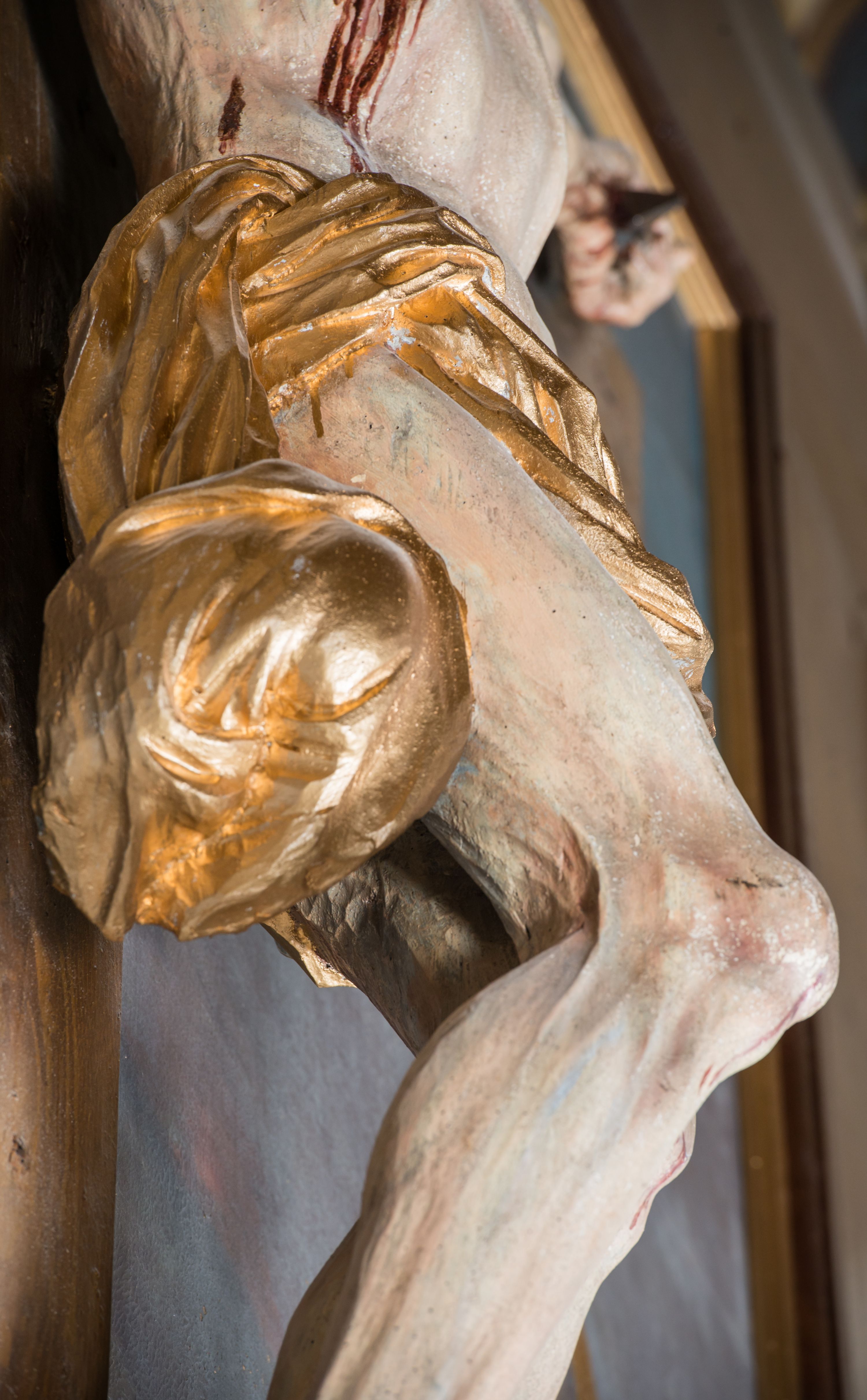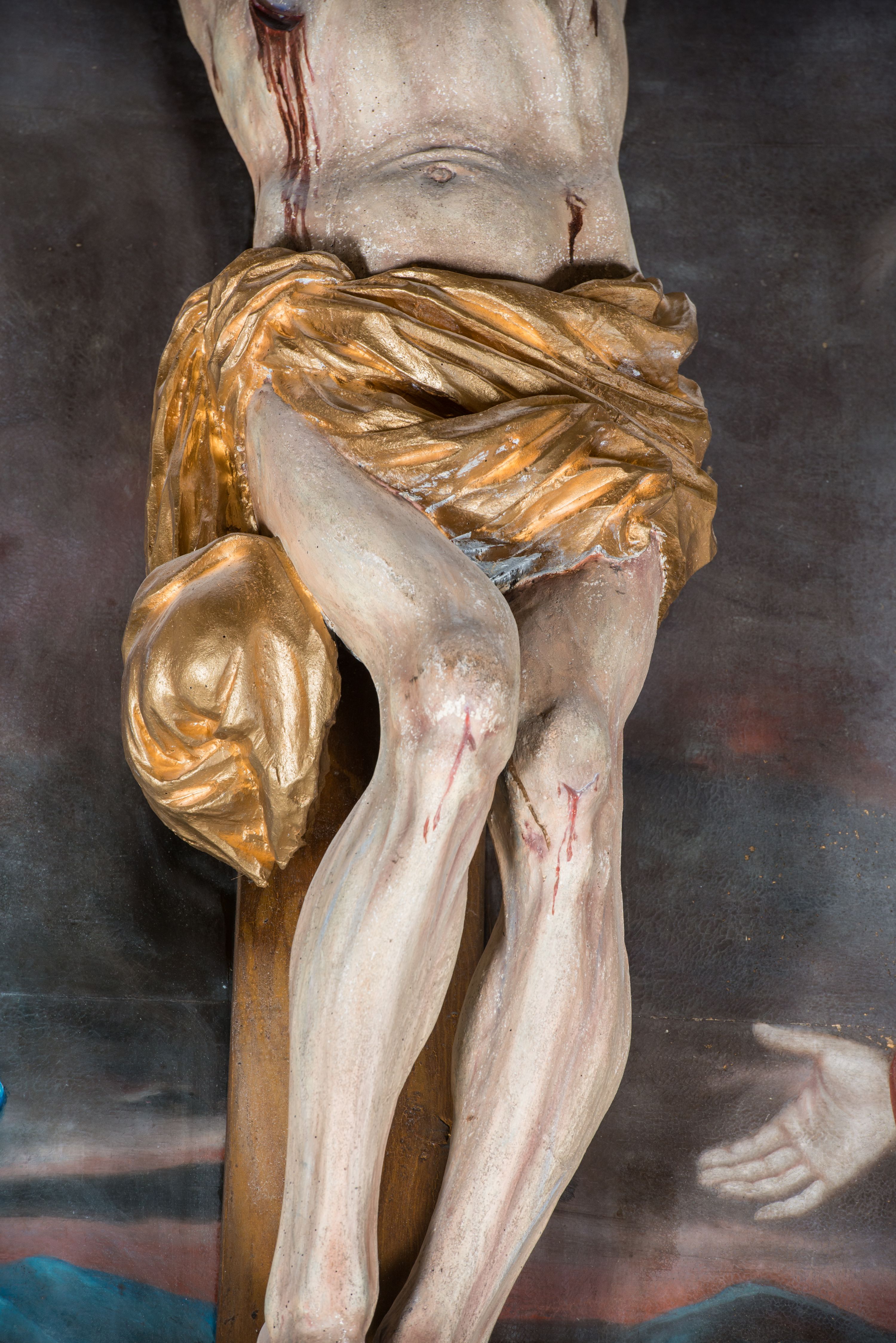Jezus z szeroko rozłożonymi rękoma i wyraźną muskulaturą, charakterystyczną nad rzeźby 2 poł. XVIII wieku.
