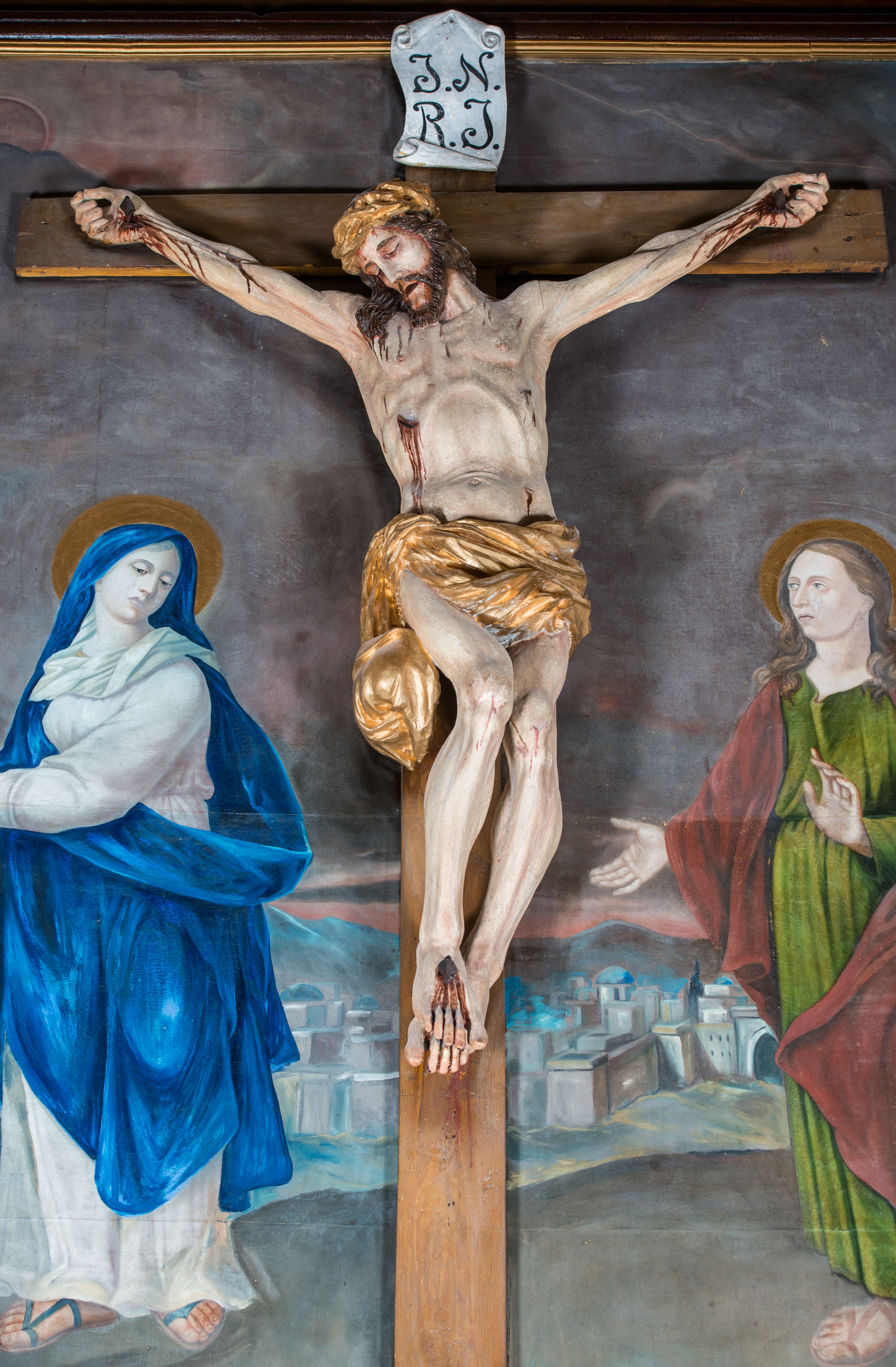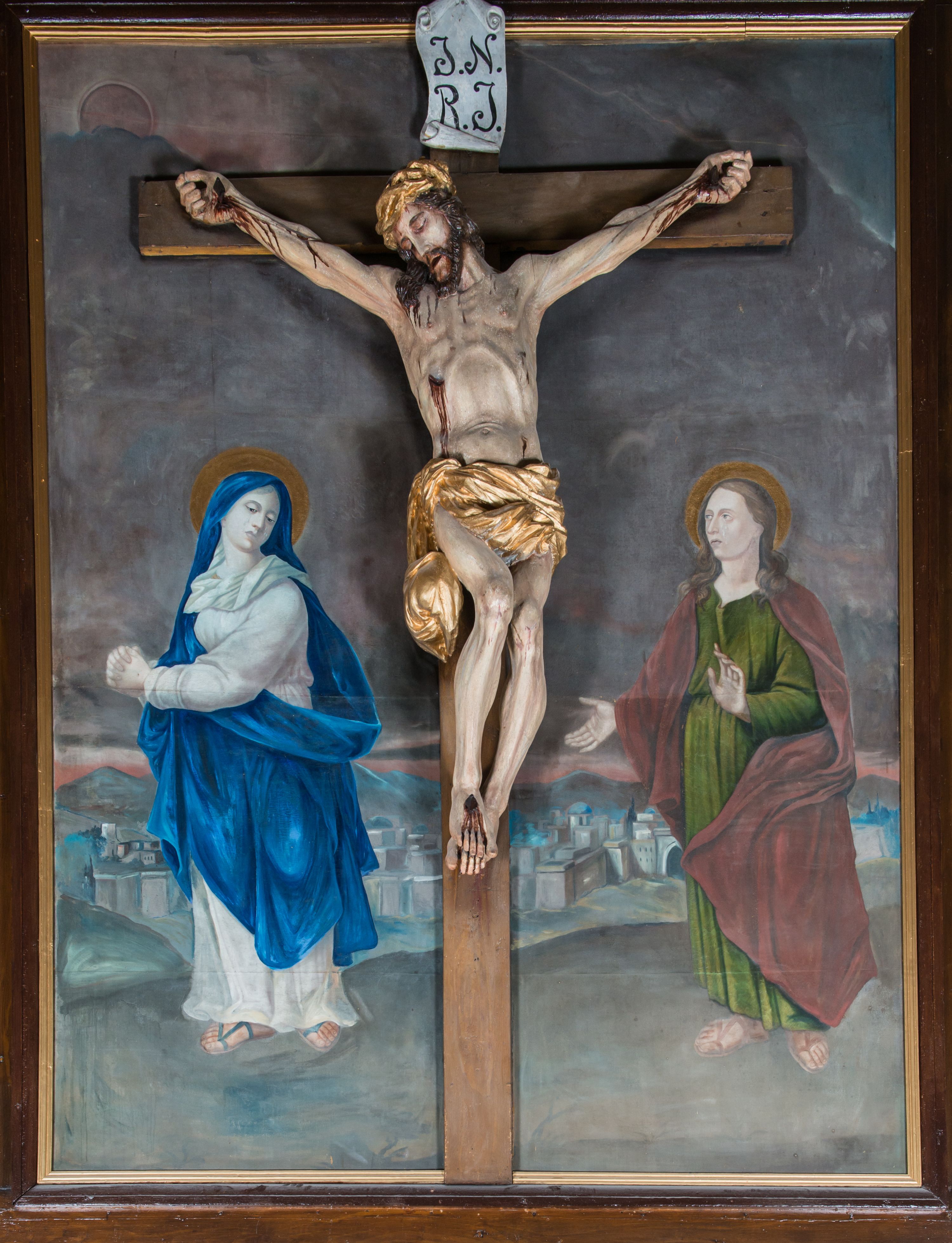 Malarsko-rzeźbiarska scena Ukrzyżowania w polu w kształcie stojącego prostokąta. Pełnoplastyczna figura Ukrzyżowanego w typie Christo morto. Głowa mocno pochylona w prawo, pociągła, wyraziście modelowana twarz o długim, prostym nosie, rozchylonych ustach i krótkim, ciemnobrązowym zaroście. Długie, falowane włosy opadają na prawe ramię. Głowę wieńczy wydatna, złocona korona. Ciało o wyrazistej, plastycznie opracowanej muskulaturze i delikatnie zaznaczonej linii żeber, z drobną fałdką pośrodku brzucha. Biodra przewiązane krótkim, silnie drapowanym, złoconym perizonium z długim zwisem na prawym boku. Zgięte w kolanach, lekko przechylone w lewo nogi przybite są 1 gwoździem. Na czole i klatce piersiowej drobnie ślady krwi, na rękach, prawym boku i stopach wydatne strugi. W górnej partii krzyża biały titulus w formie zwoju z napisem „I.N. / R.I”. Figury asystencyjne namalowane na tle rozległego pejzażu miasta i ciemnego nieba z zaćmionym słońce w lewym, górnym rogu. Po prawej stronie krzyża stoi Matka Boska skierowana w trzech czwartych w prawo odwracając się w za siebie. Owalna twarz o delikatnych rysach, oczy półprzymknięte. Ubrana w jasnoróżową suknię, narzucony na głowę ciemnoniebieski płaszcz i okalającą szyję białą chustę. Ręce złocone w geście modlitwy. Po lewej stronie krzyża stoi św. Jan Ewangelista zwrócony w trzech czwartych w prawo. Owalna twarz o delikatnych rysach, wzrok skierowany na wprost, z oczu płyną krople łez. Falowane włosy opadają na ramiona. Ubrany jest w zieloną, przewiązana w pasie suknię i bordowy, narzucony na ramiona płaszcz. na stopach sandały. Prawa ręka uniesiona na wysokości talii, lewa odsunięta w bok. Głowę Marii i sw. Jana okalają złocone nimby.