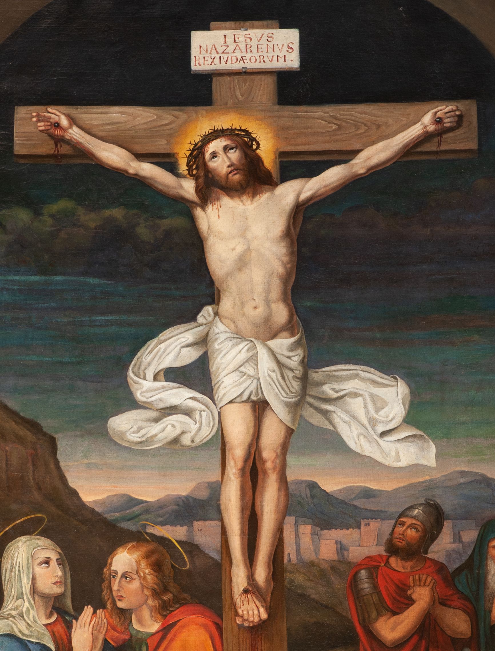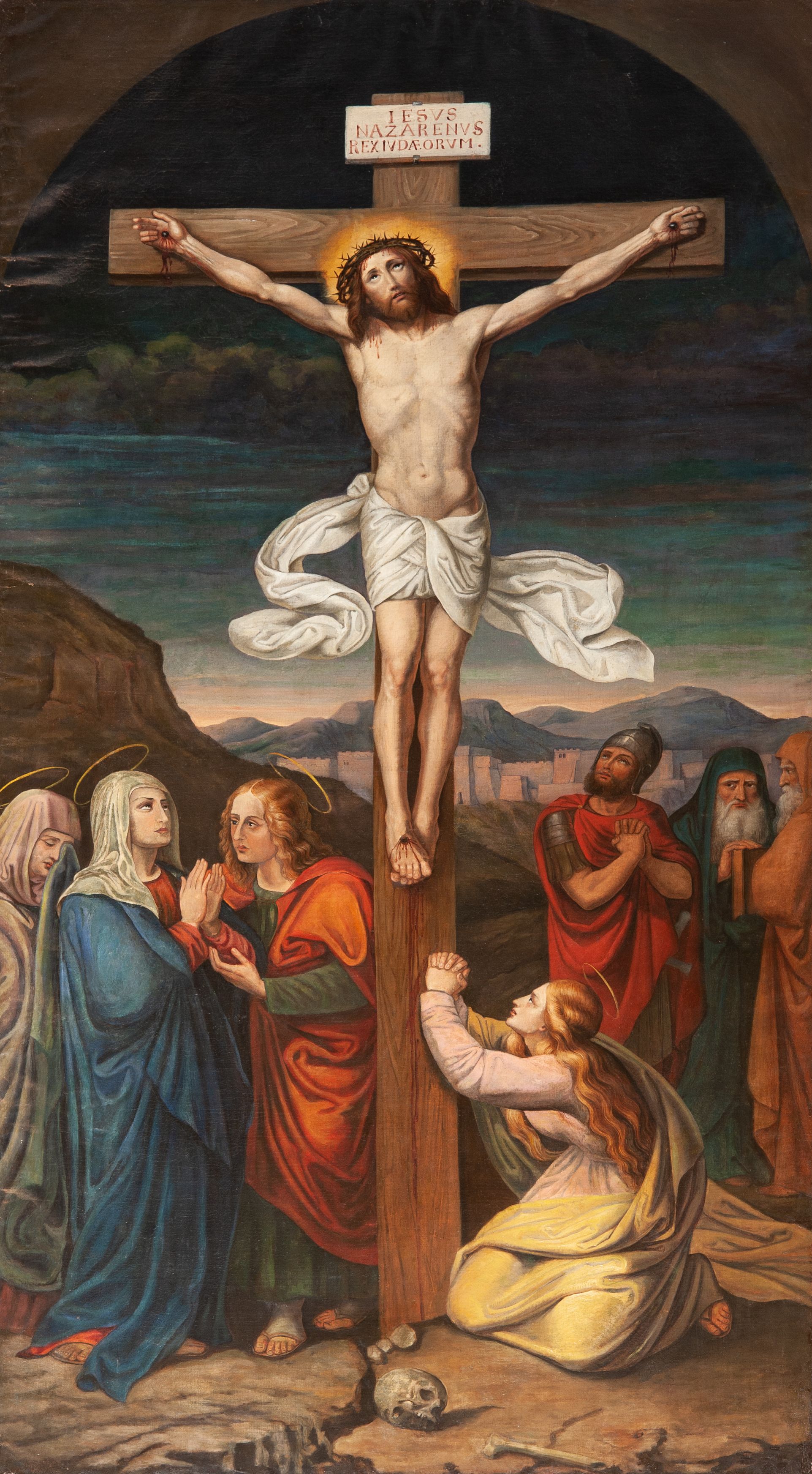Obraz w kształcie stojącego prostokąta, kompozycja zamknięta łukiem półkolistym z przedstawieniem sceny Ukrzyżowania Chrystusa. W centrum Chrystus przybity do krzyża. Twarz szczupła, okolona krótką brodą, z delikatnie otwartymi ustami i oczami wzniesionymi ku górze. Włosy długie, falowane, opadają na plecy i prawe ramię. Na głowie ma założoną koronę cierniową, a wokół niej złoty i kolisty nimb. Perizonium białe, ciasno oplatające biodra z dwoma długimi końcami rozwianymi ekspresyjnie po bokach. Z dłoni i stóp przybitych do krzyża spływają strużki krwi. Nad głową Chrystusa wisi titulus w formie poziomej tabliczki z napisem: „IESVS / NAZARENVS / REX IVDAEORVM”. Po lewej stronie obrazu stoją: Matka Boska w czerwonej sukni, niebieskim płaszczu i białym welonie na głowie ze złożonymi dłońmi. Obok, po prawej stoi zwrócony ku niej św. Jan Ewangelista w zielonej sukni i czerwonym płaszczu. Z tyłu Maria, żona Kleofasa, ocierająca łzy chustą. Po prawej stronie obrazu, przy krzyżu klęczy św. Maria Magdalena ze splecionymi dłońmi, uniesionymi wysoko ku górze, ukazana z lewego profilu. Ubrana jest w różową suknię i żółty płaszcz. Ma bujne i złote włosy, opadające na plecy. Z tyłu po prawej stoi żołnierz w zbroi legionisty rzymskiego, a obok dwaj starcy z siwymi brodami, ubrani w płaszcze założone na głowę: jeden w kolorze zielonym, a drugi jasnobrązowym. Nad głowami świętych znajdują się delikatnie zarysowane złote i okrągłe nimby. W tle pejzaż górski i widok na Jerozolimę. U dołu obrazu, pośrodku leży czaszka i piszczel. U góry pochmurne niebo. Rama obrazu drewniana, wąska, malowana na brązowo.