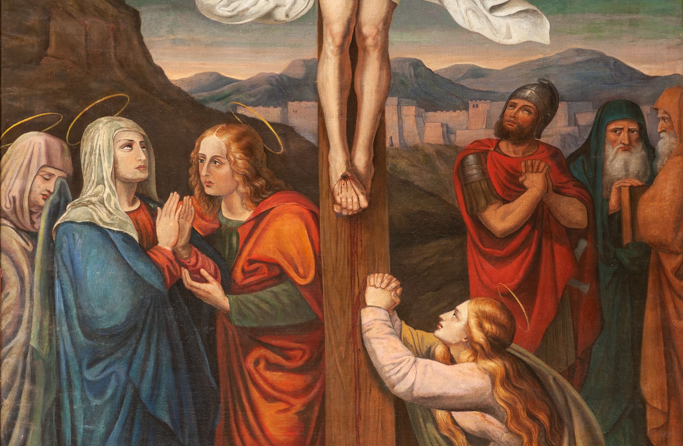 Obraz „Ukrzyżowanie” ilustruje fragmenty zapisane w Ewangeliach, m.in. w Ewangelii św. Jana: „A obok krzyża Jezusowego stały: Matka Jego i siostra Matki Jego, Maria, żona Kleofasa, i Maria Magdalena. Kiedy więc Jezus ujrzał Matkę i stojącego obok Niej ucznia, którego miłował, rzekł do Matki: «Niewiasto, oto syn Twój» Następnie rzekł do ucznia: «Oto Matka twoja». I od tej godziny uczeń wziął Ją do siebie” (J 19, 25-27). Obraz został namalowany w XIX wieku przez nieznanego malarza. Bez wątpienia do wykonania sceny posłużył się on starym schematem kompozycyjnym. Warto zwrócić uwagę na kolorystykę szat, która odzwierciedla utrwalone kanony ikonograficzne: Matka Boska ma niebieski płaszcz, św. Jan Ewangelista zieloną suknię i czerwony płaszcz (zieleń – symbol młodości), a św. Maria Magdalena, utożsamiana z nawróconą jawnogrzesznicą, została ukazana w płaszczu o kolorze żółtym, symbolizującym cudzołóstwo oraz z nieskromnie rozpuszczonymi, bardzo długimi włosami. Święta towarzyszyła Chrystusowi aż do śmierci i jako pierwsza przekazała apostołom wieść o zmartwychwstaniu. Ukazany w tle legionista rzymski z pobożnie złożonymi dłońmi to najprawdopodobniej nawrócony podczas ukrzyżowania św. Longin.