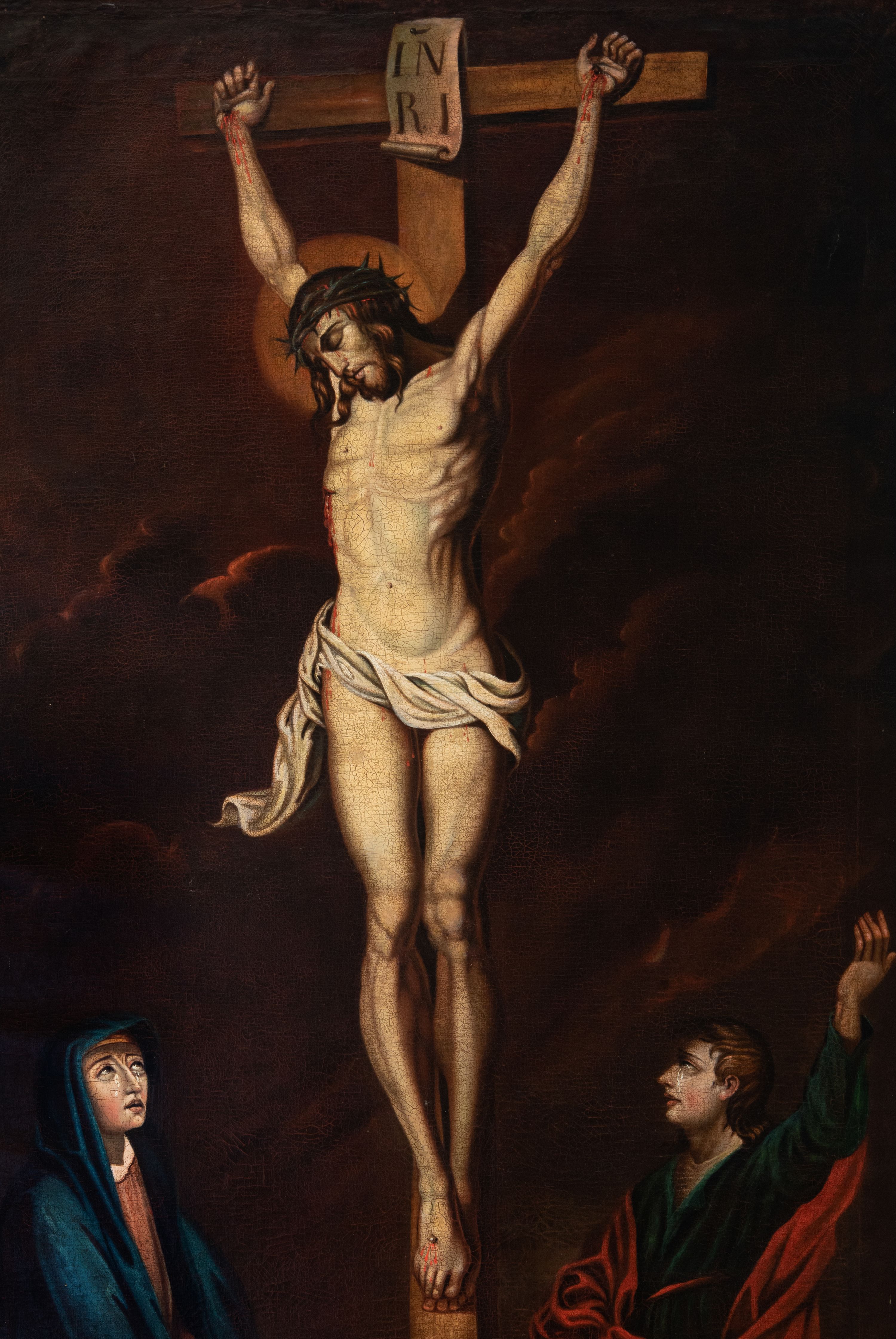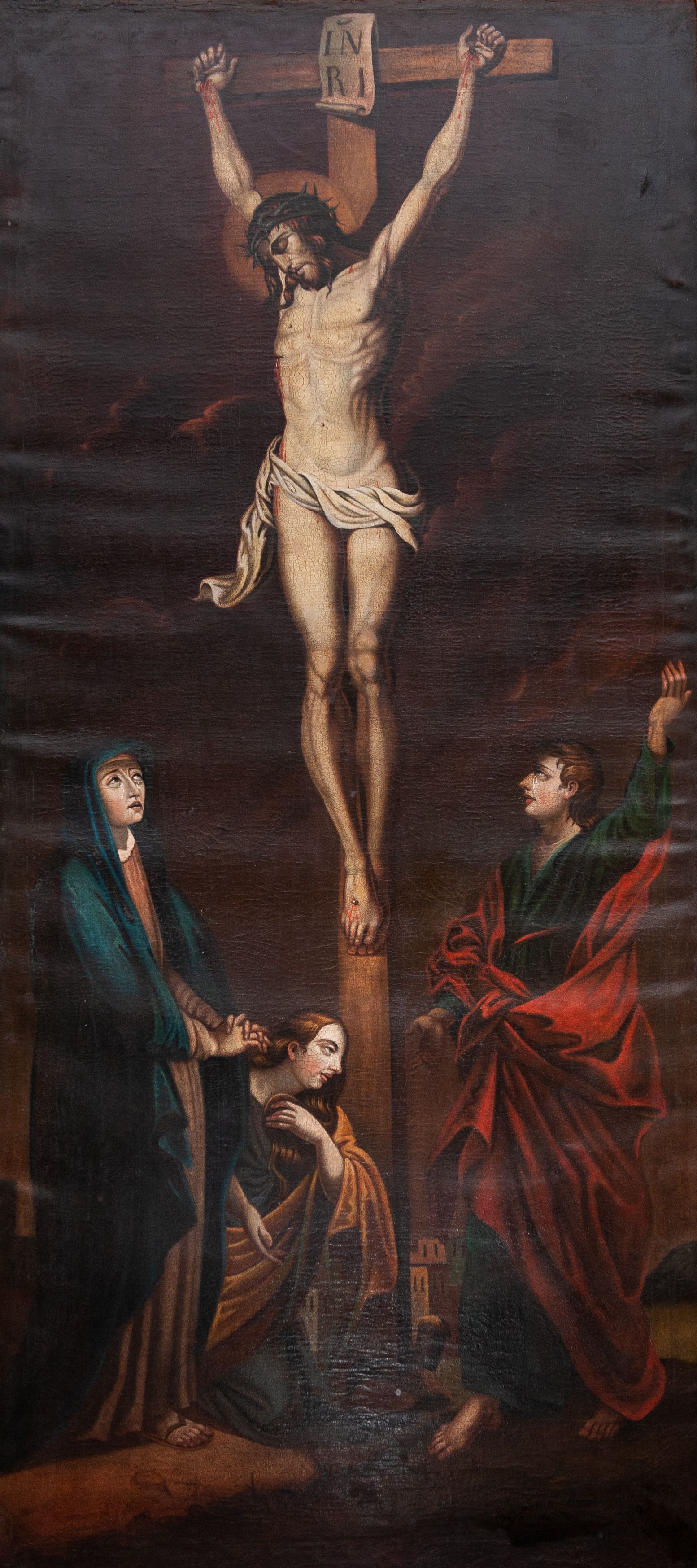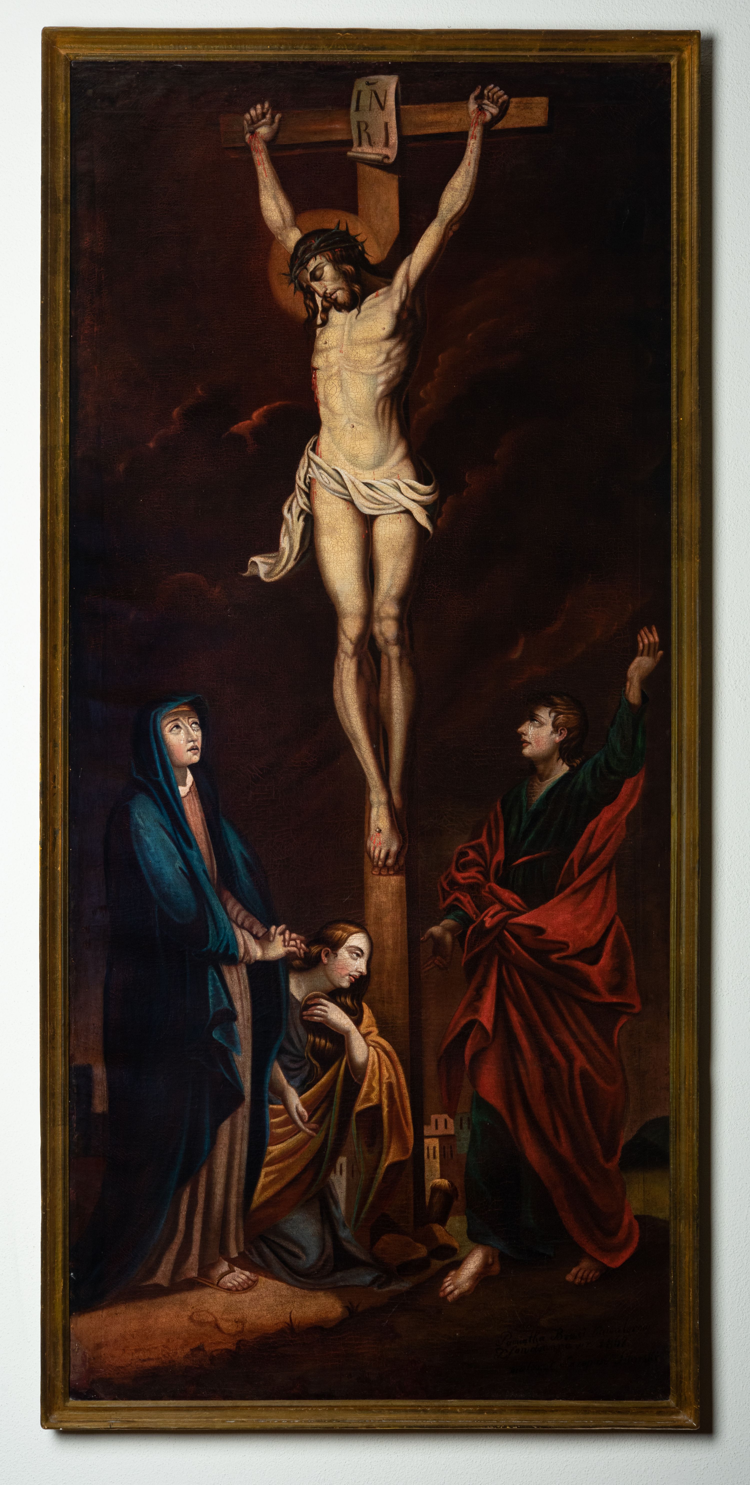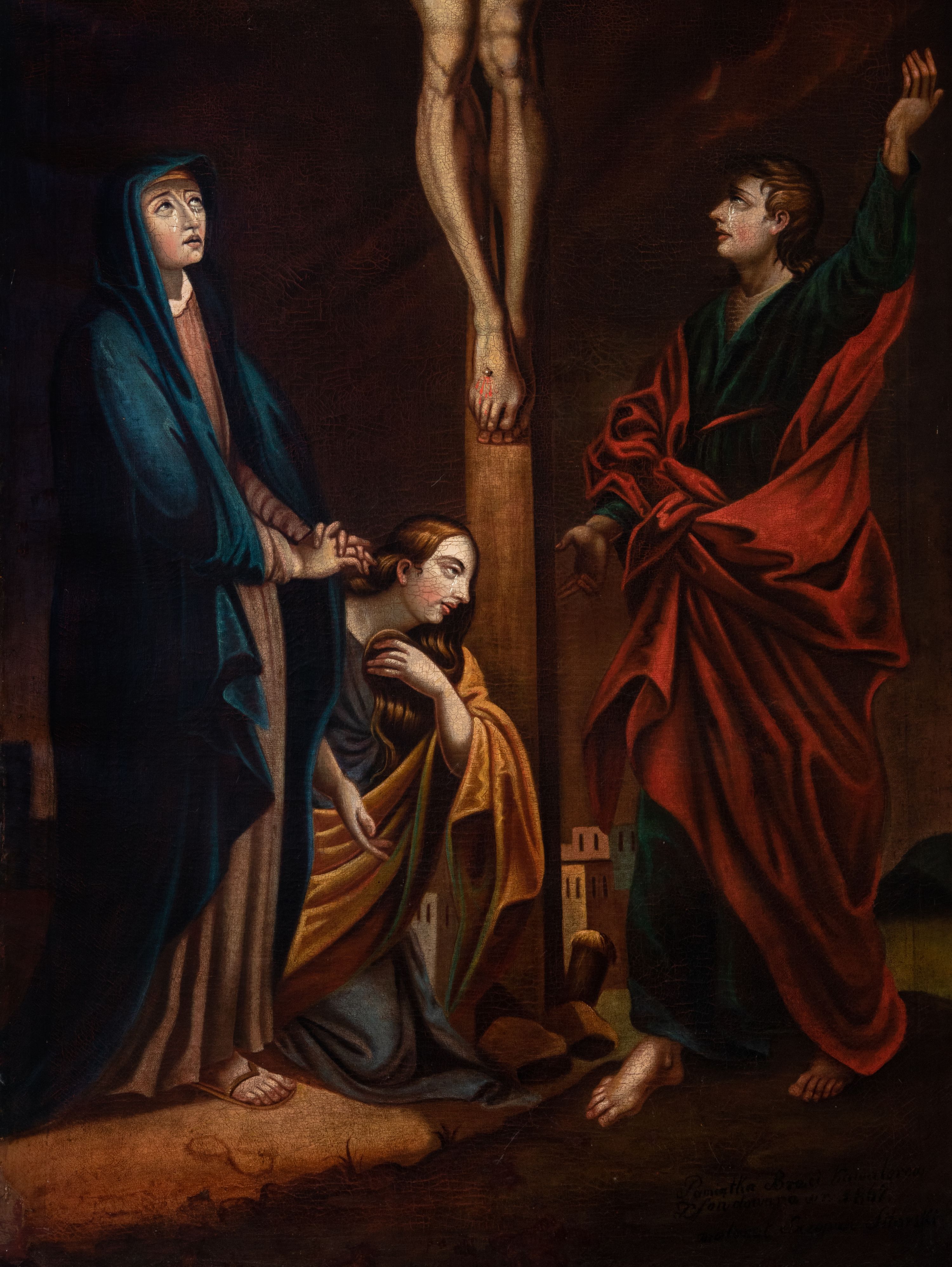 Obraz w kształcie stojącego prostokąta, przedstawia ukrzyżowanego Chrystusa z Matką Boską, św. Janem Ewangelistą i św. Marią Magdaleną. W centrum kompozycji jest ukazany Chrystus, przybity do krzyża trzema gwoździami. Ciało w dużym zwisie o wyraźnie podkreślonej muskulaturze, ręce ułożone na kształt litery „V”, głowa przechylona na prawe ramię i opadła w dół. Twarz szczupła z zamkniętymi oczami, prostym nosem, okolona średniej długości brodą. Włosy długie, opadające falami na plecy i piersi. Na głowie ma założoną zieloną koronę cierniową, a wokół bioder luźno przewiązane, białe perizonium z jednym końcem rozwianym wzdłuż prawego uda. Głowę otacza złoty i kolisty nimb, a nad nią zawieszony jest titulus w formie białej banderoli z napisem „IN/RI”. Na ciele ma zaznaczone ślady męki. Z lewej strony krzyża stoi Matka Boska, zwrócona trzy czwarte w lewo, ze splecionymi dłońmi na wysokości bioder, z głową uniesioną do góry. Twarz szczupła z delikatnie otwartymi ustami, prostym nosem i wzrokiem skierowanym na Chrystusa, po policzkach Marii spływają łzy. Ubrana jest w jasnobrązową, długą suknię oraz ciemnoniebieski płaszcz założony na głowę, na stopach ma sandały. Po prawej stoi św. Jan zwrócony trzy czwarte w prawo, z lewą ręką uniesioną wysoko do góry, prawą ma opuszczoną w dół. Twarz owalna, ukazana z lewego profilu, z dużymi ustami, długim nosem, wzrokiem skierowanym na Chrystusa; po policzkach spływają mu łzy. Święty ma jasnobrązowe włosy, średniej długości, opadające na plecy. Ubrany jest w beżową koszulę, zieloną suknię, przewiązaną czerwonym paskiem i czerwony płaszcz zawiązany z przodu. Po lewej, u stóp krzyża klęczy św. Maria Magdalena zwrócona trzy czwarte w lewo z prawą dłonią opuszczoną w dół, a lewą przyciska do piersi. Twarz owalna z wyraźnie zaznaczonym podbródkiem, dużymi ustami i prostym nosem. Ma długie włosy, opadające na plecy i z lewej strony na piersi. Ubrana jest w szarą suknię oraz żółty płaszcz. W tle widoczne jest ciemne, pochmurne niebo. W prawym dolnym narożu znajduje się napis „Pamiątka Braci Kawalerów / Zfondowana w r(oku) 1867. / malował Szczepan Sitarski”, a na odwrociu „RENOVATUM A(NNO) D(OMINI) 1989 / Z FUNDACJI KS(IĘDZA) PRAŁATA / BRONISŁAWA FIDELUSA / KANCLERZA KURII / RODEM Z ZEMBRZYC” oraz „1867”. Obraz ujęty jest drewnianą, profilowaną ramą.