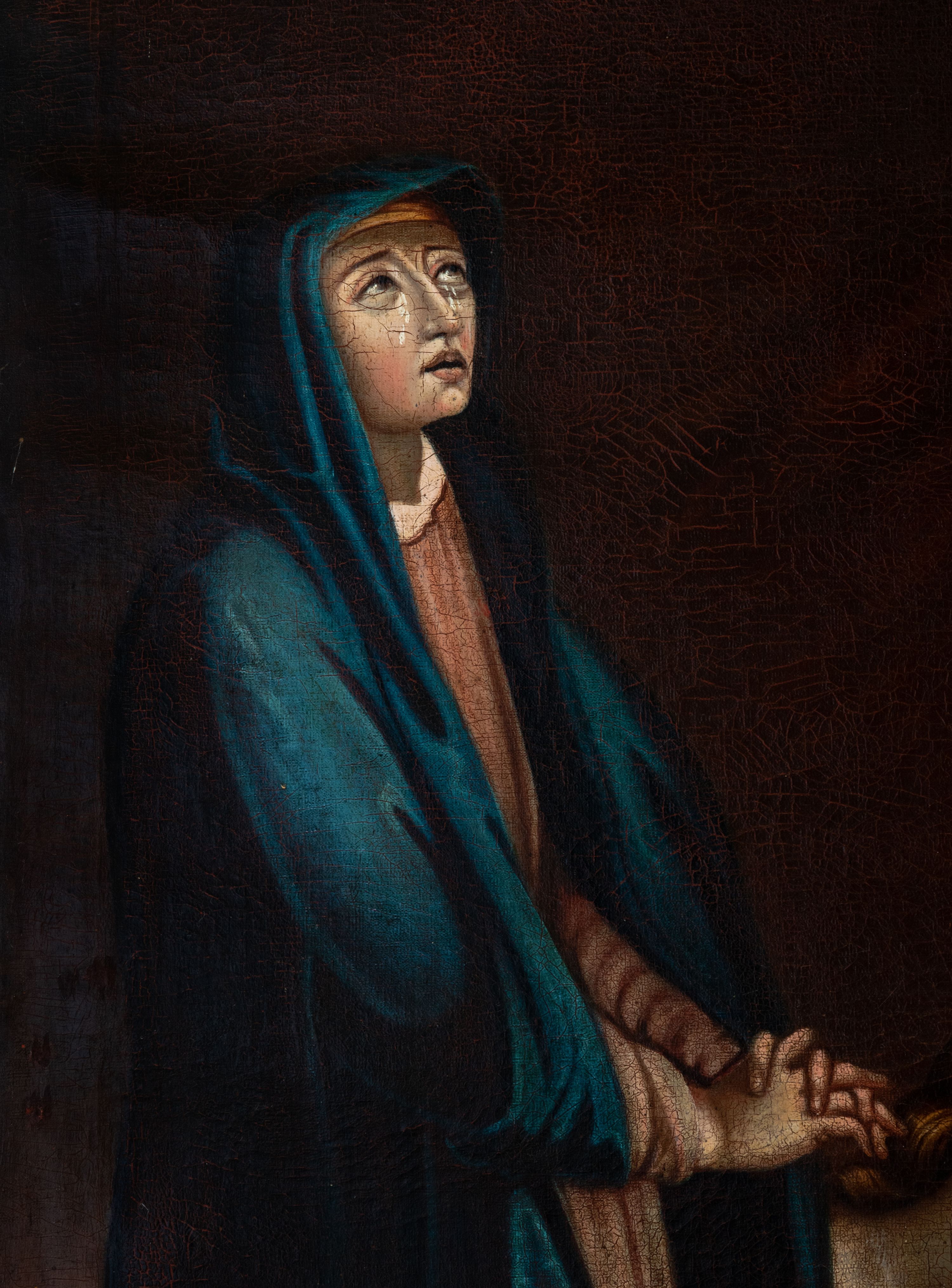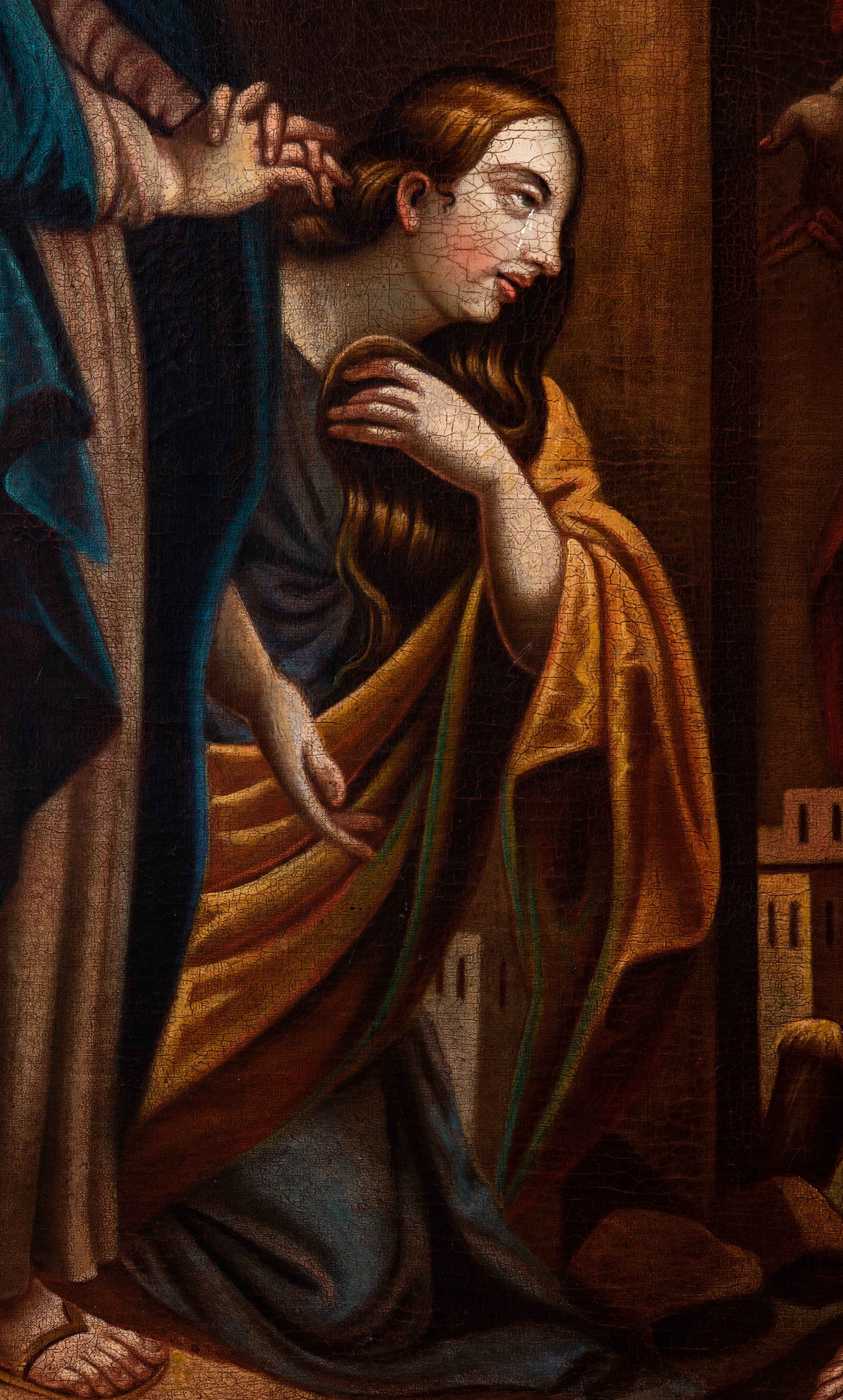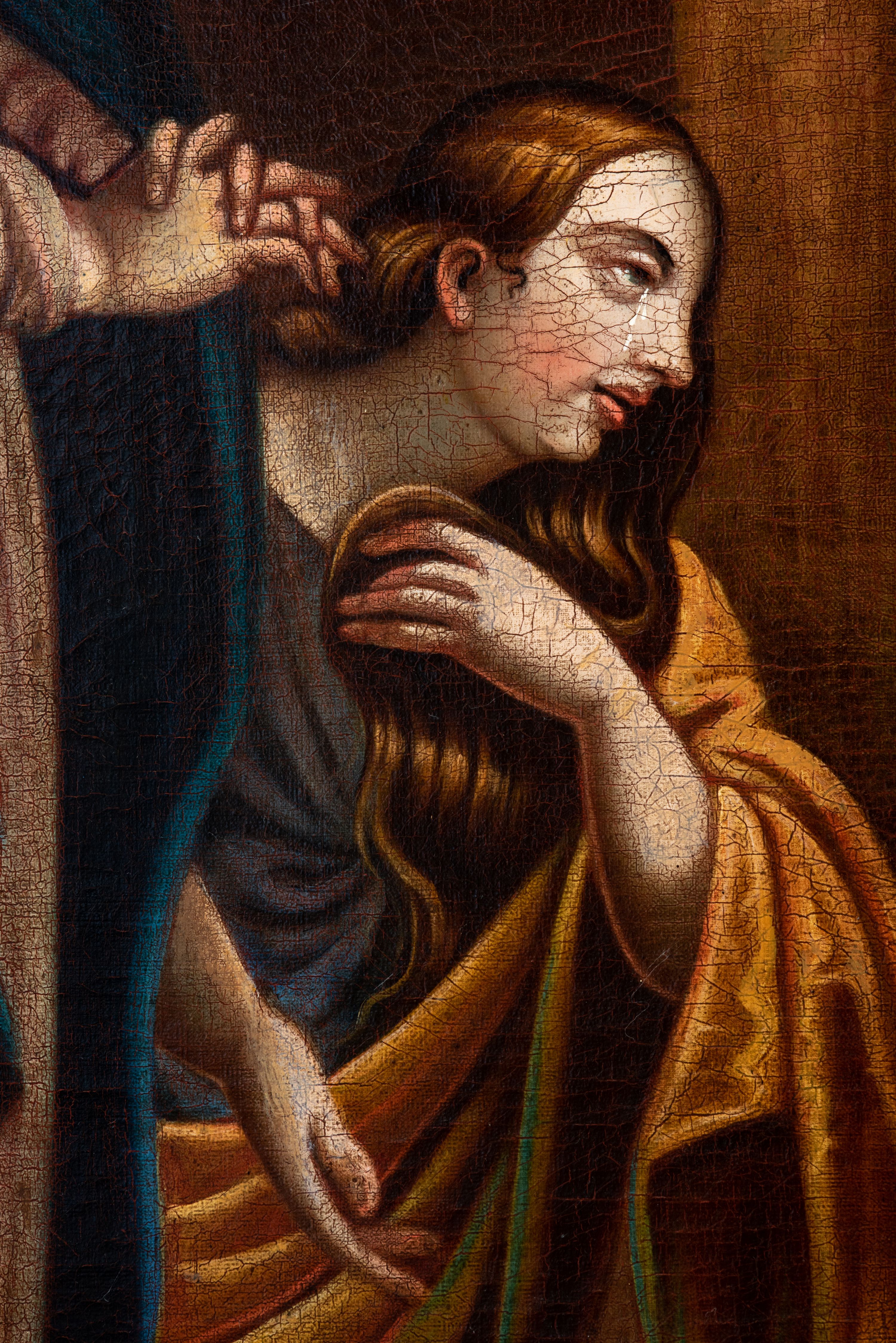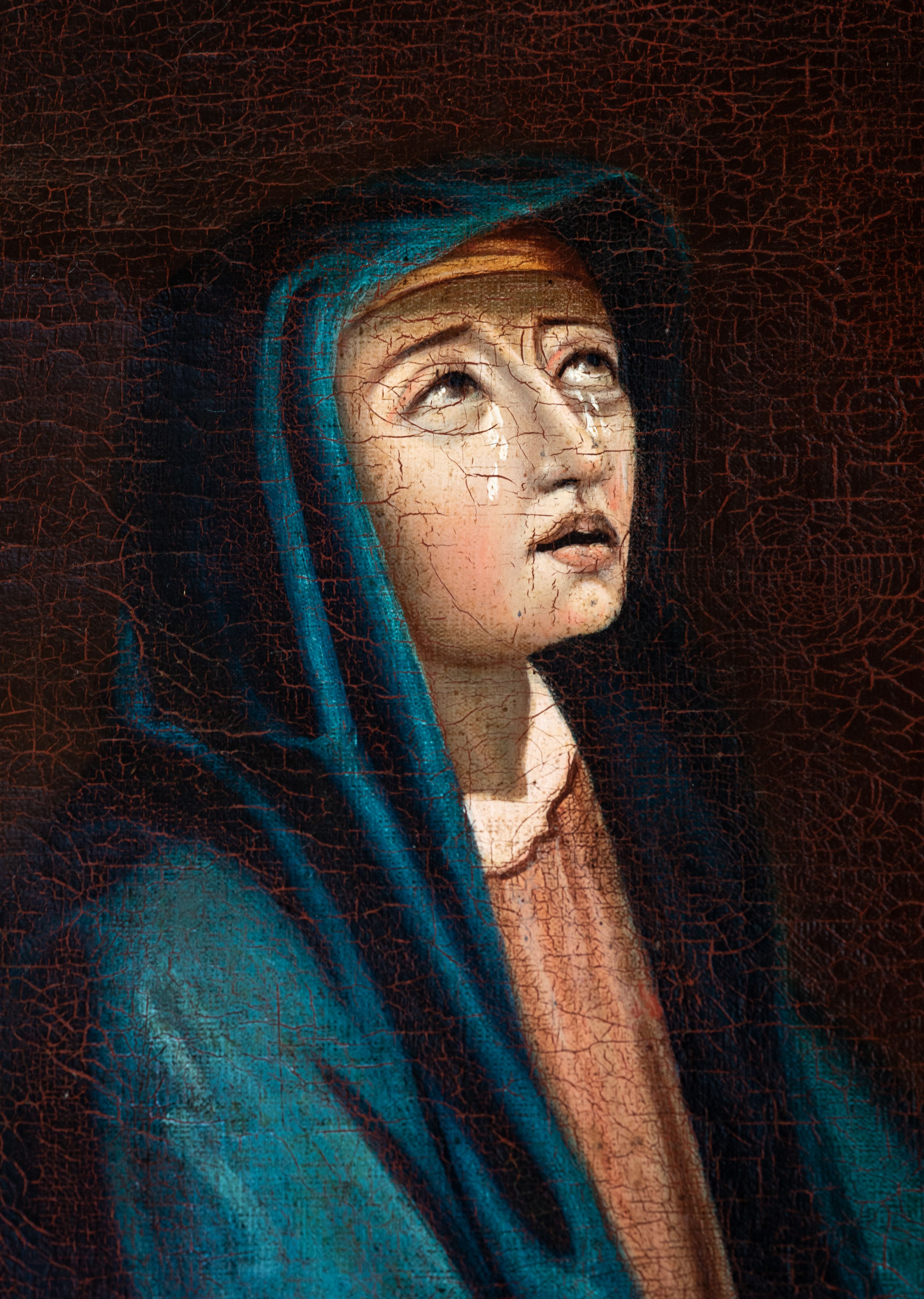 Płótno delikatnie sfalowane, spękania warstwy malarskiej.
