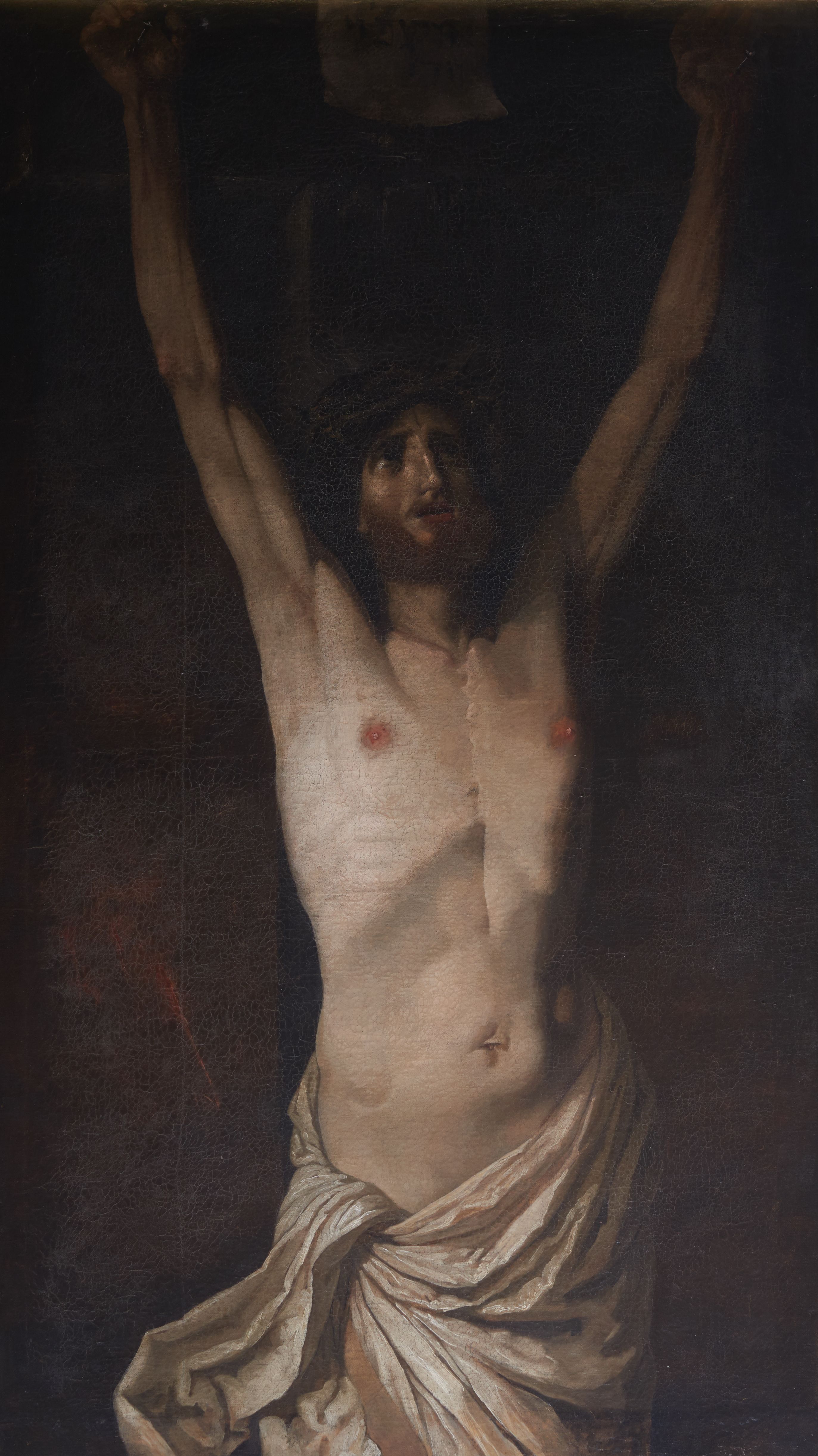 Obraz został namalowany w XVIII wieku w warsztacie nieznanego artysty. Przedstawia ukrzyżowanie, kulminacyjny moment męki Chrystusa, który został najdokładniej opisany w Ewangelii św. Jana (J, 17-29). Autor przedstawił samotnego Chrystusa, wydobytego bladością ciała na niemal jednolitym, choć niespokojnym, ciemnym tle odpowiadającym relacjom ewangelistów, którzy podali, że podczas konania Zbawiciela zapanowała na ziemi ciemność. Postać umierającego stanowi silną dominantę oraz centralny punkt kompozycji. Ciało Chrystusa jest idealizowanie, nie nosi śladów męki, wręcz jaśnieje na krzyżu. Ten sposób ukazywania postaci Zbawiciela pojawiał się dość często na północ od Alp, co widać na obrazujących moment ukrzyżowania grafikach Albrechta Dürera, Martina Schongauera czy płótnach Petera Paula Rubensa. Chrystus został ukazany jako „Christus Triumphans”, nie zwisa bezwładnie – martwy, lecz trwa w boskim uniesieniu. Osamotniony kieruje wzrok w stronę nieba, ku Ojcu. Krzyż, do którego został przybity Zbawiciel ulokowano delikatnie skośnie do płaszczyzny obrazu, przez co artysta dodał pozornie statycznej scenie elementów dynamiki.