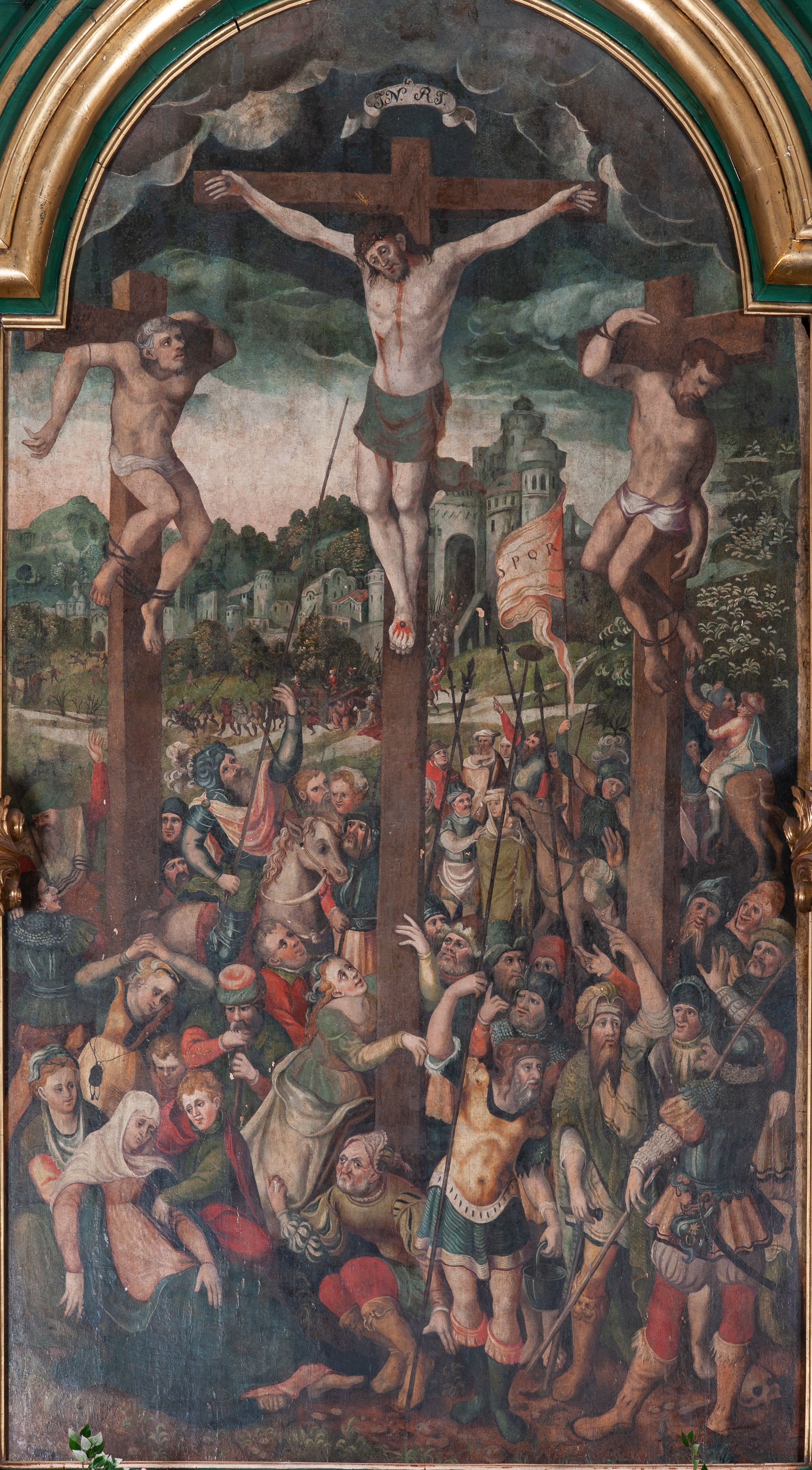 Obraz został namalowany według jednych badaczy w 1570 roku, a według innych w 1640 roku i pochodzi z warsztatu Mistrza Męczeństwa Apostołów. Przedstawia scenę Ukrzyżowania Chrystusa między łotrami i tłumem ludzi, na drugim planie drogę krzyżową, a w tle mury Jerozolimy. Jego ikonografia odwołuje się do dzieła Petrusa Venetusa z lat 1546-1547 umieszczonego w kościele w Bodzentynie, dawniej w ołtarzu głównym katedry wawelskiej.