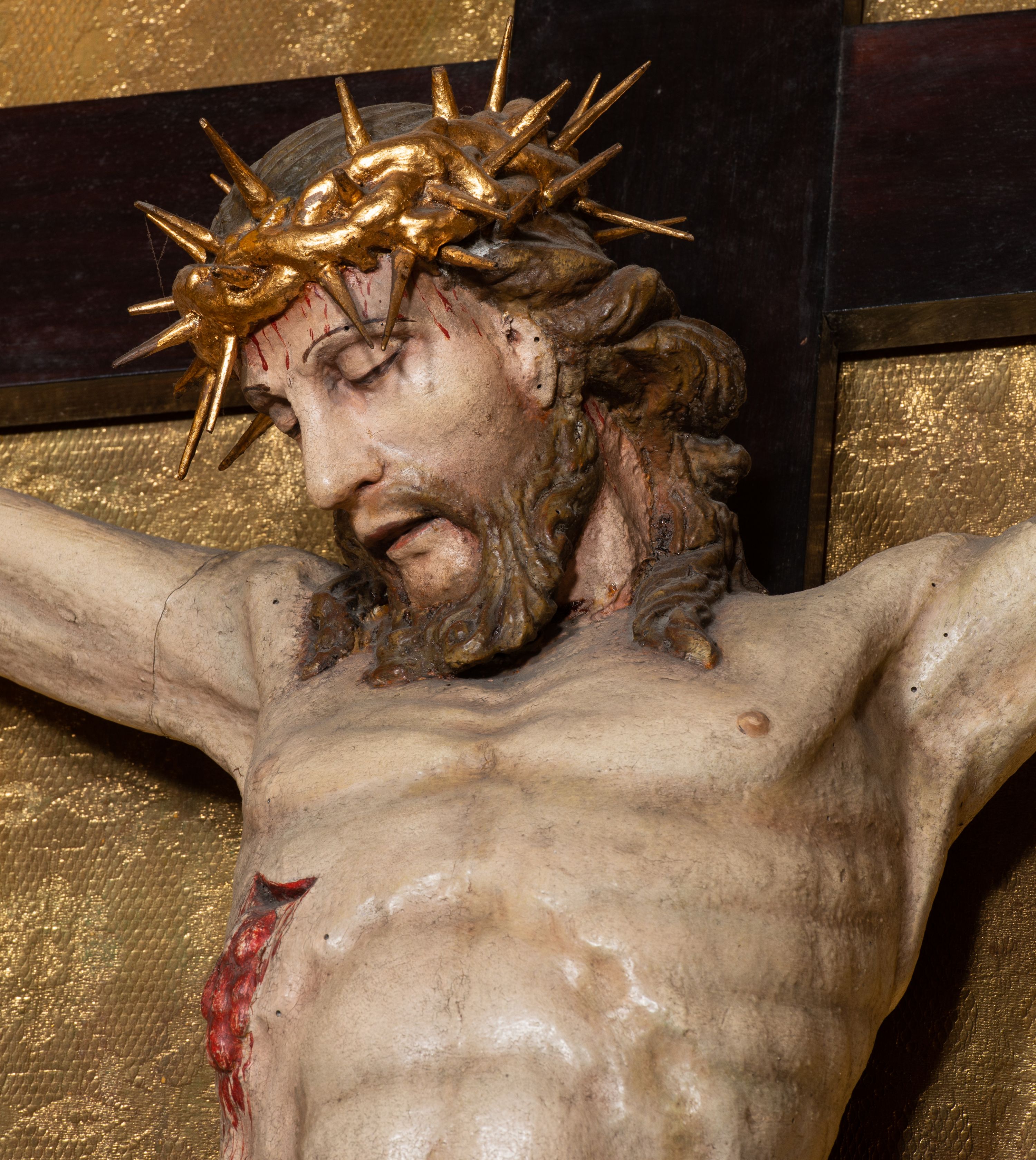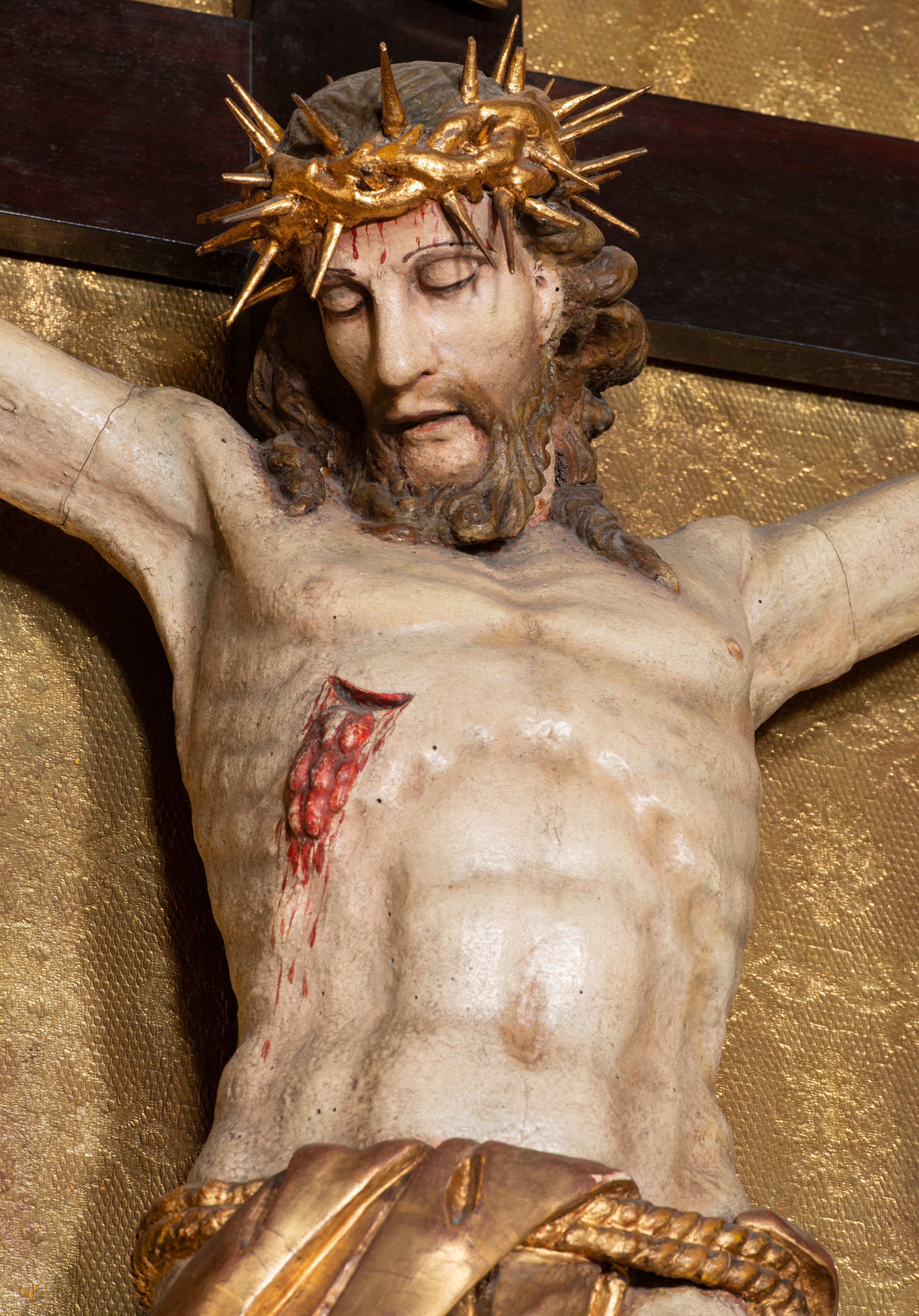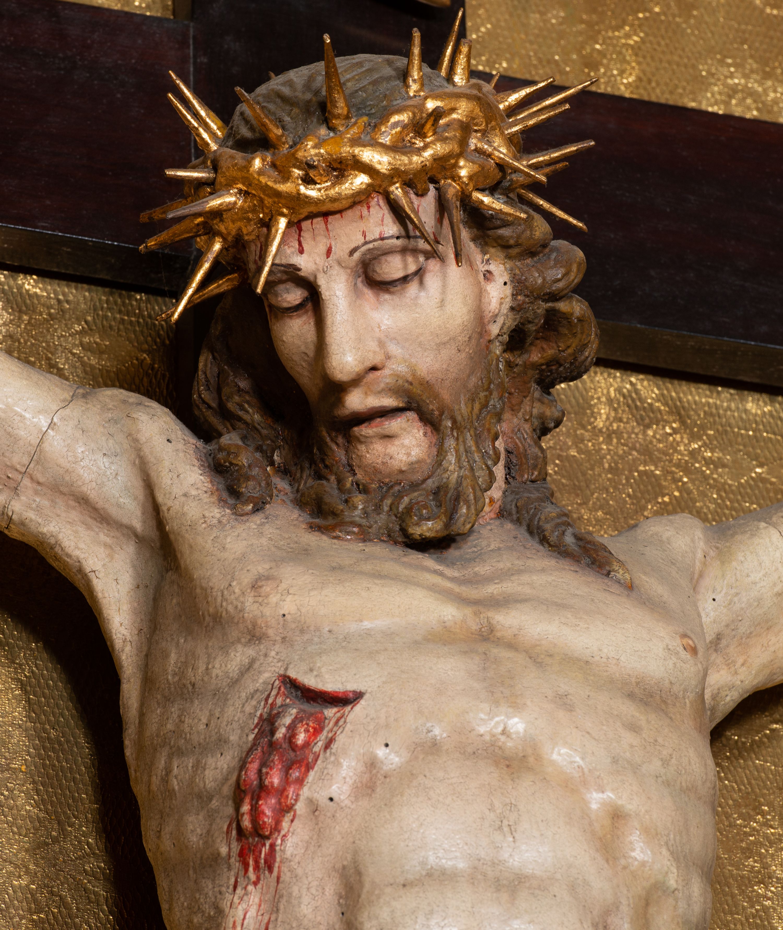 Na dużym krzyżu z ciemnego drewna zawieszono polichromowaną figurę martwego Chrystusa o szeroko rozpostartych ramionach. Ciało Zbawiciela do krzyża jest przymocowane za pomocą trzech gwoździ. On sam został ukazany jako martwy z zamkniętymi oczami i nieznacznie słaniającą się głową. Jego postać jest wysmuklona z realistycznie potraktowaną muskulaturą korpusu. Wyraźnie zaznaczono naprężone ścięgna i mięśnie na całym ciele, co ma sprawiać wrażenie jego autentyczności. Mocno również zaznaczono krwawiącą wybroczynę z przebitego prawego boku. Ciało jest wychudzone o zapadłej klatce piersiowej z silnie podkreśloną linią żeber i mostkiem. Prawa stopa założona jest na lewą. Twarz Zbawiciel jest pociągłą z wyrazistym nosem i wąskim, nieznacznie rozchylonymi ustami. Głowę otaczają brązowe włosy spływające puklami na oba ramiona oraz brązowa broda. Chrystus ma na głowie złoconą, cierniową koronę z długimi cierniami, spod której na czoło spływają krople krwi. Biodra Zbawiciela przepasane są złoconym, krótkim perizonium w formie chusty przerzuconej przez podwójny sznur, odsłaniającej lewe udo i układające się w feston z prawej strony. Ponad głową Chrystusa na pionowej belce krzyża zawieszono rozwiany titulus z napisem "IN / RI".