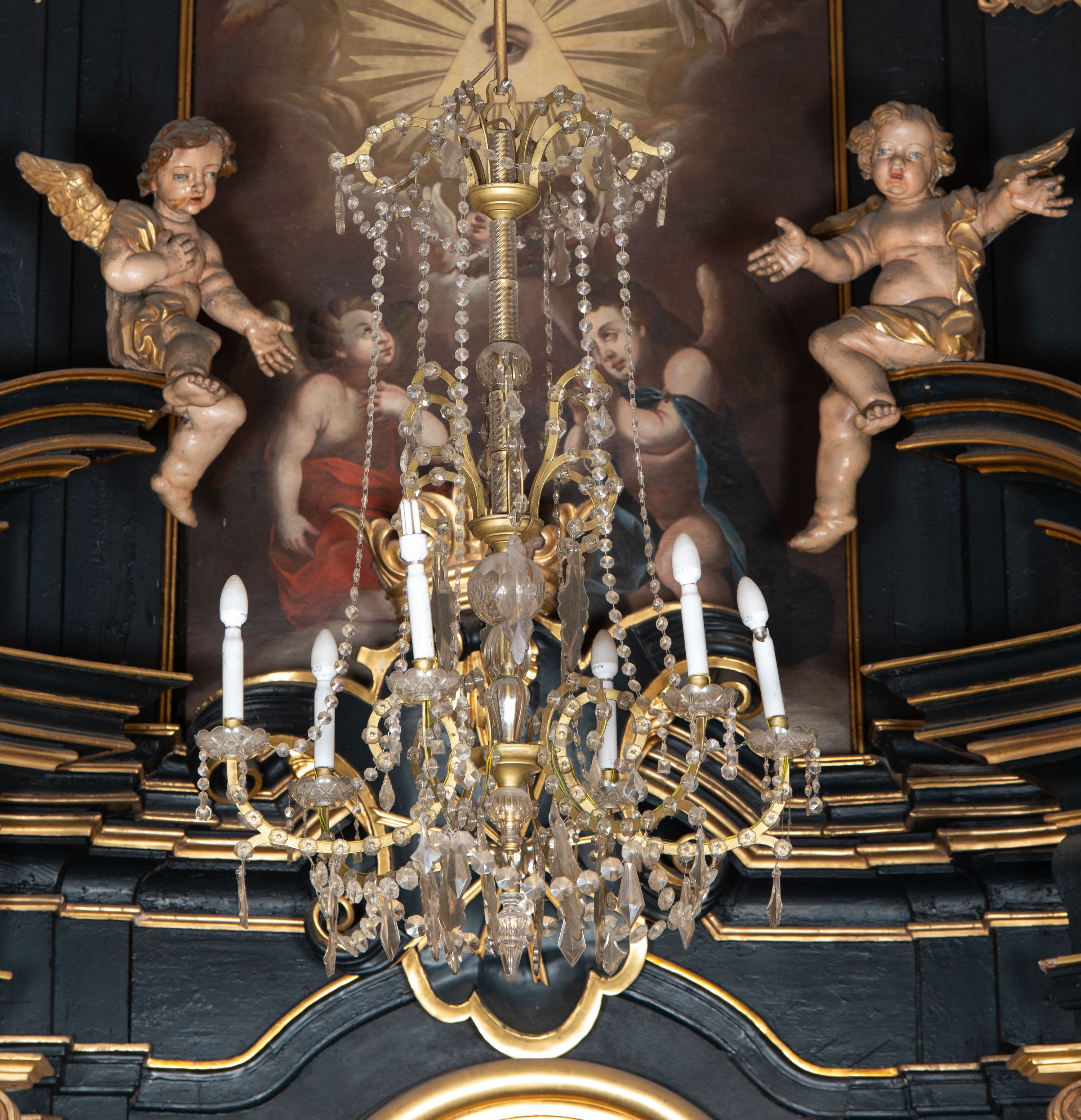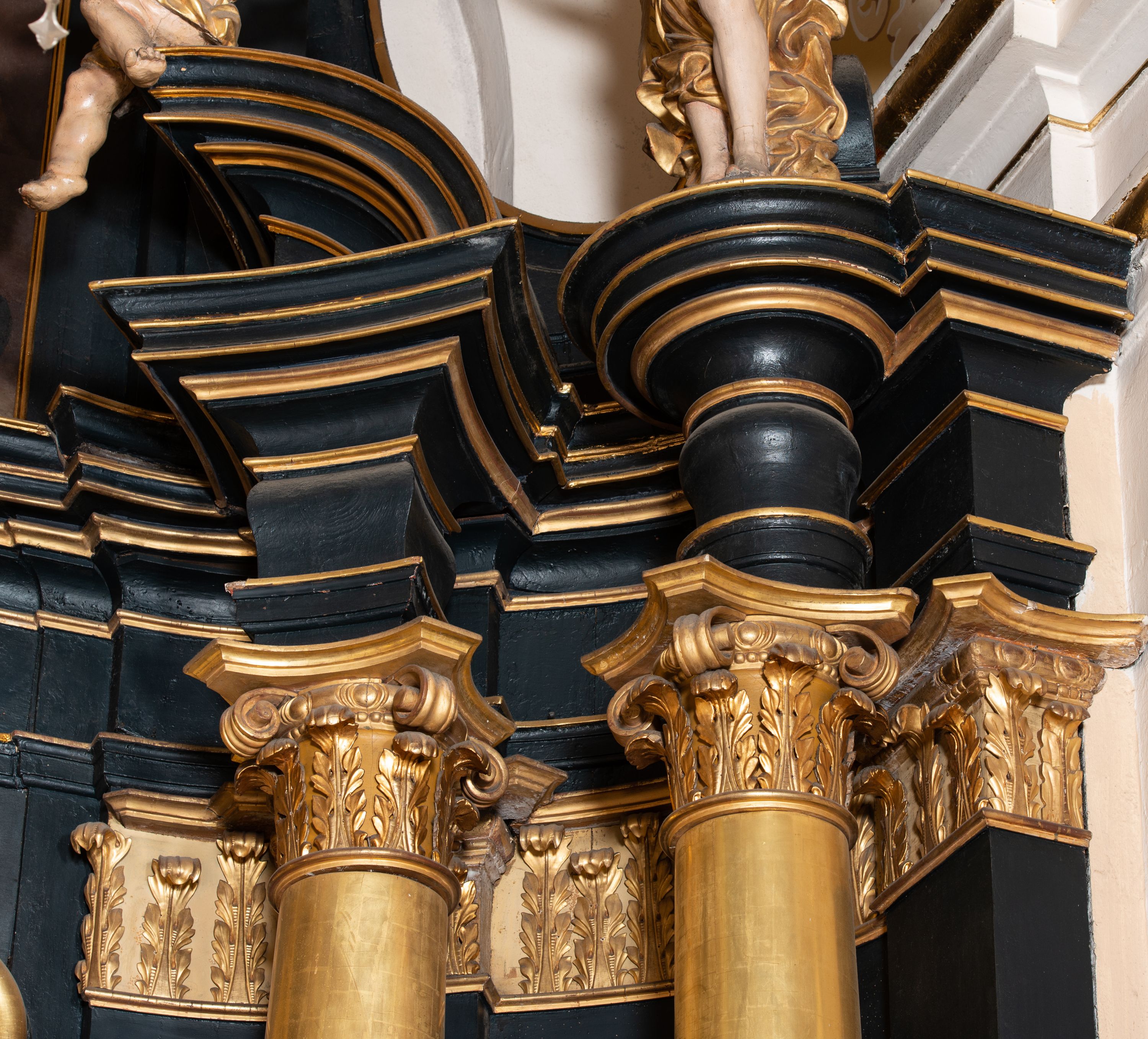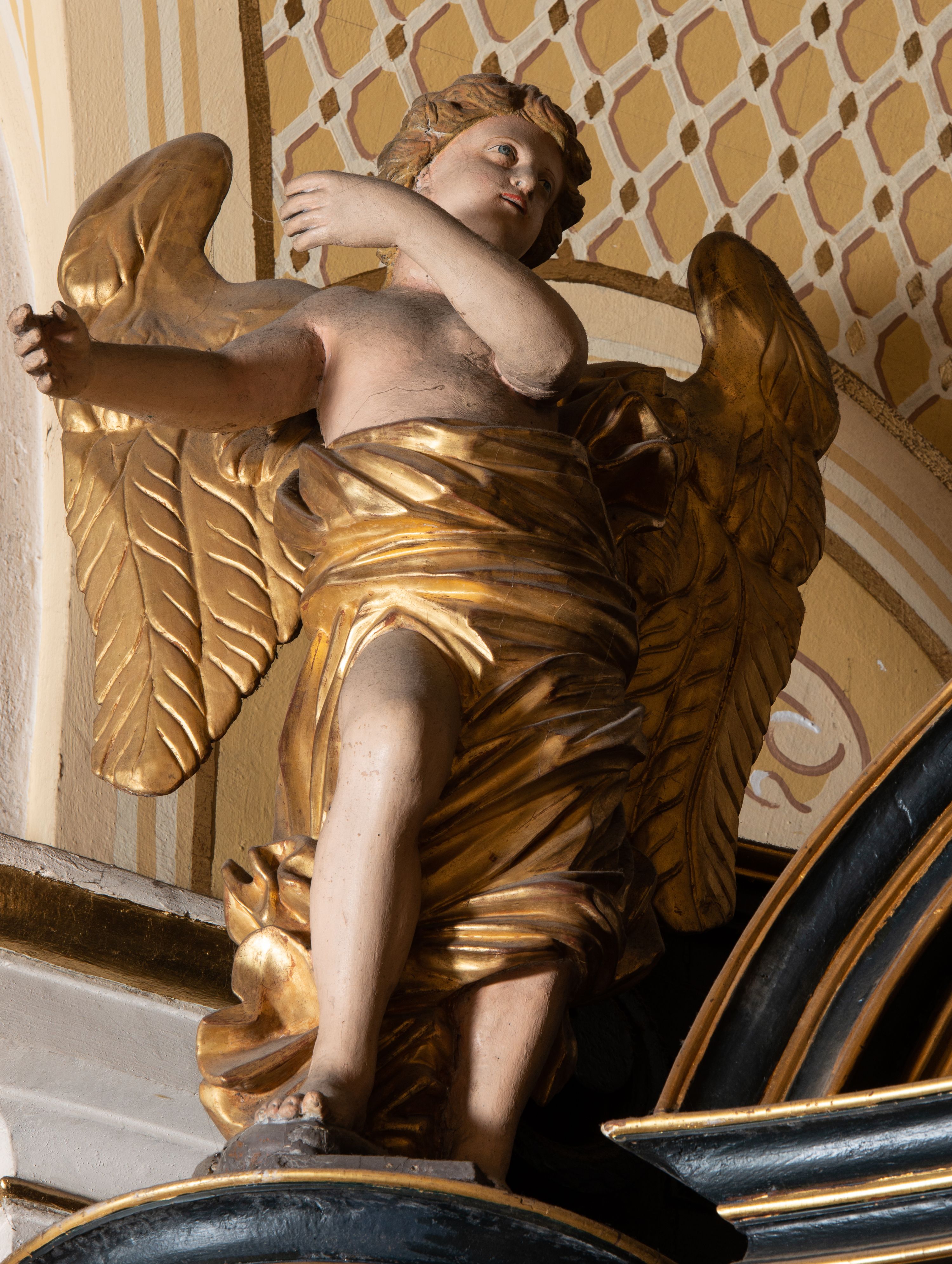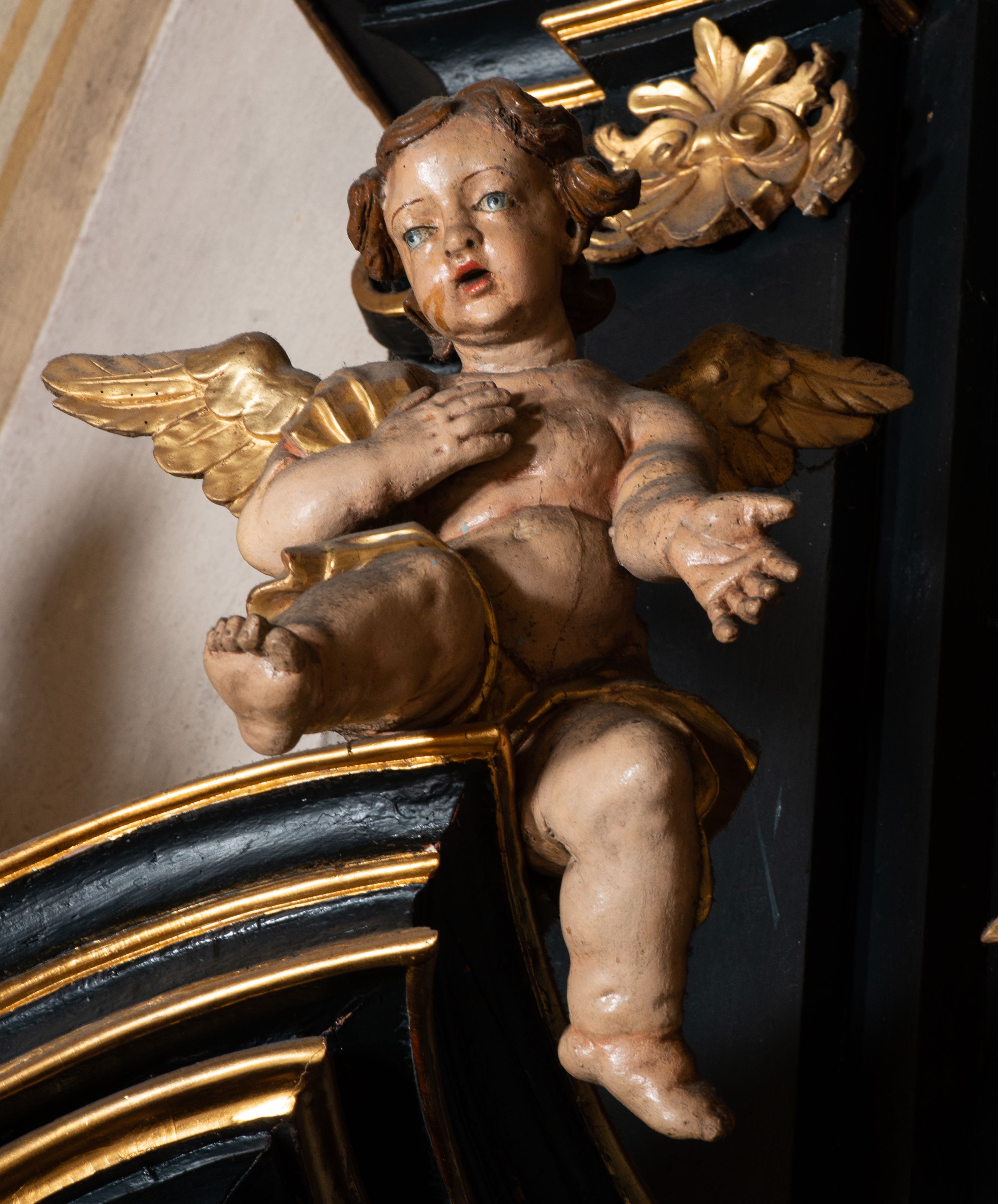 Na dużym krzyżu z ciemnego drewna zawieszono polichromowaną figurę martwego Chrystusa o szeroko rozpostartych ramionach. Ciało Zbawiciela do krzyża jest przymocowane za pomocą trzech gwoździ. On sam został ukazany jako martwy z zamkniętymi oczami i nieznacznie słaniającą się głową. Jego postać jest wysmuklona z realistycznie potraktowaną muskulaturą korpusu. Wyraźnie zaznaczono naprężone ścięgna i mięśnie na całym ciele, co ma sprawiać wrażenie jego autentyczności. Mocno również zaznaczono krwawiącą wybroczynę z przebitego prawego boku. Ciało jest wychudzone o zapadłej klatce piersiowej z silnie podkreśloną linią żeber i mostkiem. Prawa stopa założona jest na lewą. Twarz Zbawiciel jest pociągłą z wyrazistym nosem i wąskim, nieznacznie rozchylonymi ustami. Głowę otaczają brązowe włosy spływające puklami na oba ramiona oraz brązowa broda. Chrystus ma na głowie złoconą, cierniową koronę z długimi cierniami, spod której na czoło spływają krople krwi. Biodra Zbawiciela przepasane są złoconym, krótkim perizonium w formie chusty przerzuconej przez podwójny sznur, odsłaniającej lewe udo i układające się w feston z prawej strony. Ponad głową Chrystusa na pionowej belce krzyża zawieszono rozwiany titulus z napisem "IN / RI".