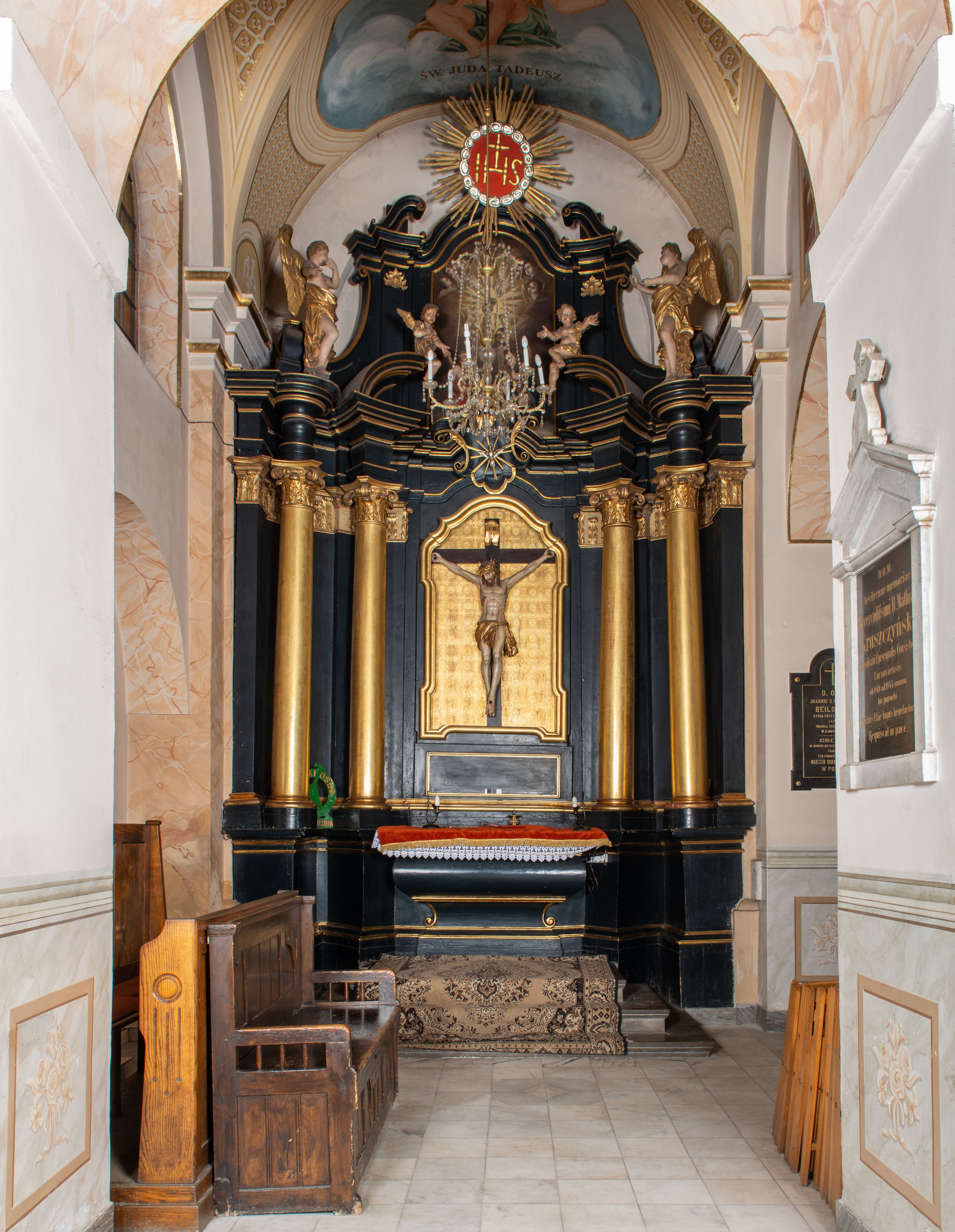 Naśladującą rzeźbę barokową, figurę Ukrzyżowanego Chrystusa sprawiono w pierwszej połowie XIX wieku do ufundowanego w tym samym czasie bocznego ołtarza w nawie północnej.