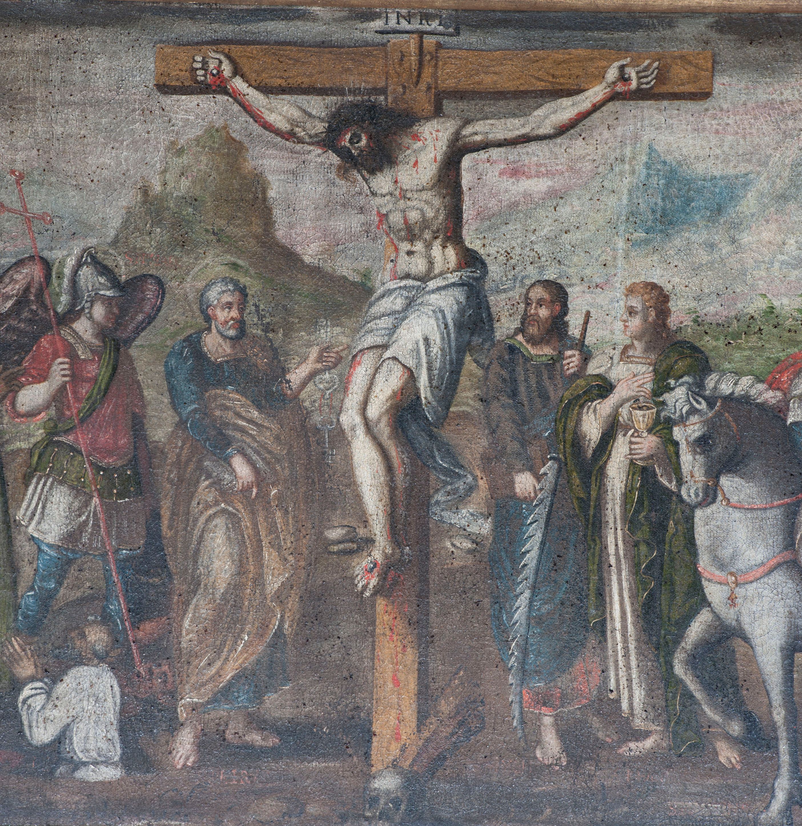 Obraz malowany olejno na desce, w kształcie leżącego prostokąta, w profilowanej, malowanej i złoconej ramie, z przedstawieniem na tle pejzażu Chrystusa na krzyżu oraz po jego bokach świętych: św. Stanisława, św. Michała Archanioła i św. Piotra (po lewej) oraz św. Szymona Apostoła, św. Jana Ewangelisty, św. Marcina z żebrakiem. W lewym dolnym narożu obrazu klęczy starsza kobieta ze złożonymi do modlitwy dłońmi. Dzieło nieokreślonego malarza małopolskiego z początku XVII wieku.