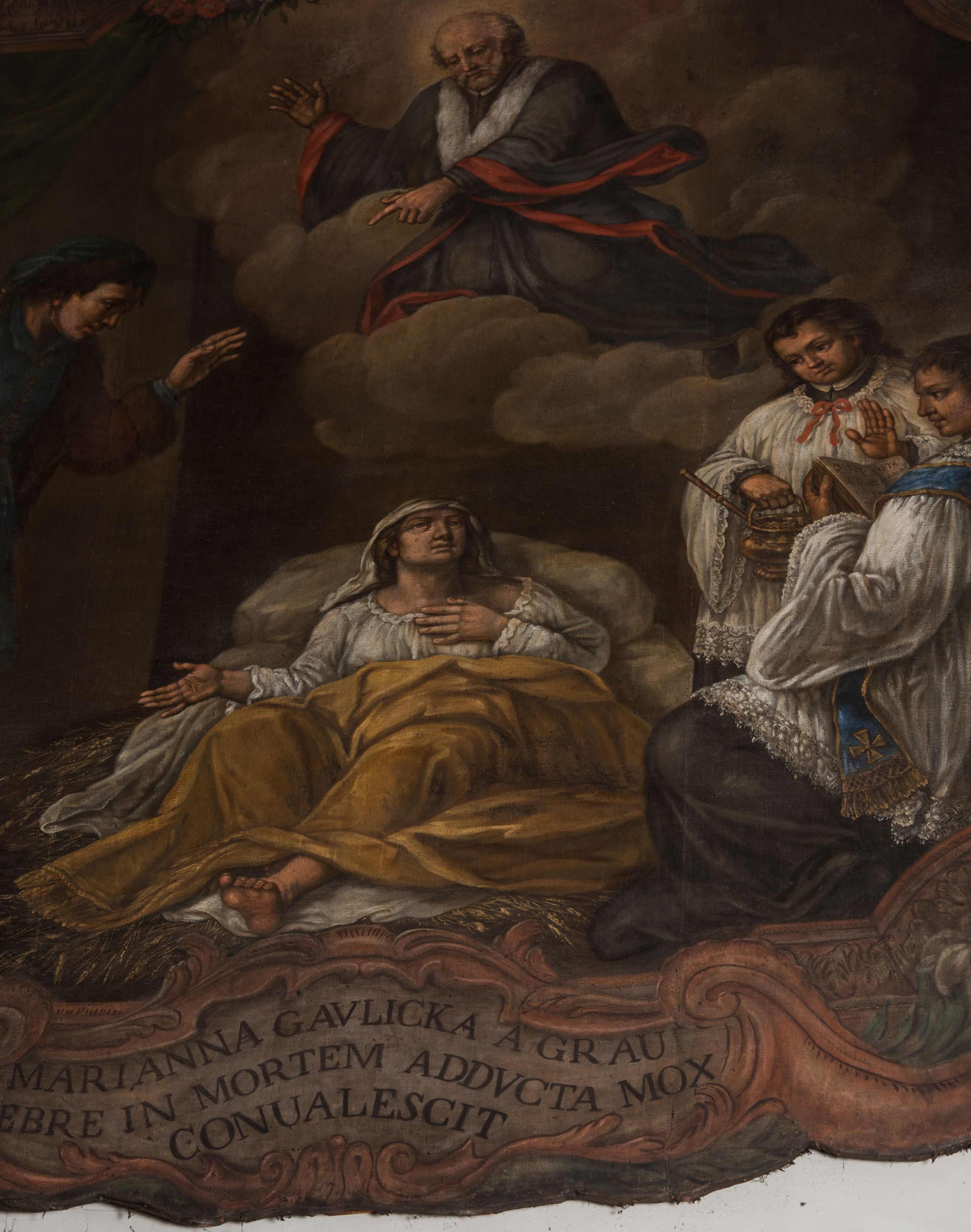 Obraz w fantazyjnej ramie ujętej szeroką, malowaną bordiurą, z girlandami z kwiatów podwieszonymi pod górną krawędzią z główką aniołka. Ukazuje scenę uzdrowienia z wysokiej gorączki Marianny Gawlickiej, leżącej na łożu, w towarzystwie dwóch modlących się księży w białych komżach z postacią mężczyzny wyłaniającego się zza lewej krawędzi. Na modlitewniku jednego z duchownych napis "Józef, Cholewicz, 1878, odnowił". Nad nimi unosi się w chmurach Jan Kanty w stroju profesorskim. U dołu kartusz z napisem "MARIANNA GAVLICKA A GRAVI/FEBRE IN MORTEM ADDVCTA MOX / CONUALESCIT".