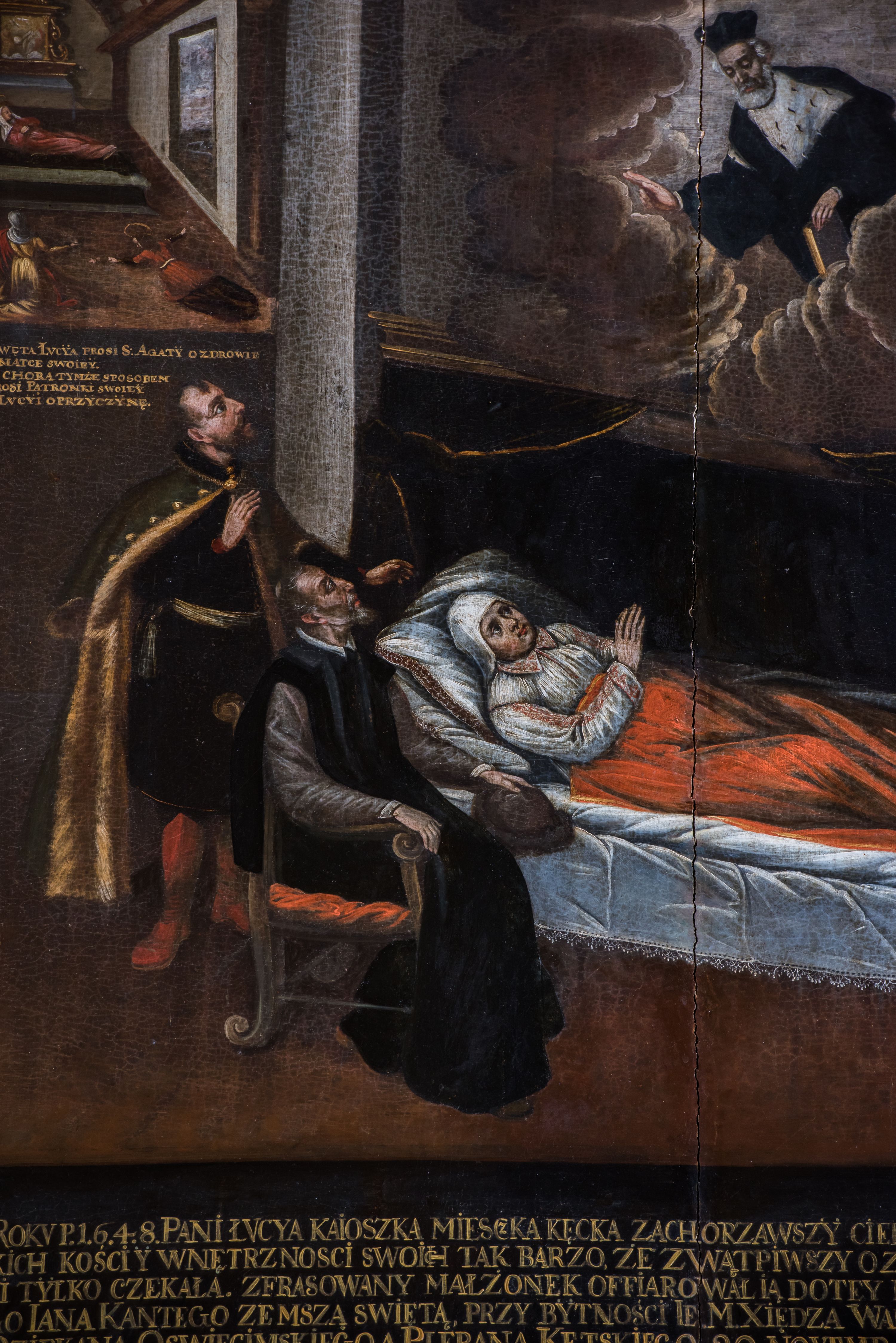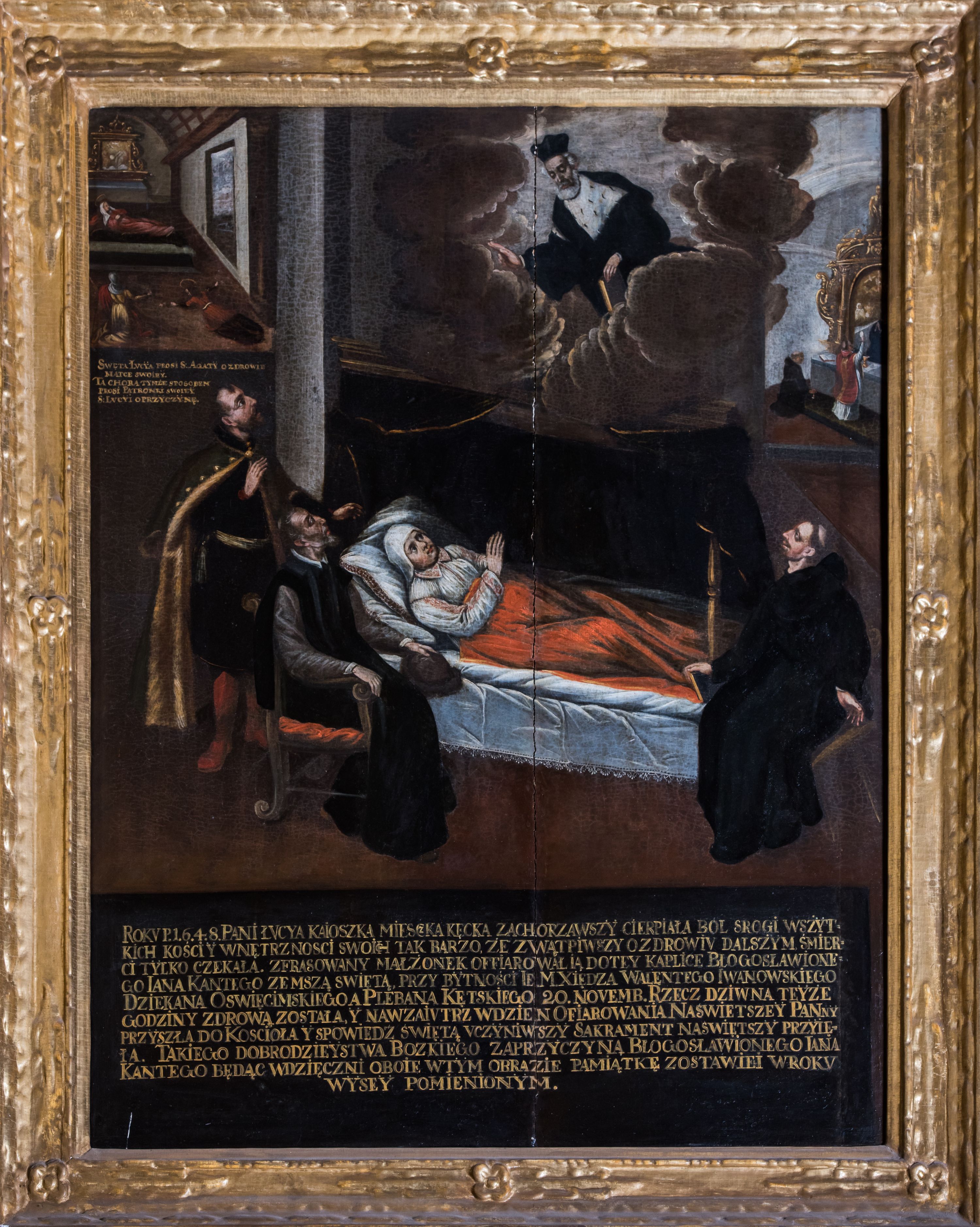 Obraz w kształcie stojącego prostokąta, ujęty drewnianą, profilowaną, złoconą ramą z roślinną dekoracją ornamentalną jest kompozycją narracyjną. Przedstawia trzy odrębne sceny. Pierwszy plan zajmuje scena uzdrowienia Łucji Kajoszkowej: chora leży na łożu z baldachimem, po lewej stronie, obok niej u wezgłowia znajdują się dwaj mężczyźni – jeden ubrany w kontusz szlachecki siedzi w fotelu, drugi w delii, stoi za nim. Po prawej stronie u nóg chorej siedzi zakonnik, augustianin z krakowskiego konwentu. Ponad nimi, wśród obłoków ukazany jest św. Jan Kanty, ubrany w togę profesorską i biret. Blask bijący od niego daje efekty światłocieniowe. Kolorystyka całej przestrzeni jest ciemna, skontrastowana jedynie czerwienią płótna okrywającego chorą. Na drugim planie, po lewej stronie, widoczna jest scena uzdrowienia matki patronki Kajoszkowej, św. Łucji przez św. Agatę. Chora spoczywa we wnętrzu o kolebkowym sklepieniu, przed nią dwie modlące się kobiety, po prawej leży krzyżem św. Łucja. W głębi ołtarzyk z obrazem Trójcy Świętej. Poniżej napis „SWĘTA LVCYA PROSI S(WIĘTĄ) AGATY O ZDROWIE / MATCE SWOIEY. / TA CHORA TYMŻE SPOSOBEM / PROSI PATRONKI SWOIEY / S(WIĘTEJ) LVCYI O PRZYCZYNĘ.” Po prawej stronie drugiego planu przedstawiony został ksiądz Walenty Iwanowski odprawiający mszę w intencji parafianki, przed późnorenesansowym ołtarzem z obrazem św. Jana Kantego modlącego się przed wizerunkiem Misericordia Domini. W dolnej partii obrazu napis „ROKV P(AŃSKIEGO) 1.6.4.8. PANI ŁVCYA KAIOSZKA MIESCZKA KĘCKA ZACHORZAWSZY CIERPIAŁA BÓL SROGI WSZYT/KICH KOŚCI Y WNĘTRZNOSCI SWOICH TAK BARZO ŻE ZWĄTPIWSZY O ZDROWIV DALSZYM ŚMIER/CI TYLKO CZEKAŁA. ZFRASOWANY MAŁŻONEK OFFIAROWAŁ IĄ DO TEY KAPLICE BŁOGOSŁAWIONE/GO JANA KANTEGO ZE MSZĄ WIĘTĄ PRZY BYTNOŚCI IE(GO) M(OŚCI) XIĘDZA WALĘNTEGO IWANOWSKIEGO / DZIEKANA OSWIĘCIMSKIEGO A PLEBANA KĘTSKIEGO 20. NOVEMB(RA). RZECZ DZIWNA TEYŻE / GODZINY ZDROWĄ ZOSTAŁA, Y NAWZAIVTRZ W DZIEN OFIAROWANIA NAŚWIETSZEY PANNY / PRZYSZŁA DO KOSCIOŁA Y SPOWIEDŹ ŚWIĘTĄ VCZYNIWSZY SAKRAMENT NAŚWIĘTSZY PRZYIĘ/ŁA. TAKIEGO DORBODZIEYSTWA BOZKIEGO ZA PRZYCZYNĄ BŁOGOSŁAWIONEGO IANA / KANTEGO BĘDĄC WDZIĘCZNI OBOIE W TYM OBRAZIE PAMIĄTKĘ ZOSTAWIELI W ROKV / WYSEY POMIENIONYM.”