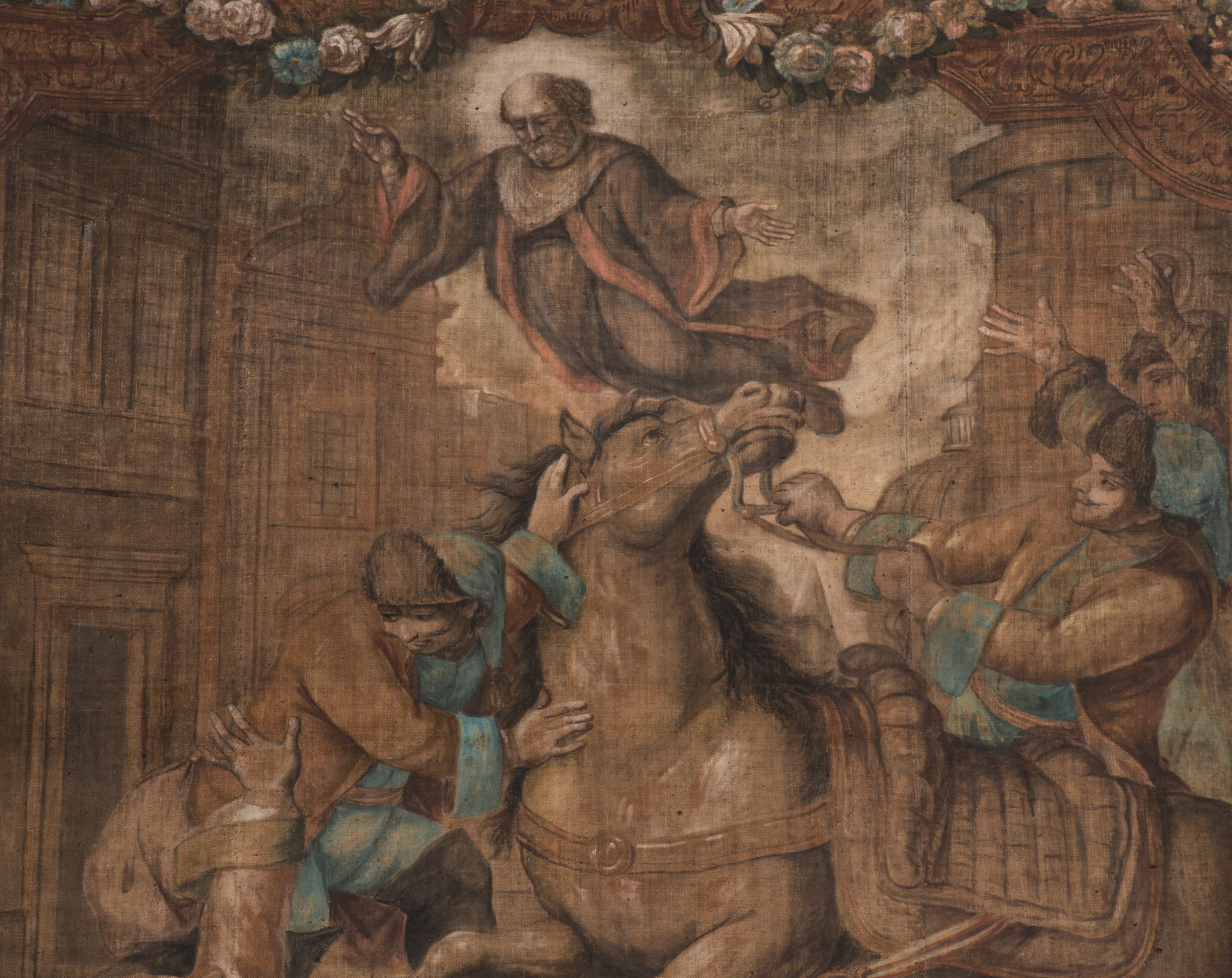 Obraz w fantazyjnej ramie ujętej szeroką, malowaną bordiurą, z girlandami z kwiatów podwieszonymi pod górną krawędzią z główką aniołka. Ukazuje scenę tratowania przez konia Tomasza Szreniawskiego. U dołu kartusz z napisem "CRVS EQUI LAPSV FRACTVM / CONSOLIDATUR ET FACVLTAS MOTVS / RESTITVITVR".