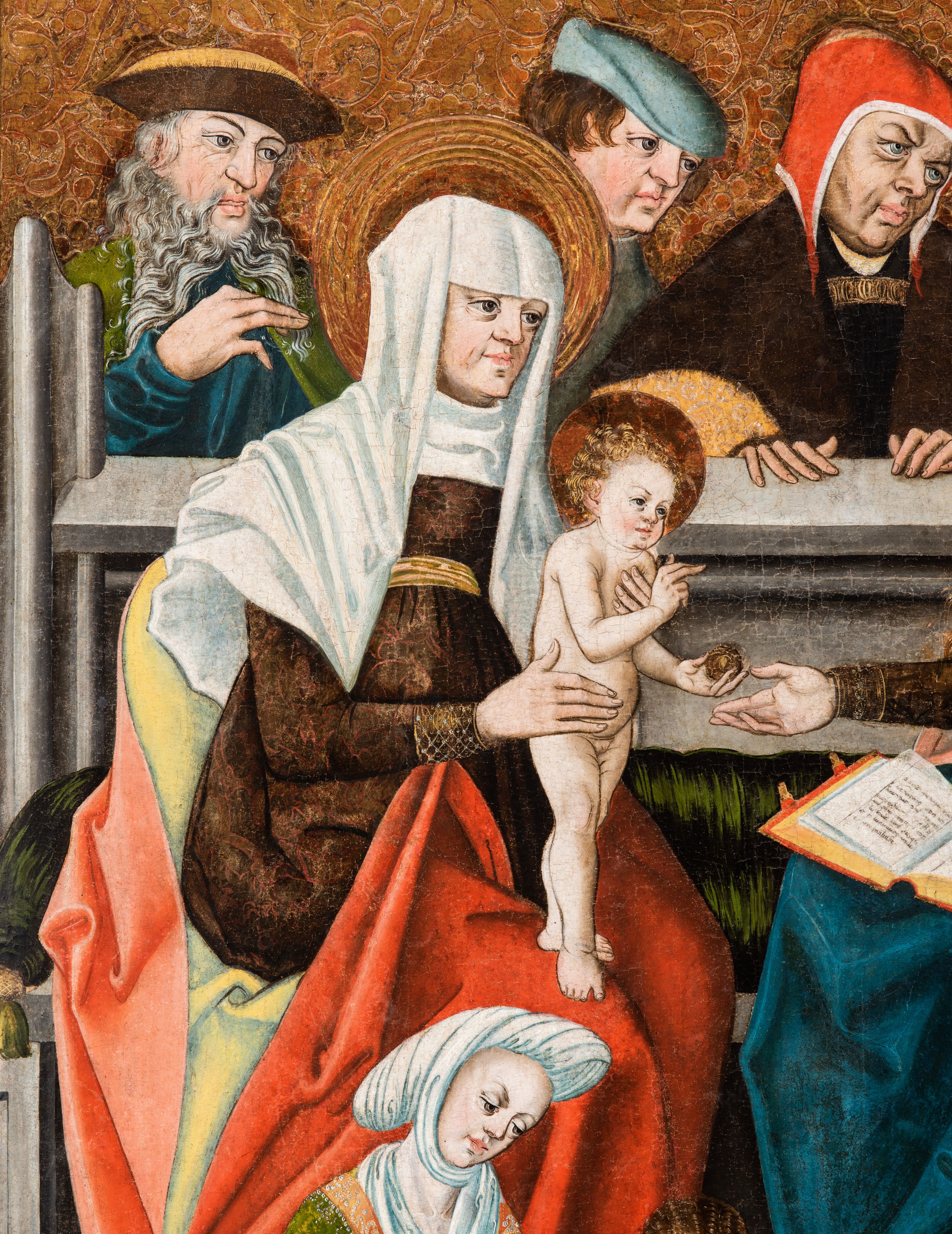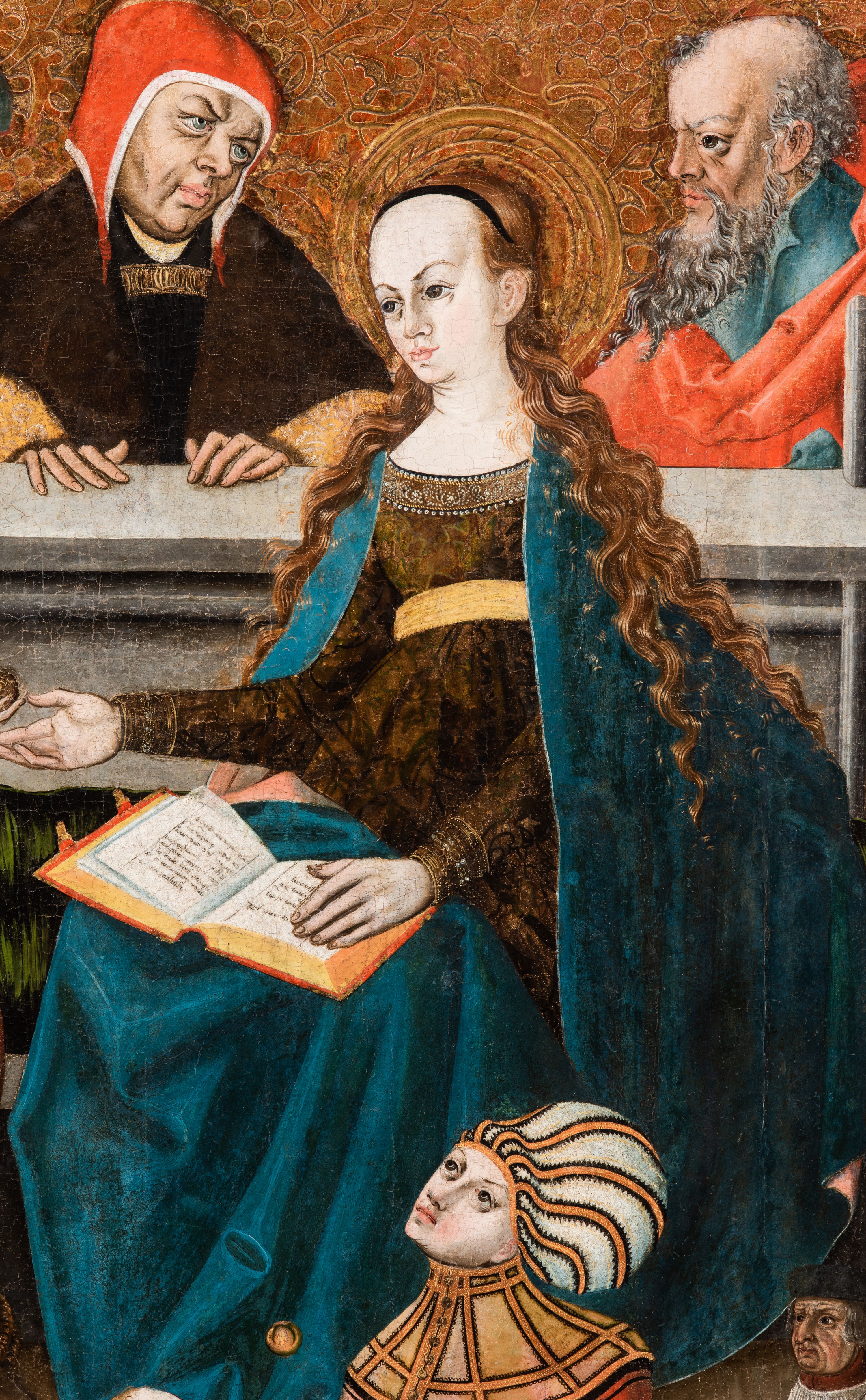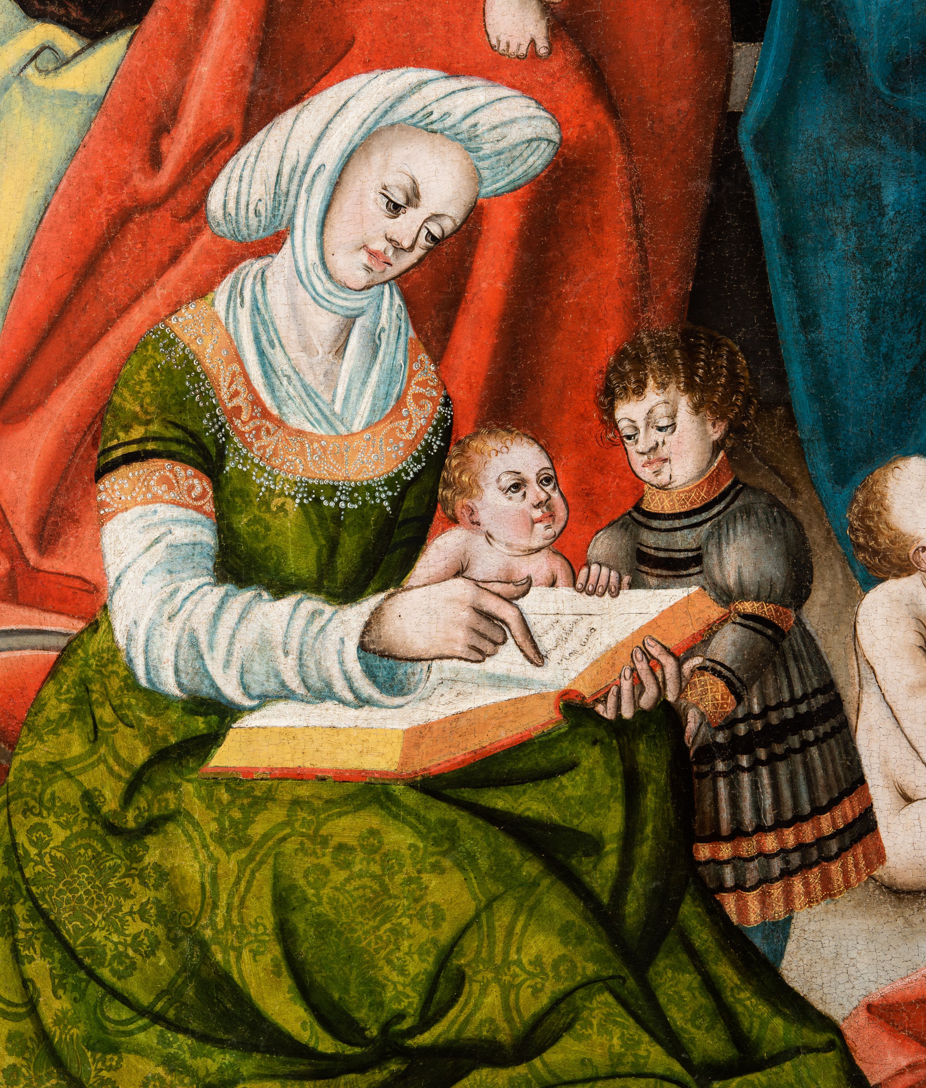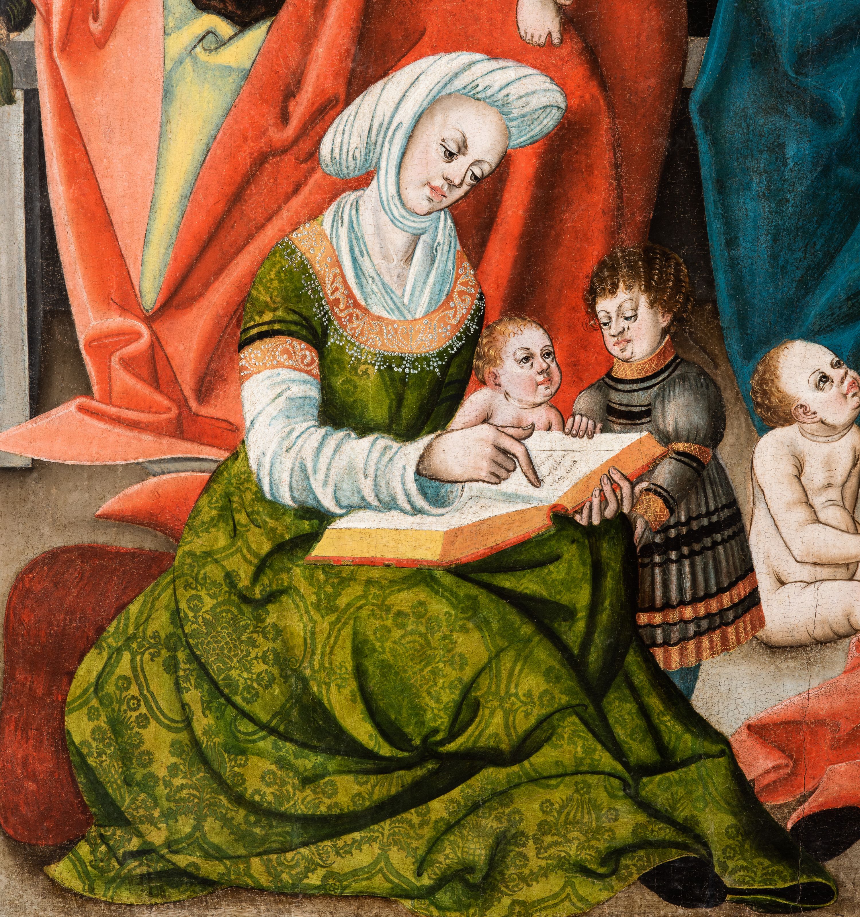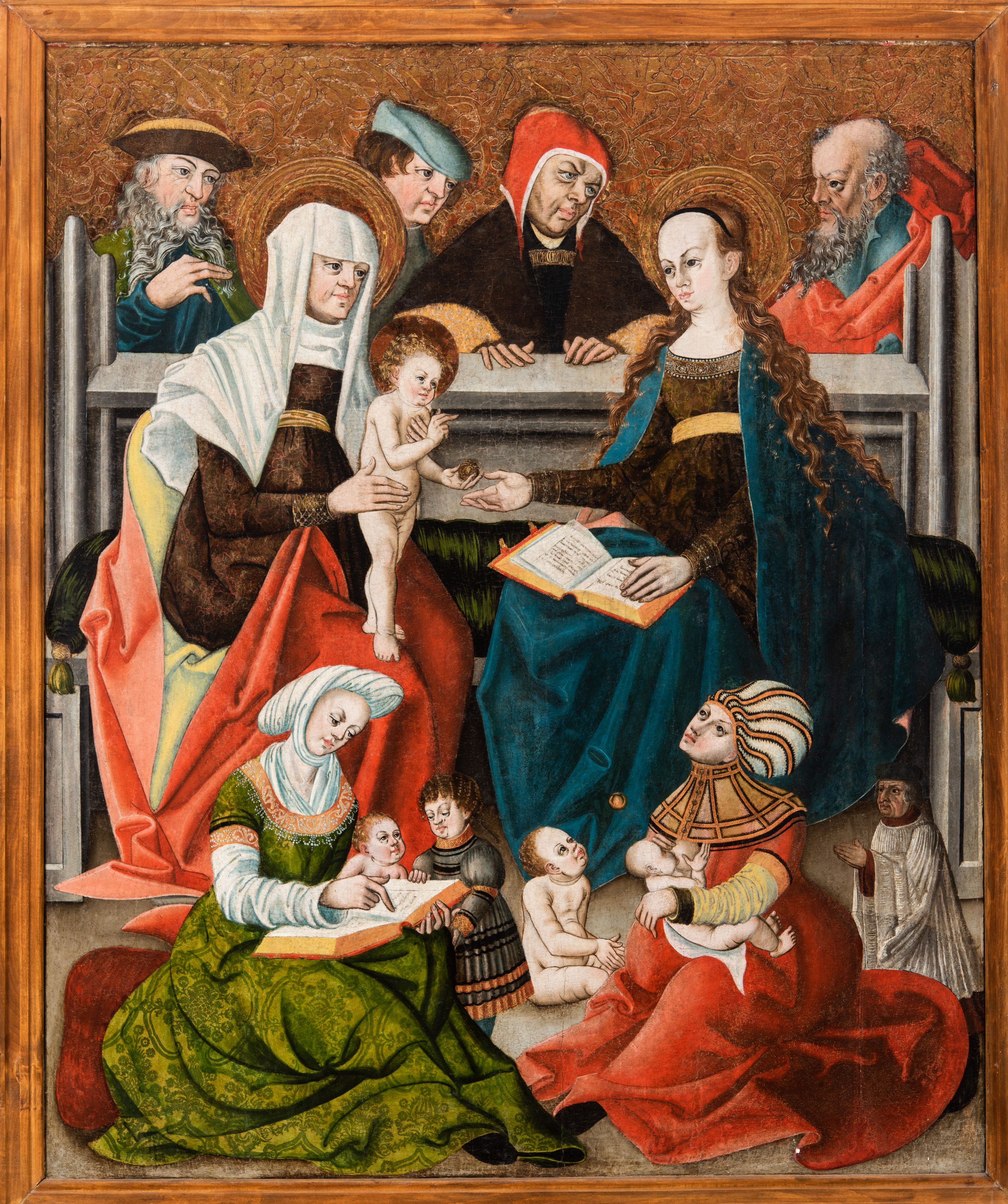 Tryptyk ze sceną Rodziny Marii w polu głównym oraz mniejszymi scenami z życia Najświętszej Marii Panny na rewersie skrzydeł i świętymi na awersie. W polu głównym obraz w formie stojącego prostokąta w drewnianej, profilowanej ramie. W centrum kompozycja przedstawiająca rodzinę Matki Boskiej w ujęciu trójstrefowym. W centrum umieszczona grupa z siedzącymi na kamiennej ławie, wyścielonej zielonym materiałem św. Annę z Dzieciątkiem Jezus oraz Matkę Boską. Obie zwrócone trzy czwarte ku środkowi. Święta Anna dwoma wyciągniętymi przed siebie rękami przytrzymuje stojące na jej kolanach Dzieciątko. Ma szeroką twarz z małymi ustami i dużymi oczami. Ubrana jest w brązową suknię z długimi rękawami oraz czerwony płaszcz z zieloną podszewką, na głowie biały welon w podwiką. Dzieciątko zwrócone jest trzy czwarte w lewo, w lewej dłoni trzyma jabłko, prawą błogosławi. Twarz okrągła o pucułowatych policzkach z wyraźnie zaznaczonym podbródkiem. Włosy krótkie, jasne, kędzierzawe. Matka Boska trzyma na kolanach otwartą księgę, prawą rękę wyciąga do Dzieciątka. Ubrana jest w brązową suknię z długimi rękawami, niebieski płaszcz. Głowę okalają bardzo długie, bujne włosy, opadające falami na ramiona i podwiązane wąska opaską. Wszyscy mają wokół głów złote i tłoczone nimby. U dołu obrazu siedzą z dziećmi: Maria Salome oraz Maria Kleofasowa. Jedna z kobiet karmi piersią niemowlę (św. Jan Ewangelista), obok siedzi mały św. Jakub Większy, druga uczy czytać dwójkę dzieci (zapewne św. Jakub Mniejszy i św. Juda Tadeusz). Kobiety ubrane w obszerne suknie: zieloną i czerwoną, na głowach mają założone białe czepce. Po prawej stronie obrazu miniaturowa postać fundatora ze złożonymi dłońmi. W górnej części kompozycji za ławą ukazani w półpostaci czterej mężczyźni, nad postacią św. Anny: Joachim, Kleofas i Salomas, a nad Matką Boską – św. Józef. Tło obrazu złocone i tłoczone w motywy roślinne. Kwatery dwudzielne, w lewej na awersie u dołu scena Nawiedzenia Najświętszej Marii Panny, u góry Zwiastowanie. Na awersie prawego skrzydła u dołu niezachowana scena, a u góry Pokłon Trzech Króli. Na rewersach skrzydeł: po lewej u góry św. Florian i św. Wojciech, niżej św. Stanisław i biskupa bez atrybutu (św. Mikołaj?); na prawym skrzydle u góry św. Bartłomiej i św. Paweł, u dołu brak kwatery.