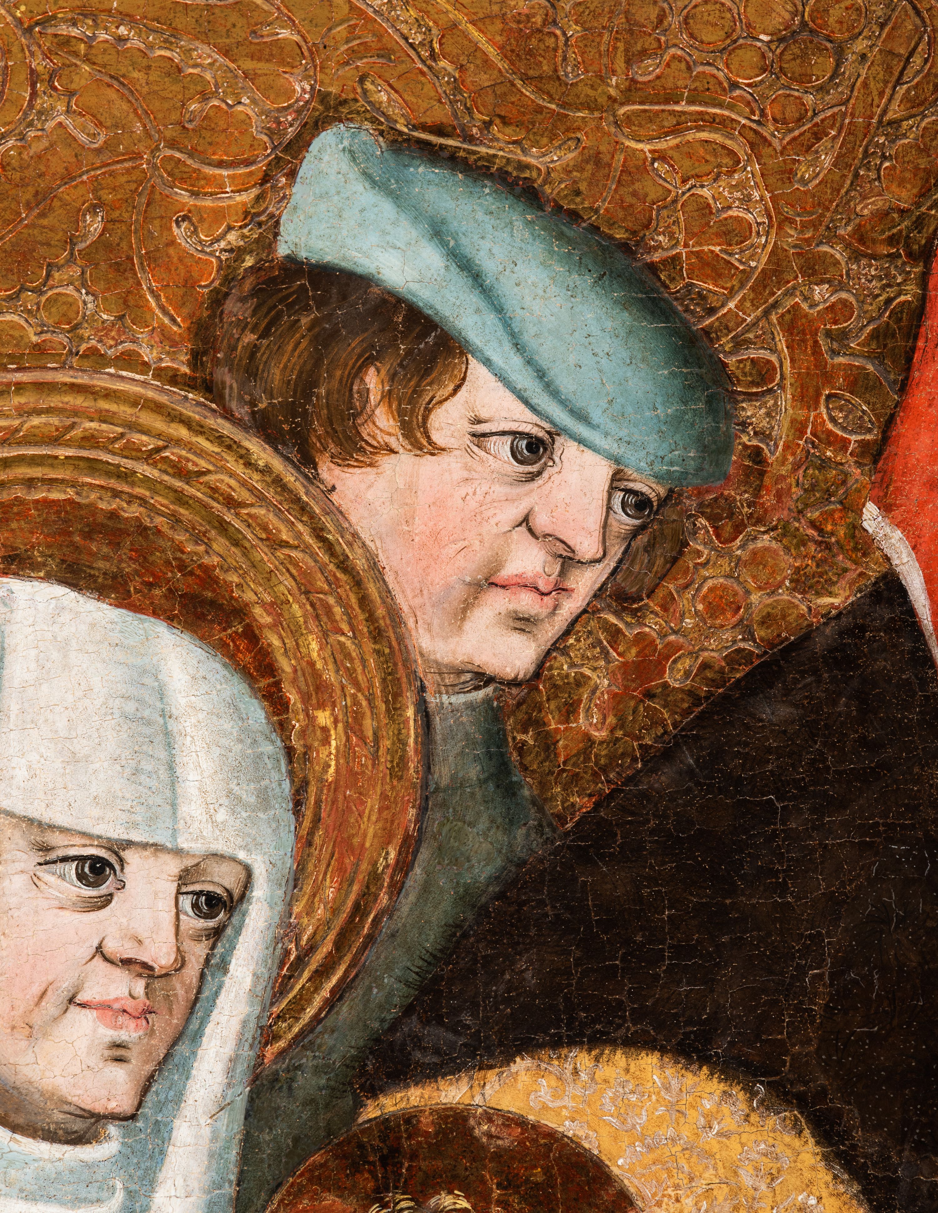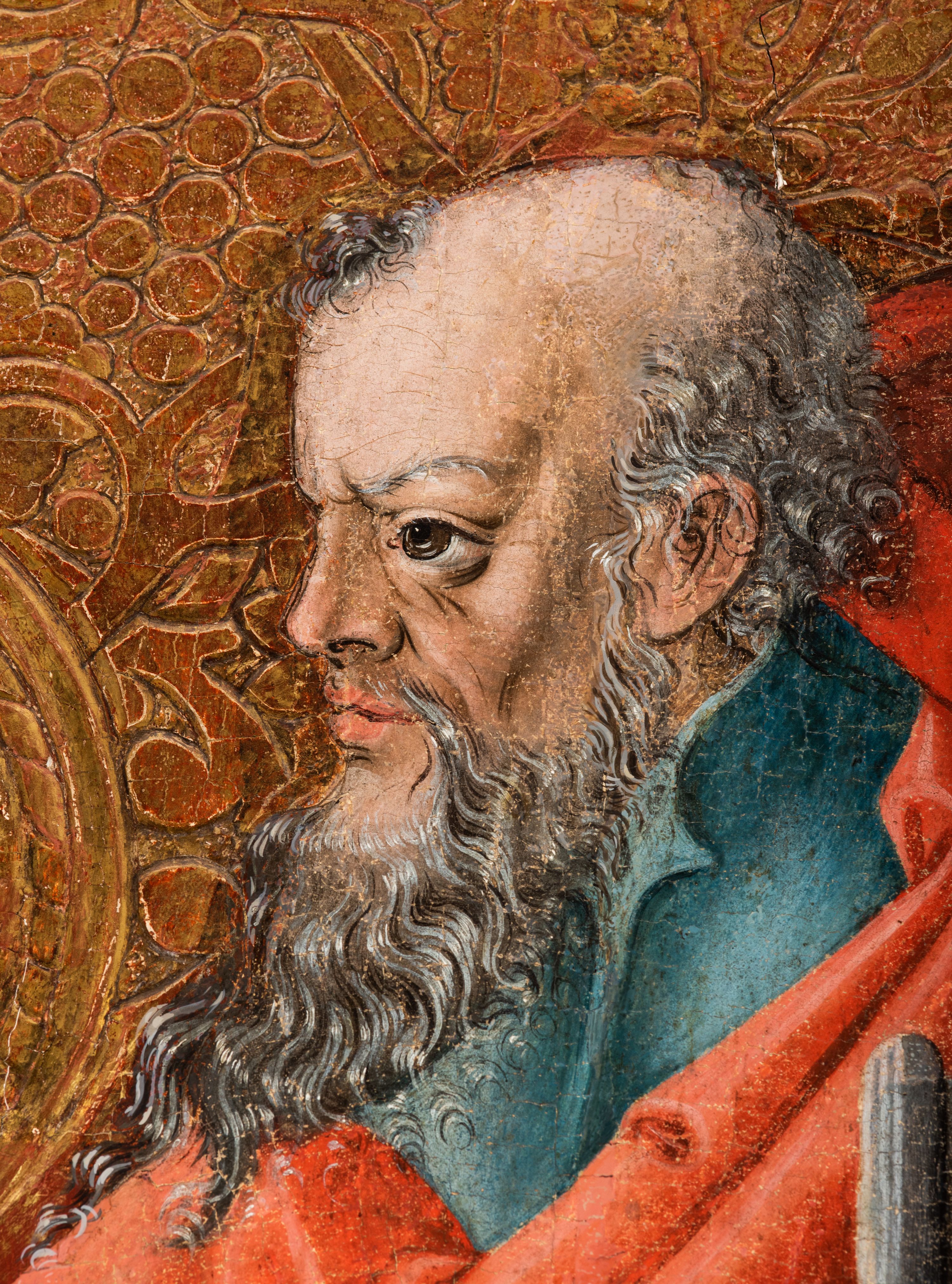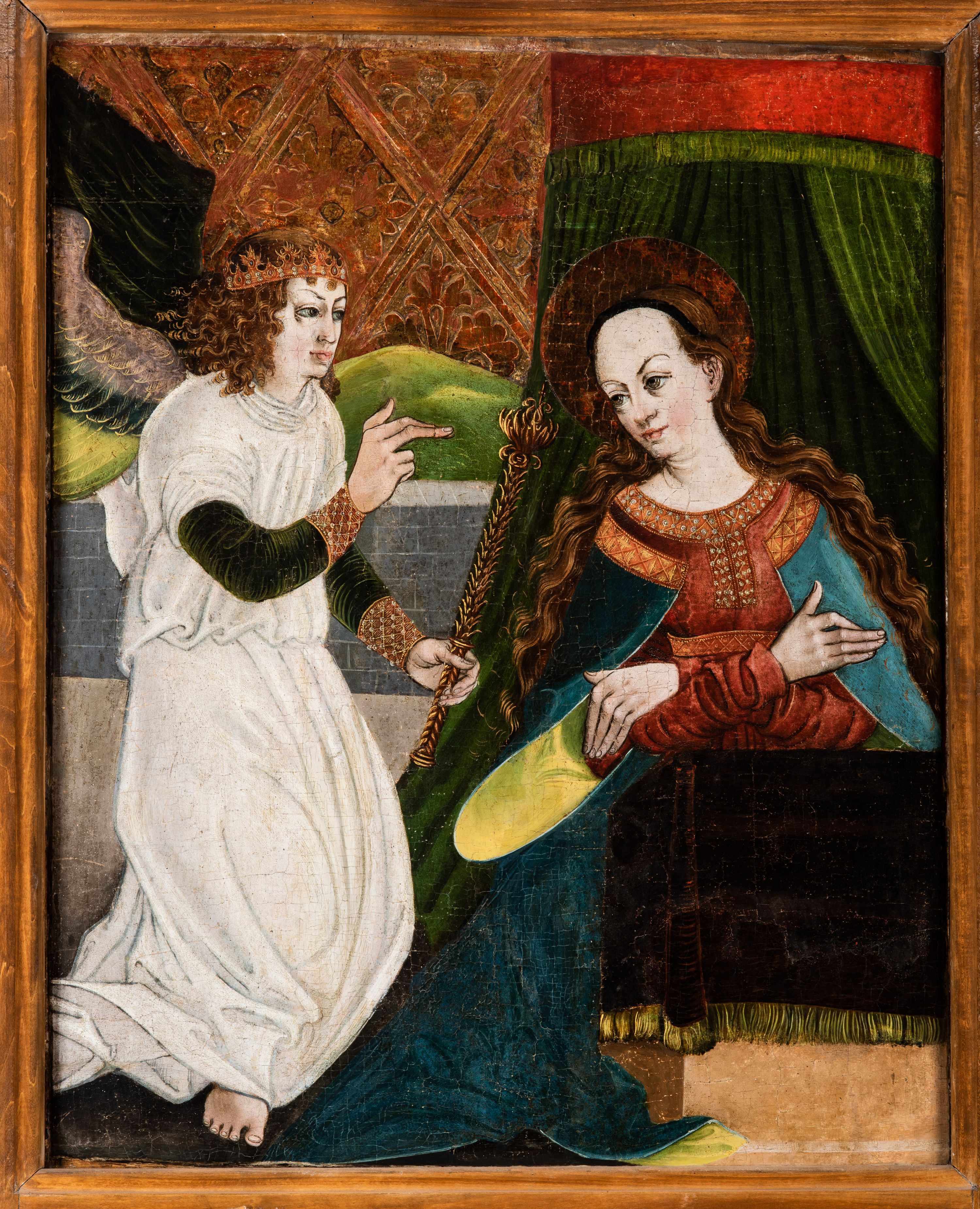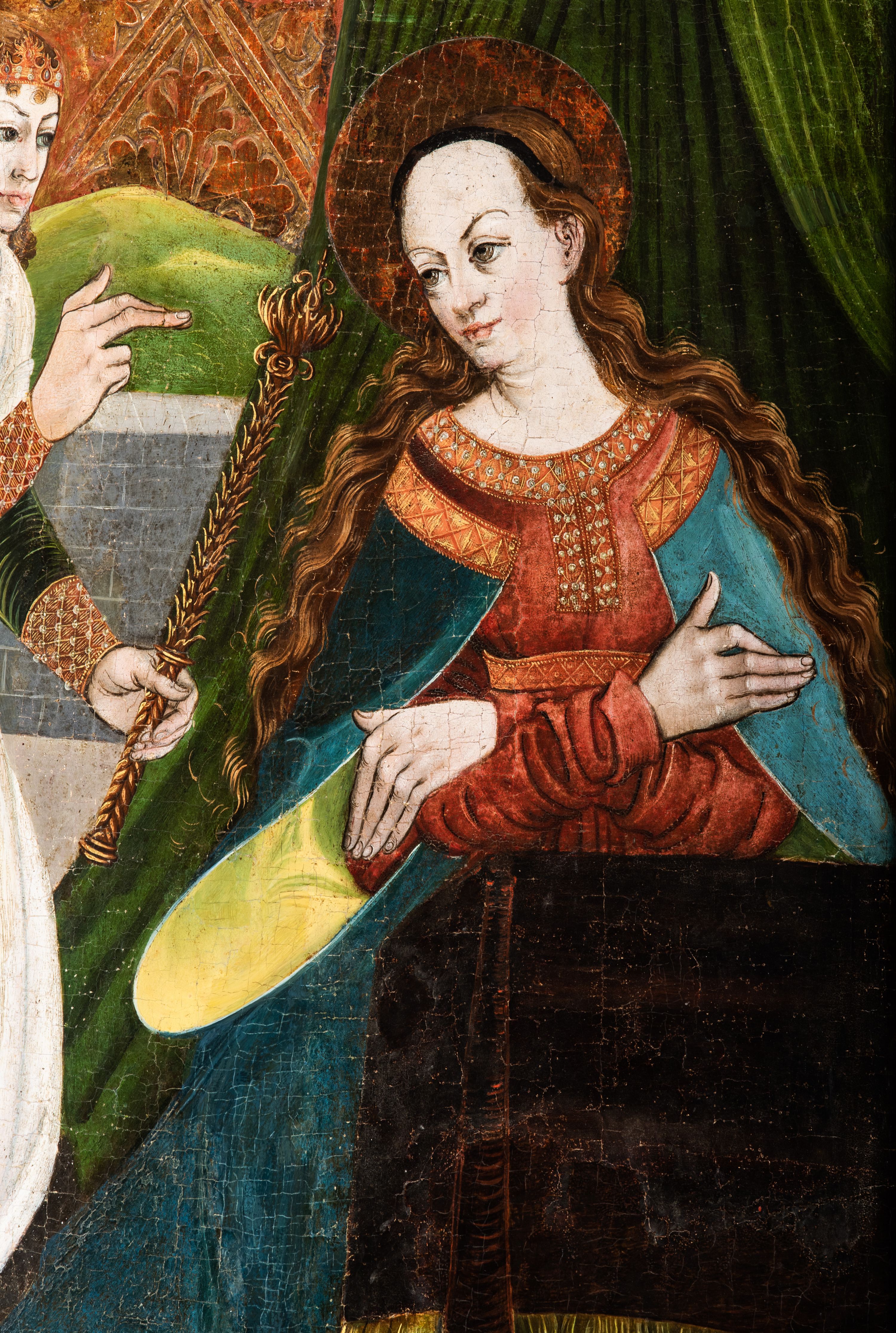 Tryptyk ze sceną Rodziny Marii w polu głównym oraz mniejszymi scenami z życia Najświętszej Marii Panny na rewersie skrzydeł i świętymi na awersie. W polu głównym obraz w formie stojącego prostokąta w drewnianej, profilowanej ramie. W centrum kompozycja przedstawiająca rodzinę Matki Boskiej w ujęciu trójstrefowym. W centrum umieszczona grupa z siedzącymi na kamiennej ławie, wyścielonej zielonym materiałem św. Annę z Dzieciątkiem Jezus oraz Matkę Boską. Obie zwrócone trzy czwarte ku środkowi. Święta Anna dwoma wyciągniętymi przed siebie rękami przytrzymuje stojące na jej kolanach Dzieciątko. Ma szeroką twarz z małymi ustami i dużymi oczami. Ubrana jest w brązową suknię z długimi rękawami oraz czerwony płaszcz z zieloną podszewką, na głowie biały welon w podwiką. Dzieciątko zwrócone jest trzy czwarte w lewo, w lewej dłoni trzyma jabłko, prawą błogosławi. Twarz okrągła o pucułowatych policzkach z wyraźnie zaznaczonym podbródkiem. Włosy krótkie, jasne, kędzierzawe. Matka Boska trzyma na kolanach otwartą księgę, prawą rękę wyciąga do Dzieciątka. Ubrana jest w brązową suknię z długimi rękawami, niebieski płaszcz. Głowę okalają bardzo długie, bujne włosy, opadające falami na ramiona i podwiązane wąska opaską. Wszyscy mają wokół głów złote i tłoczone nimby. U dołu obrazu siedzą z dziećmi: Maria Salome oraz Maria Kleofasowa. Jedna z kobiet karmi piersią niemowlę (św. Jan Ewangelista), obok siedzi mały św. Jakub Większy, druga uczy czytać dwójkę dzieci (zapewne św. Jakub Mniejszy i św. Juda Tadeusz). Kobiety ubrane w obszerne suknie: zieloną i czerwoną, na głowach mają założone białe czepce. Po prawej stronie obrazu miniaturowa postać fundatora ze złożonymi dłońmi. W górnej części kompozycji za ławą ukazani w półpostaci czterej mężczyźni, nad postacią św. Anny: Joachim, Kleofas i Salomas, a nad Matką Boską – św. Józef. Tło obrazu złocone i tłoczone w motywy roślinne. Kwatery dwudzielne, w lewej na awersie u dołu scena Nawiedzenia Najświętszej Marii Panny, u góry Zwiastowanie. Na awersie prawego skrzydła u dołu niezachowana scena, a u góry Pokłon Trzech Króli. Na rewersach skrzydeł: po lewej u góry św. Florian i św. Wojciech, niżej św. Stanisław i biskupa bez atrybutu (św. Mikołaj?); na prawym skrzydle u góry św. Bartłomiej i św. Paweł, u dołu brak kwatery.