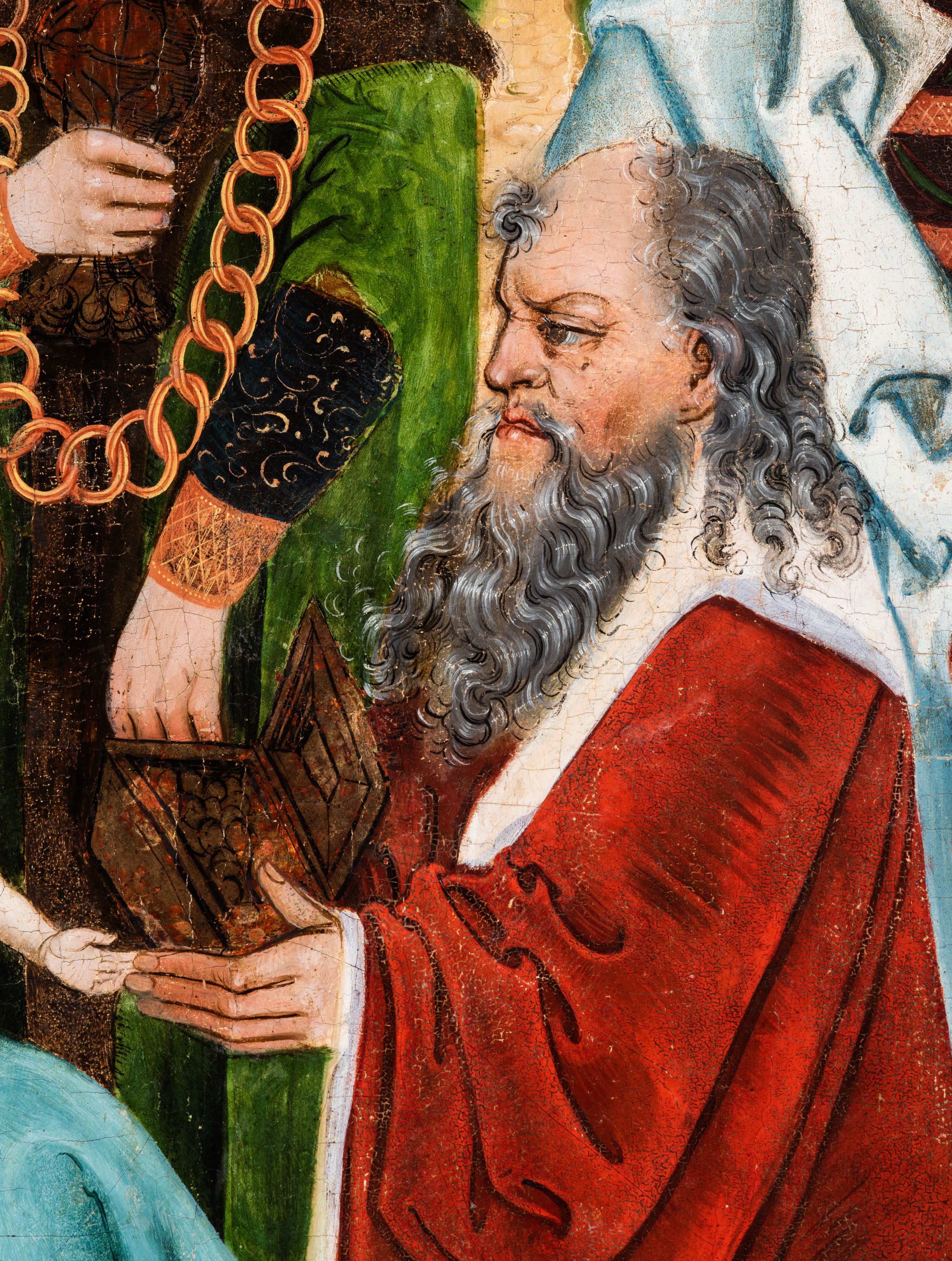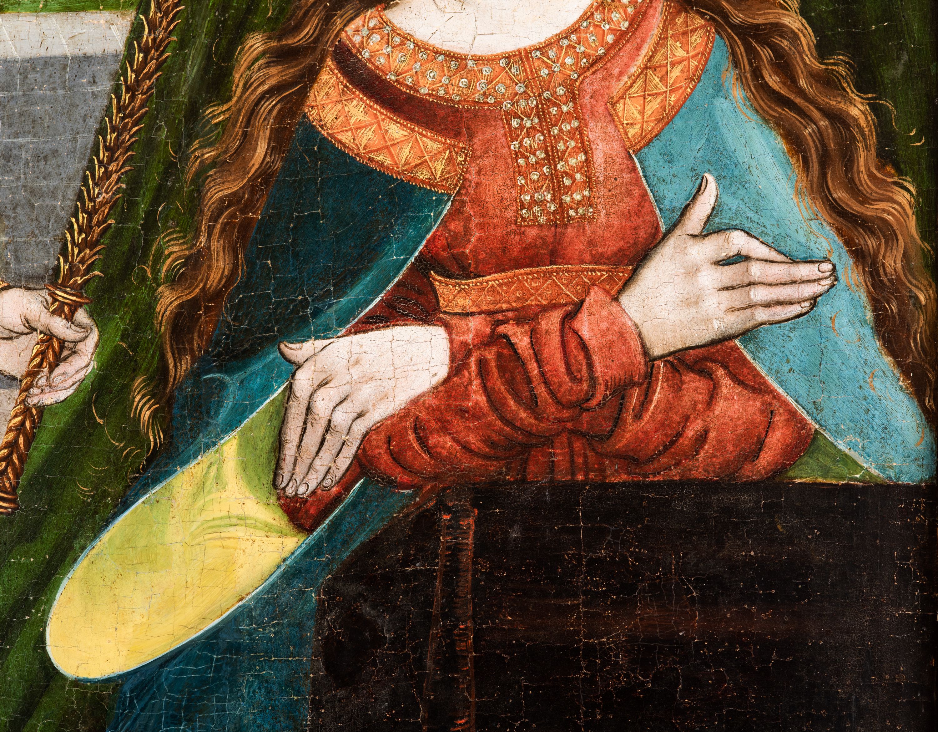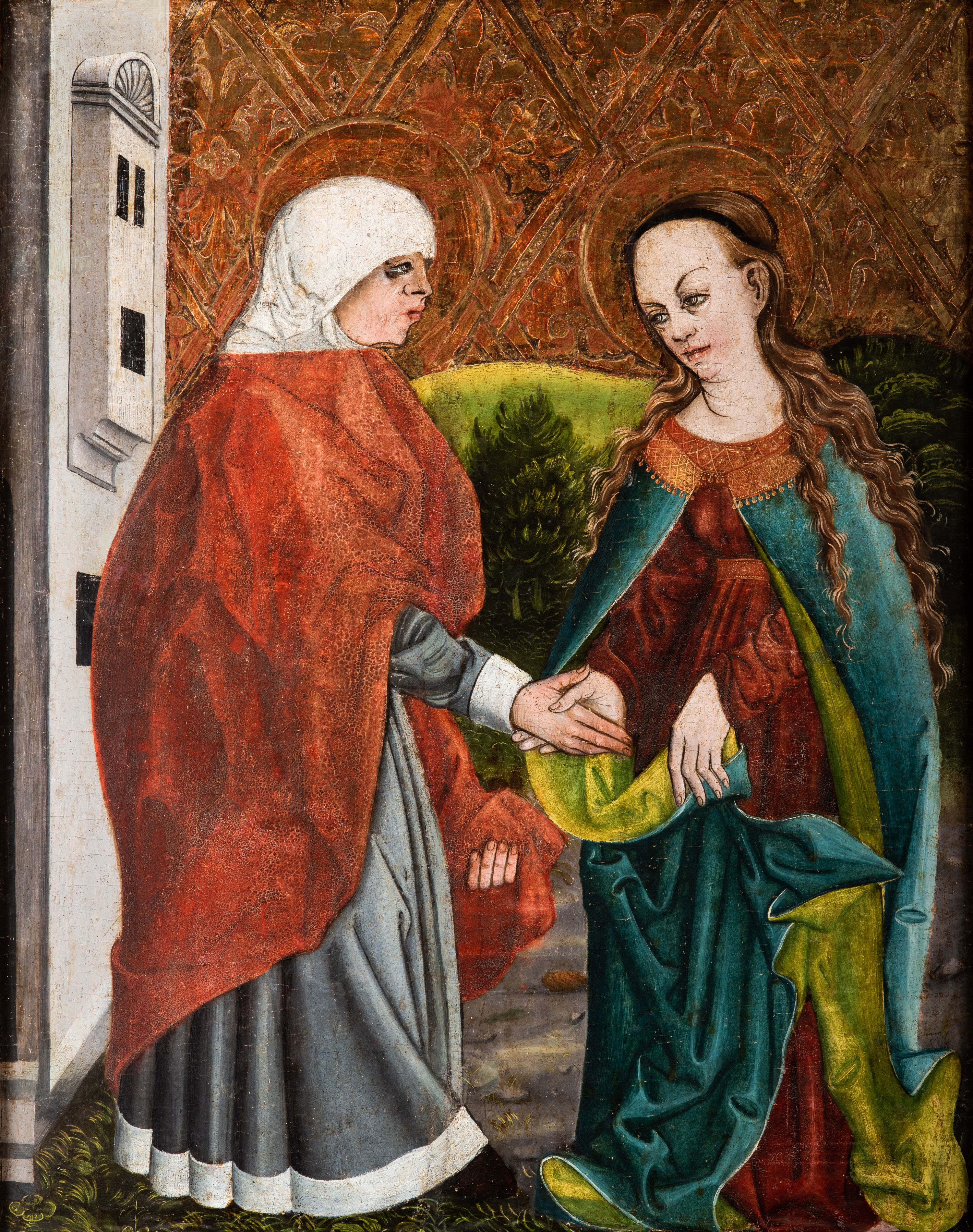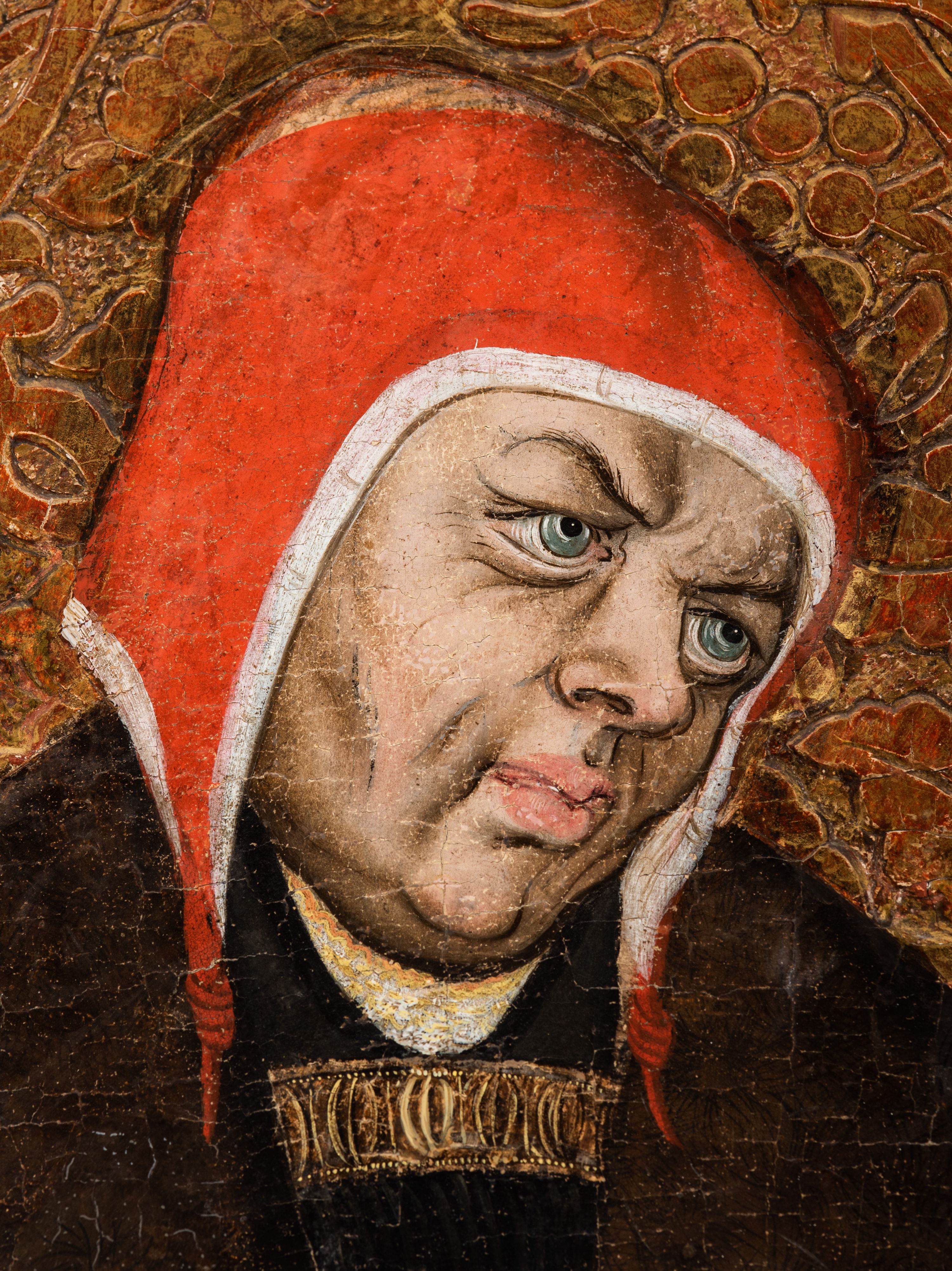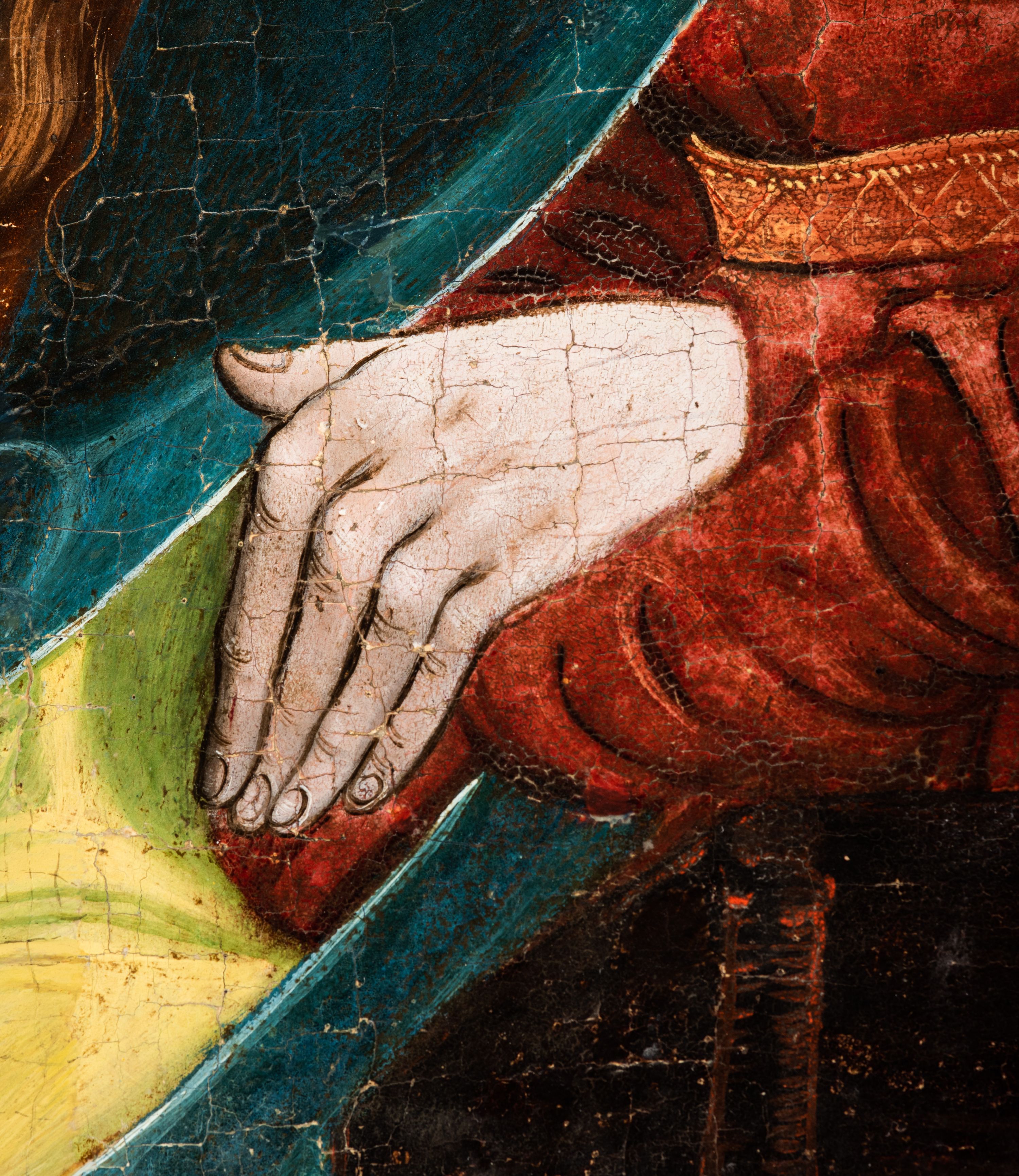 Tryptyk ze sceną Rodziny Marii w polu głównym oraz mniejszymi scenami z życia Najświętszej Marii Panny na rewersie skrzydeł i świętymi na awersie. W polu głównym obraz w formie stojącego prostokąta w drewnianej, profilowanej ramie. W centrum kompozycja przedstawiająca rodzinę Matki Boskiej w ujęciu trójstrefowym. W centrum umieszczona grupa z siedzącymi na kamiennej ławie, wyścielonej zielonym materiałem św. Annę z Dzieciątkiem Jezus oraz Matkę Boską. Obie zwrócone trzy czwarte ku środkowi. Święta Anna dwoma wyciągniętymi przed siebie rękami przytrzymuje stojące na jej kolanach Dzieciątko. Ma szeroką twarz z małymi ustami i dużymi oczami. Ubrana jest w brązową suknię z długimi rękawami oraz czerwony płaszcz z zieloną podszewką, na głowie biały welon w podwiką. Dzieciątko zwrócone jest trzy czwarte w lewo, w lewej dłoni trzyma jabłko, prawą błogosławi. Twarz okrągła o pucułowatych policzkach z wyraźnie zaznaczonym podbródkiem. Włosy krótkie, jasne, kędzierzawe. Matka Boska trzyma na kolanach otwartą księgę, prawą rękę wyciąga do Dzieciątka. Ubrana jest w brązową suknię z długimi rękawami, niebieski płaszcz. Głowę okalają bardzo długie, bujne włosy, opadające falami na ramiona i podwiązane wąska opaską. Wszyscy mają wokół głów złote i tłoczone nimby. U dołu obrazu siedzą z dziećmi: Maria Salome oraz Maria Kleofasowa. Jedna z kobiet karmi piersią niemowlę (św. Jan Ewangelista), obok siedzi mały św. Jakub Większy, druga uczy czytać dwójkę dzieci (zapewne św. Jakub Mniejszy i św. Juda Tadeusz). Kobiety ubrane w obszerne suknie: zieloną i czerwoną, na głowach mają założone białe czepce. Po prawej stronie obrazu miniaturowa postać fundatora ze złożonymi dłońmi. W górnej części kompozycji za ławą ukazani w półpostaci czterej mężczyźni, nad postacią św. Anny: Joachim, Kleofas i Salomas, a nad Matką Boską – św. Józef. Tło obrazu złocone i tłoczone w motywy roślinne. Kwatery dwudzielne, w lewej na awersie u dołu scena Nawiedzenia Najświętszej Marii Panny, u góry Zwiastowanie. Na awersie prawego skrzydła u dołu niezachowana scena, a u góry Pokłon Trzech Króli. Na rewersach skrzydeł: po lewej u góry św. Florian i św. Wojciech, niżej św. Stanisław i biskupa bez atrybutu (św. Mikołaj?); na prawym skrzydle u góry św. Bartłomiej i św. Paweł, u dołu brak kwatery.