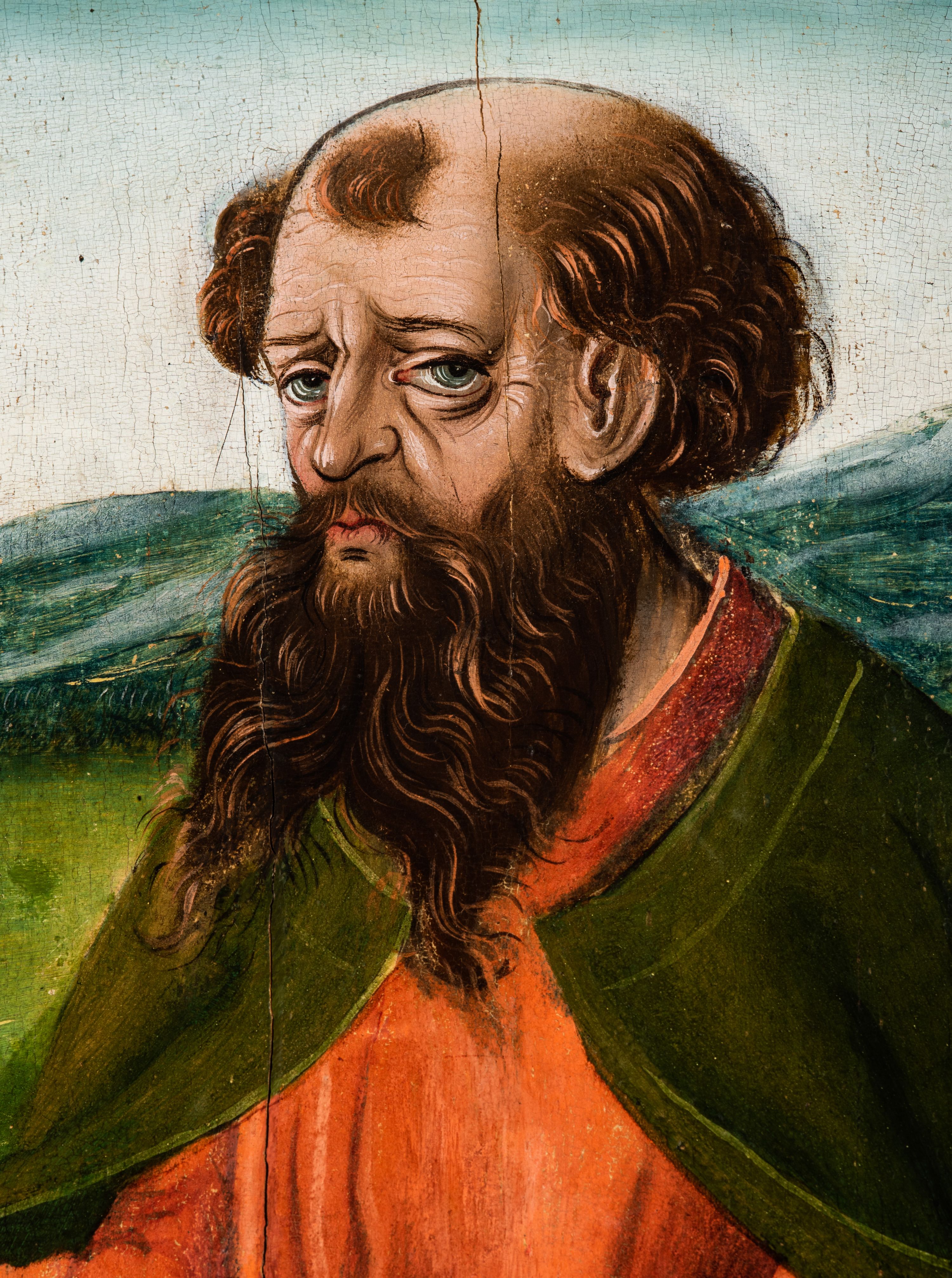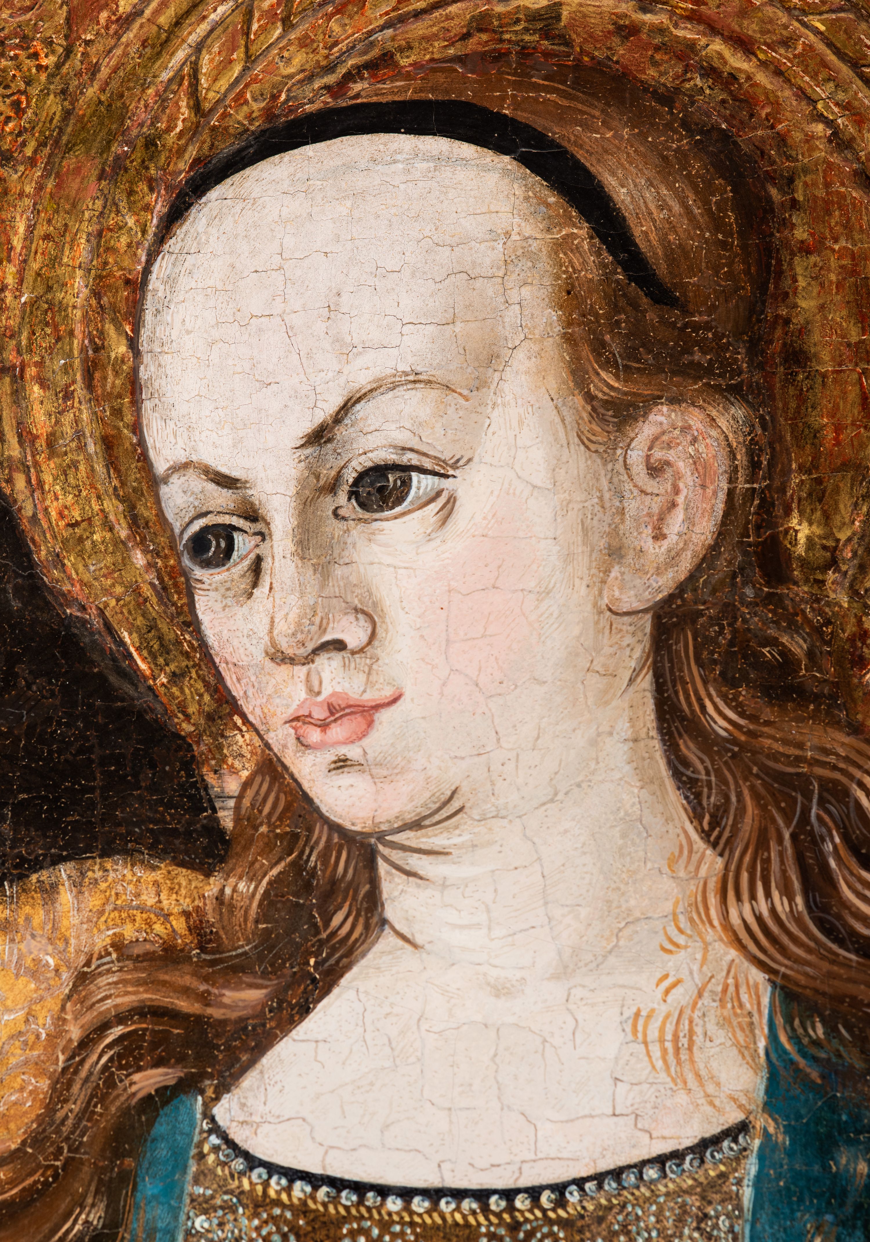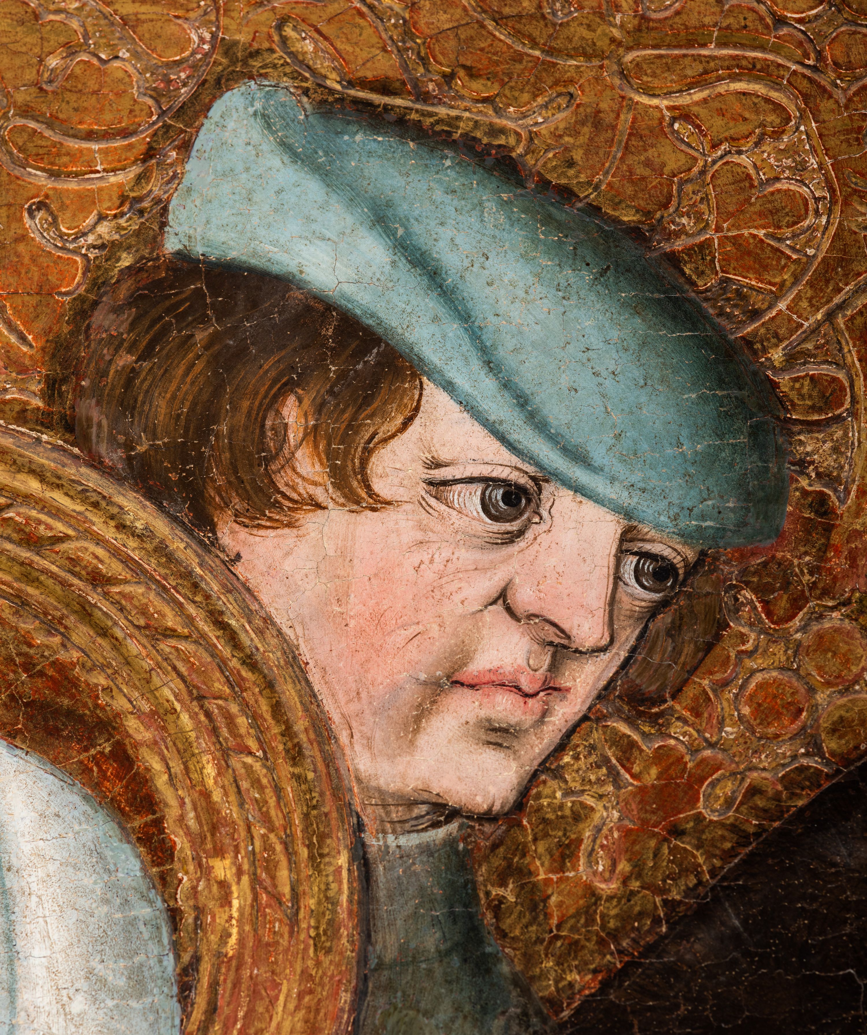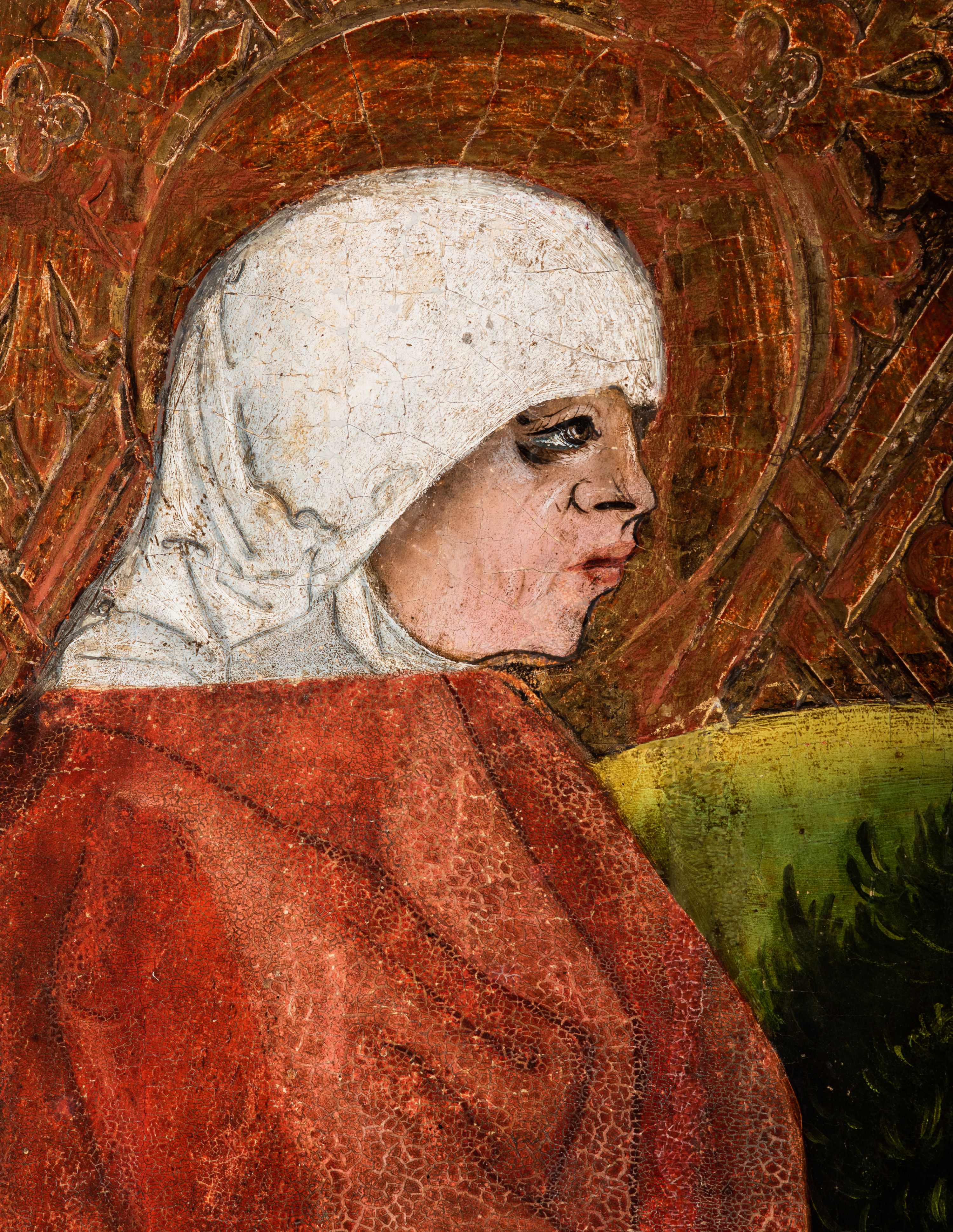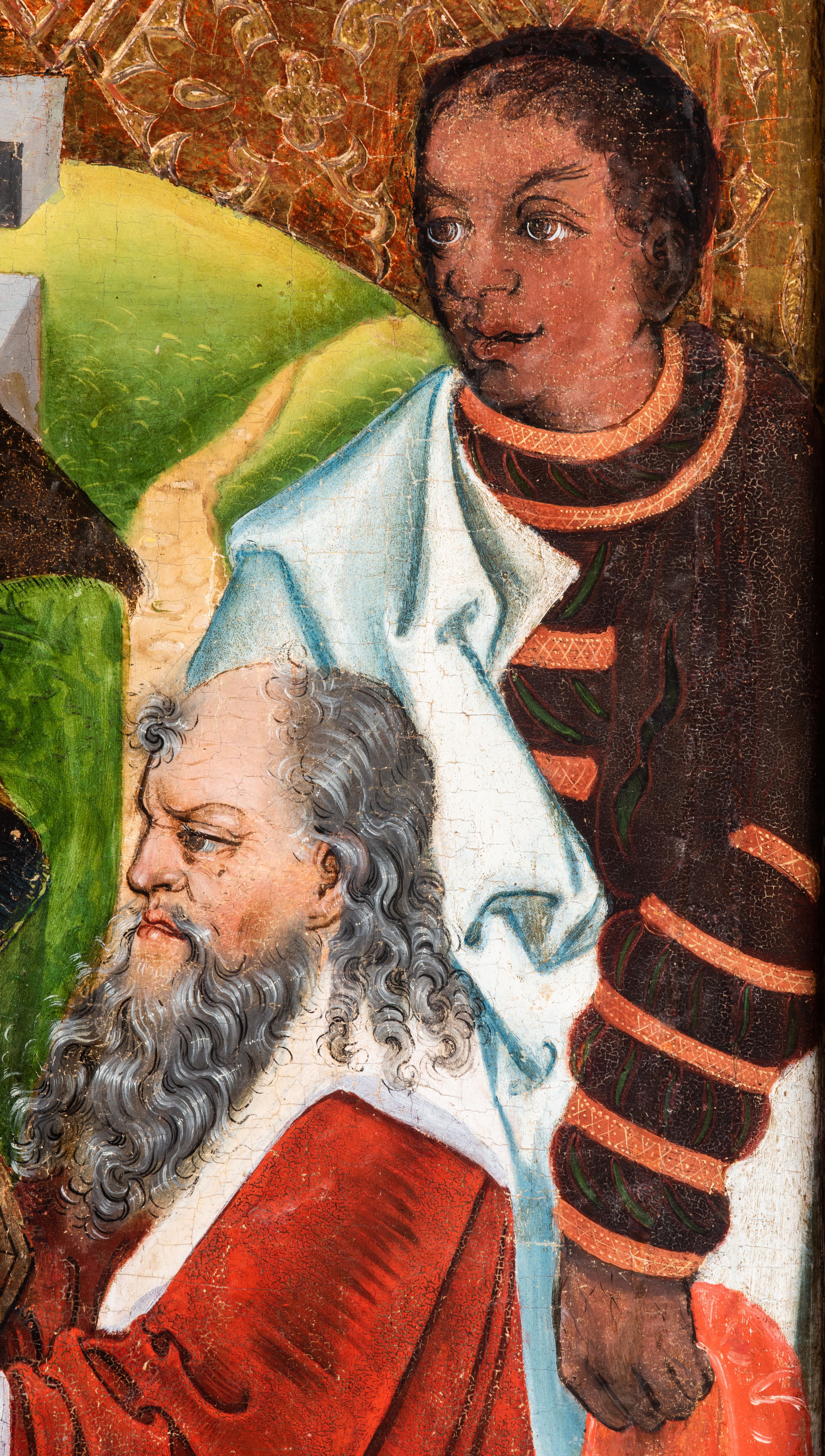Tryptyk ze sceną Rodziny Marii w polu głównym oraz mniejszymi scenami z życia Najświętszej Marii Panny na rewersie skrzydeł i świętymi na awersie. W polu głównym obraz w formie stojącego prostokąta w drewnianej, profilowanej ramie. W centrum kompozycja przedstawiająca rodzinę Matki Boskiej w ujęciu trójstrefowym. W centrum umieszczona grupa z siedzącymi na kamiennej ławie, wyścielonej zielonym materiałem św. Annę z Dzieciątkiem Jezus oraz Matkę Boską. Obie zwrócone trzy czwarte ku środkowi. Święta Anna dwoma wyciągniętymi przed siebie rękami przytrzymuje stojące na jej kolanach Dzieciątko. Ma szeroką twarz z małymi ustami i dużymi oczami. Ubrana jest w brązową suknię z długimi rękawami oraz czerwony płaszcz z zieloną podszewką, na głowie biały welon w podwiką. Dzieciątko zwrócone jest trzy czwarte w lewo, w lewej dłoni trzyma jabłko, prawą błogosławi. Twarz okrągła o pucułowatych policzkach z wyraźnie zaznaczonym podbródkiem. Włosy krótkie, jasne, kędzierzawe. Matka Boska trzyma na kolanach otwartą księgę, prawą rękę wyciąga do Dzieciątka. Ubrana jest w brązową suknię z długimi rękawami, niebieski płaszcz. Głowę okalają bardzo długie, bujne włosy, opadające falami na ramiona i podwiązane wąska opaską. Wszyscy mają wokół głów złote i tłoczone nimby. U dołu obrazu siedzą z dziećmi: Maria Salome oraz Maria Kleofasowa. Jedna z kobiet karmi piersią niemowlę (św. Jan Ewangelista), obok siedzi mały św. Jakub Większy, druga uczy czytać dwójkę dzieci (zapewne św. Jakub Mniejszy i św. Juda Tadeusz). Kobiety ubrane w obszerne suknie: zieloną i czerwoną, na głowach mają założone białe czepce. Po prawej stronie obrazu miniaturowa postać fundatora ze złożonymi dłońmi. W górnej części kompozycji za ławą ukazani w półpostaci czterej mężczyźni, nad postacią św. Anny: Joachim, Kleofas i Salomas, a nad Matką Boską – św. Józef. Tło obrazu złocone i tłoczone w motywy roślinne. Kwatery dwudzielne, w lewej na awersie u dołu scena Nawiedzenia Najświętszej Marii Panny, u góry Zwiastowanie. Na awersie prawego skrzydła u dołu niezachowana scena, a u góry Pokłon Trzech Króli. Na rewersach skrzydeł: po lewej u góry św. Florian i św. Wojciech, niżej św. Stanisław i biskupa bez atrybutu (św. Mikołaj?); na prawym skrzydle u góry św. Bartłomiej i św. Paweł, u dołu brak kwatery.