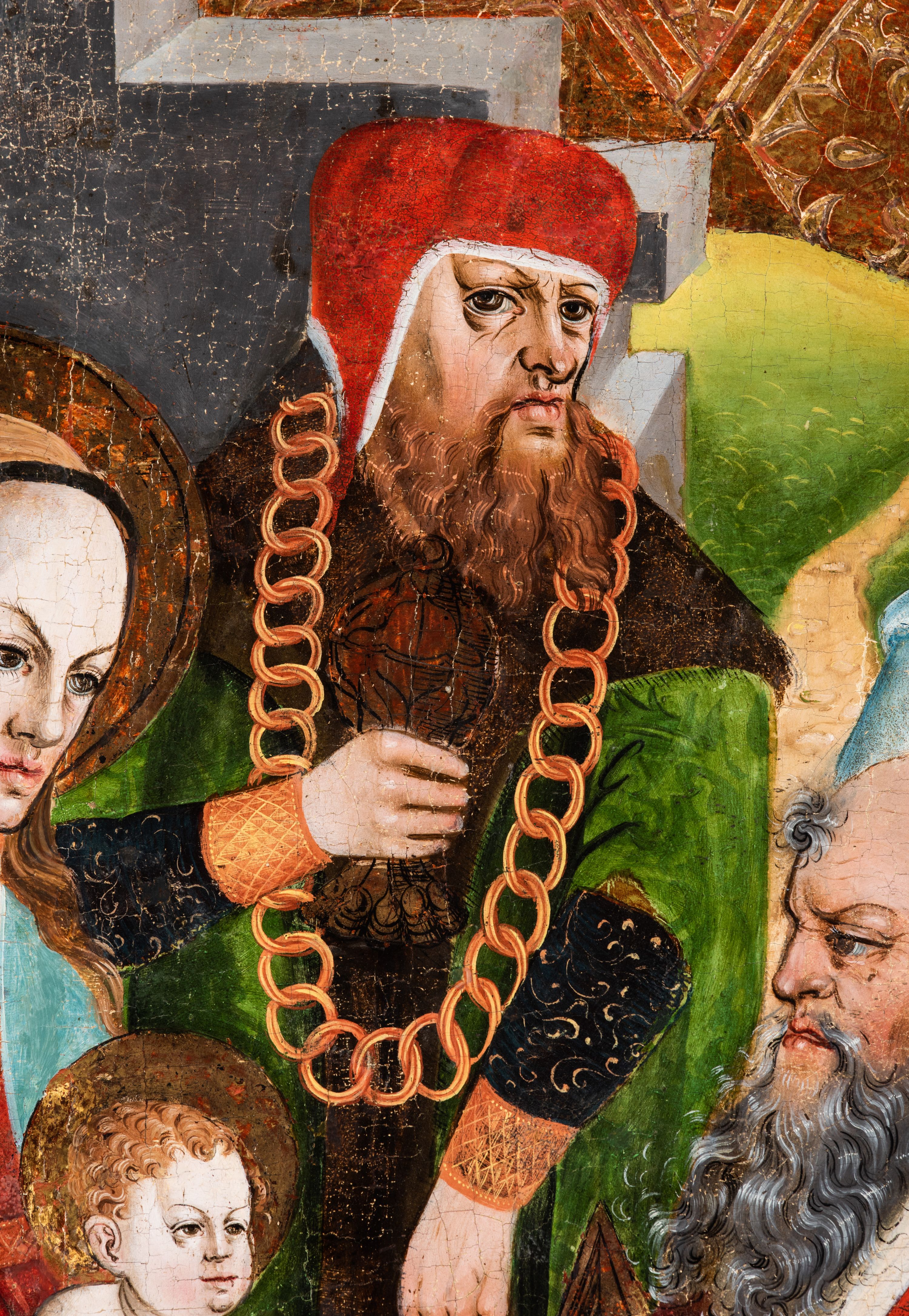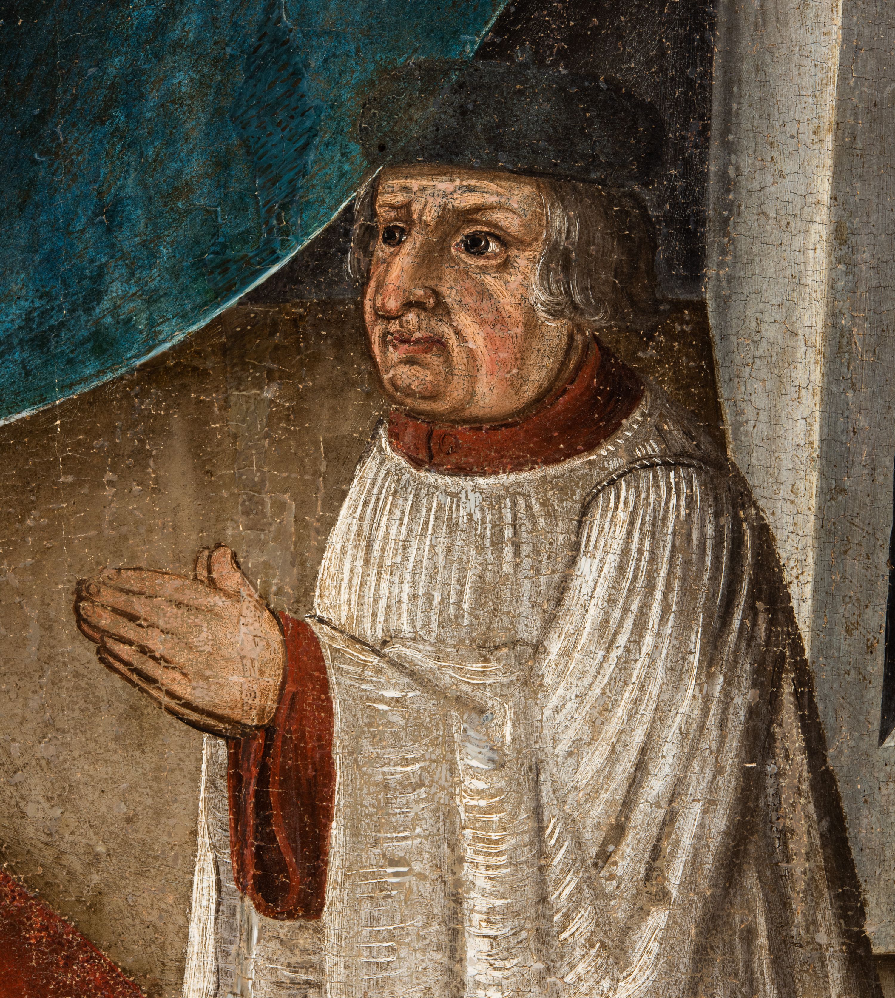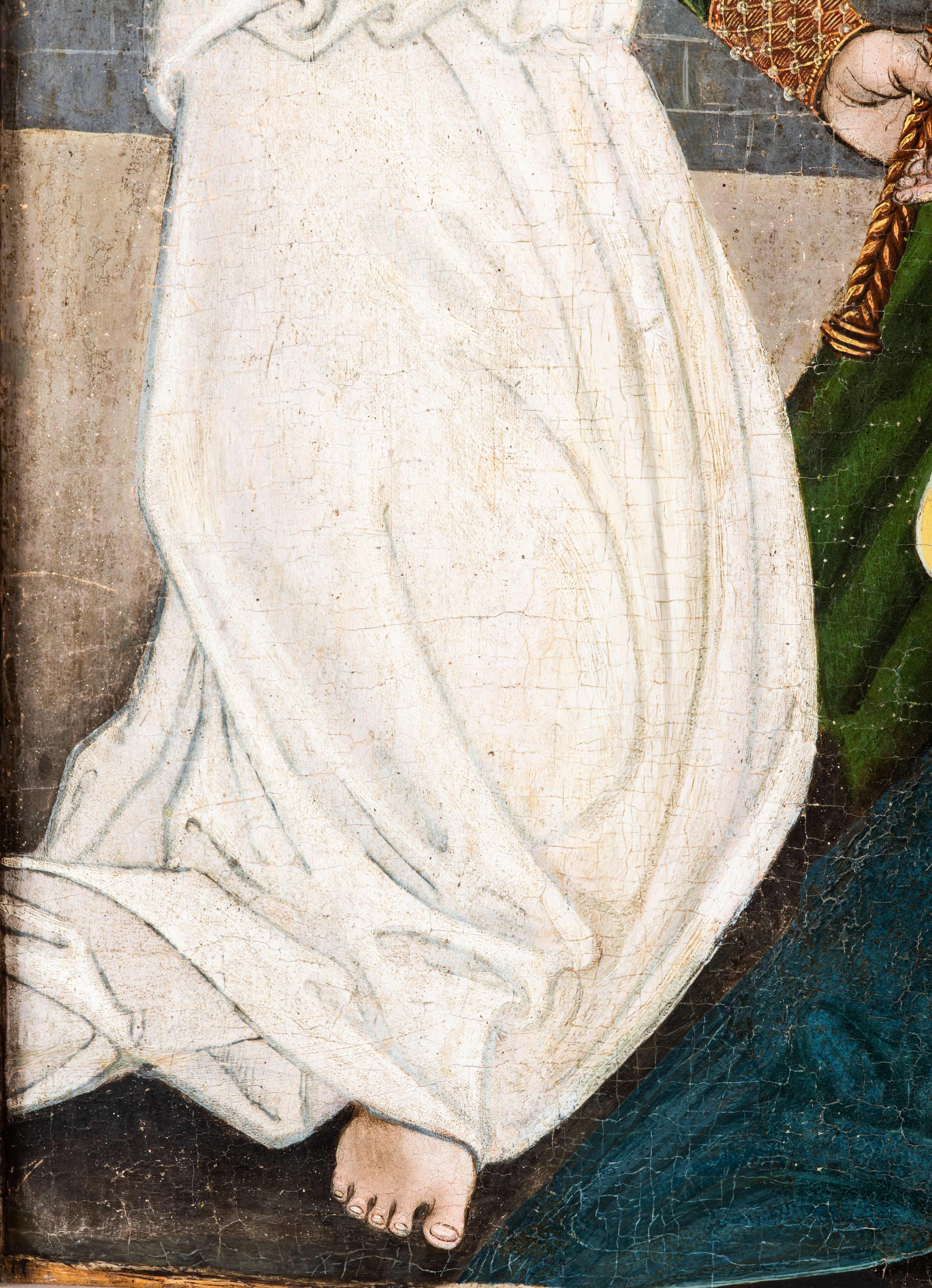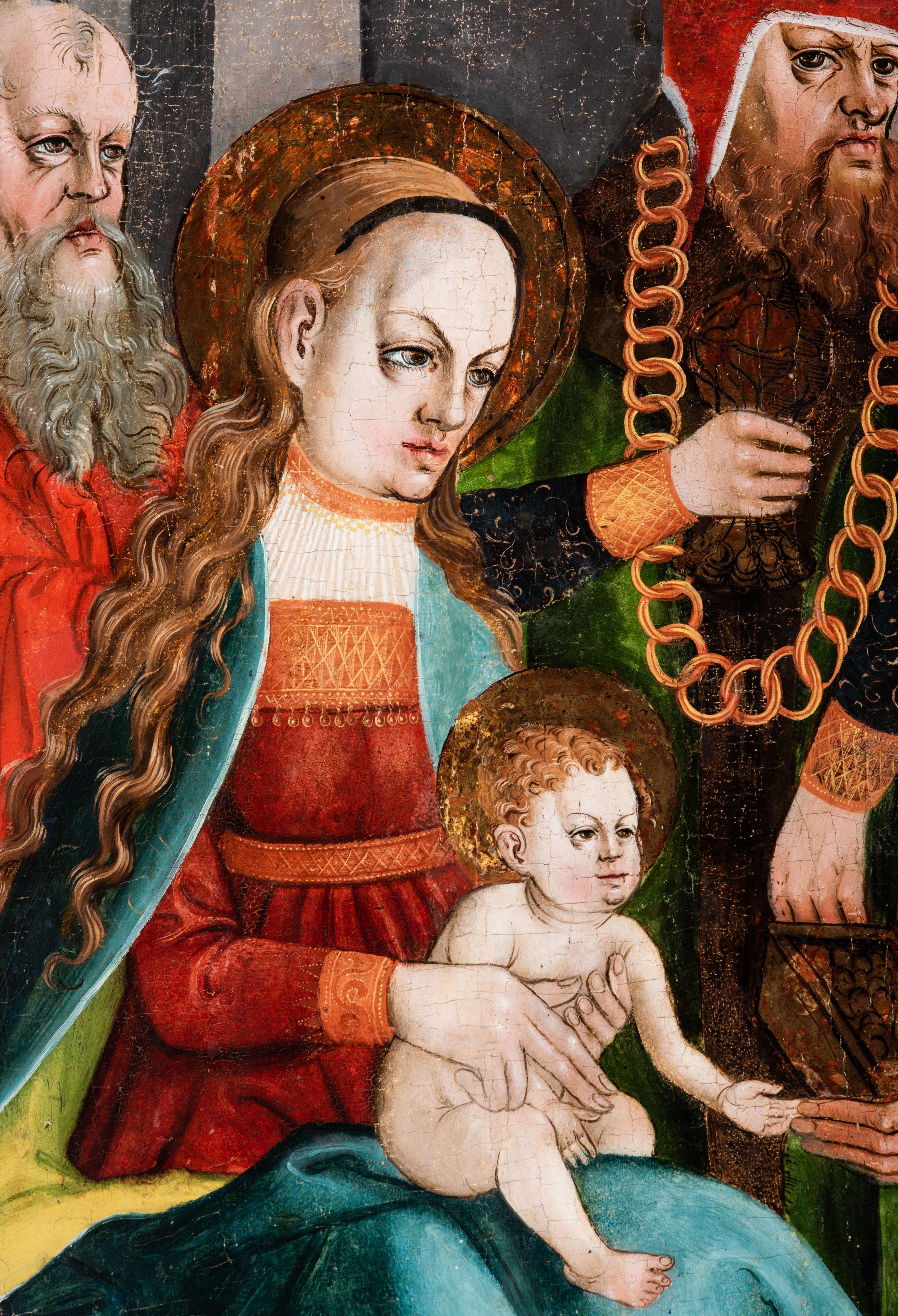 Obraz pochodzi z kościoła Narodzenia Najświętszej Marii Panny w Racławicach Olkuskich, gdzie najprawdopodobniej został przeniesiony w czasach nowożytnych. Fundator umieszczony w prawym narożu nosi strój kanonika. Wszystkie elementy były poddane konserwacji w latach 1955-1957 w Krakowie. Ponownie konserwowany w Pracowni Konserwatorskiej Muzeum Archidiecezjalnego w Krakowie w 1994 roku.