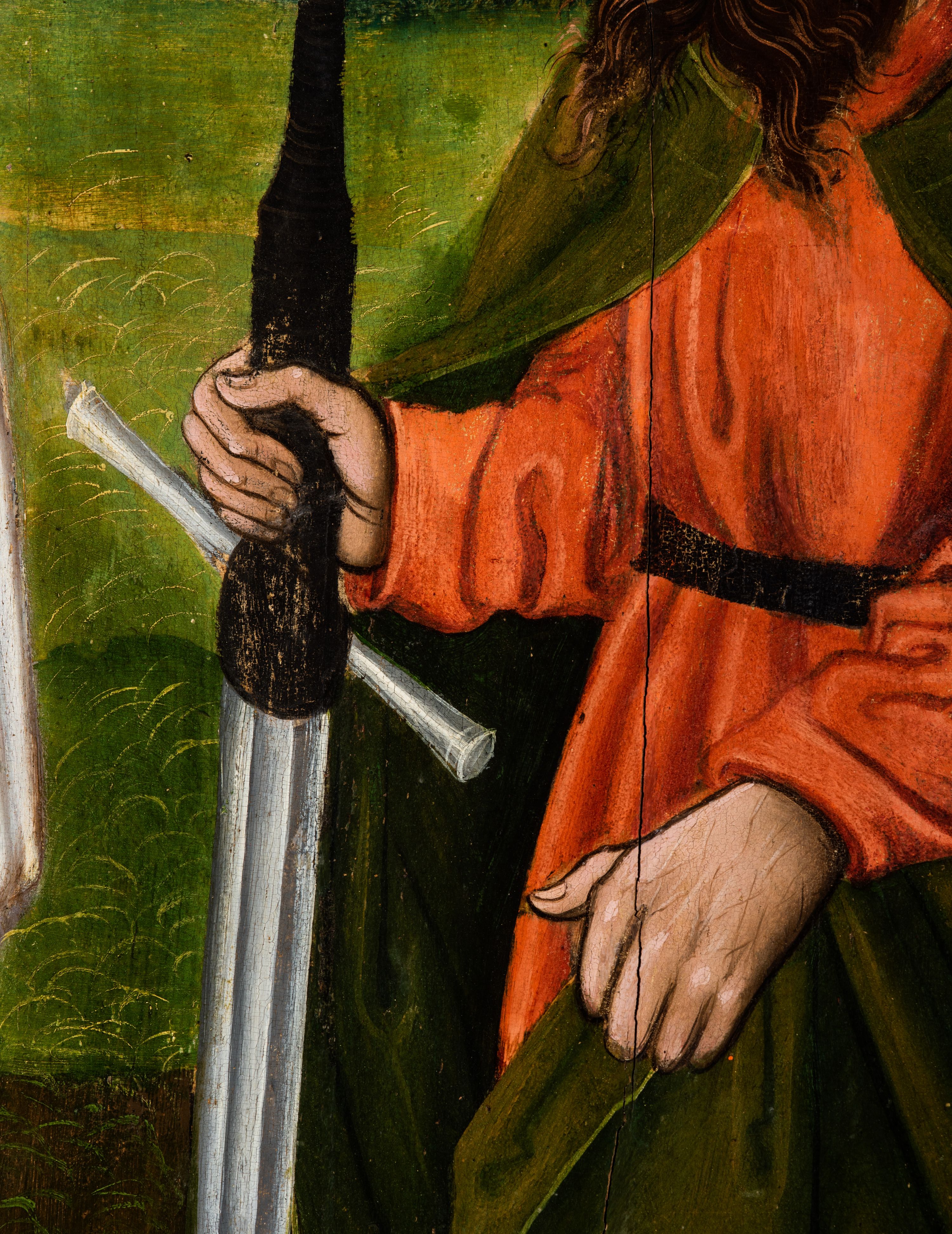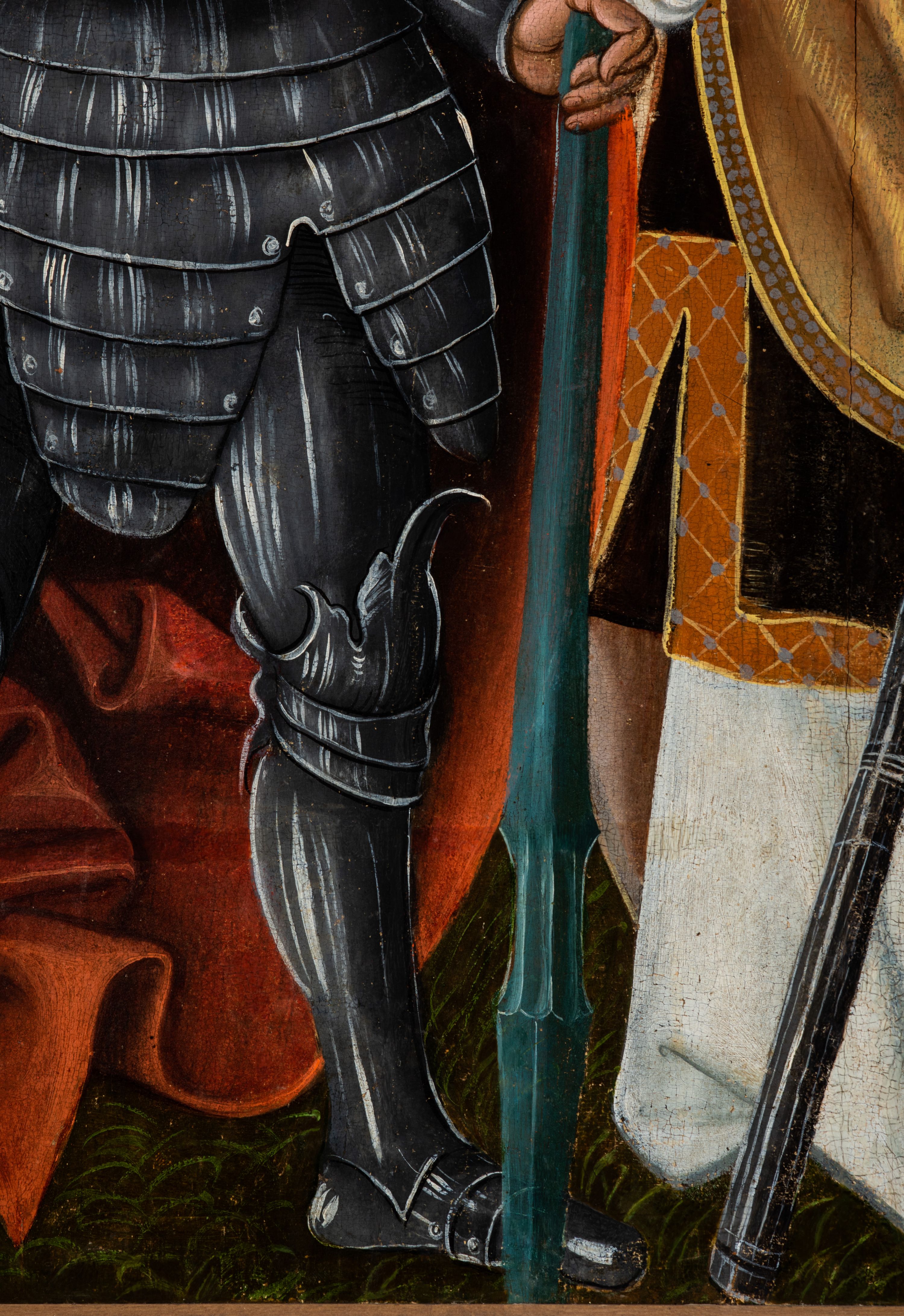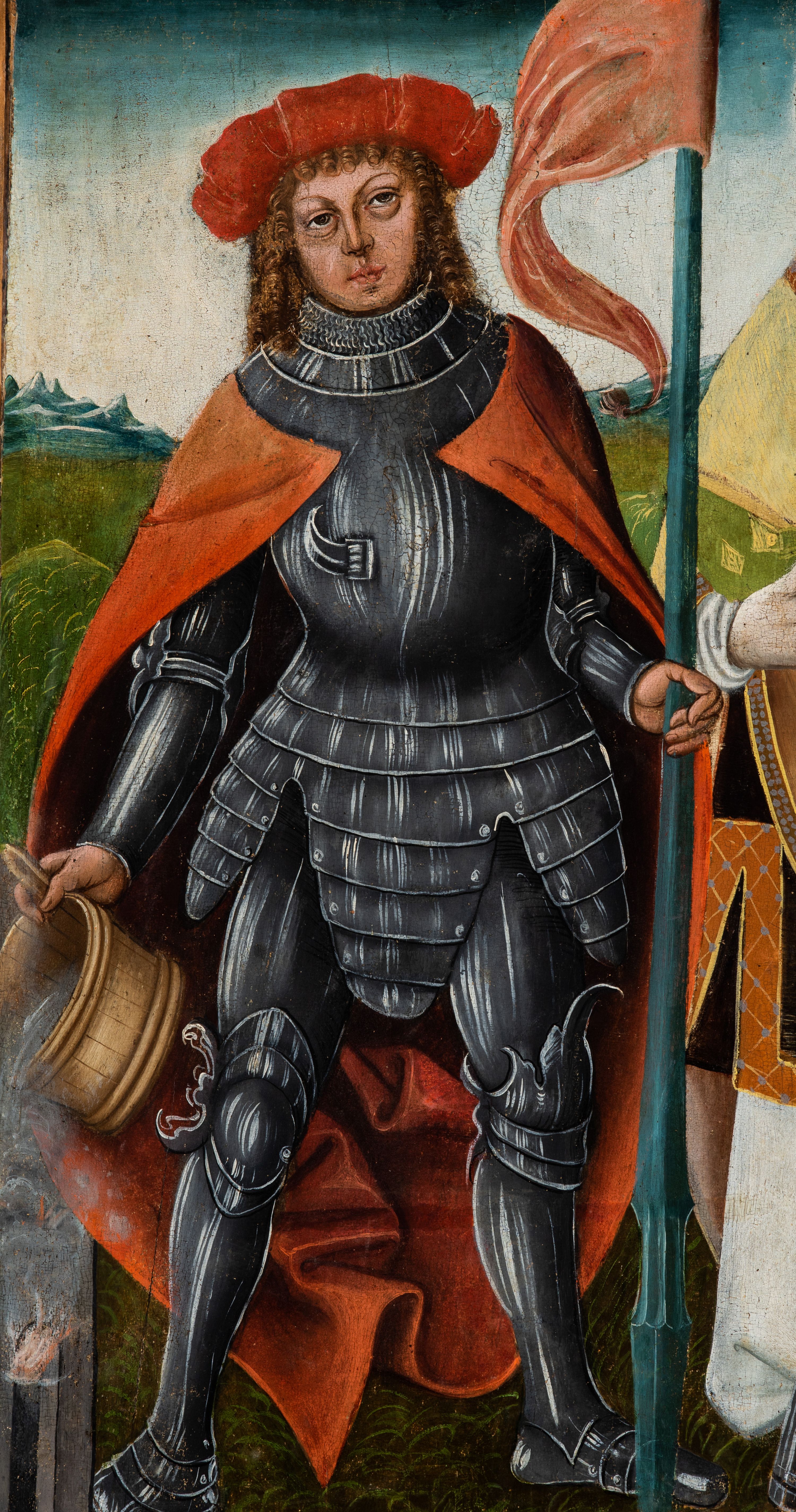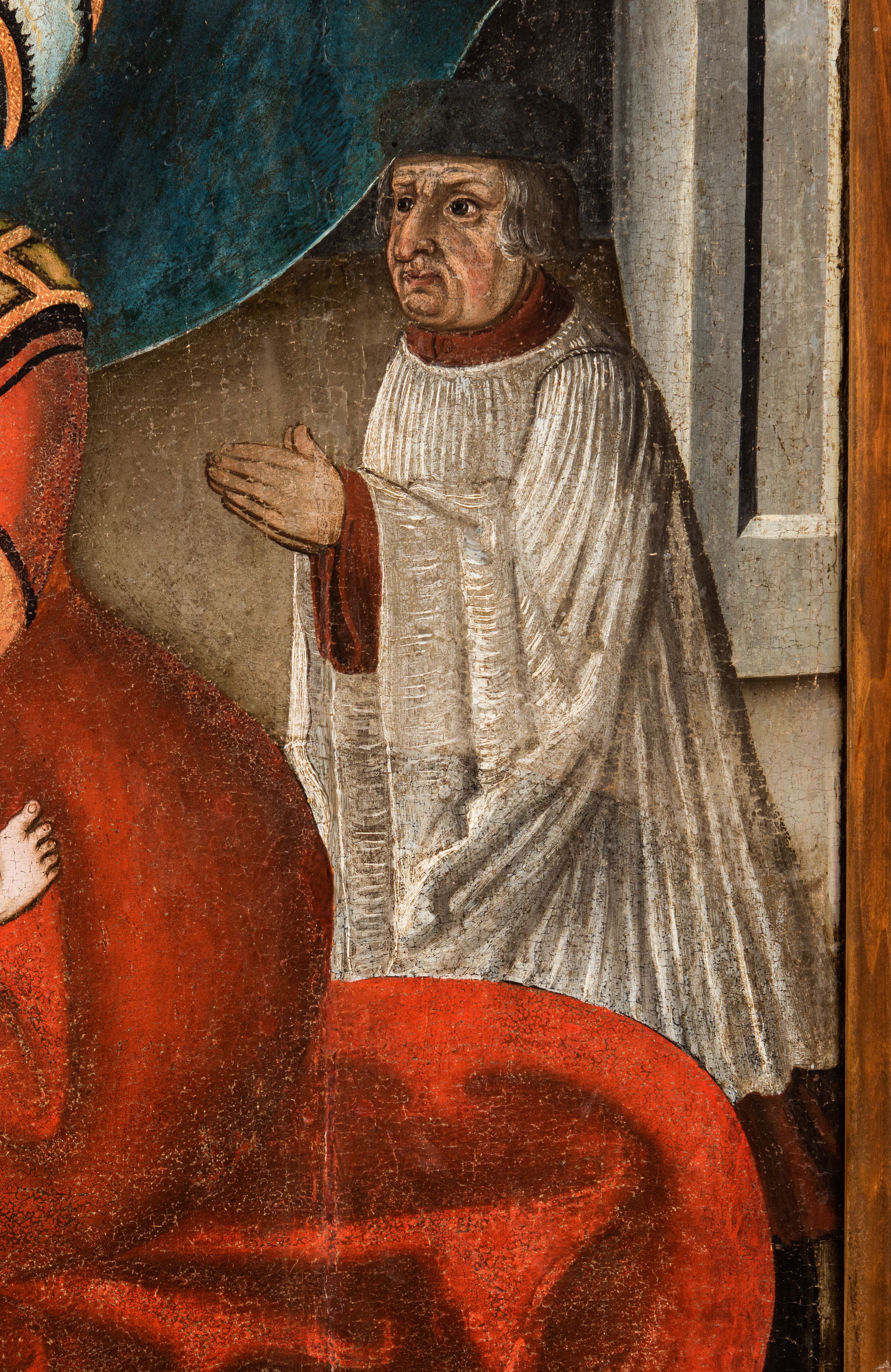 Obraz pochodzi z kościoła Narodzenia Najświętszej Marii Panny w Racławicach Olkuskich, gdzie najprawdopodobniej został przeniesiony w czasach nowożytnych. Fundator umieszczony w prawym narożu nosi strój kanonika. Wszystkie elementy były poddane konserwacji w latach 1955-1957 w Krakowie. Ponownie konserwowany w Pracowni Konserwatorskiej Muzeum Archidiecezjalnego w Krakowie w 1994 roku.