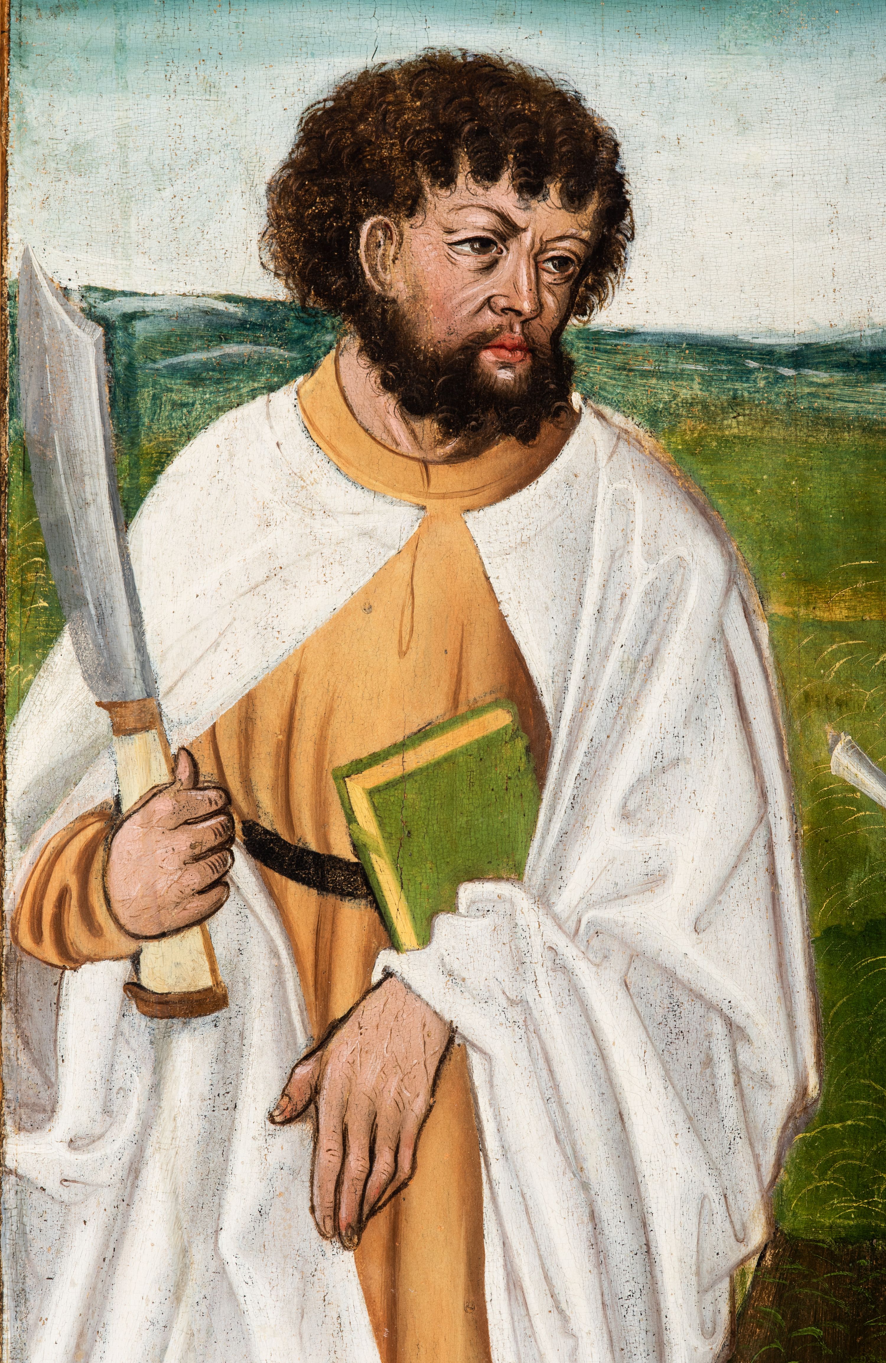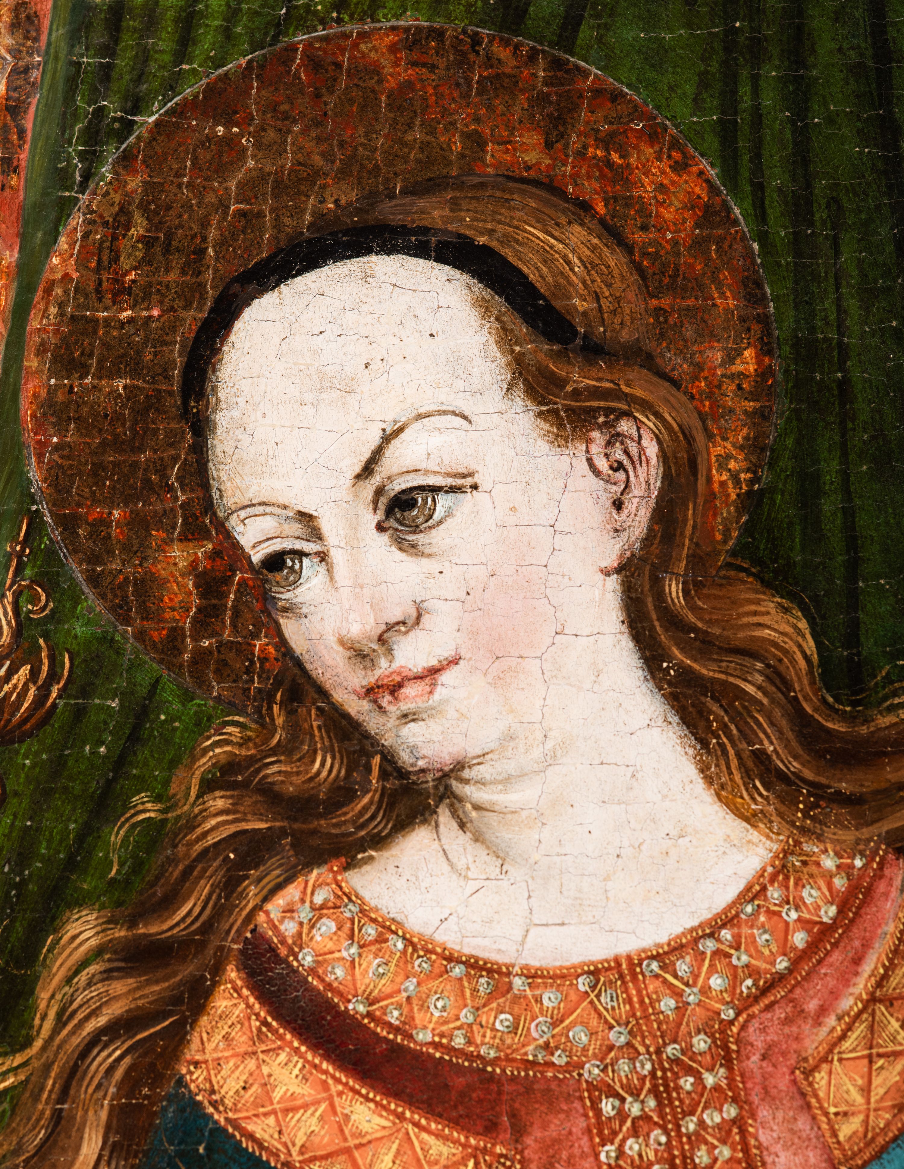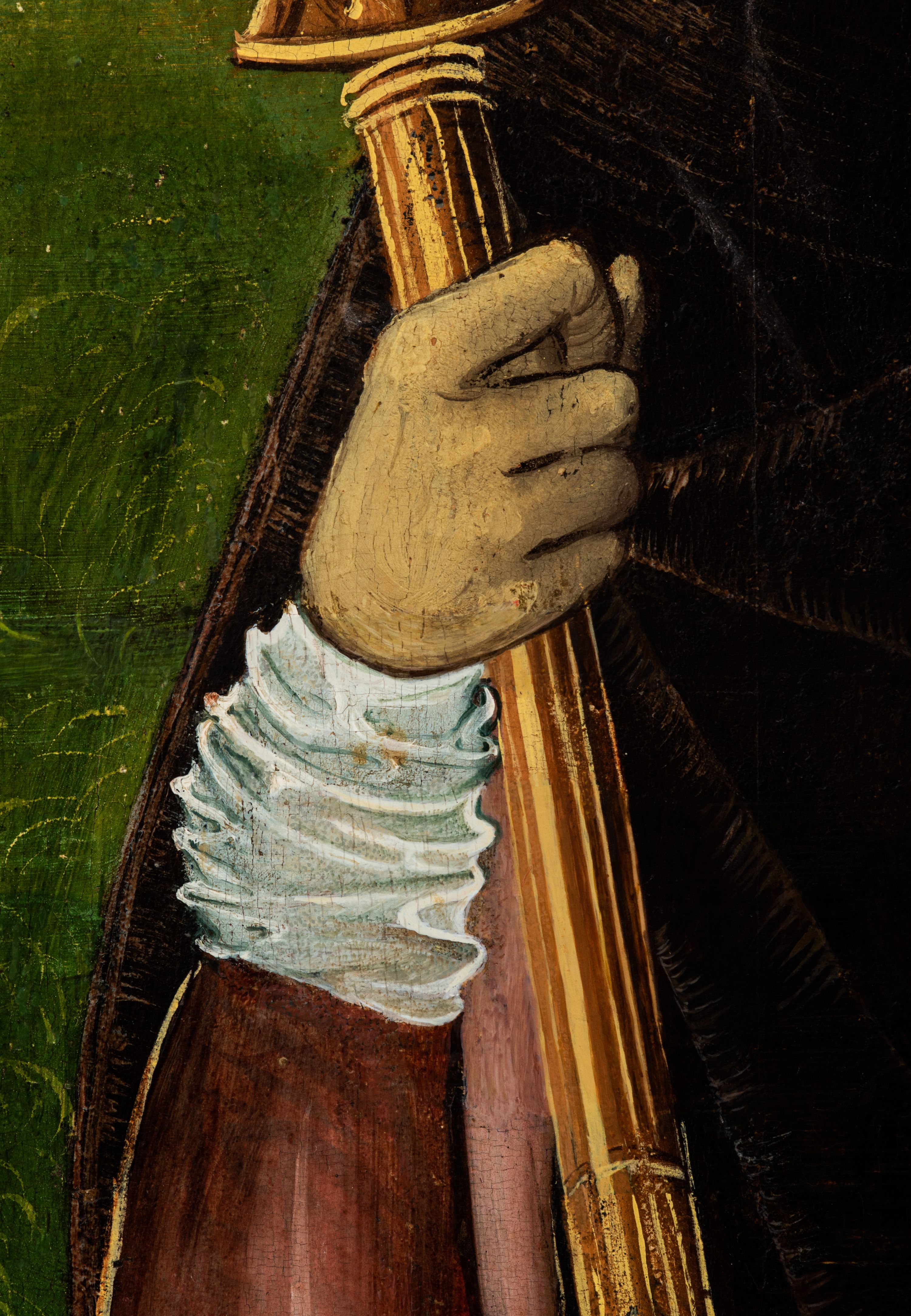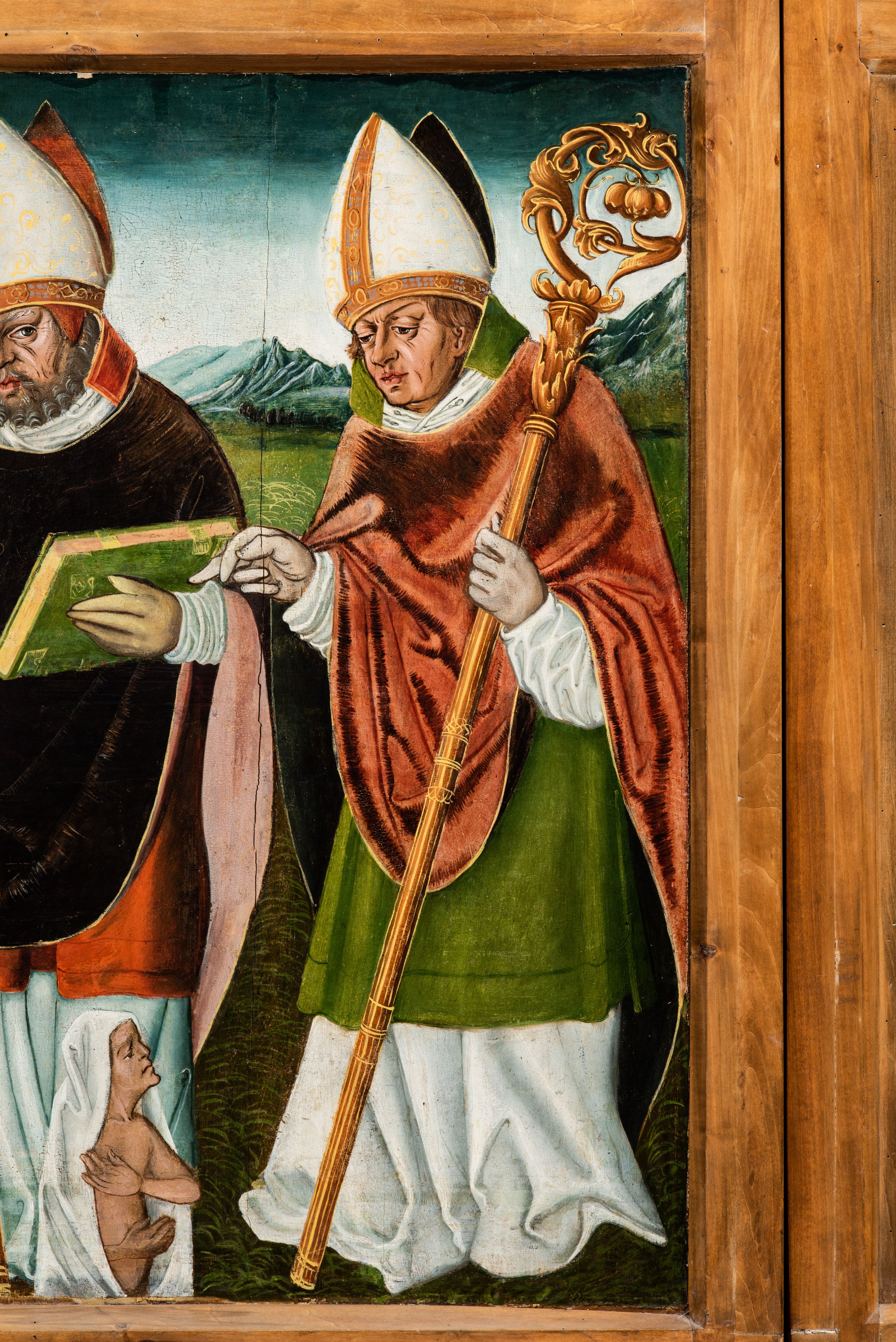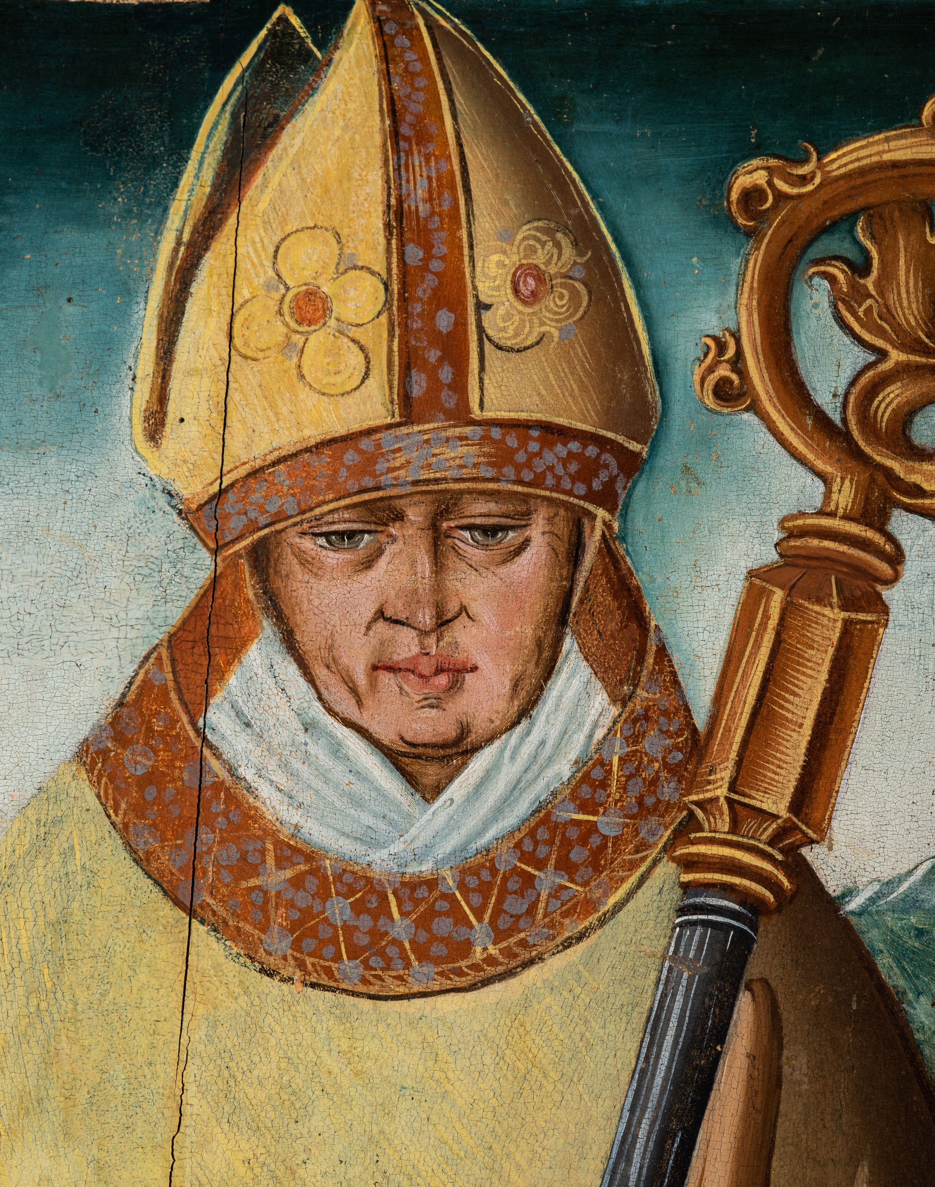 Obraz pochodzi z kościoła Narodzenia Najświętszej Marii Panny w Racławicach Olkuskich, gdzie najprawdopodobniej został przeniesiony w czasach nowożytnych. Fundator umieszczony w prawym narożu nosi strój kanonika. Wszystkie elementy były poddane konserwacji w latach 1955-1957 w Krakowie. Ponownie konserwowany w Pracowni Konserwatorskiej Muzeum Archidiecezjalnego w Krakowie w 1994 roku.