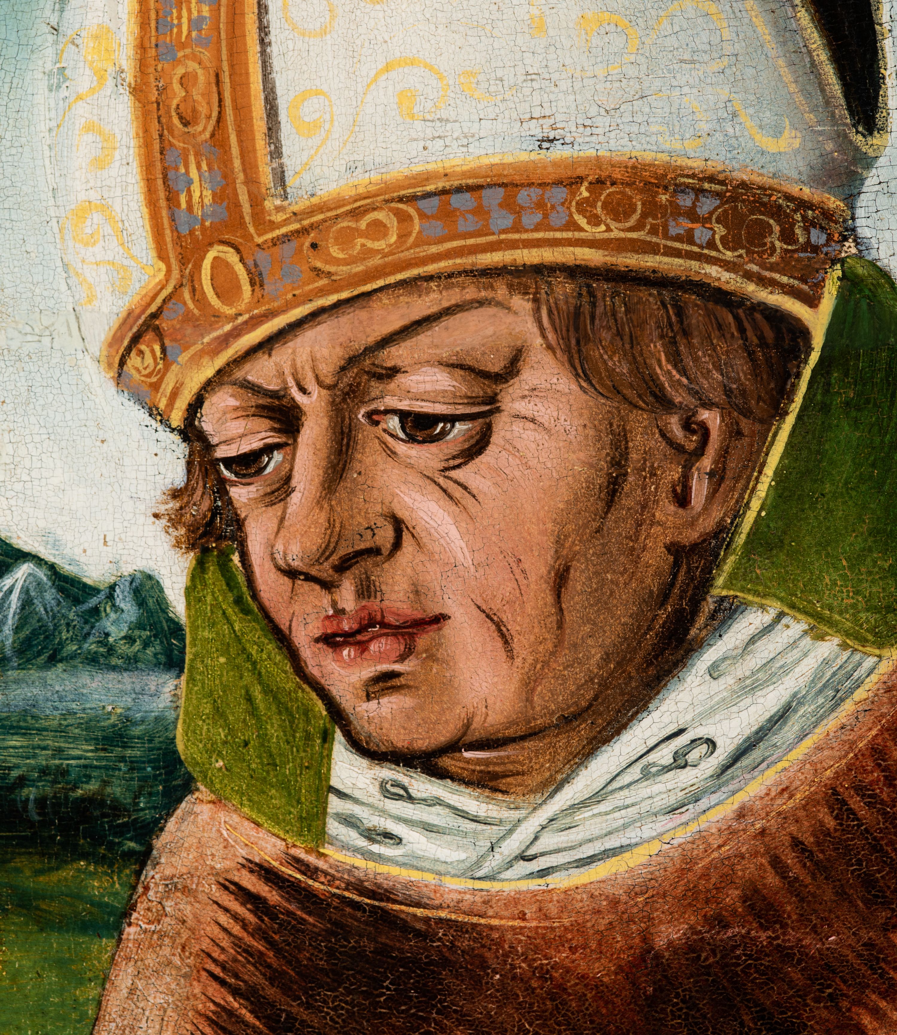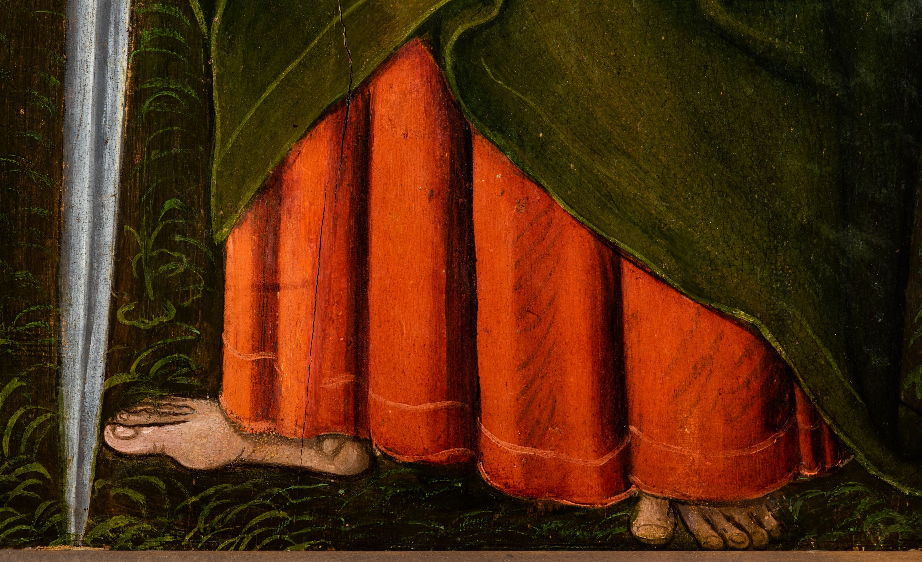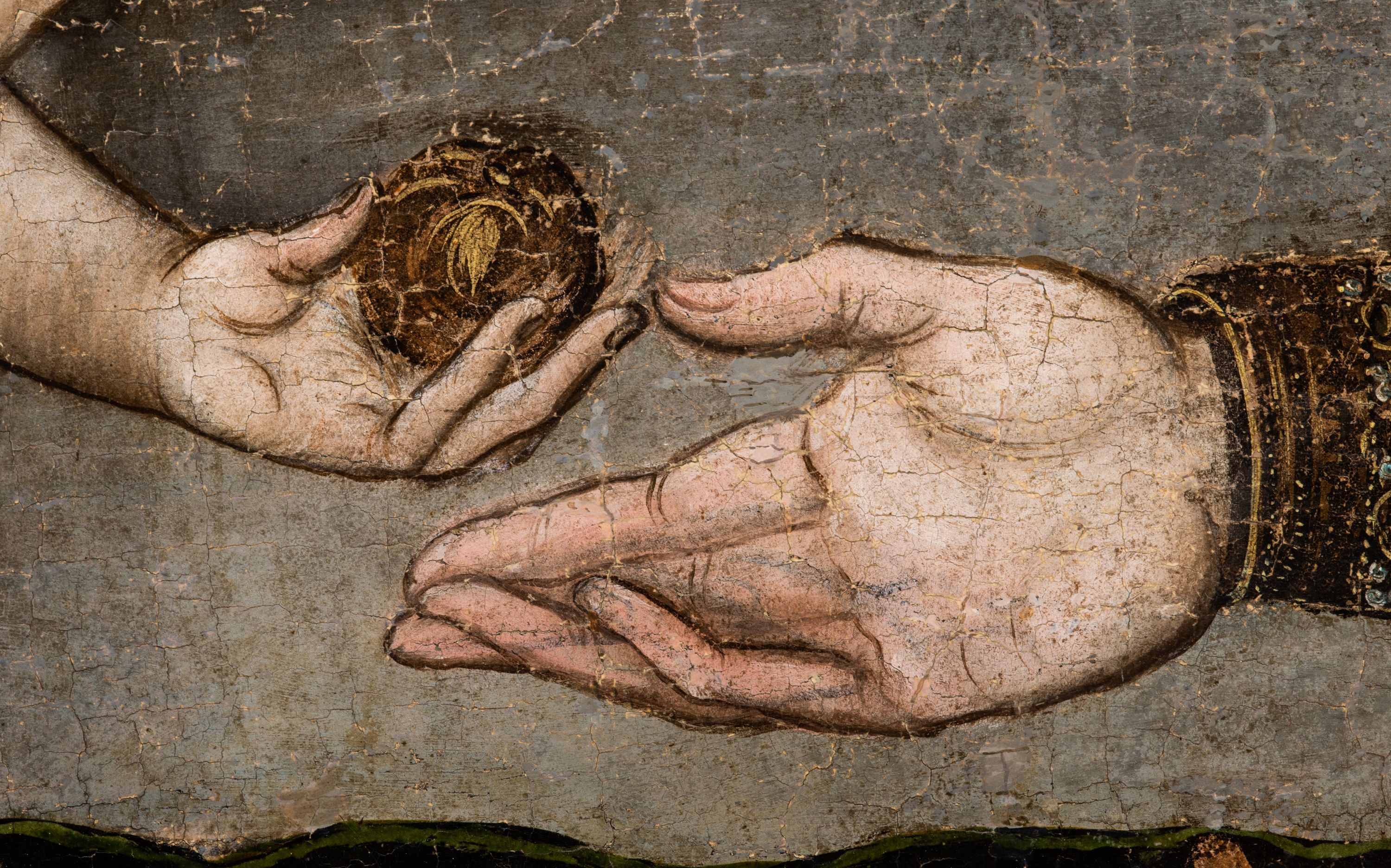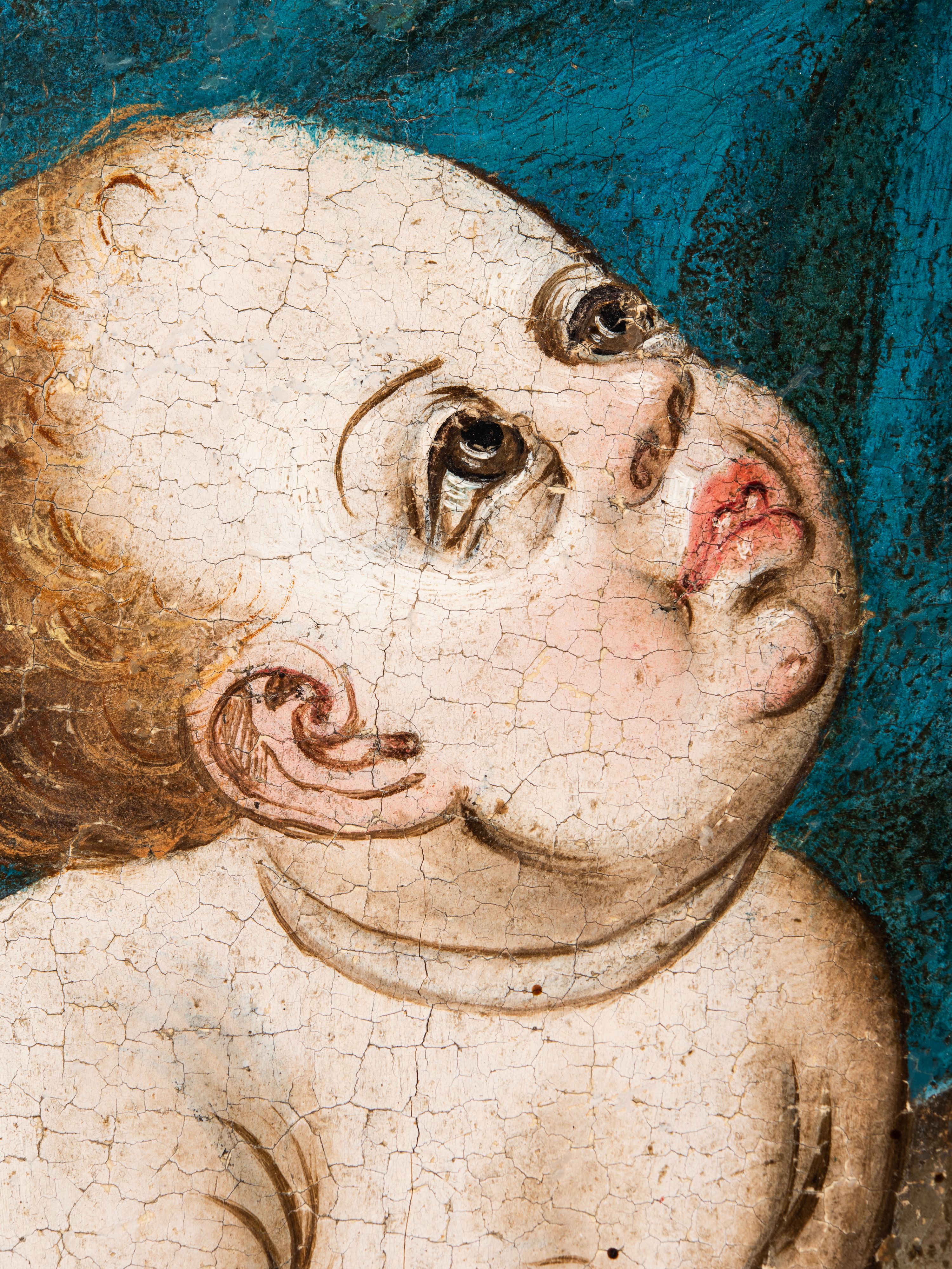 Obraz pochodzi z kościoła Narodzenia Najświętszej Marii Panny w Racławicach Olkuskich, gdzie najprawdopodobniej został przeniesiony w czasach nowożytnych. Fundator umieszczony w prawym narożu nosi strój kanonika. Wszystkie elementy były poddane konserwacji w latach 1955-1957 w Krakowie. Ponownie konserwowany w Pracowni Konserwatorskiej Muzeum Archidiecezjalnego w Krakowie w 1994 roku.