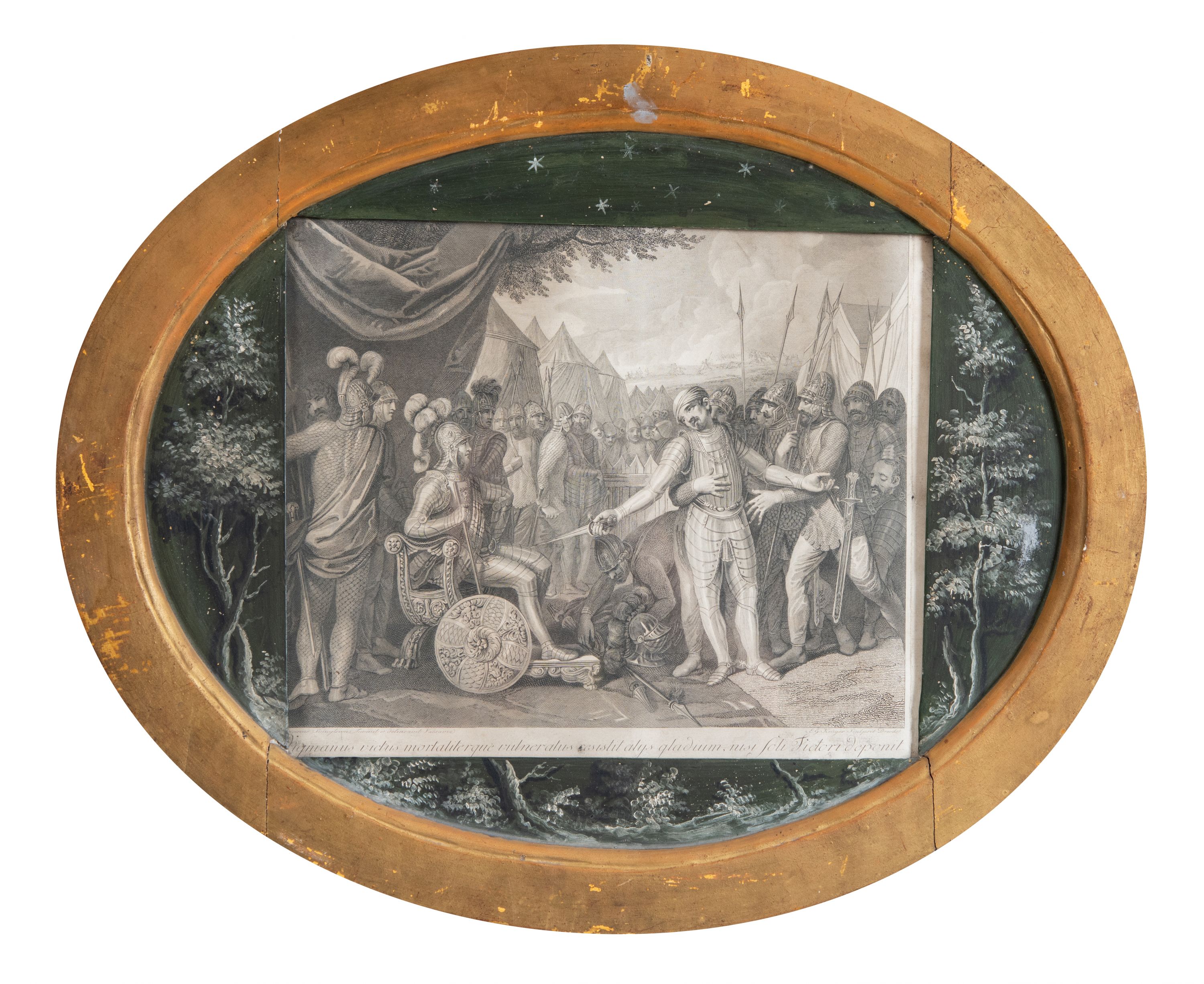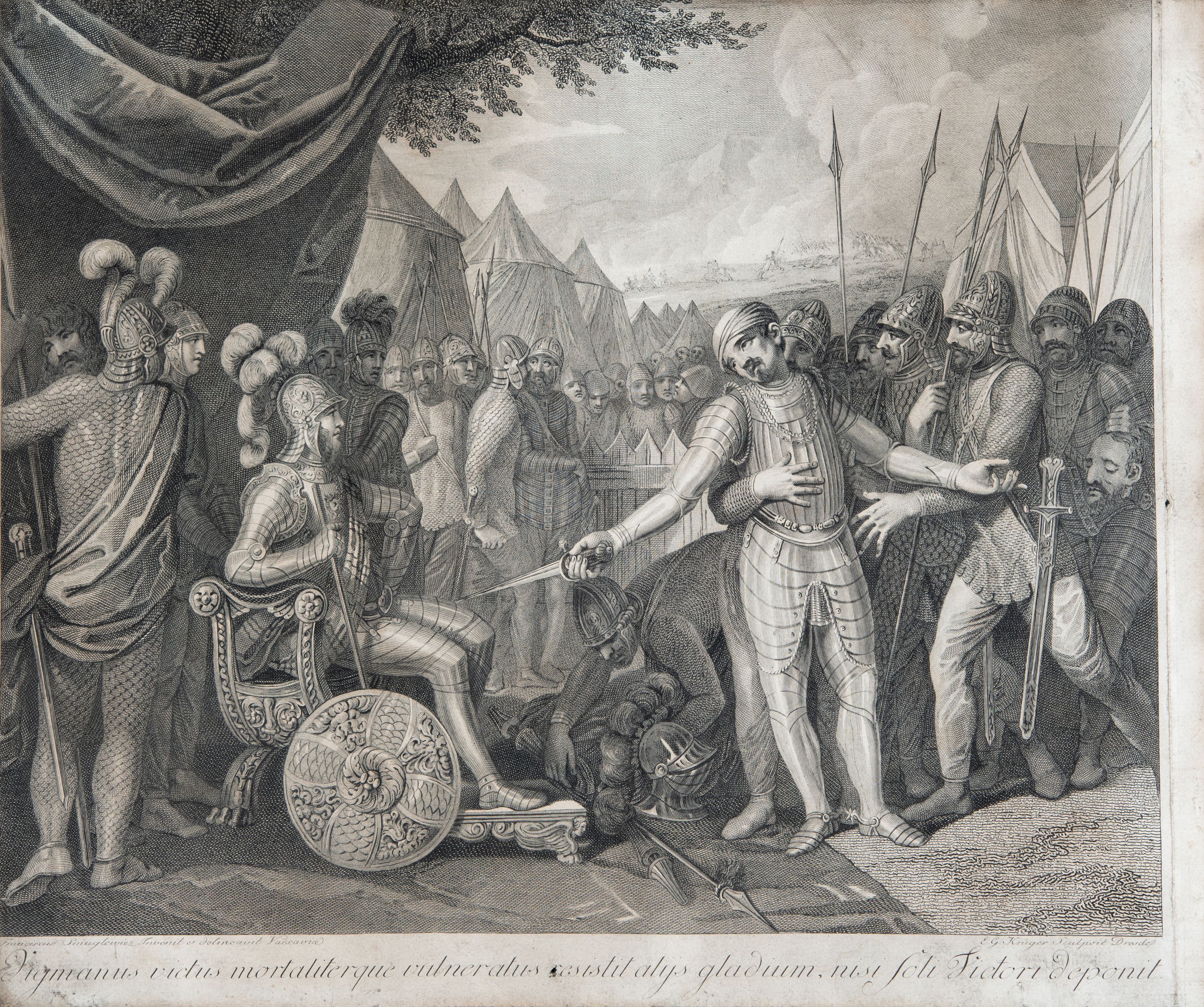 U dołu: "Franciscus Smuglewicz Invenit et delineavit Varsavia", "E. G. Krüger Sculpvit Dresden" oraz "Jigmanus (?) victus mortaliterque vulneratus resistit alys gladum, nisi soli Victori deponit"