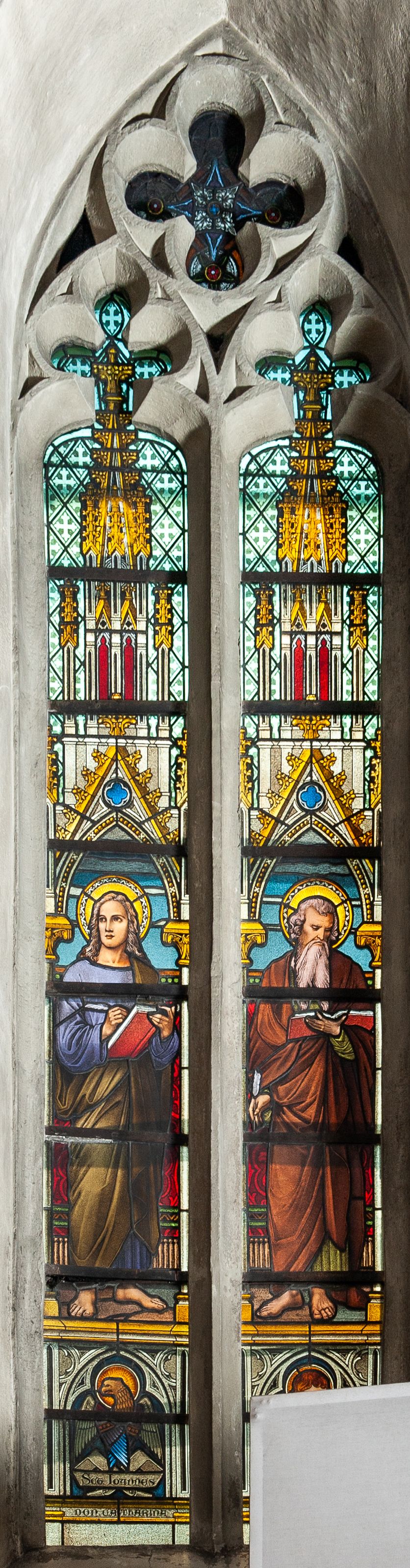 Dwa okna południowe prezbiterium ostrołukowe, dwudzielne z maswerkami. Poniżej maswerków w każdym z okien para przedstawień Ewangelistów w całej postaci, stojących pod neogotyckimi baldachimami wspartymi na cienkich kolumienkach. U dołu, w niemal kwadratowych kwaterach symbole Ewangelistów ujęte trójlistnymi arkadkami.