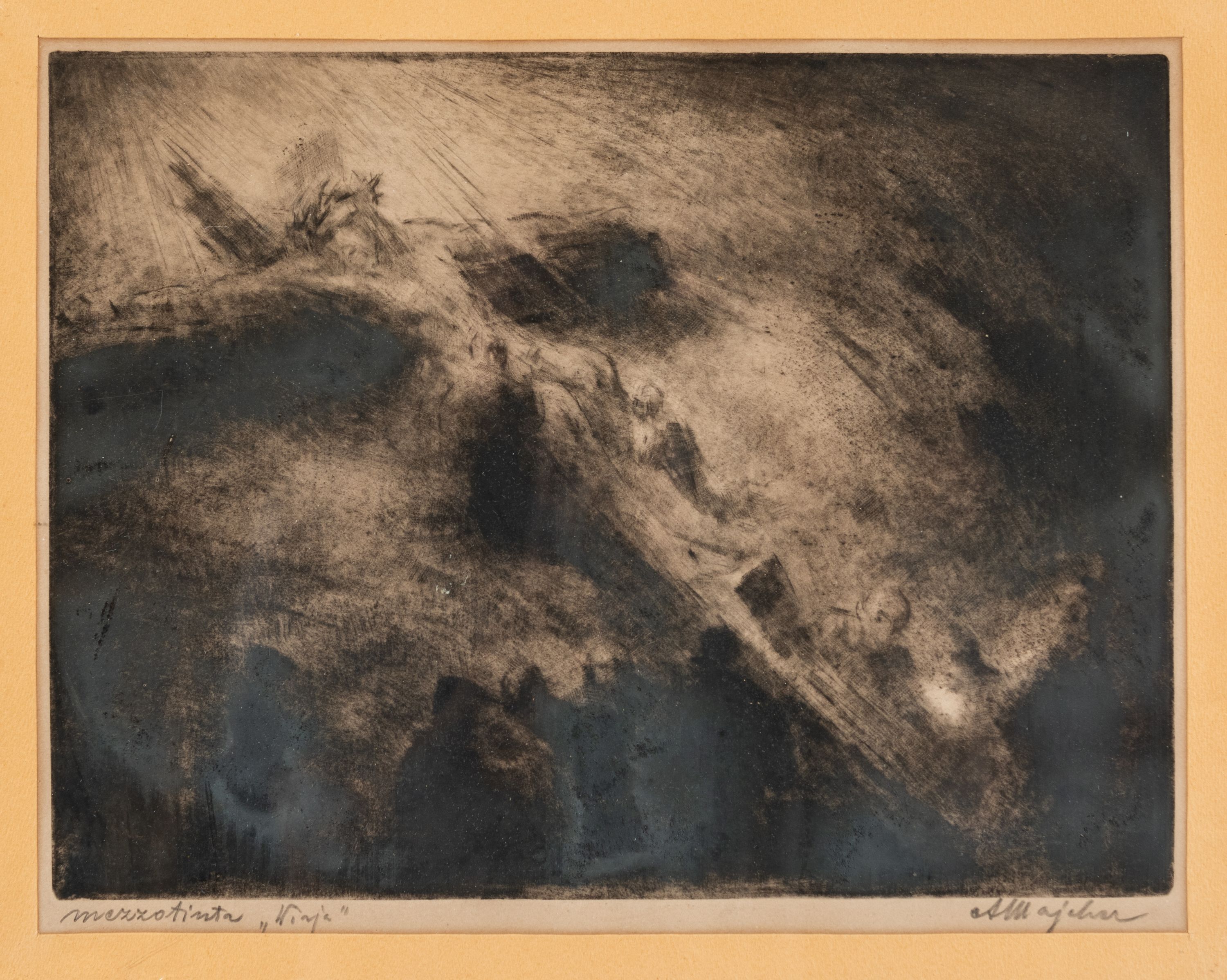 Rycina w formie leżącego prostokąta. Przedstawia rozmyty zarys krzyża z postacią Chrystusa ułożonego diagonalnie od lewego górnego do prawego dolnego rogu. Krzyż oświetlony jest od góry. W dolnej części dzieła znajduje się zarys sylwetek grupy postaci. Przy dolnej krawędzi dzieła napis: „mezzotinta «Wizja»” oraz sygnatura: „A(lojzy) Majcher”. Rycina umieszczona w passe-partout i ujęta drewnianą ramą.