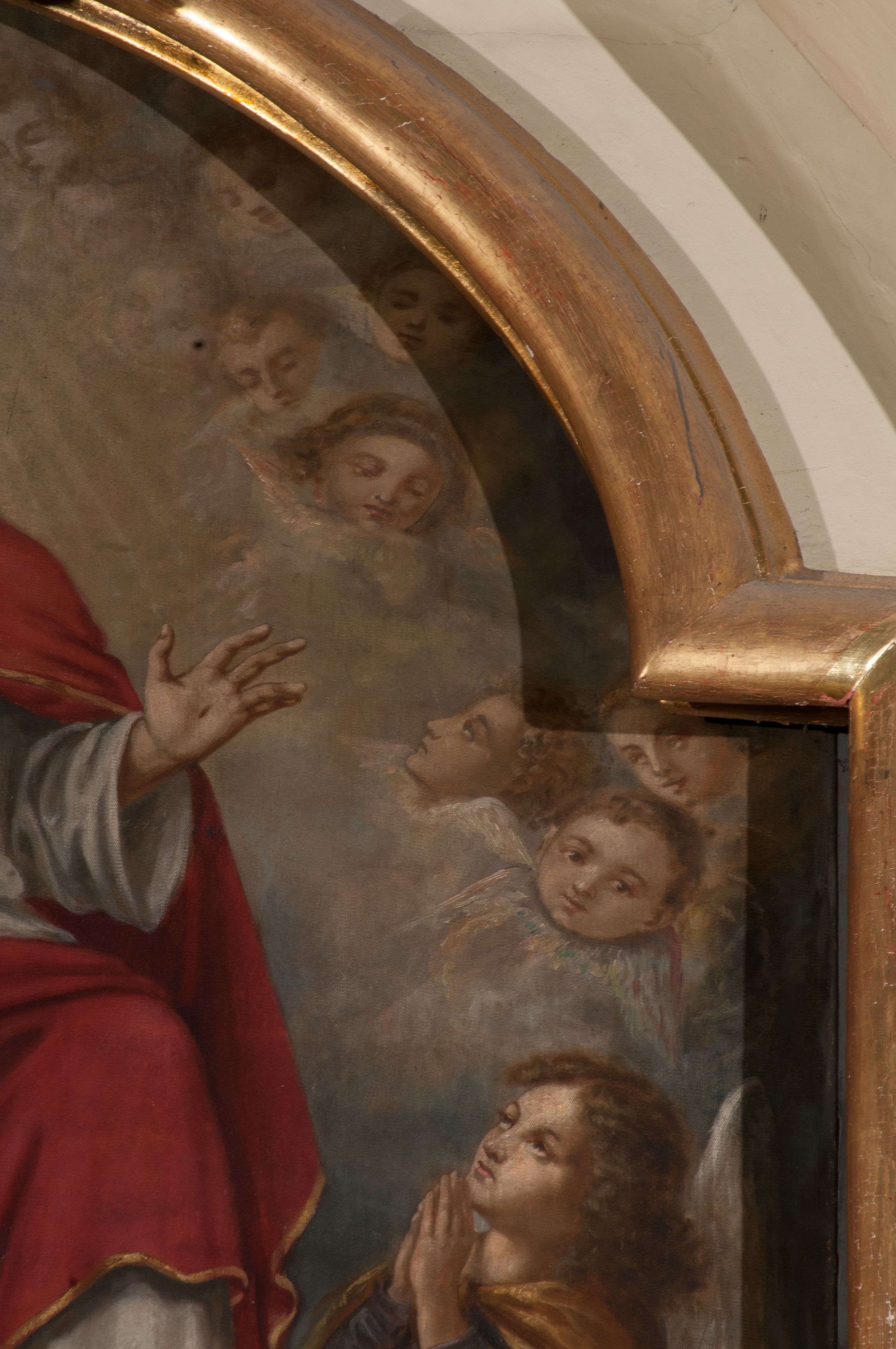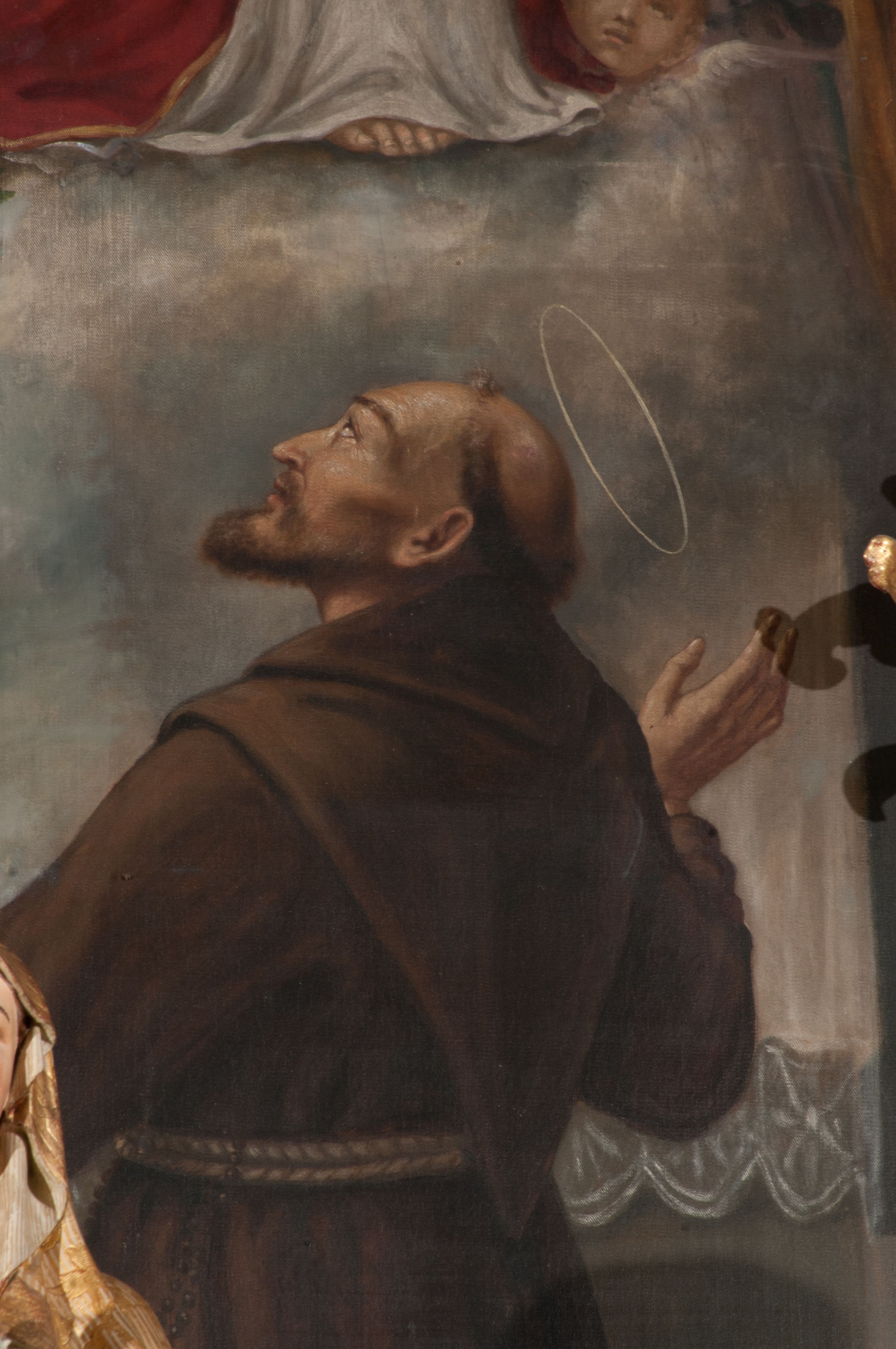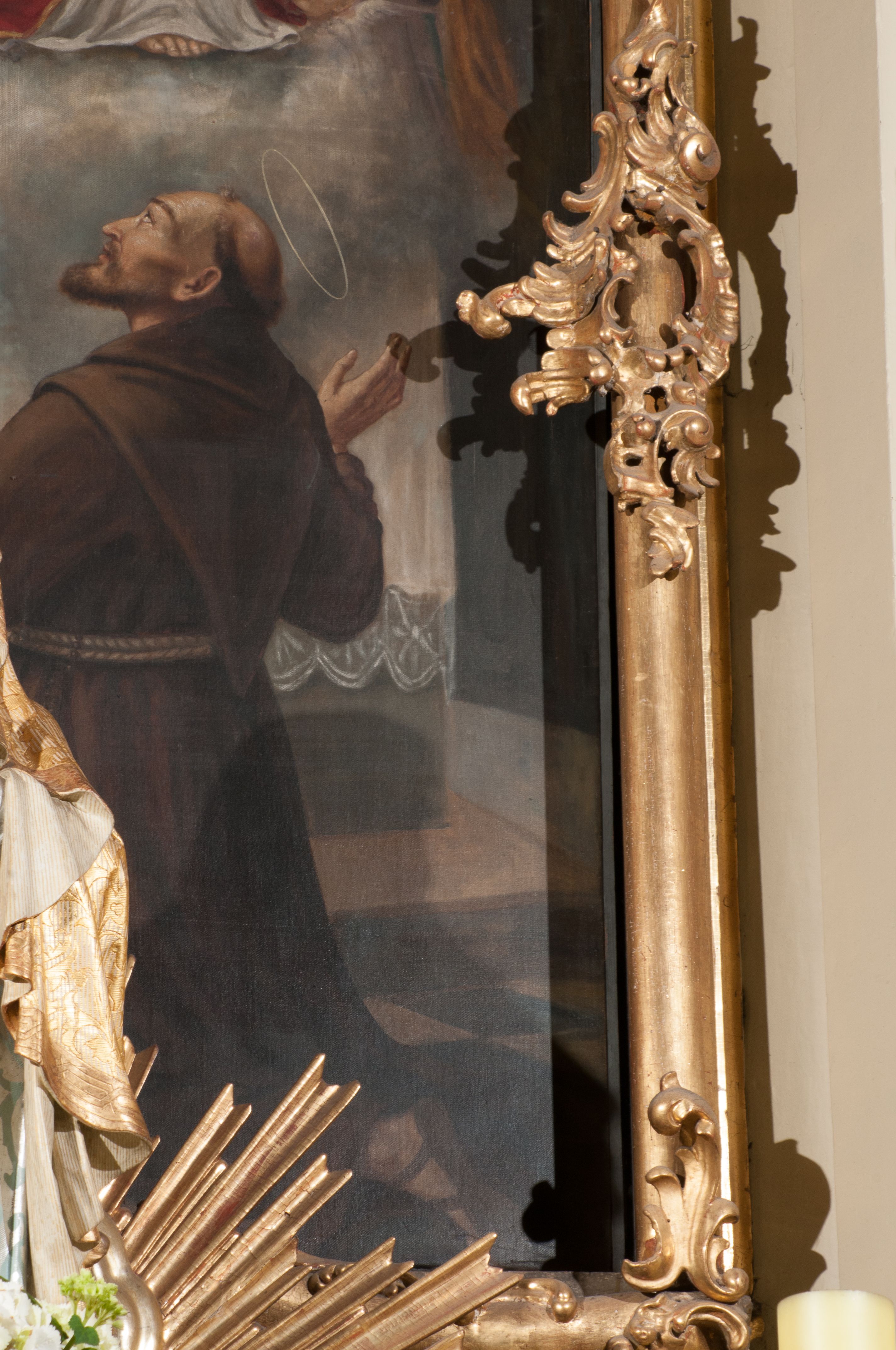Obraz klęczącego przed ołtarzem św. Franciszka, któremu ukazuje się siedzący w chmurach Jezus i Maria w otoczeniu aniołów. Maria zwrócona w trzech czwartych w lewo, ukazana w różowej sukni, niebieskim płaszczu i z białym welonem na głowie oraz wieńcem z gwiazd. Prawa ręka wyciągnięta w stronę świętego, lewa przyłożona do piersi. Chrystus o długich, brązowych włosach i krótkim zaroście, ukazany frontalnie, w białej luźniej szacie i czerwonym płaszczu spiętym broszą i z krzyżowym promienistym nimbem nad głową. Lewa ręka lekko uniesiona do góry, prawa spoczywa na kolanie. Święty Franciszek ukazany tyłem do widza, z twarzą z profilu, uniesioną w stronę Marii, z rozłożonymi rękoma. Ubrany w brązowy habit franciszkański, przepasany podwójnym sznurem. Wokół Marii i Jezusa aniołowie w różnych pozach i główki aniołów.